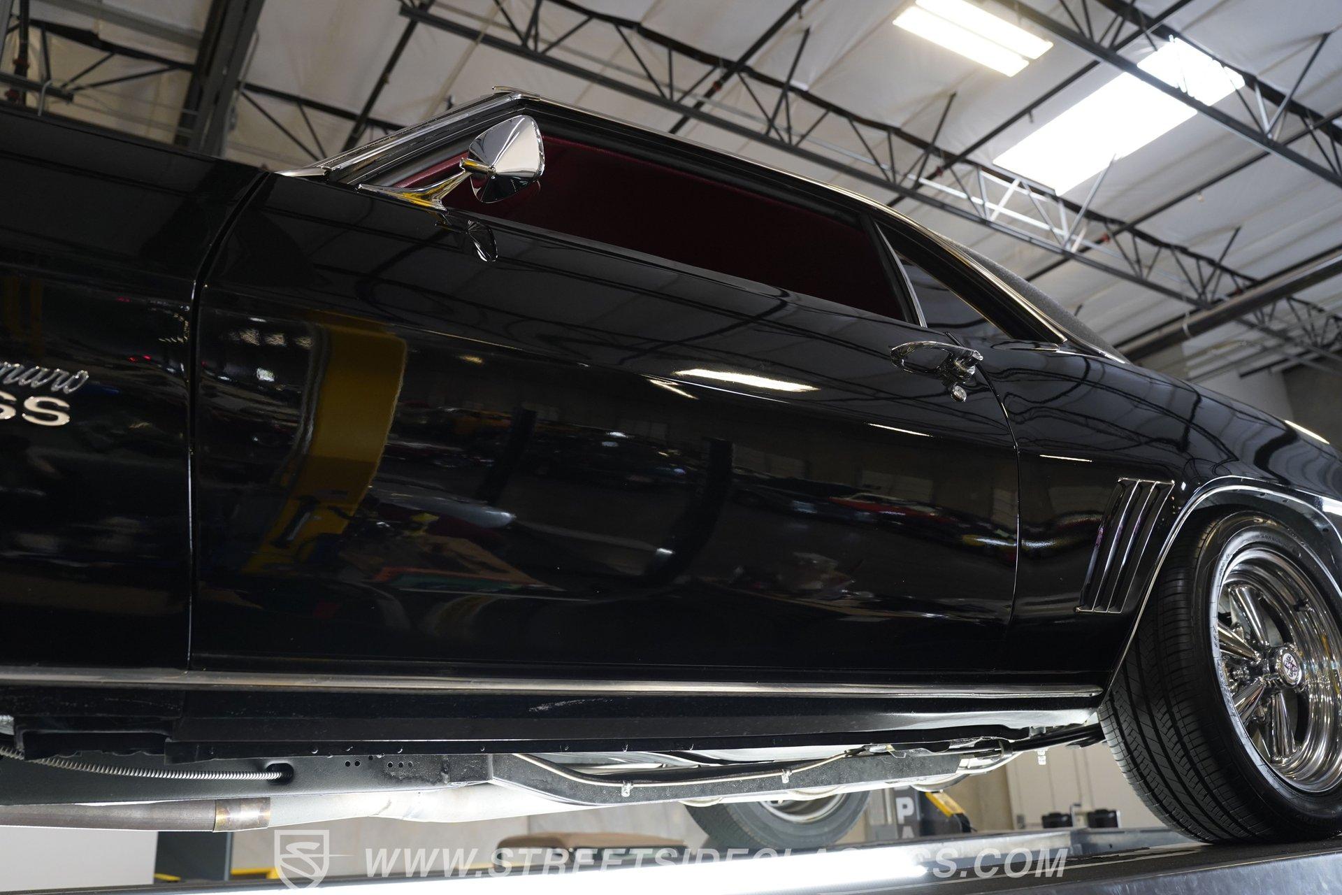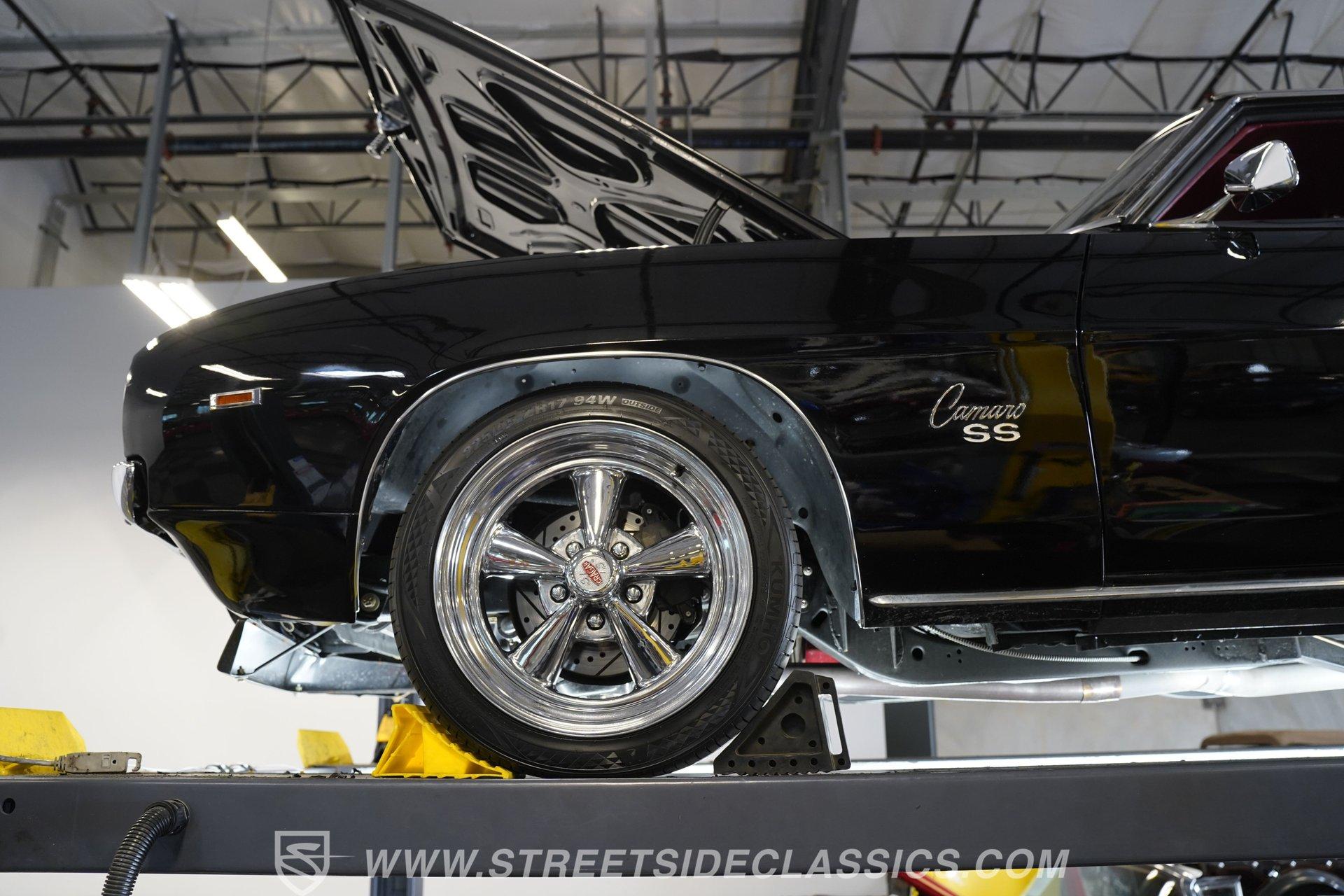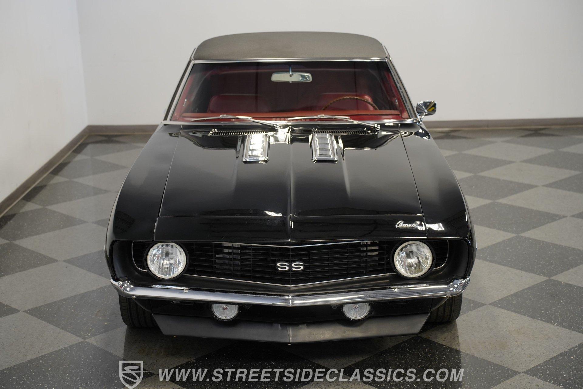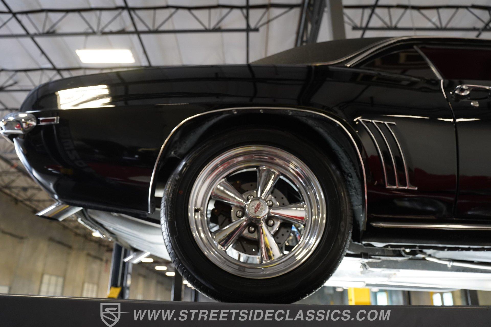 When it comes to muscle cars, there is nothing quite like a first-generation Camaro. Power, prestige, and pizazz begin to describe this beautiful 1969 Chevrolet Camaro SS 502. Fully repainted in a deep black exterior paint, this Super Sport comes with all the correct SS badging, and aside from its polished Cragar SS wheels, there is almost nothing hinting that this car has a bit more lurking under its hood than stock; at least not until you start it up. But before we get to that power part of the fun, first let us introduce you to this exquisitely redone red vinyl interior. A pair of plush and supportive bucket seats sit just ahead of a wood-rimmed steering wheel and matching woodgrain console trim to add a bit of contrast. Just beyond that wheel is a six-pod Marshall gauge cluster, featuring a big 160 mph speedometer and 10,000 rpm tachometer. A white Hurst cueball-style shifter and padded expletive handle give both the driver and passenger something to hold onto when this Pony Car really digs in. Under that louvered hood, we find a clean engine bay with a massive 502 cubic-inch naturally-aspirated V-8 sitting comfortably between the fenders. A single four-barrel Holley QFT carburetor feeds into an aluminum intake manifold, while a dual exhaust and chambered exhaust do away with spent gases. Power from that big block gets funneled through a tried-and-true Muncie four-speed manual before heading out to the twelve-bolt Moser rear end. HIGHLIGHTS: Full Black Repaint 502 Crate V8 Holley QFT Carb Aluminum Intake Dual Exhaust Muncie Four Speed Hurst Shifter Moser 12 Bolt Rear Fully Redone Interior Upgraded Bucket Seats Marshall Gauges Power Brakes Four Wheel Discs Cross Drilled Slotted Rotors Cragar SS Wheels Tubular A-arm Front Suspension Sway Bars Coilovers Subframe Connectors This 1969 Chevrolet Camaro SS 502 isn't just a straight-line monster. Thanks to a lowered suspension that features tubular A-arms, coilovers, and a sway bar up front, along with another sway bar and subframe connectors in the rear, this Pony Car can gallop through the twisties, too. A set of four-wheel power disc brakes featuring cross-drilled and slotted rotors stands ready to scrub off speed whenever necessary. If you enjoy the thrill of a first-gen Camaro as much as we do, but want just a bit more power than the factory ever made, then don't wait any longer because this beautiful black boulevard bruiser won't be around long. Call today!