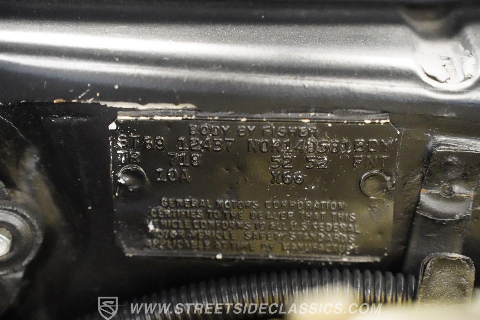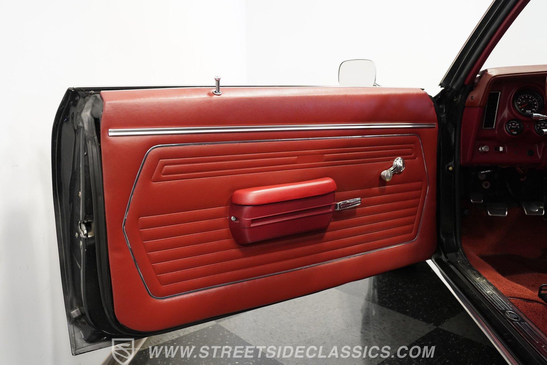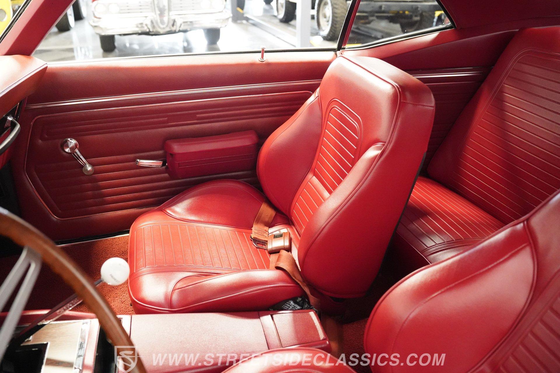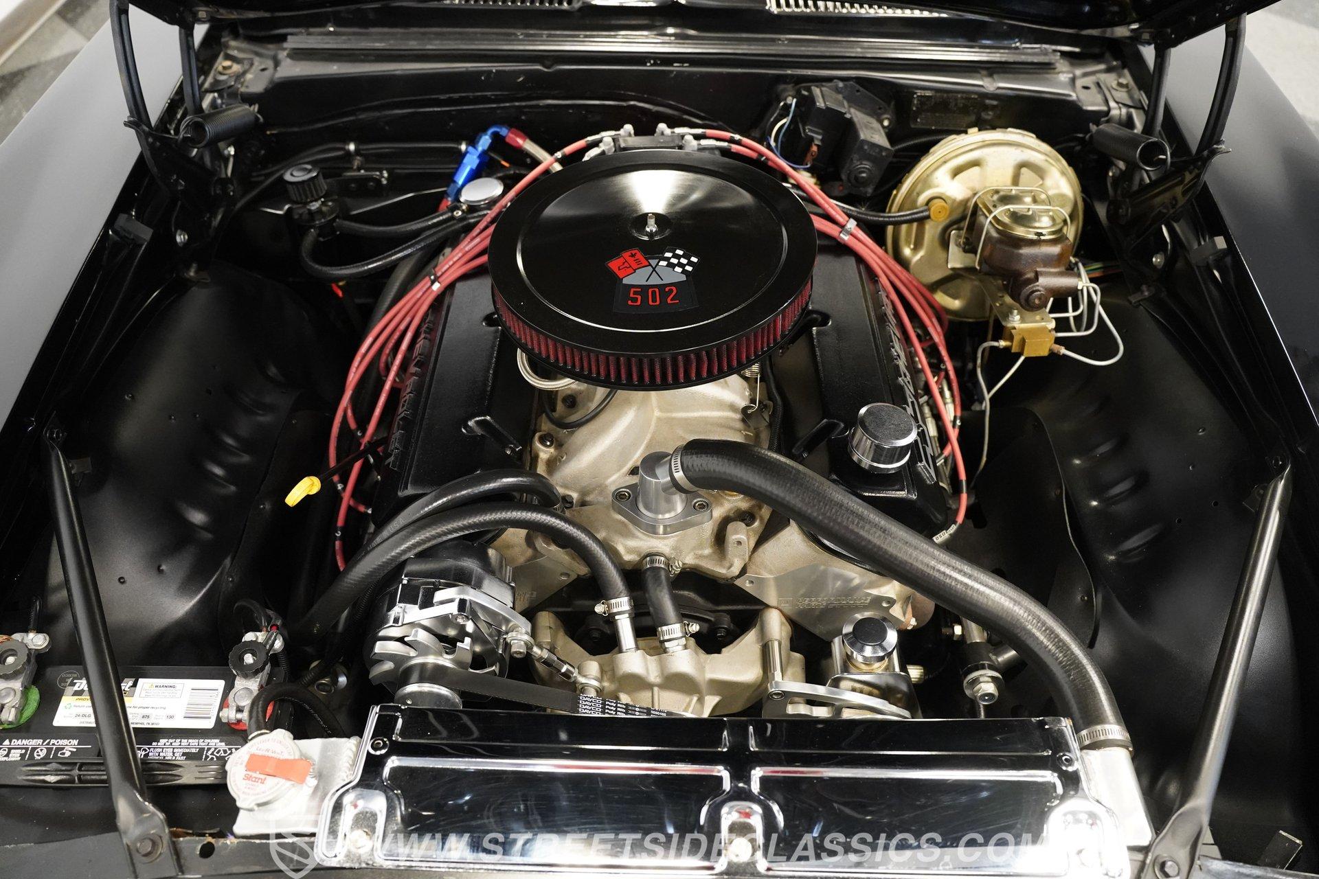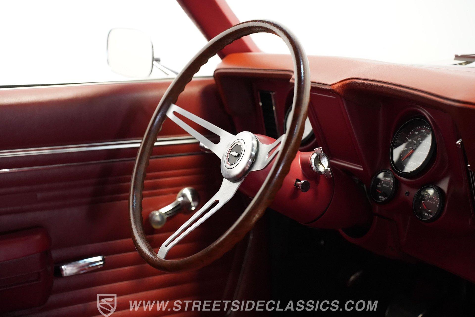 When it comes to muscle cars, there is nothing quite like a first-generation Camaro. Power, prestige, and pizazz begin to describe this beautiful 1969 Chevrolet Camaro SS 502. Fully repainted in a deep black exterior paint, this Super Sport comes with all the correct SS badging, and aside from its polished Cragar SS wheels, there is almost nothing hinting that this car has a bit more lurking under its hood than stock; at least not until you start it up. But before we get to that power part of the fun, first let us introduce you to this exquisitely redone red vinyl interior. A pair of plush and supportive bucket seats sit just ahead of a wood-rimmed steering wheel and matching woodgrain console trim to add a bit of contrast. Just beyond that wheel is a six-pod Marshall gauge cluster, featuring a big 160 mph speedometer and 10,000 rpm tachometer. A white Hurst cueball-style shifter and padded expletive handle give both the driver and passenger something to hold onto when this Pony Car really digs in. Under that louvered hood, we find a clean engine bay with a massive 502 cubic-inch naturally-aspirated V-8 sitting comfortably between the fenders. A single four-barrel Holley QFT carburetor feeds into an aluminum intake manifold, while a dual exhaust and chambered exhaust do away with spent gases. Power from that big block gets funneled through a tried-and-true Muncie four-speed manual before heading out to the twelve-bolt Moser rear end. HIGHLIGHTS: Full Black Repaint 502 Crate V8 Holley QFT Carb Aluminum Intake Dual Exhaust Muncie Four Speed Hurst Shifter Moser 12 Bolt Rear Fully Redone Interior Upgraded Bucket Seats Marshall Gauges Power Brakes Four Wheel Discs Cross Drilled Slotted Rotors Cragar SS Wheels Tubular A-arm Front Suspension Sway Bars Coilovers Subframe Connectors This 1969 Chevrolet Camaro SS 502 isn't just a straight-line monster. Thanks to a lowered suspension that features tubular A-arms, coilovers, and a sway bar up front, along with another sway bar and subframe connectors in the rear, this Pony Car can gallop through the twisties, too. A set of four-wheel power disc brakes featuring cross-drilled and slotted rotors stands ready to scrub off speed whenever necessary. If you enjoy the thrill of a first-gen Camaro as much as we do, but want just a bit more power than the factory ever made, then don't wait any longer because this beautiful black boulevard bruiser won't be around long. Call today!