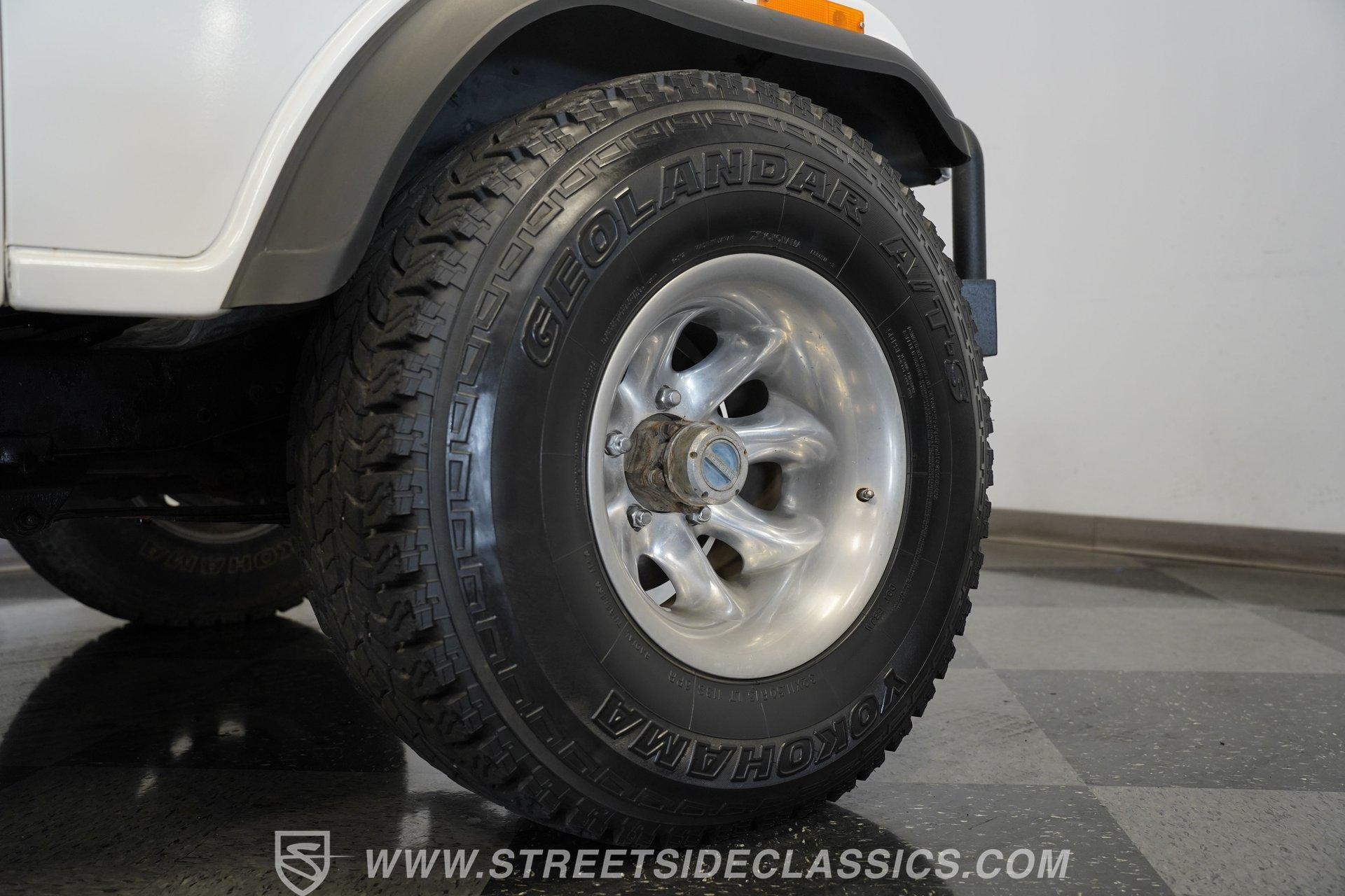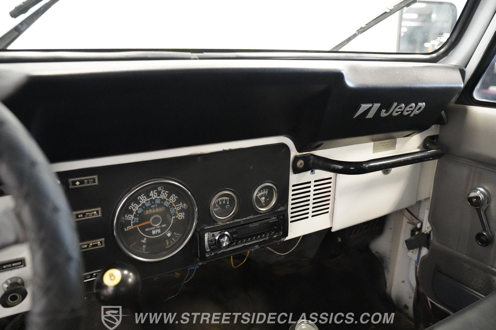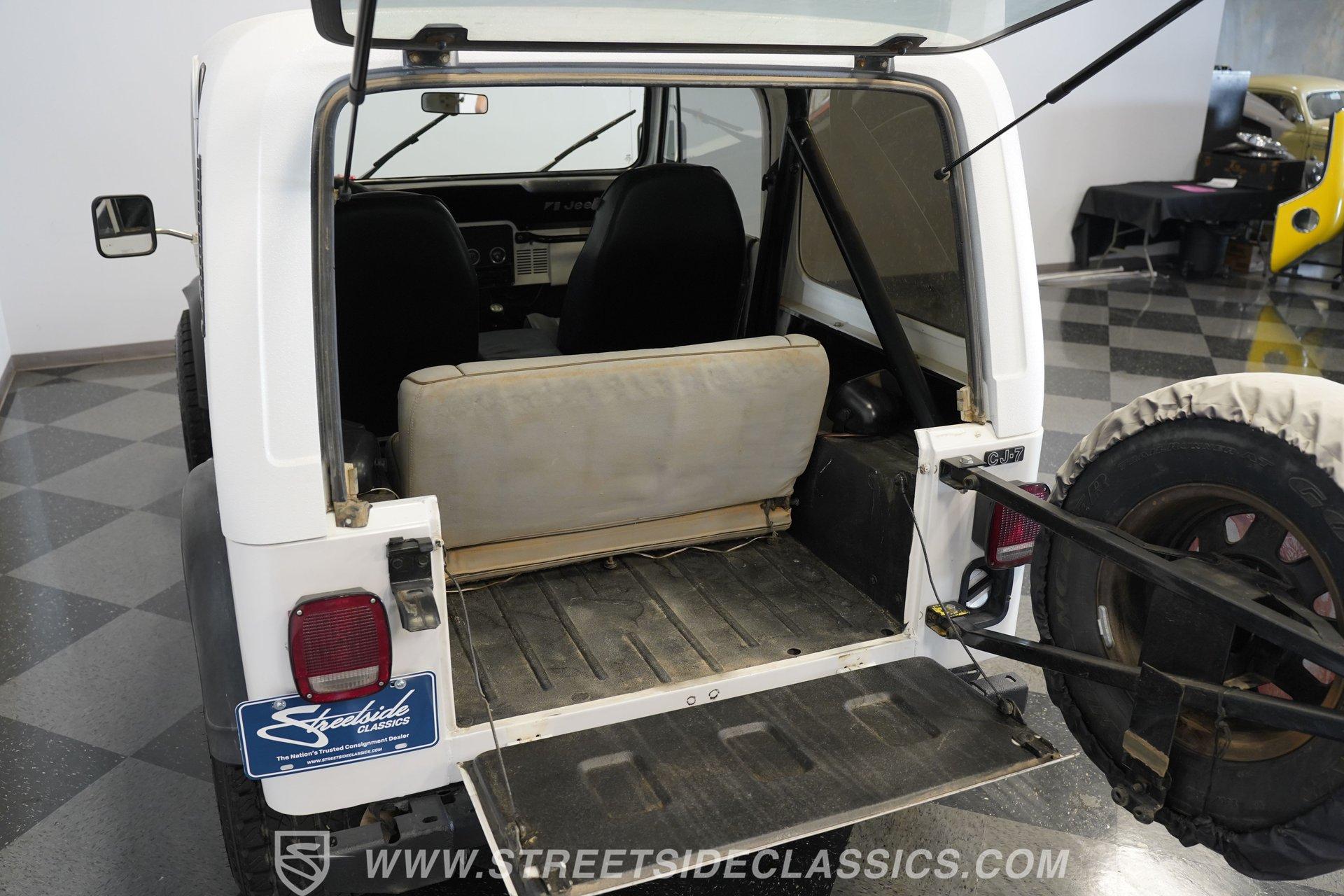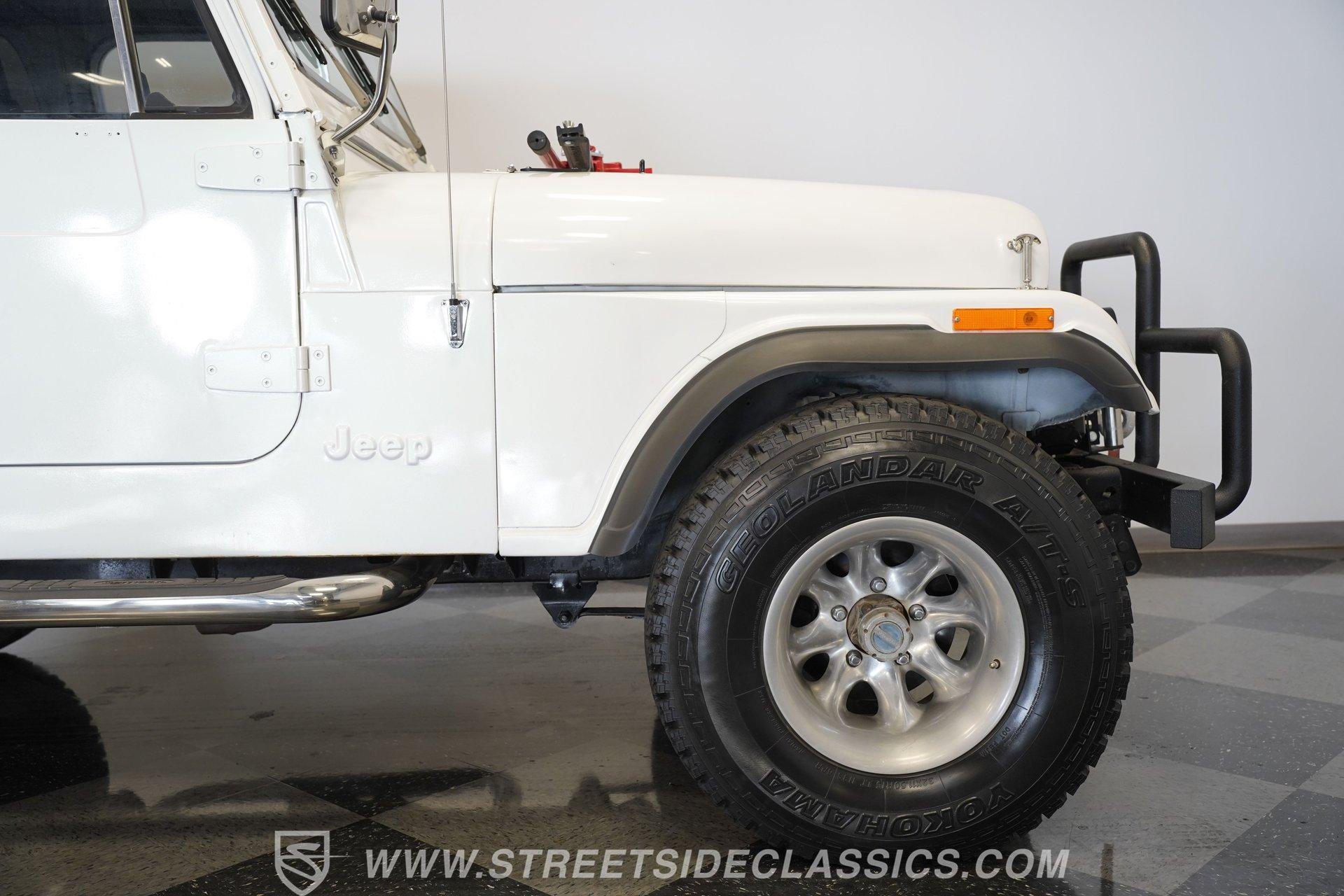 American outdoor heritage rolls on with this 1982 Jeep CJ7, a true off-road machine draped in clean white paint. The red jack assembly mounted on the hood, as well as the black front brush guard mounted with fog lights and a heavy-duty Badland 9500 ZXR winch create a rugged backcountry vibe that belongs on mountain trails. The white fiberglass removable hard top adds versatility for all-season adventures, while Smittybilt running boards allow quick access after muddy expeditions. Mounted on sturdy 15" alloy wheels and tall 32X11.50R15 Yokohama Geolander A/T-S tires, this CJ7 sits high and mighty, ready for whatever wilderness challenge awaits. Inside the cabin, the black interior creates a no-nonsense environment built for off-road action. The upgraded black vinyl bucket seats hold occupants firmly when tackling rough terrain, while the floor shifter puts direct control in hand for navigating through mud, sand, and rocks. A Pioneer AM/FM/CD player radio provides music and the dash is simple and functional, adding continuity to this trail-ready package, complete with clear, gauges that monitor all vital systems during off-grid adventures. The 4.2L inline-6 engine provides the gutsy power and low-end torque that made these Jeeps legendary among off-road fans. Shifting through the 4-speed manual transmission gives direct control over the 4x4 drivetrain when climbing over obstacles or fording streams. The engine compartment shows careful maintenance with quality hoses, belts and wiring throughout. Power steering makes wheeling through tight trails much easier, while front disc brakes help control descents on steep grades. The single exhaust and single 2-barrel fuel delivery system complete this proven mechanical package that's built for wilderness treks. HIGHLIGHTS: 4.2L Inline 6 Engine 4-Speed Manual Transmission Power Steering Front Disc Brakes 4X4 Drivetrain Edelbrock Air Cleaner Badland 9500 ZXR Winch Fiberglass Removable Hard Top 15" Alloy Wheels Chrome Tubular Side Steps 32X11.50R15 Yokohama Geolander A/T-S Tires Front Brush Guard Fog Lights Upgraded Black Bucket Seats Pioneer AM/FM/CD Radio Heavy-Duty Bumper Jack Built for trails, camping trips, and backroad adventures, this 1982 Jeep CJ7 mixes classic American 4x4 capability with a look that belongs in the great outdoors. The white paint, upgraded accessories, and go-anywhere tires make a perfect combination for explorers who want both style and substance. Call today!
