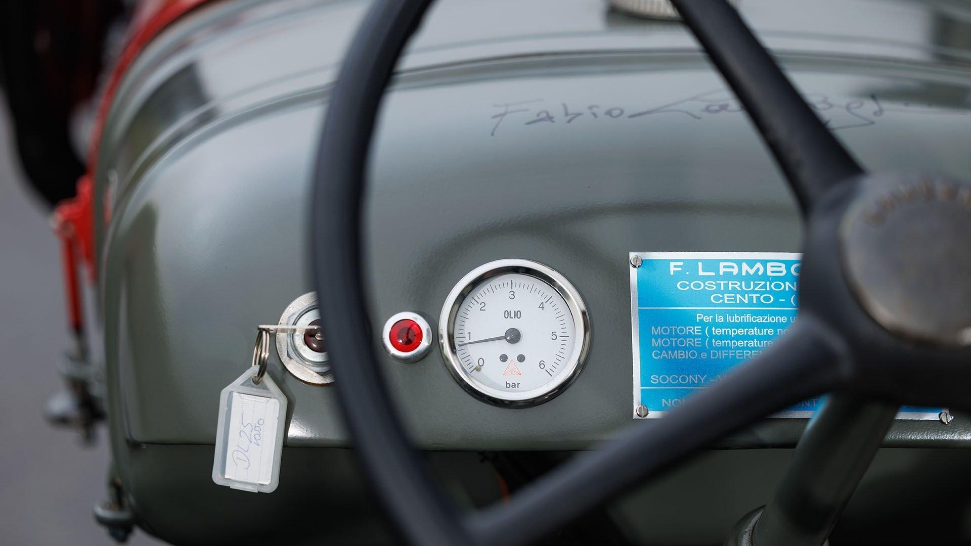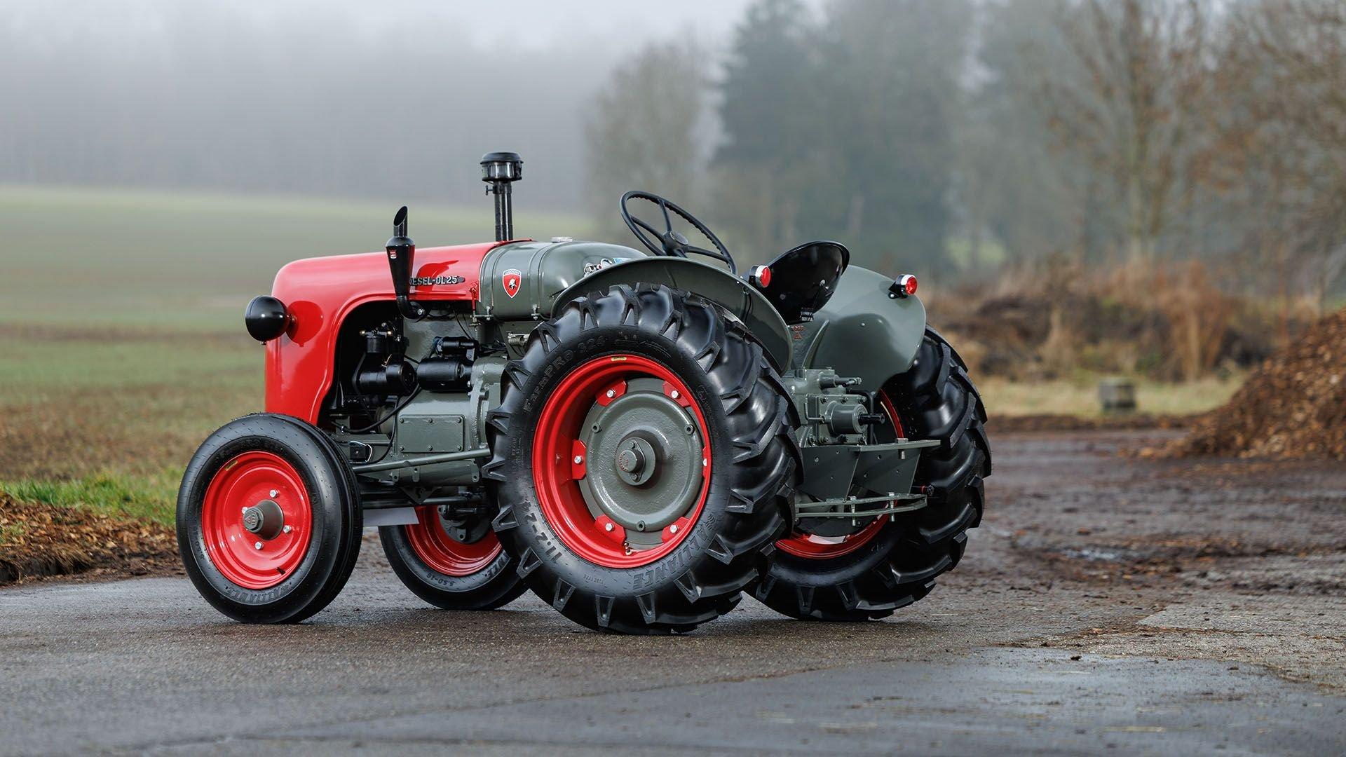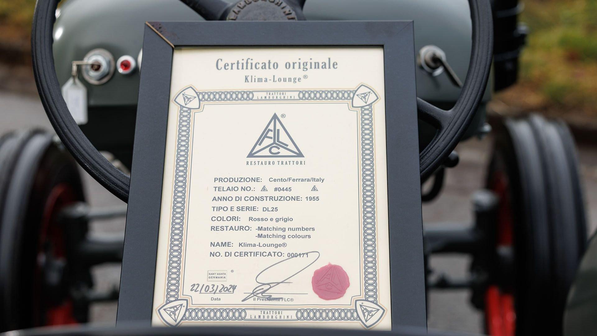 Engine No. 0445 In the immediate aftermath of World War II, former Royal Italian Air Force mechanic Ferruccio Lamborghini opened a car and motorcycle repair shop near Ferrara. In 1948, he pivoted to tractor manufacturing, initially using military surplus parts before progressing to his own designs with water-cooled MWM engines by 1952. Though only about 900 examples were produced, the DL25 was still one of Lamborghini’s best-selling early tractor models and the manufacturer’s first commercial success. By this time, Ferruccio had acquired the rights to produce MWM engines under the Lamborghini brand, making the DL25 the earliest vehicle equipped with the first-ever Lamborghini engine. Through the DL25 and its derivatives, Lamborghini Trattori S.P.A. established a greater foothold in the Italian farming industry. This success, along with an infamous run-in with Enzo Ferrari, fueled Lamborghini's entry into automobile manufacturing, erecting the foundations of The House of the Raging Bull that stand stronger than ever today. This 1955 Lamborghini DL25-N Tractor is a rare Narrow track example; one of approximately 60 examples produced. It was delivered new to Italy in 1955, finished in Rosso e Grigio (red with gray accents), and was first registered in Modena as confirmed by a copy of its libretto. This splendid example has been under the care of the one of the largest Lamborghini collections in Europe since 2023, and has been well-kept despite being over 70 years old. The rare tractor was recently restored in-house to (FLC) certification criteria at the cost of €31.700 in its original color combination, and retains its original Lamborghini 2.5-liter two-cylinder diesel engine and four-speed manual transmission according to its included FLC Certificato originale. Dott. Fabio Lamborghini, nephew of Ferruccio Lamborghini, is the current registered keeper and signed the tractor following its restoration—distinguishing this example even among collectors-grade Lamborghinis. No serious Lamborghini collection is complete without honoring Ferruccio’s industrial roots, and this 1955 DL25 checks all the boxes: a rare DL25 N variant finished in its factory correct colors, retaining its original drivetrain including the first motor produced in-house by Lamborghini, freshly restored to the highest standard with no expense spared, and registered to Dott. Fabio Lamborghini himself—it is perhaps the finest DL25 tractor extant. PREVIEW DETAILS: This lot will be available for viewing in person at Roland-Garros Stadium from Tuesday, 27th January 2026 to Friday, 30th January 2026. SALE LOCATION: France BUYER’S PREMIUM: 10% + VAT on the Hammer Price TITLE/REGISTRATION DOCUMENTS: German Fahrzeugbrief ADDITIONAL NOTES: N/A POST-AUCTION REMOVAL AND STORAGE: Following the auction, this lot will be removed from site and transferred to a third party storage facility outside of Paris, France. The removal fee of €520 + VAT will be charged to the buyer. Storage charges of €40 + VAT per lot per day will also be charged from Saturday, 31st January 2026.