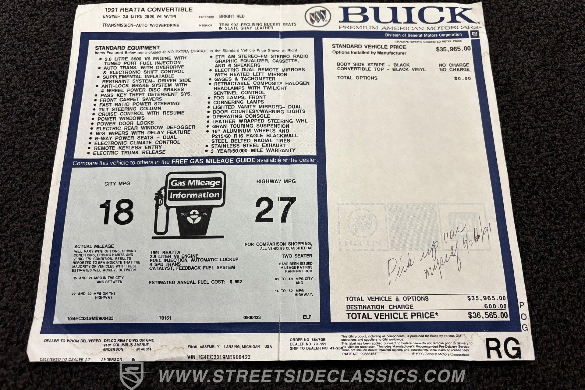When it comes to rare and refined drop-top sports cars throughout the history of the autoverse, this 1991 Buick Reatta Convertible may not be the first car that comes to mind, but after one look at this sleek roadster, it's clear that maybe it should be. This final-year model comes decked out in its believed original Bright Red paint and complementary manual black convertible top, this bodacious Buick boasts a mere 34,563 actual miles on its odometer. As if that's not enough to pique your interest, this car is one of an unbelievable 305 Reatta convertibles made for the 1991 model year, making it not only one of the scarcest Buicks in the company's history, but one of the rarest production vehicles ever made. Inside, we find a posh factory Slate Grey leather interior. A center console separates a pair of plush power bucket seats, while a two-spoke power-assisted steering wheel sits just ahead of a trick-looking vacuum-fluorescent display (VFD), along with a digital readout for speed and odometer/trip readings. Power mirrors, locks, and windows, along with air-conditioning, cruise control, remote keyless entry, power trunk release, and its factory AM/FM/Cassette player, offer all of the modern amenities anyone could ask for in the early 1990s. Under the hood, we find a 3.8-liter overhead-valve 3800-Series V-6 engine, which, when properly maintained, is nearly bulletproof. From the factory, this pushrod motor pumped out about 170 horsepower and 220 pound-feet of torque. That power is routed through a four-speed overdrive automatic transmission before being sent out to the front-mounted transaxle. HIGHLIGHTS: Ultra Rare Car / One of 305 Made / Final Year for Reatta 34,563 Actual Miles Believed Original Body Panels and Bright Red Paint Manual Convertible Top 3.8 Liter V6 Four Speed Overdrive Transmission Fully Independent Suspension Four Wheel Disc Brakes with ABS Power Steering Factory Slate Grey Leather Interior Power Windows/Locks/Seats/Mirrors Air Conditioning Factory AM/FM/Cassette VFD Dashboard Power Trunk Release Includes: Receipts, Brochure, Info Booklet, Owner's Manual, Original Window Sticker This 1991 Buick Reatta Convertible rides on a fully-independent factory-style suspension designed for comfort, making long, leisurely cruises feel like meditation. Power disc brakes reside at all four corners, ready to scrub off speed whenever called upon. This collectible classic also comes with original brochures, an information book, receipts, its owner's manual, and even its original window sticker. So, if you've been looking for a remarkably unique drop-top sports car, you may not have originally thought of Buick, but one ride from behind the wheel, and we can guarantee you'll never forget about the Reatta again. Don't wait, call today!