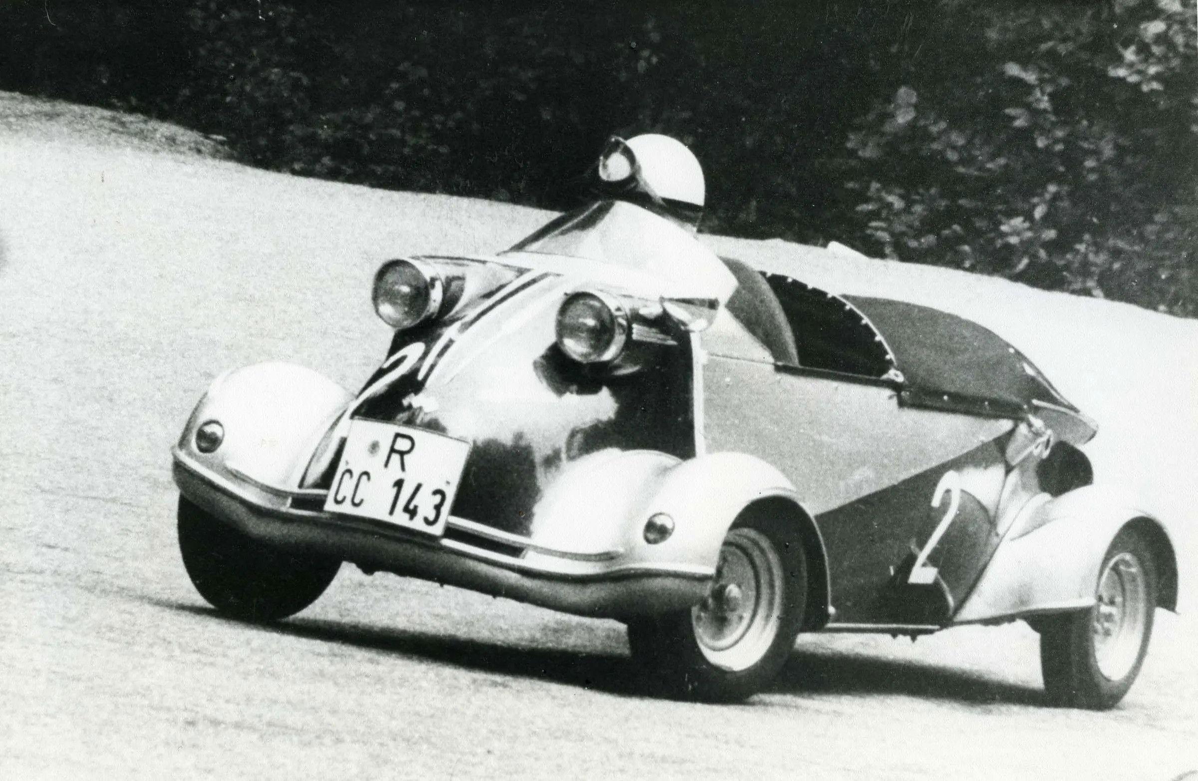 The Messerschmitt Kabinenroller microcar, introduced in 1953 as the "Fend" after co-designer Fritz Fend, was soon marketed under the manufacturer's name. This change coincided with the switch from the original's 148cc Fichtel & Sachs engine to a 174cc unit. The single-cylinder, two-stroke engine, located in the rear, produced a modest 9 hp, yet enough to propel the lightweight and aerodynamic KR175 to a speed of approximately 88 km/h (55 mph). The plexiglass hood, so reminiscent of those on Messerschmitt warplanes, hinged sideways to allow access for the two occupants, seated one behind the other, tandem-style.