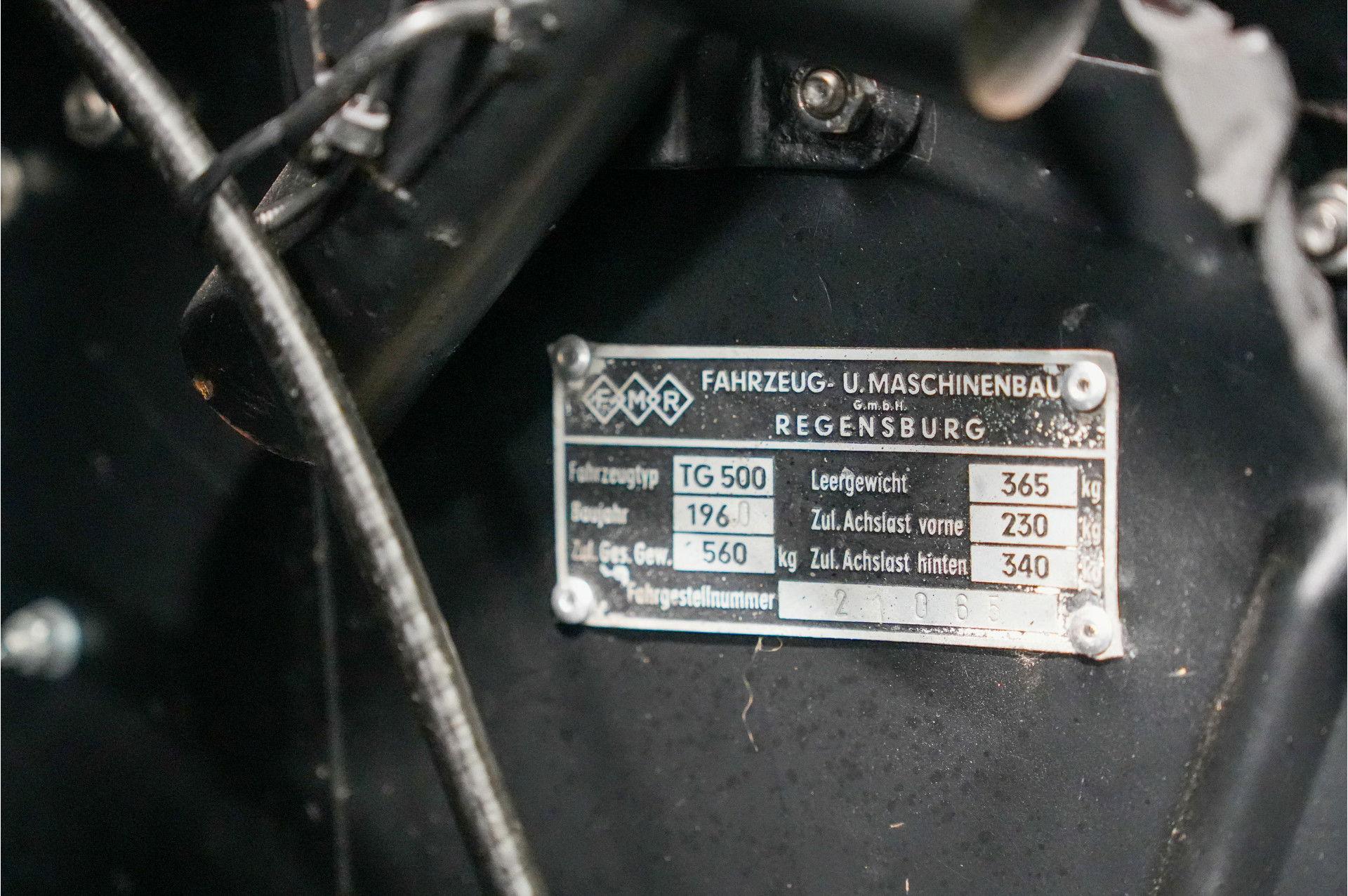 Although the "Tiger" superficially bore little resemblance to the KR200, it was especially identical "under the skin." Instead of the KR200's 191cc single-cylinder engine, as its name suggests, the TG500 was powered by a 500cc engine: a twin-cylinder, air-cooled, two-stroke engine designed by Fichtel & Sachs. This was paired with larger wheels and brakes (hydraulic instead of cable-operated), improved suspension, and, most obviously, four wheels. This allowed for contemporary sports car performance, and with its agile handling, the Tiger proved to be an effective competition vehicle in the right hands. Production ran from 1958 to 1961, with only approximately 300 units produced.