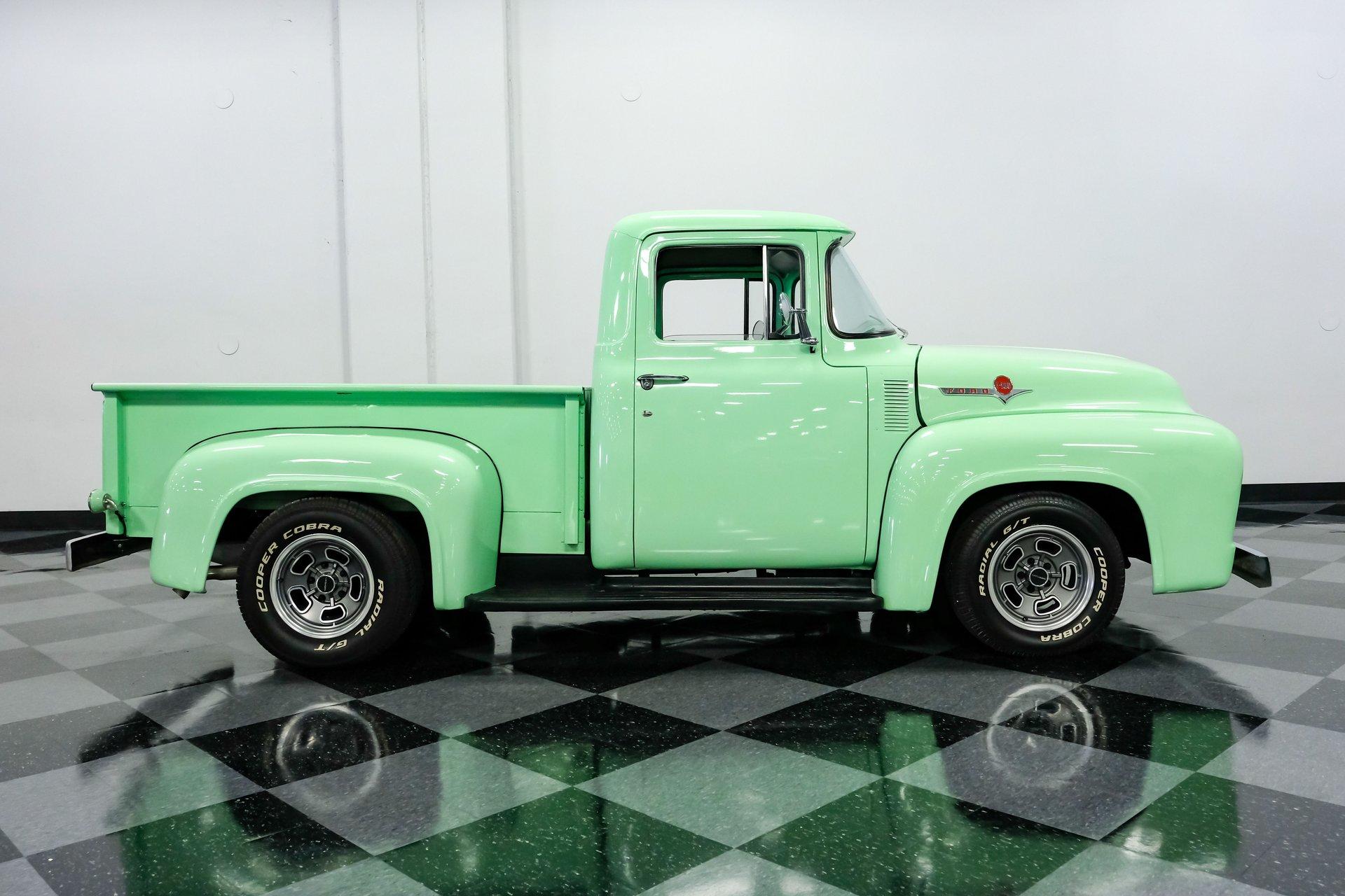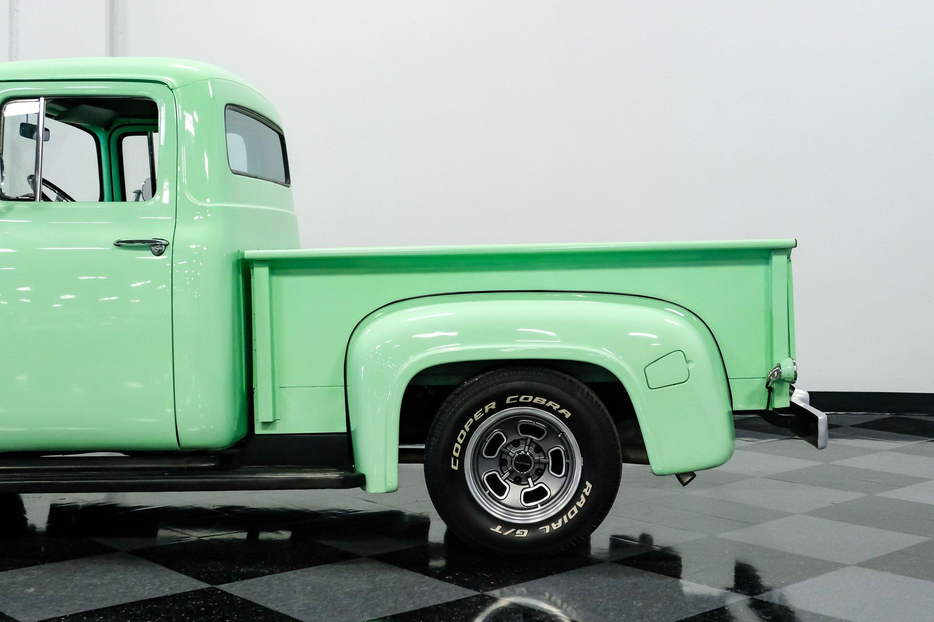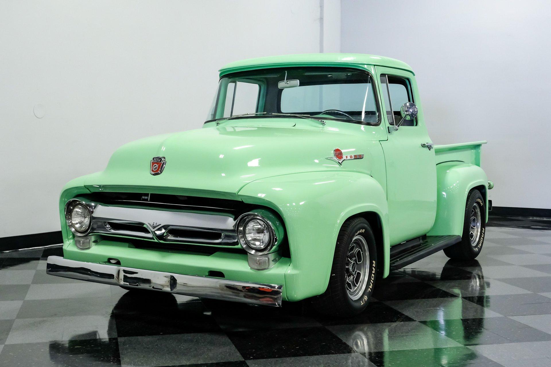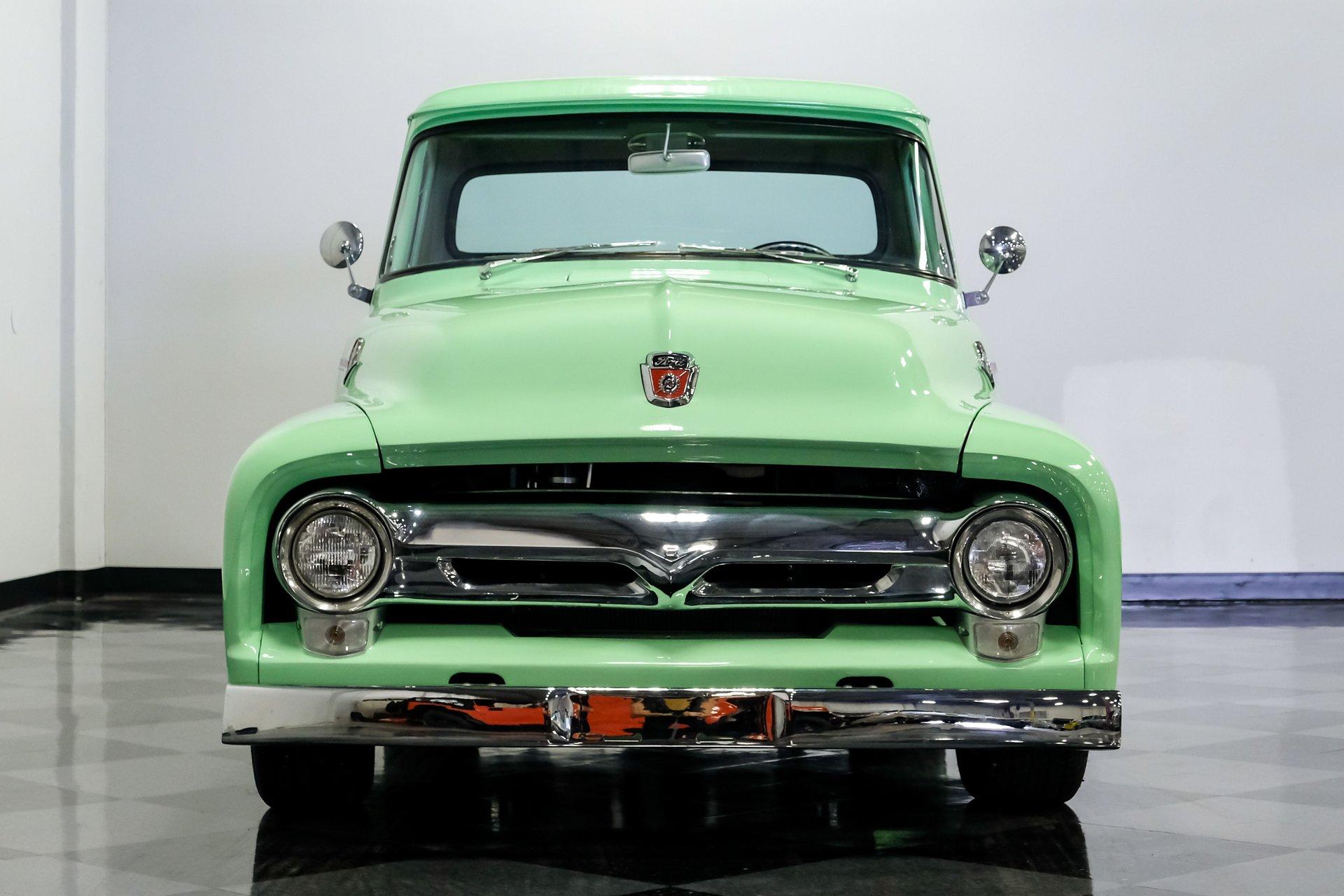 This 1956 Ford F-100 comes to us wearing a very pretty coat of Meadow Mist Green, a factory-correct hue that evokes the feeling of driving a dirt road on a Texas prairie. The truck's clean, flowing lines are enhanced by custom touches like an integrated fuel filler door for the relocated fuel tank as well as a streamlined tailgate. Sitting on 15-inch Vision wheels, this F-100 cuts a striking figure, especially with its slightly lowered stance that gives it an extra dose of attitude. Inside, gray vinyl covers the bench seat and door panels, creating a crisp, period-appropriate interior. A banjo-style steering wheel adds a dash of style, while Classic Instruments gauges blend vintage looks with modern reliability. Power steering and under-dash air conditioning make this F-100 a joy to drive, whether you're cruising Main Street or heading out on the highway. The column-mounted shifter for the 3-speed manual transmission keeps things authentically old-school. Under the hood, Ford's 312 V8 takes center stage, breathing through an Edelbrock 4-barrel carburetor. The engine bay showcases a mix of original components and smart upgrades, including a Cadillac-style air grabber. An X-pipe dual exhaust system provides a muscular soundtrack, while power drum brakes at all four corners offer confident stopping power. This powertrain combo delivers plenty of get-up-and-go for cruising or hauling, staying true to the F-100's versatile nature. HIGHLIGHTS: 312 V8 engine 3-speed manual transmission Edelbrock 4-barrel carburetor X-pipe dual exhaust system Power steering Power brakes Lowered suspension Meadow Mist Green paint Custom smooth tailgate Integrated fuel filler in rear fender Gray interior with bench seat Banjo-style steering wheel Classic Instruments gauges Under-dash air conditioning Body-off restoration This 1956 Ford F-100 combines classic style with subtle hot rod flair. From its potent V8 to its comfortable, upgraded interior, this truck offers an ideal blend of vintage appeal and modern drivability. Perfect for weekend cruises or daily drives, this F-100 is ready to hit the road. Call today!