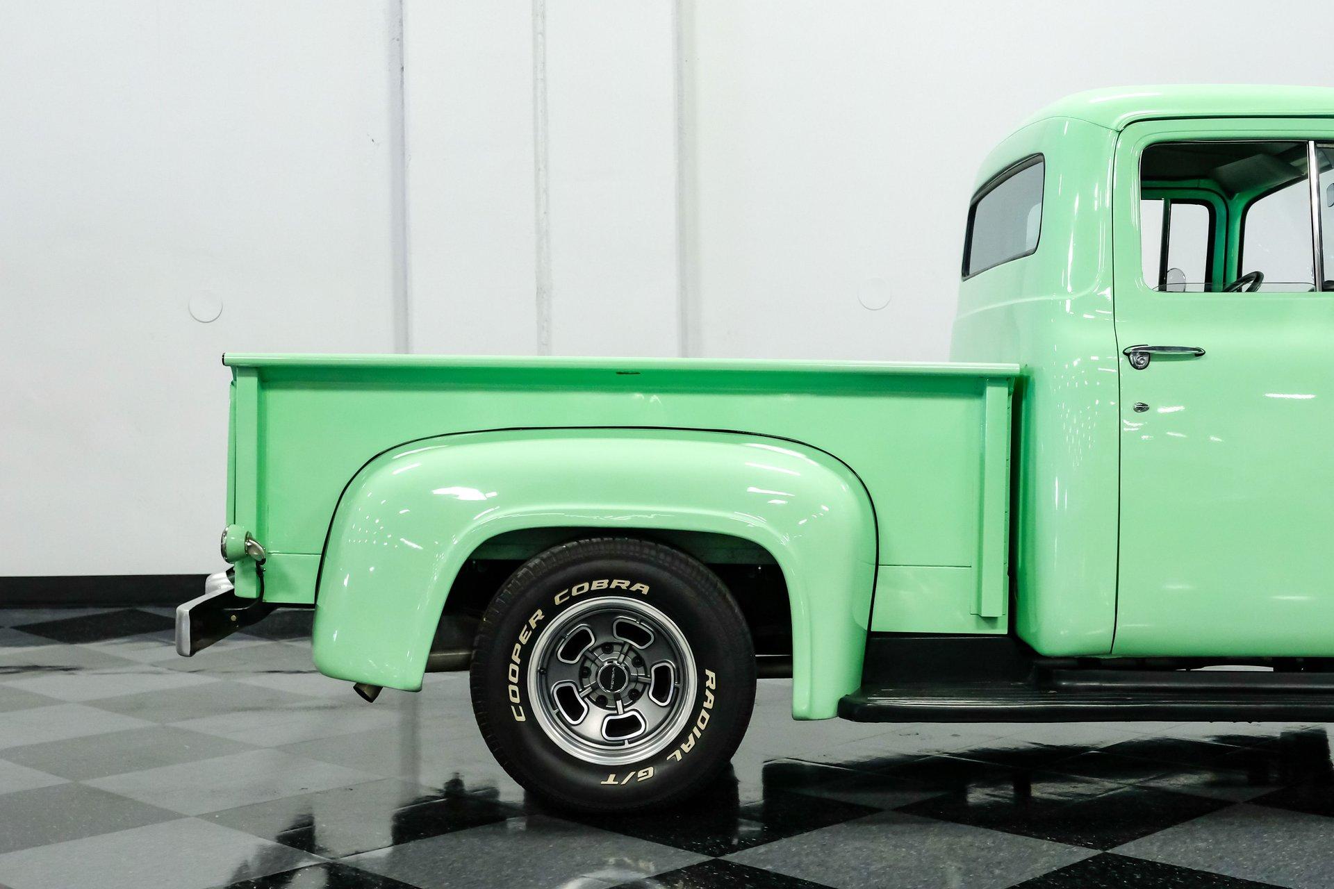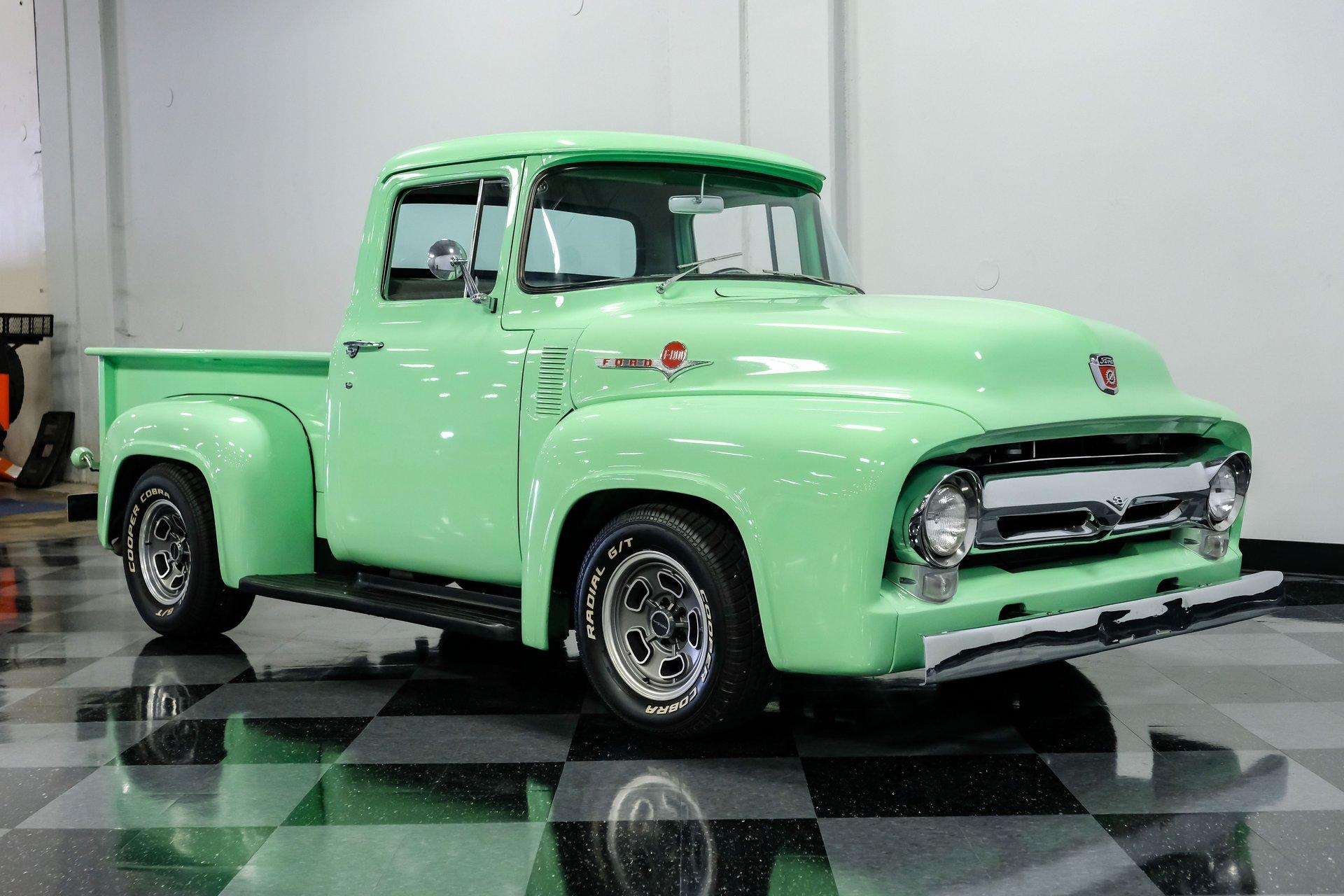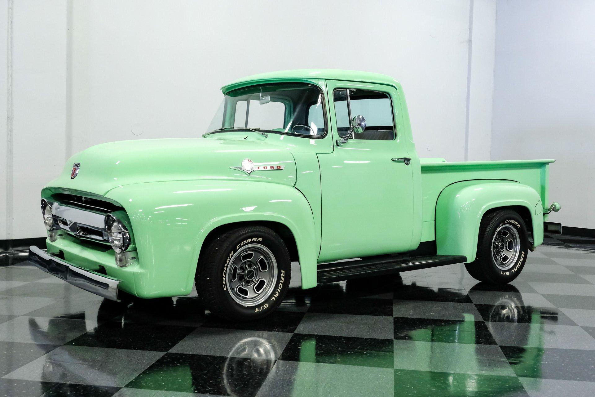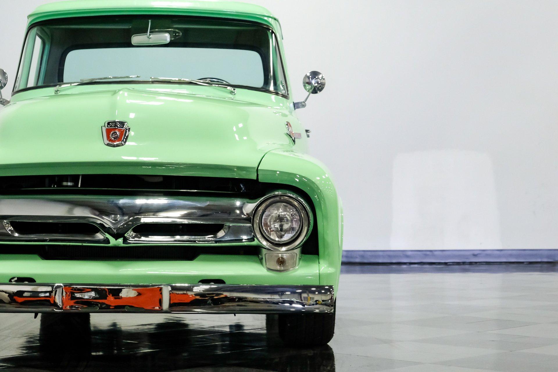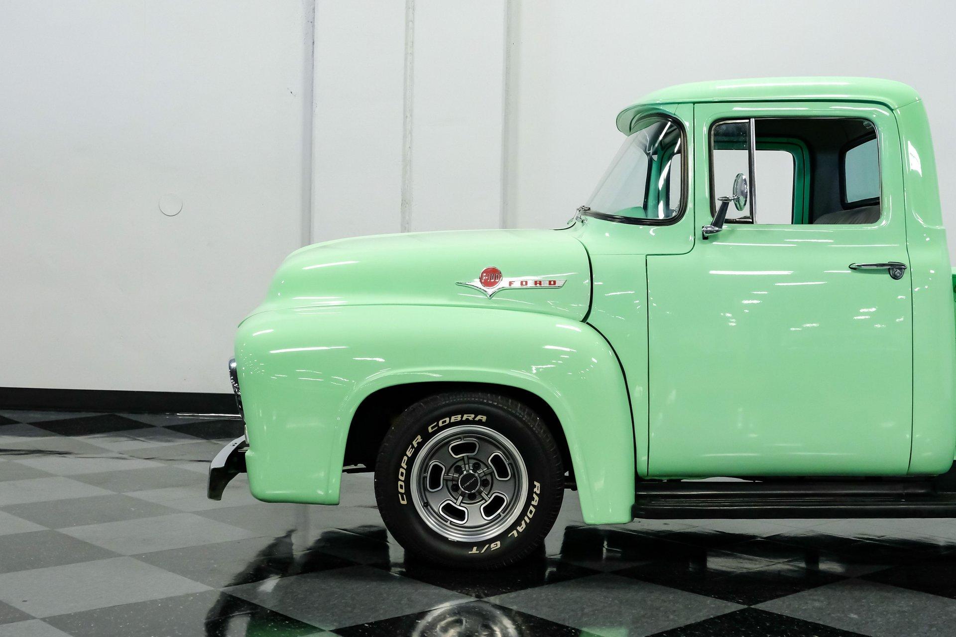 This 1956 Ford F-100 comes to us wearing a very pretty coat of Meadow Mist Green, a factory-correct hue that evokes the feeling of driving a dirt road on a Texas prairie. The truck's clean, flowing lines are enhanced by custom touches like an integrated fuel filler door for the relocated fuel tank as well as a streamlined tailgate. Sitting on 15-inch Vision wheels, this F-100 cuts a striking figure, especially with its slightly lowered stance that gives it an extra dose of attitude. Inside, gray vinyl covers the bench seat and door panels, creating a crisp, period-appropriate interior. A banjo-style steering wheel adds a dash of style, while Classic Instruments gauges blend vintage looks with modern reliability. Power steering and under-dash air conditioning make this F-100 a joy to drive, whether you're cruising Main Street or heading out on the highway. The column-mounted shifter for the 3-speed manual transmission keeps things authentically old-school. Under the hood, Ford's 312 V8 takes center stage, breathing through an Edelbrock 4-barrel carburetor. The engine bay showcases a mix of original components and smart upgrades, including a Cadillac-style air grabber. An X-pipe dual exhaust system provides a muscular soundtrack, while power drum brakes at all four corners offer confident stopping power. This powertrain combo delivers plenty of get-up-and-go for cruising or hauling, staying true to the F-100's versatile nature. HIGHLIGHTS: 312 V8 engine 3-speed manual transmission Edelbrock 4-barrel carburetor X-pipe dual exhaust system Power steering Power brakes Lowered suspension Meadow Mist Green paint Custom smooth tailgate Integrated fuel filler in rear fender Gray interior with bench seat Banjo-style steering wheel Classic Instruments gauges Under-dash air conditioning Body-off restoration This 1956 Ford F-100 combines classic style with subtle hot rod flair. From its potent V8 to its comfortable, upgraded interior, this truck offers an ideal blend of vintage appeal and modern drivability. Perfect for weekend cruises or daily drives, this F-100 is ready to hit the road. Call today!