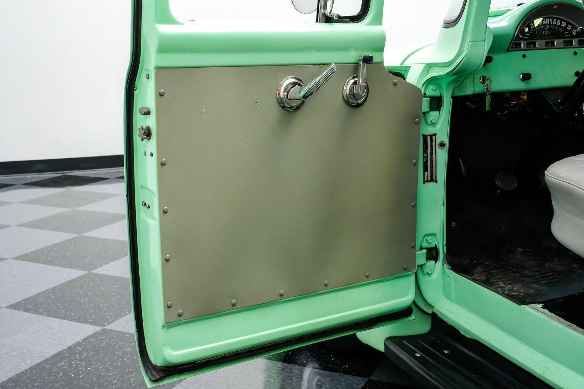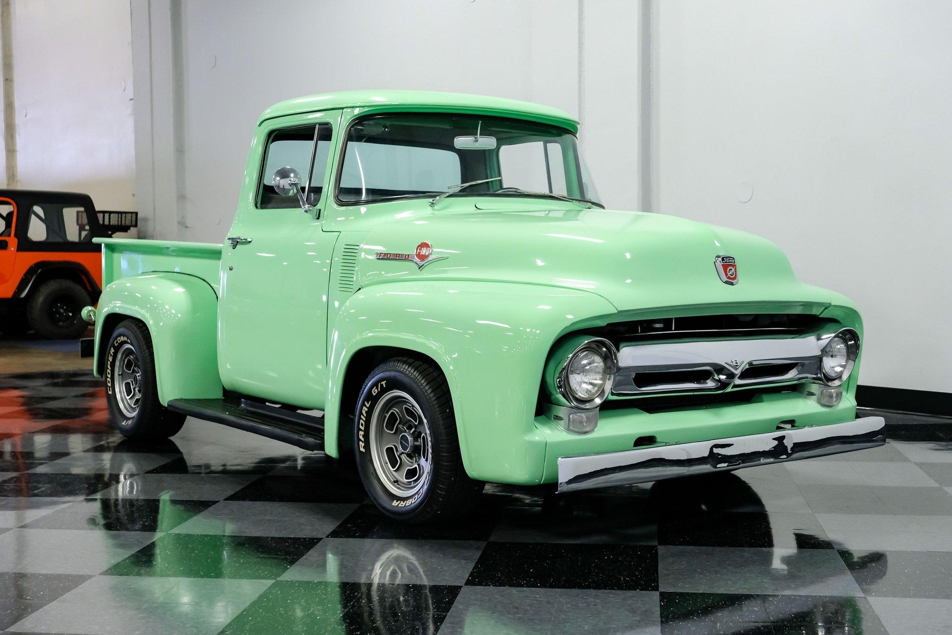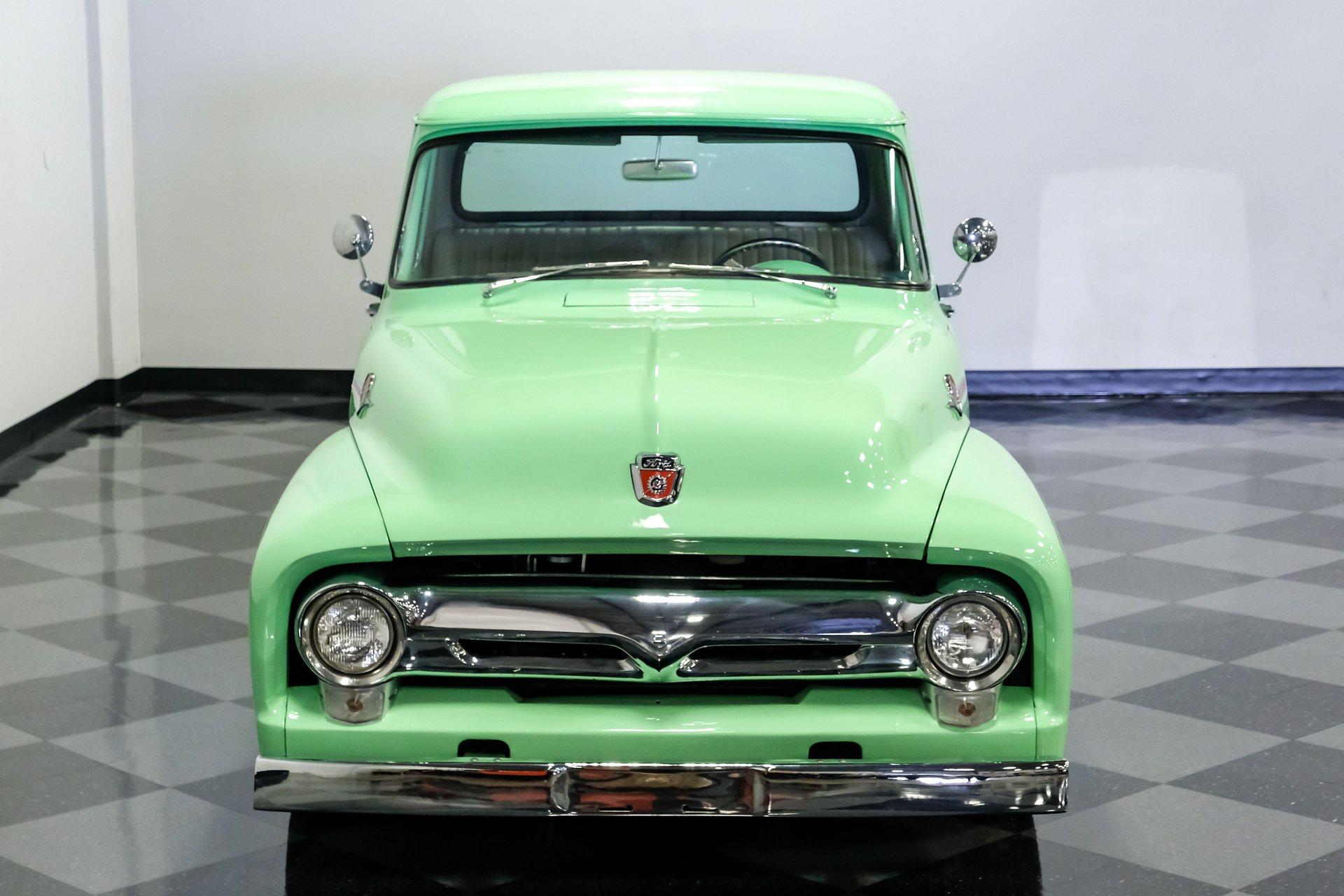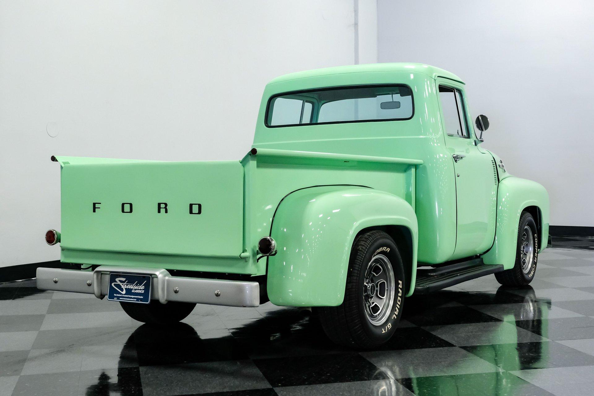 This 1956 Ford F-100 comes to us wearing a very pretty coat of Meadow Mist Green, a factory-correct hue that evokes the feeling of driving a dirt road on a Texas prairie. The truck's clean, flowing lines are enhanced by custom touches like an integrated fuel filler door for the relocated fuel tank as well as a streamlined tailgate. Sitting on 15-inch Vision wheels, this F-100 cuts a striking figure, especially with its slightly lowered stance that gives it an extra dose of attitude. Inside, gray vinyl covers the bench seat and door panels, creating a crisp, period-appropriate interior. A banjo-style steering wheel adds a dash of style, while Classic Instruments gauges blend vintage looks with modern reliability. Power steering and under-dash air conditioning make this F-100 a joy to drive, whether you're cruising Main Street or heading out on the highway. The column-mounted shifter for the 3-speed manual transmission keeps things authentically old-school. Under the hood, Ford's 312 V8 takes center stage, breathing through an Edelbrock 4-barrel carburetor. The engine bay showcases a mix of original components and smart upgrades, including a Cadillac-style air grabber. An X-pipe dual exhaust system provides a muscular soundtrack, while power drum brakes at all four corners offer confident stopping power. This powertrain combo delivers plenty of get-up-and-go for cruising or hauling, staying true to the F-100's versatile nature. HIGHLIGHTS: 312 V8 engine 3-speed manual transmission Edelbrock 4-barrel carburetor X-pipe dual exhaust system Power steering Power brakes Lowered suspension Meadow Mist Green paint Custom smooth tailgate Integrated fuel filler in rear fender Gray interior with bench seat Banjo-style steering wheel Classic Instruments gauges Under-dash air conditioning Body-off restoration This 1956 Ford F-100 combines classic style with subtle hot rod flair. From its potent V8 to its comfortable, upgraded interior, this truck offers an ideal blend of vintage appeal and modern drivability. Perfect for weekend cruises or daily drives, this F-100 is ready to hit the road. Call today!