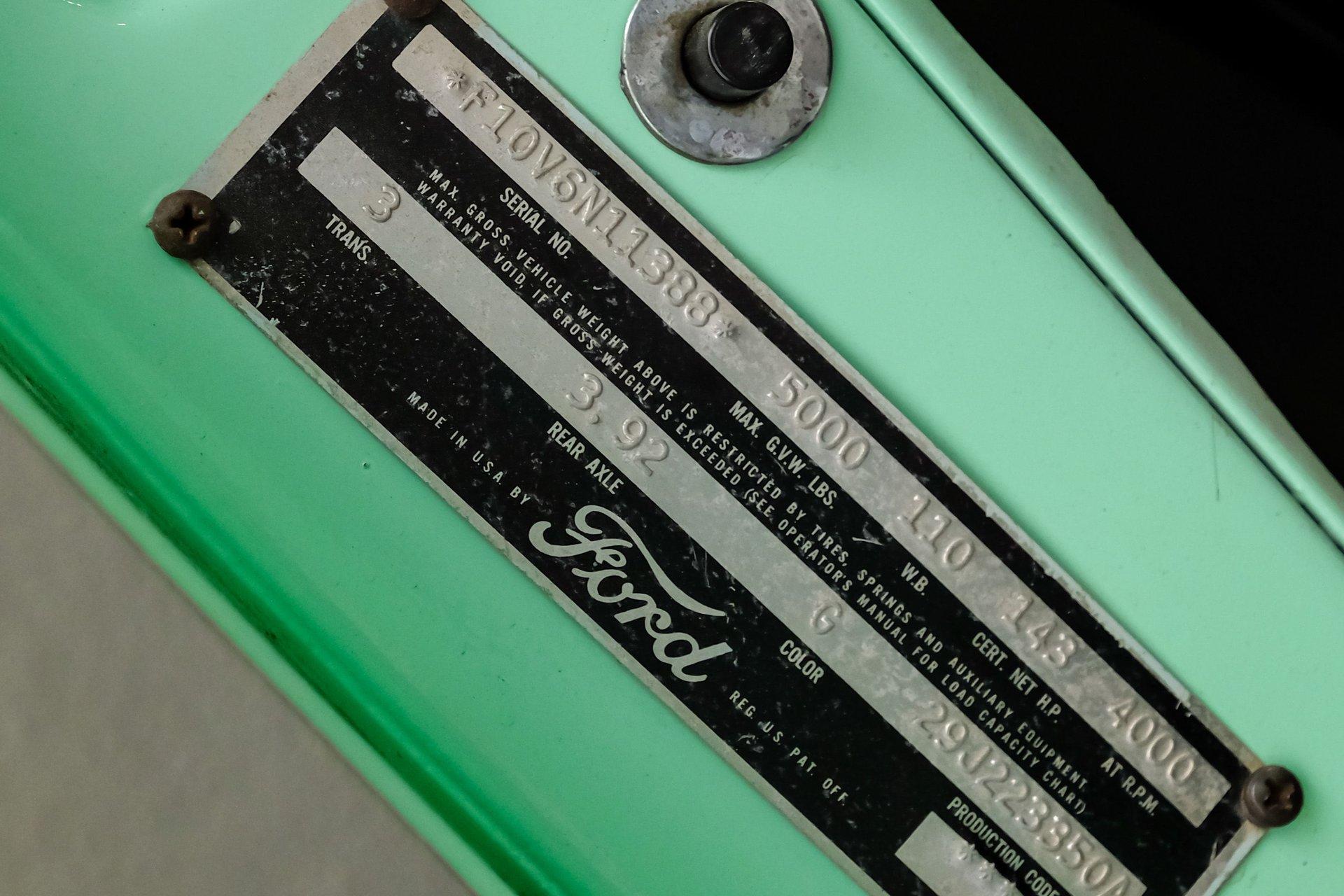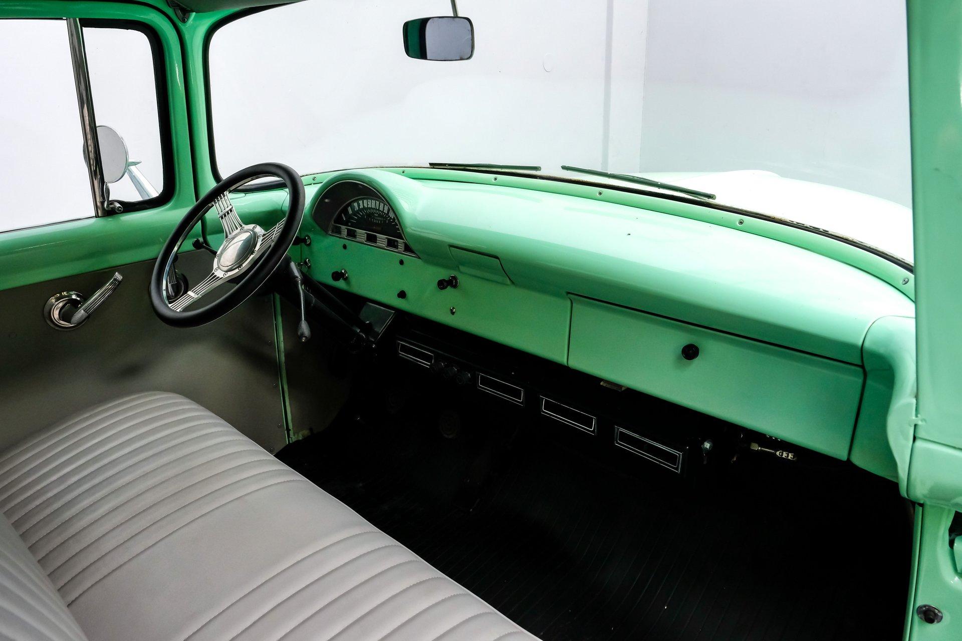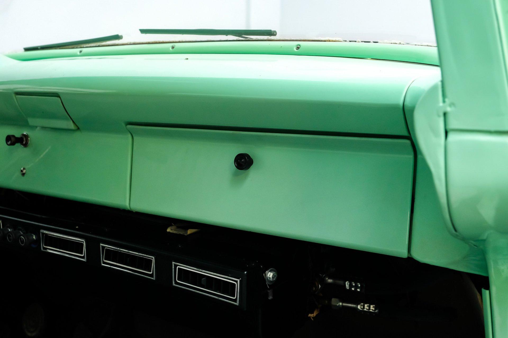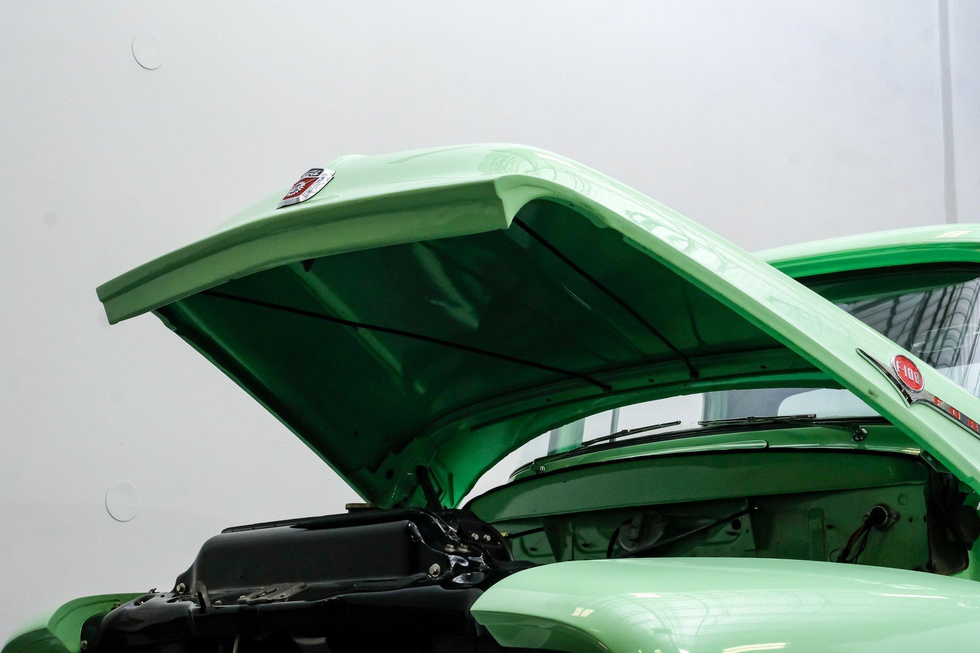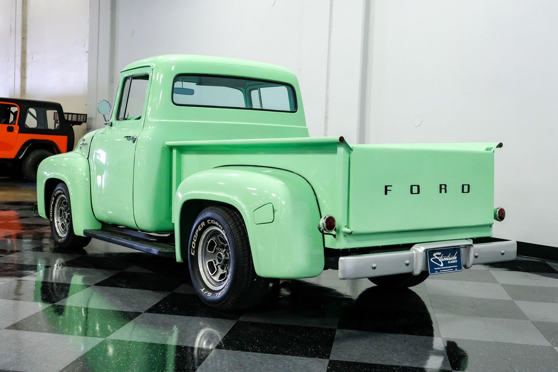 This 1956 Ford F-100 comes to us wearing a very pretty coat of Meadow Mist Green, a factory-correct hue that evokes the feeling of driving a dirt road on a Texas prairie. The truck's clean, flowing lines are enhanced by custom touches like an integrated fuel filler door for the relocated fuel tank as well as a streamlined tailgate. Sitting on 15-inch Vision wheels, this F-100 cuts a striking figure, especially with its slightly lowered stance that gives it an extra dose of attitude. Inside, gray vinyl covers the bench seat and door panels, creating a crisp, period-appropriate interior. A banjo-style steering wheel adds a dash of style, while Classic Instruments gauges blend vintage looks with modern reliability. Power steering and under-dash air conditioning make this F-100 a joy to drive, whether you're cruising Main Street or heading out on the highway. The column-mounted shifter for the 3-speed manual transmission keeps things authentically old-school. Under the hood, Ford's 312 V8 takes center stage, breathing through an Edelbrock 4-barrel carburetor. The engine bay showcases a mix of original components and smart upgrades, including a Cadillac-style air grabber. An X-pipe dual exhaust system provides a muscular soundtrack, while power drum brakes at all four corners offer confident stopping power. This powertrain combo delivers plenty of get-up-and-go for cruising or hauling, staying true to the F-100's versatile nature. HIGHLIGHTS: 312 V8 engine 3-speed manual transmission Edelbrock 4-barrel carburetor X-pipe dual exhaust system Power steering Power brakes Lowered suspension Meadow Mist Green paint Custom smooth tailgate Integrated fuel filler in rear fender Gray interior with bench seat Banjo-style steering wheel Classic Instruments gauges Under-dash air conditioning Body-off restoration This 1956 Ford F-100 combines classic style with subtle hot rod flair. From its potent V8 to its comfortable, upgraded interior, this truck offers an ideal blend of vintage appeal and modern drivability. Perfect for weekend cruises or daily drives, this F-100 is ready to hit the road. Call today!