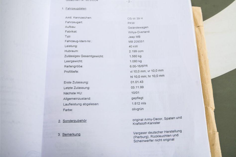 This Willys MB is a veteran vehicle that is in good technical condition and still performs surprisingly well on the road, with a smooth-running engine, tight handling typical of Jeeps and a gear lever that gives exactly the mechanical feel that belongs with this type of vehicle. In the mid-1990s, the jeep underwent a thorough restoration, with the emphasis on preserving its authentic character and military appearance, but at the same time a great deal of attention was paid to sound engineering, making it suitable for both historic rides and recreational use. It is precisely this combination of a historic 1943 war jeep with a reliable, well-driving base and an older, honest restoration that makes this example particularly attractive to enthusiasts who want to feel, hear and experience the story, not just look at it. Finally, this 1943 Willys MB comes with an impressive package of documentation, just as you would hope for with a serious war jeep. The car was acquired from a genuine German enthusiast who, in the best old-fashioned German tradition, has kept everything neatly organised in a folder: documents, notes and historical pieces that substantiate the story of this jeep on paper and make its past even more tangible. This rich dossier of paperwork is the ideal complement to its appearance and driving characteristics and makes this example extra interesting for the collector who values provenance, history and a well-documented life. You don't sell a 1943 Willys Jeep MB, you sell it by letting its story speak for itself: a driving war legend, built in the hottest phase of the Second World War and known worldwide as the symbol of mobility, freedom and progress at the front. This 1943 jeep dates from the period when production was in full swing and vehicles were being shipped in large numbers to active fronts, making it highly likely that a model from this year of manufacture actually saw service in wartime, as a reconnaissance vehicle, command vehicle or silent soldier in a convoy. The Willys MB was praised for its simplicity, four-wheel drive and surprising manoeuvrability; it drove over beaches, forest paths, muddy roads and rubble, exactly where other vehicles got stuck, and thus became one of the most iconic vehicles of the Allied forces. This particular example, with manual windscreen wipers on both front windows, exudes the atmosphere of the early models, where the technology was purely functional and every lever and detail can be traced directly back to military necessity. Those hand wipers are a beautiful, characteristic detail that harks back to the jeep's origins as an indestructible workhorse on the front line. In combination with the folding windscreen, the sleek, flat mudguards and the sober, uncluttered dashboard, this creates a raw and robust appearance that hides nothing and tells everything about its origins: no luxury, no unnecessary frills, but pure, purposeful design as was needed in the midst of war. A 1943 Willys MB is therefore much more than a classic car; it is a tangible piece of military history that is still in use today, ideal for liberation rides, commemorations and events, but also simply to enjoy that characteristic WW2 feeling on a sunny day, open and unfiltered, which has made the jeep world famous.Deze Willys MB is een rijdende veteraan die technisch in goede conditie verkeert en zich op de weg nog altijd verrassend vitaal toont, met een soepel lopende motor, strakke wegligging naar jeeptijden en een schakelpook die precies dat mechanische gevoel geeft dat bij dit type hoort. In het midden van de jaren '90 is de jeep grondig gerestaureerd, waarbij de nadruk lag op behoud van het authentieke karakter en militaire uitstraling, maar tegelijk veel aandacht is besteed aan degelijke techniek, zodat hij zowel geschikt is voor historische ritten als voor recreatief gebruik. Juist die combinatie van een historisch 1943-oorlogsjeep met een betrouwbare, goed rijdende basis en een oudere, eerlijke restauratie maakt dit exemplaar bijzonder aantrekkelijk voor de liefhebber die het verhaal wil voelen, horen en ervaren, niet alleen bekijken. Tot slot wordt deze 1943 Willys MB vergezeld door een indrukwekkend pakket aan documentatie, precies zoals je dat hoopt bij een serieuze oorlogsjeep, de auto is overgenomen van een echte Duitse liefhebber die geheel in de beste ouderwetse Duitse traditie, alles netjes geordend in een map heeft bewaard: documenten, aantekeningen en historische stukken die het verhaal van deze jeep op papier onderbouwen en zijn verleden nog tastbaarder maken. Dat rijke dossier aan papierwerk vormt de ideale aanvulling op zijn uitstraling en rij-eigenschappen en maakt dit exemplaar extra interessant voor de verzamelaar die waarde hecht aan herkomst, historie en een goed gedocumenteerd leven. Een Willys Jeep MB uit 1943 verkoop je niet, die verkoop je door zijn verhaal te laten spreken: een rijdende oorlogslegende, gebouwd in de heetste fase van de Tweede Wereldoorlog en wereldwijd bekend als het symbool van mobiliteit, vrijheid en vooruitgang aan het front. Deze 1943-jeep stampt uit de periode waarin de productie op volle toeren draaide en de voertuigen in grote aantallen naar actieve fronten werden verscheept, waardoor de kans groot is dat juist een exemplaar uit dit bouwjaar daadwerkelijk in oorlogsomstandigheden heeft gefunctioneerd, als verkenningsvoertuig, commandowagen of stille soldaat in een konvooi. De Willys MB werd geroemd om zijn eenvoud, vierwielaandrijving en verrassende wendbaarheid; hij reed over stranden, bospaden, modderwegen en puin, precies daar waar andere voertuigen vastliepen, en groeide daardoor uit tot een van de meest iconische voertuigen van de geallieerde strijdkrachten. Dit specifieke exemplaar met handmatige ruitenwissers op beide voorruiten ademt de sfeer van de vroege modellen, waarbij de techniek puur functioneel was en iedere hendel en ieder detail rechtstreeks terug te voeren is op militaire noodzaak, die handwissers 