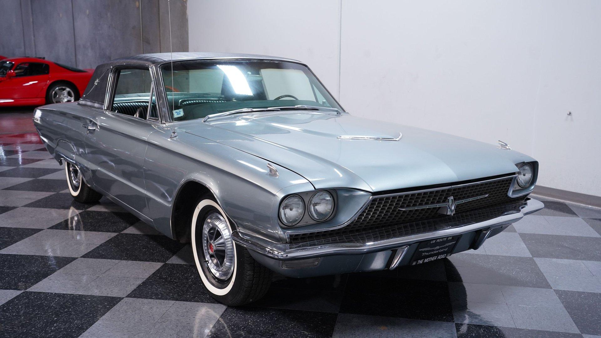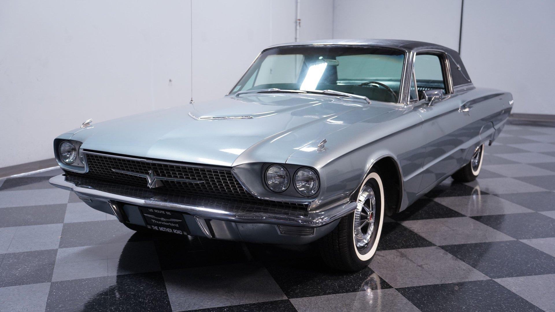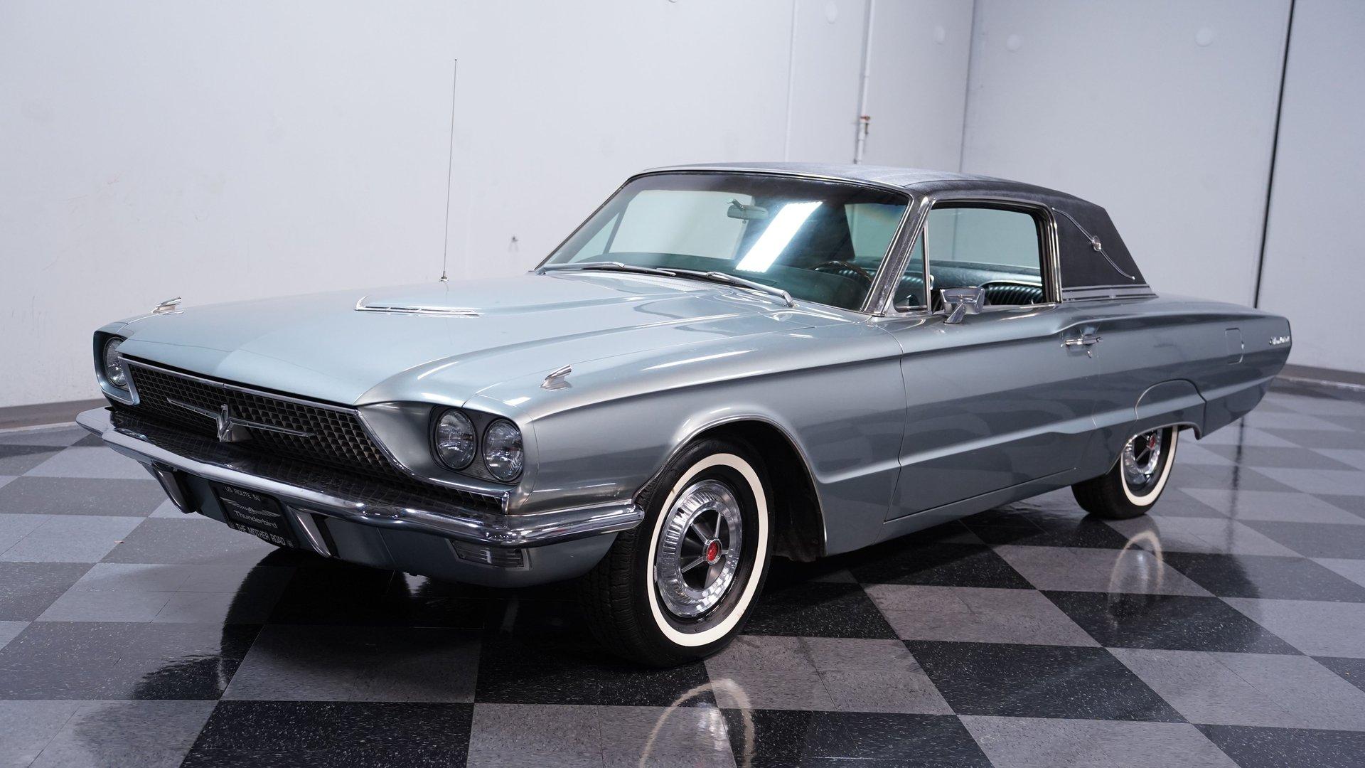 Designed for the executive class, this 1966 Ford Thunderbird Town Landau was among the special editions featuring the distinctive "town roof" with no rear quarter windows. The factory correct Silver Mink Metallic paint creates an aristocratic presence, complemented by the black vinyl top. Chrome accents frame the vinyl roof elegantly while the front bumper displays Ford's commitment to substantial styling. Rolling on 15" wheels with 215/75R15 whitewall tires, this Thunderbird's long, flowing lines exemplify mid-60s American luxury. The black vinyl bucket seats offer ample comfort for long drives, surrounded by clean door panels with tasteful wood grain accents. A tilt-away steering column allows easy entry to the luxurious interior. The factory gauges remain in excellent condition within the sleek dashboard, while an original in-dash AM radio with 8-track player adds to the vintage feel. Black carpet with Thunderbird floor mats completes the sophisticated cabin atmosphere. A 390 cubic inch V8 engine propels this luxury cruiser, paired with a smooth-operating 3-speed automatic transmission for effortless acceleration. Ford's engineering excellence continues with power steering, power front disc brakes, and factory air conditioning that still blows cold. The dual exhaust system provides a subtle but authoritative tone, perfectly matching the refined character of this grand tourer. HIGHLIGHTS: 390 V8 Engine 3-Speed Automatic Transmission Holley 4-Barrel Carburetor Dual Exhaust System Power Front Disc Brakes Power Steering Silver Mink Metallic Paint Black Vinyl Top 15" Wheels with 215/75R15 Whitewall Tires Sequential Tail Lights Black Interior with Bucket Seats with Console Tilt-Away Steering Column AM Radio with 8-Track Player Air Conditioning A genuine American luxury icon, this 1966 Ford Thunderbird Town Landau delivers the perfect combination of 390 V8 power and unmatched refinement. From its unmistakable silhouette to its well-appointed interior, this personal luxury car represents Detroit at its innovative best. Call today!