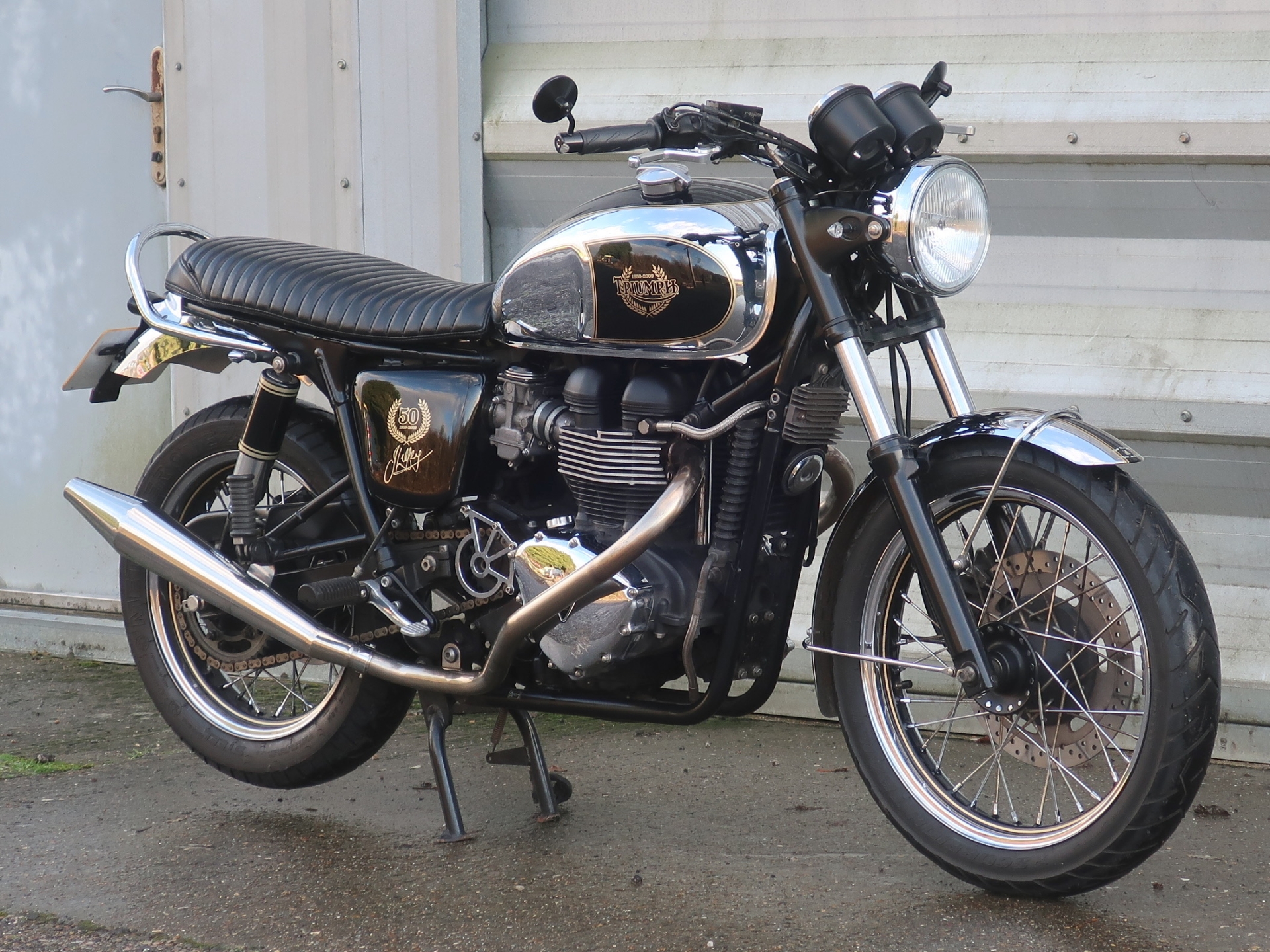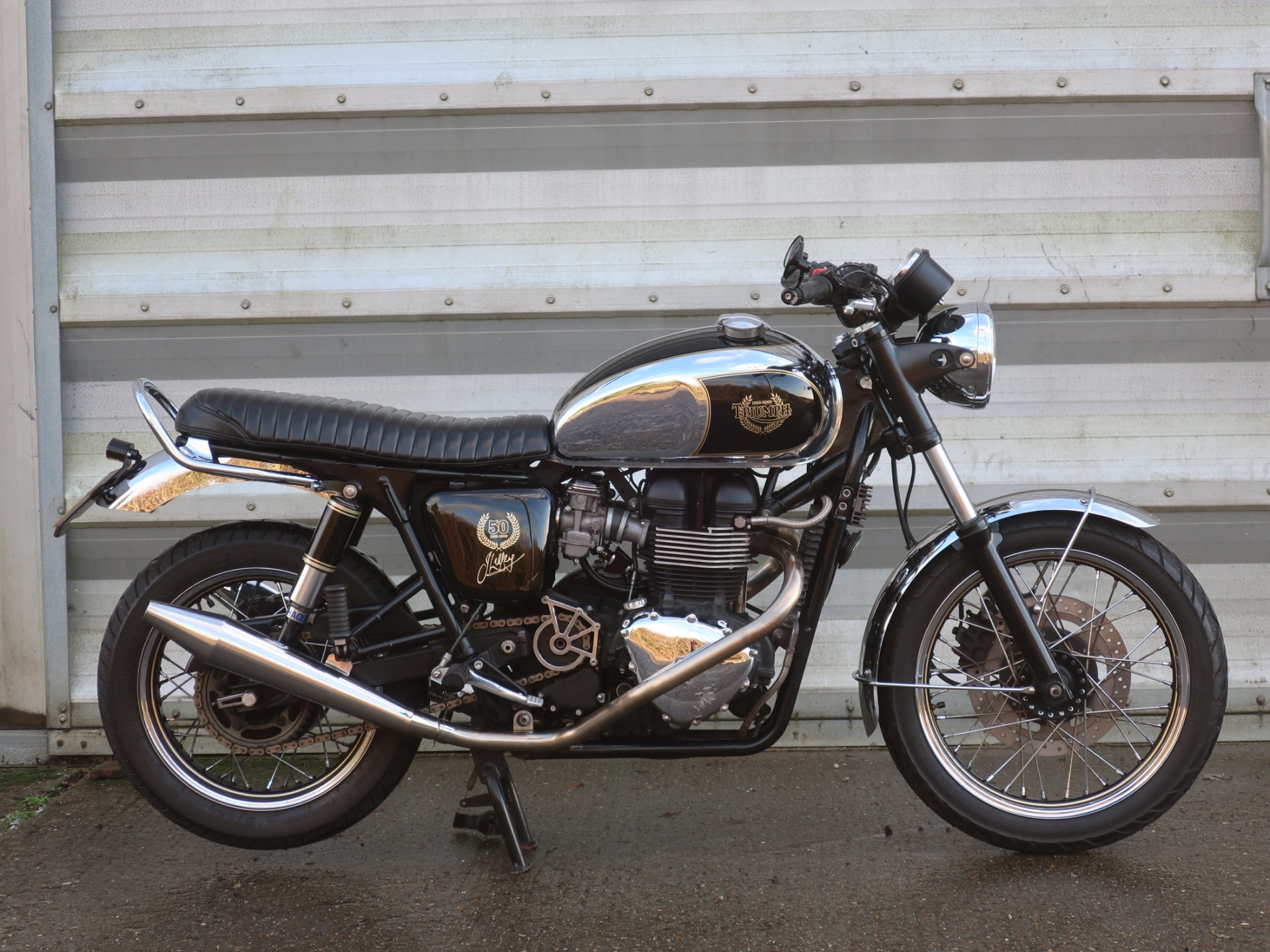 Conceived in 2009 on an existing 865cc Bonneville this ‘one off ‘ special edition bike featured a special livery with chrome and black painted fuel tank, mudguards and wheels.