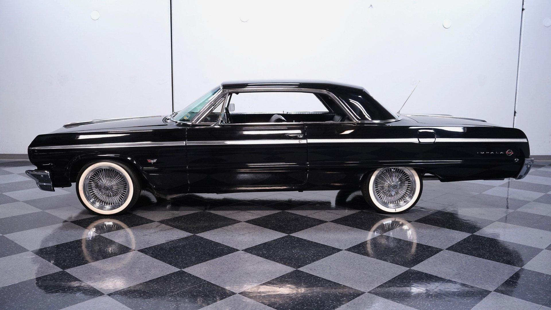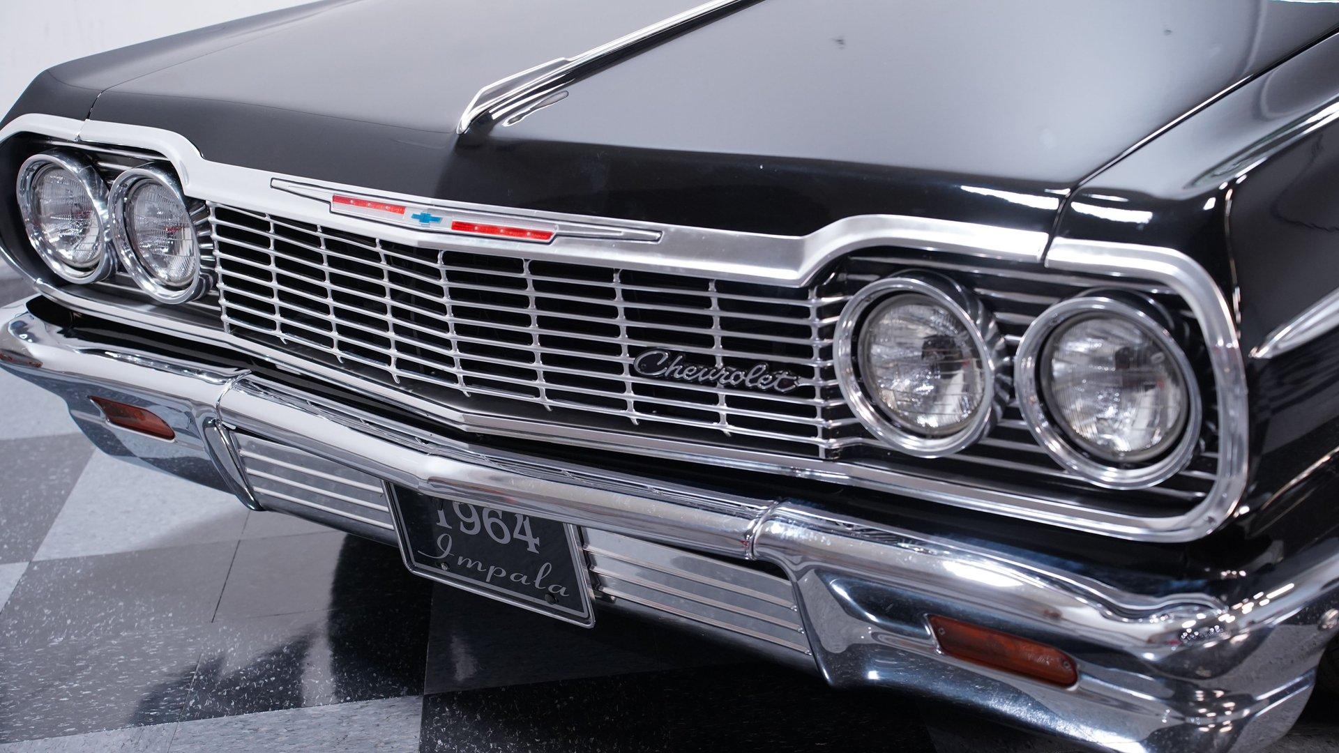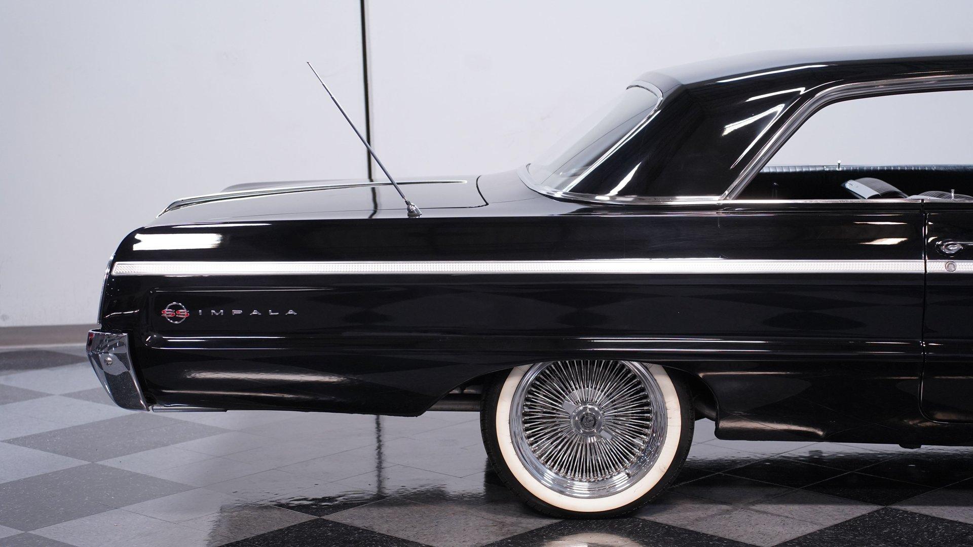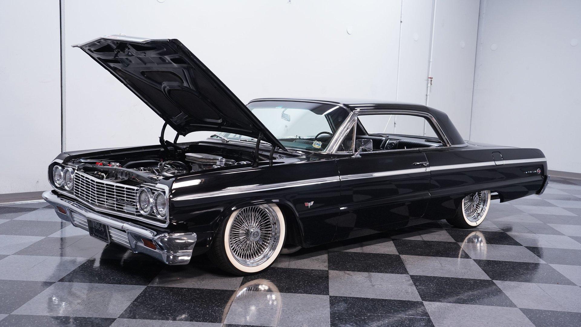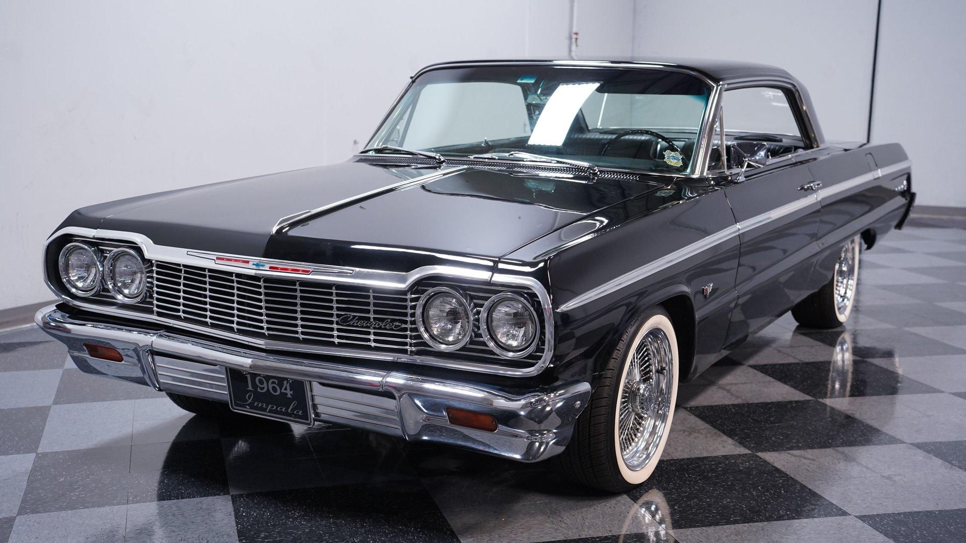 Decked out in high-impact black paint and showing just the right aggressively lowered stance you'd expect, given its bona fide, boulevard royalty status, this 1964 Chevrolet Impala SS makes a strong, positive impression right off the bat. The combination of its slick, well-applied paint with an assortment of chrome that looks great, even for a member of an automotive segment known for striking aesthetics, adds up to outstanding curb appeal. That aforementioned stance, coming as the result of its air suspension, gives the appearance that this classic Chevy is cruising the asphalt even when standing still. Climb inside, and you'll be surrounded by a black vinyl interior that's sure to impress. The front buckets and rear bench seat show only the slightest of wear, and both the headliner and carpeting are well-fitted and have a nice, fresh appearance. You'll find a factory-style steering wheel perched on the column, and the dash area beyond it is also in clean shape, with a full assortment of upgraded gauges in its instrument cluster and a straight, crack-free dash pad spanning its width. When the time comes for some music, there's an AM/FM stereo with an auxiliary port on hand that pairs with a set of Pioneer speakers to fill the cabin with quality sound. Unlike many of its counterparts, this Impala features a strong driving condition that will actually make you look forward to getting behind the wheel. It's powered by a 350-cubic-inch crate engine that's running at the top of its game and holds court in a compartment filled with enough chrome components to satisfy even the most ardent fan of striking engine bays. The V8 is outfitted with FiTech electronic fuel-injection that sits on top of a chrome Edelbrock Performer EPS intake manifold and pairs with an automatic four-speed 700R4 transmission with an overdrive gear to lower RPMs at highway speeds. With its long tube headers leading to a dual exhaust that terminates in a pair of Flowmaster mufflers, this Chevy sounds just as good as it runs. Power steering makes this low-slung cruiser easy to maneuver, while power disc brakes at all four corners provide fade-resistant stopping ability. HIGHLIGHTS 350-CUBIC-INCH CRATE V8 FITECH ELECTRONIC FUEL INJECTION CHROME EDELBROCK PERFORMER EPS INTAKE MANIFOLD 4-SPEED AUTOMATIC 700R4 TRANSMISSION WITH OVERDRIVE UPGRADED ALUMINUM RADIATOR WITH ELECTRIC FAN LONG TUBE HEADERS DUAL EXHAUST, WITH FLOWMASTER MUFFLERS POWER STEERING FOUR WHEEL POWER DISC BRAKES OUTSTANDING ARRAY OF CHROME COMPONENTS BENEATH THE HOOD ADJUSTABLE AIR SUSPENSION HIGH IMPACT BLACK PAINT 17" LUXOR WIRE WHEELS BLACK VINYL UPHOLSTERY BUCKET SEATS CENTER CONSOLE AIR CONDITIONING (CURRENTLY INOPERABLE) Riding on a set of ultra-sharp 17" Luxor wire wheels that are wrapped with low-profile white wall tires still showing plenty of tread, this 1964 Chevrolet Impala SS is sure to attract plenty of attention wherever it goes, and it would look fantastic in any garage. Call today!