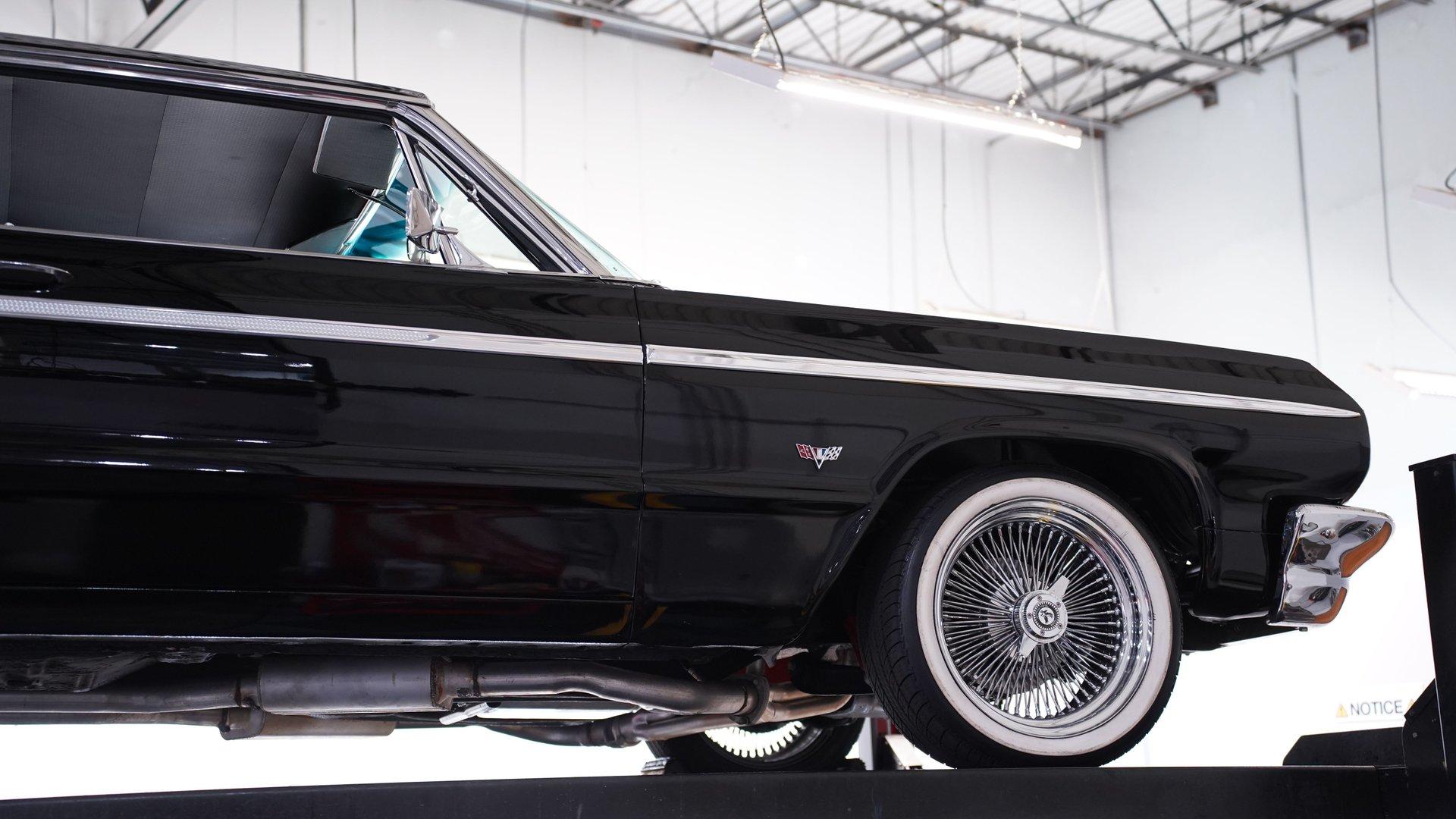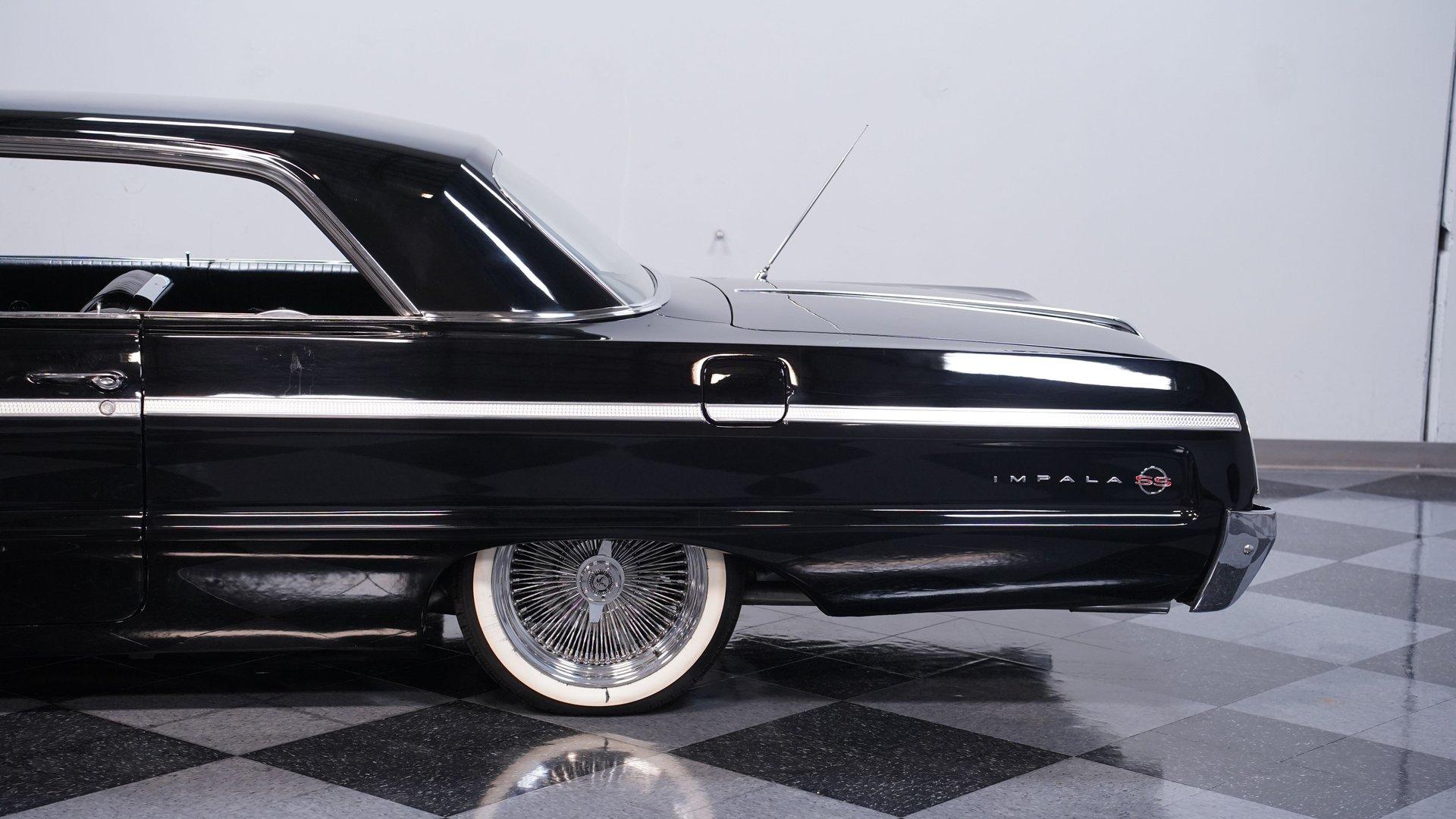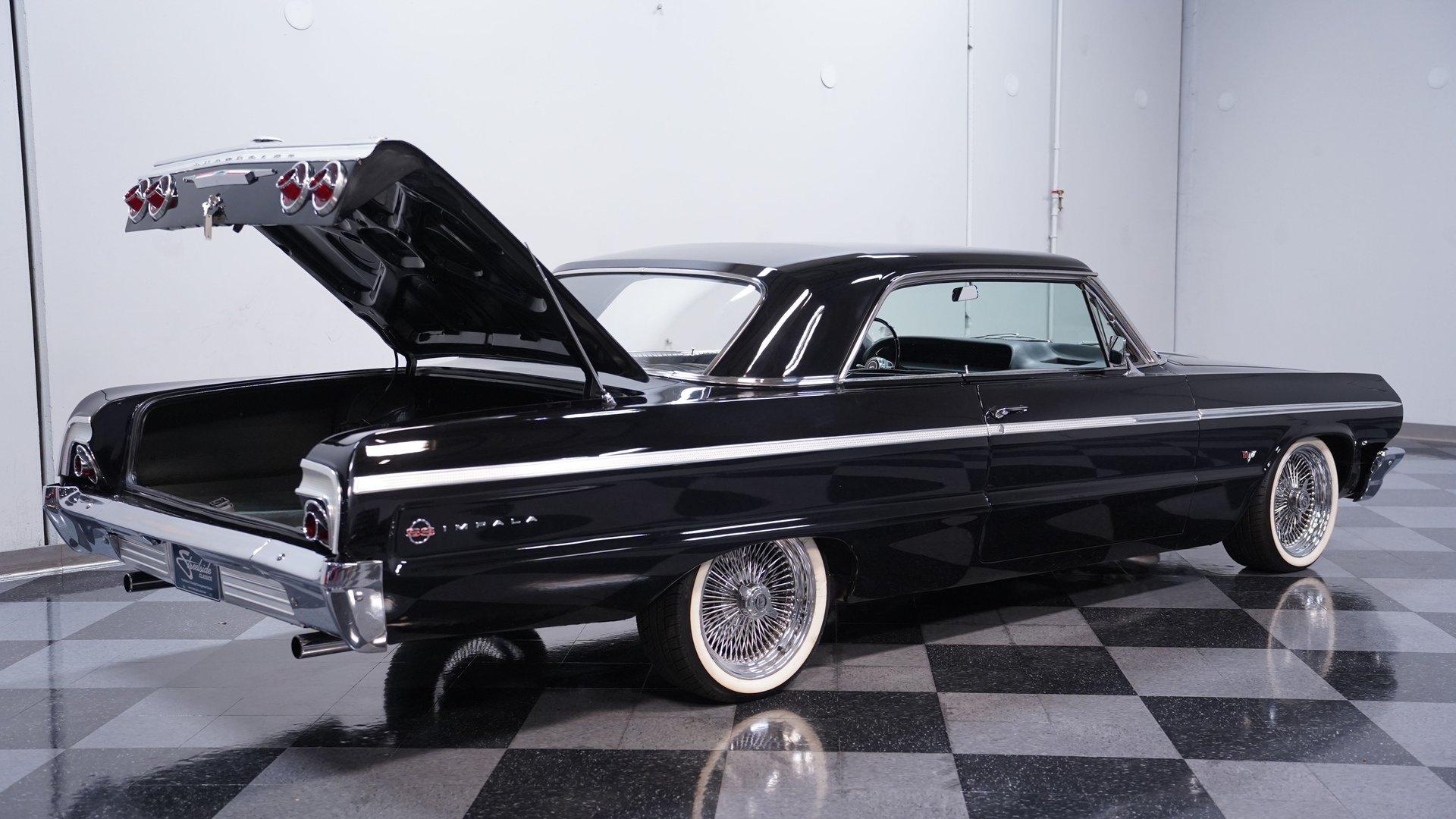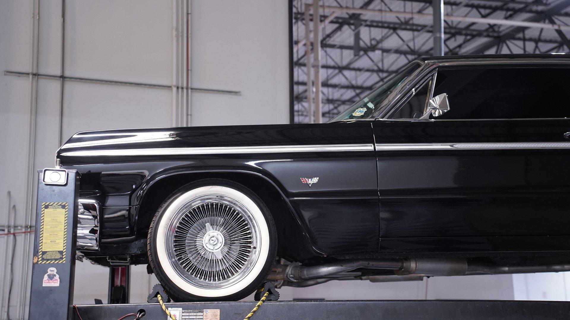 Decked out in high-impact black paint and showing just the right aggressively lowered stance you'd expect, given its bona fide, boulevard royalty status, this 1964 Chevrolet Impala SS makes a strong, positive impression right off the bat. The combination of its slick, well-applied paint with an assortment of chrome that looks great, even for a member of an automotive segment known for striking aesthetics, adds up to outstanding curb appeal. That aforementioned stance, coming as the result of its air suspension, gives the appearance that this classic Chevy is cruising the asphalt even when standing still. Climb inside, and you'll be surrounded by a black vinyl interior that's sure to impress. The front buckets and rear bench seat show only the slightest of wear, and both the headliner and carpeting are well-fitted and have a nice, fresh appearance. You'll find a factory-style steering wheel perched on the column, and the dash area beyond it is also in clean shape, with a full assortment of upgraded gauges in its instrument cluster and a straight, crack-free dash pad spanning its width. When the time comes for some music, there's an AM/FM stereo with an auxiliary port on hand that pairs with a set of Pioneer speakers to fill the cabin with quality sound. Unlike many of its counterparts, this Impala features a strong driving condition that will actually make you look forward to getting behind the wheel. It's powered by a 350-cubic-inch crate engine that's running at the top of its game and holds court in a compartment filled with enough chrome components to satisfy even the most ardent fan of striking engine bays. The V8 is outfitted with FiTech electronic fuel-injection that sits on top of a chrome Edelbrock Performer EPS intake manifold and pairs with an automatic four-speed 700R4 transmission with an overdrive gear to lower RPMs at highway speeds. With its long tube headers leading to a dual exhaust that terminates in a pair of Flowmaster mufflers, this Chevy sounds just as good as it runs. Power steering makes this low-slung cruiser easy to maneuver, while power disc brakes at all four corners provide fade-resistant stopping ability. HIGHLIGHTS 350-CUBIC-INCH CRATE V8 FITECH ELECTRONIC FUEL INJECTION CHROME EDELBROCK PERFORMER EPS INTAKE MANIFOLD 4-SPEED AUTOMATIC 700R4 TRANSMISSION WITH OVERDRIVE UPGRADED ALUMINUM RADIATOR WITH ELECTRIC FAN LONG TUBE HEADERS DUAL EXHAUST, WITH FLOWMASTER MUFFLERS POWER STEERING FOUR WHEEL POWER DISC BRAKES OUTSTANDING ARRAY OF CHROME COMPONENTS BENEATH THE HOOD ADJUSTABLE AIR SUSPENSION HIGH IMPACT BLACK PAINT 17" LUXOR WIRE WHEELS BLACK VINYL UPHOLSTERY BUCKET SEATS CENTER CONSOLE AIR CONDITIONING (CURRENTLY INOPERABLE) Riding on a set of ultra-sharp 17" Luxor wire wheels that are wrapped with low-profile white wall tires still showing plenty of tread, this 1964 Chevrolet Impala SS is sure to attract plenty of attention wherever it goes, and it would look fantastic in any garage. Call today!
