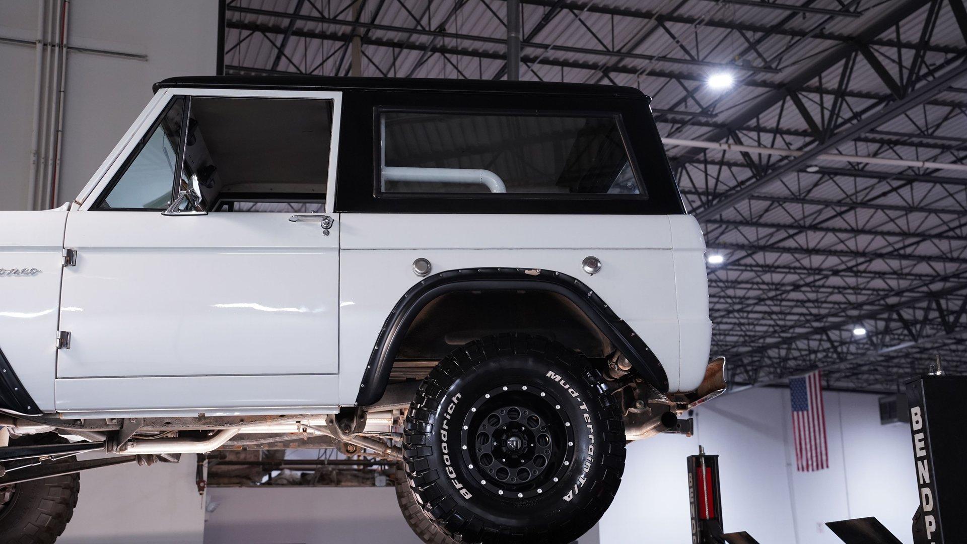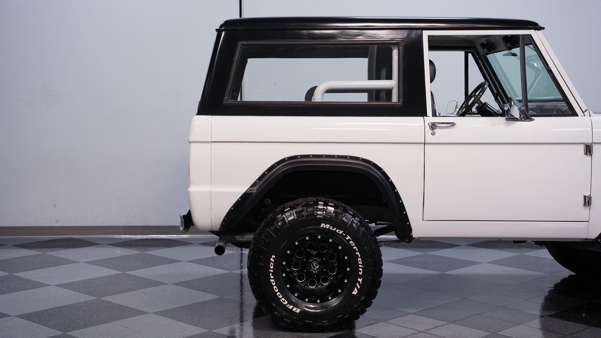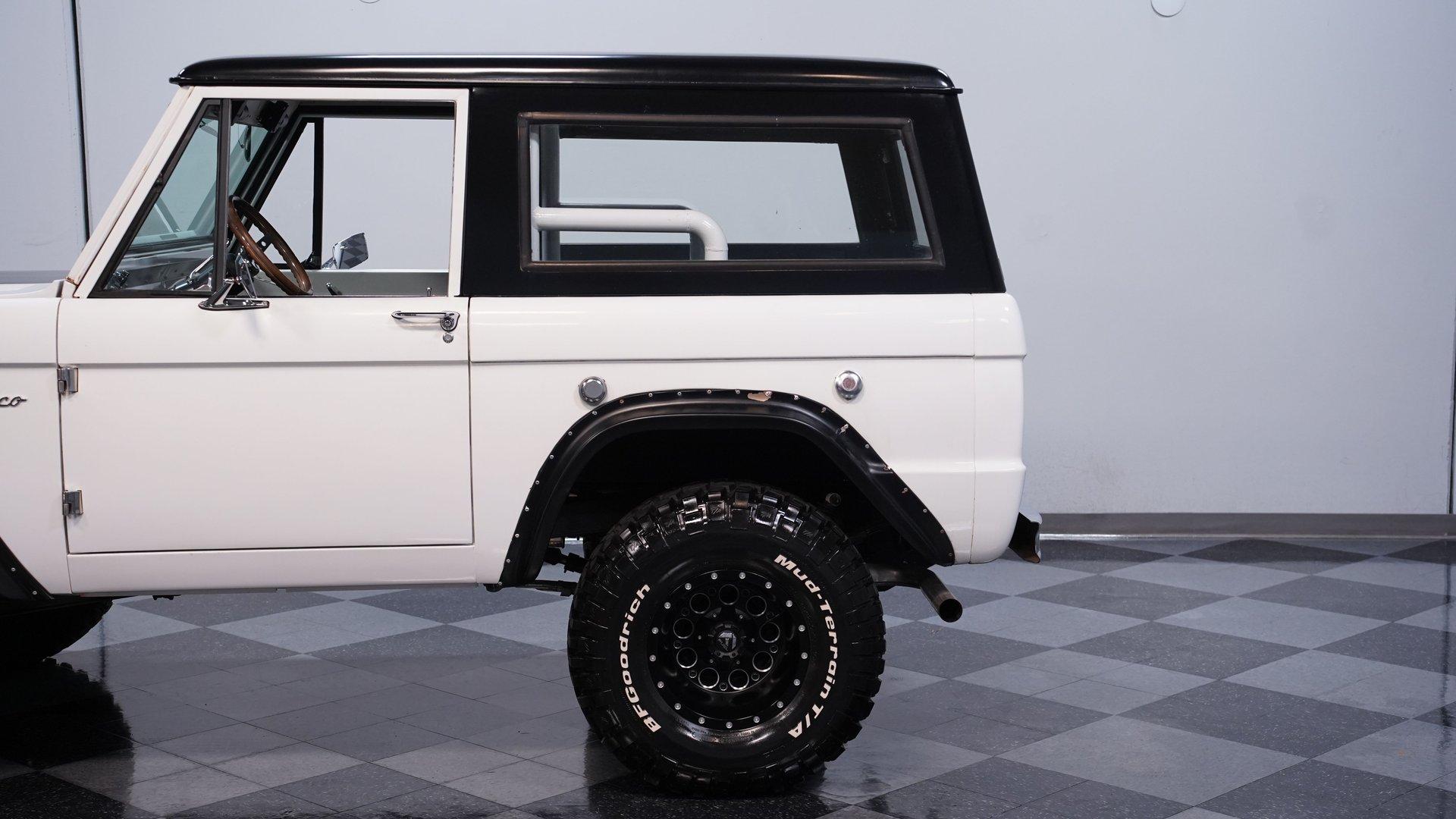 When the first-generation Bronco was released, it bridged an obvious gap in the automotive landscape, combining the rugged functionality that SUV buyers put such a premium on with more comfort and roominess, as well as better everyday drivability than the competition currently offered. Dressed in clean white paint and showing evidence of a thorough restoration, this 1967 Ford Bronco is an outstanding example of that pivotal class of vehicles. Sporting a tastefully elevated stance that enhances ground clearance without sacrificing maneuverability, it's a very sharp ride, with a well-fitted black hardtop that provides an effective contrast while also offering protection from the elements, and an assortment of unblemished chrome trim. The interior really shows nicely, with black vinyl upholstery in both front and back that looks clean, and an expanse of carpeting in matching condition. The sizable center console features ample lockable storage space, while positioning a pair of cupholders within easy reach, and farther forward, you'll find the distinctive, "twin-stick" levers that unleashes this vintage Ford's four-wheel-drive agility. A sharp woodgrain steering wheel is perched on the tilting column, and the dash area beyond it is another high point for this classic, with its freshly painted white steel surfaces and a set of clear, easily readable gauges in the instrument cluster. Whether you find yourself on the asphalt or on more unforgiving ground, there's also a retro-style stereo on hand with Bluetooth connectivity to provide your own personal soundtrack. If you're searching for a classic SUV that doesn't sacrifice drivability, then this Bronco should definitely move to the top of your "must see" list. It's powered by a 289-cubic-inch V8 that has been outfitted with an MSD Atomic electronic fuel injection system to enhance its reliability and all-weather performance. You'll find a time-tested Dana 44 axle up front to accompany the rugged Ford 9" rear axle, while James Duff shocks at all four corners equip it with a versatile ride that's equally at home both on and off the asphalt. The automatic four-speed transmission is also on point, shifting with slip-free precision to complete a drivetrain that's in top form. HIGHLIGHTS 289-CUBIC-INCH V8 MSD ATOMIC ELECTRONIC FUEL INJECTION 4-SPEED AUTOMATIC OVERDRIVE TRANSMISSION 4-WHEEL DRIVE DUAL EXHAUST, WITH XLERATOR MUFFLERS POWER STEERING POWER BRAKES, WITH DISCS UP FRONT DANA 44 FRONT AXLE TWIN STICK TRANSFER CASE PRISTINE WHITE PAINT TASTEFULLY ELEVATED STANCE BLACK VINYL UPHOLSTERY BUCKET SEATS CENTER CONSOLE AM/FM STEREO WITH AN AUXILIARY PORT AND BLUETOOTH CONNECTIVITY AIR CONDITIONING (CURRENTLY INOPERABLE) A great mix of classic aesthetics and drivability, this 1967 Ford Bronco rolls on a set of 33"x12.50R15 wheels that are wrapped with BF Goodrich All-Terrain tires still showing plenty of tread. It would be a strong match for the collector searching for a rugged, road-ready SUV still in possession of its authentic, vintage appearance. Call today!