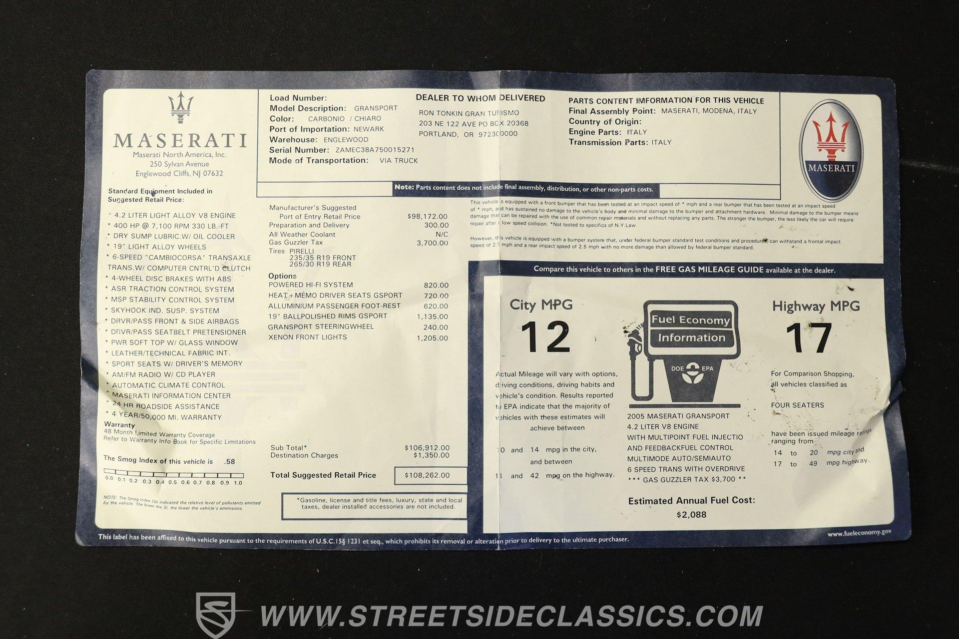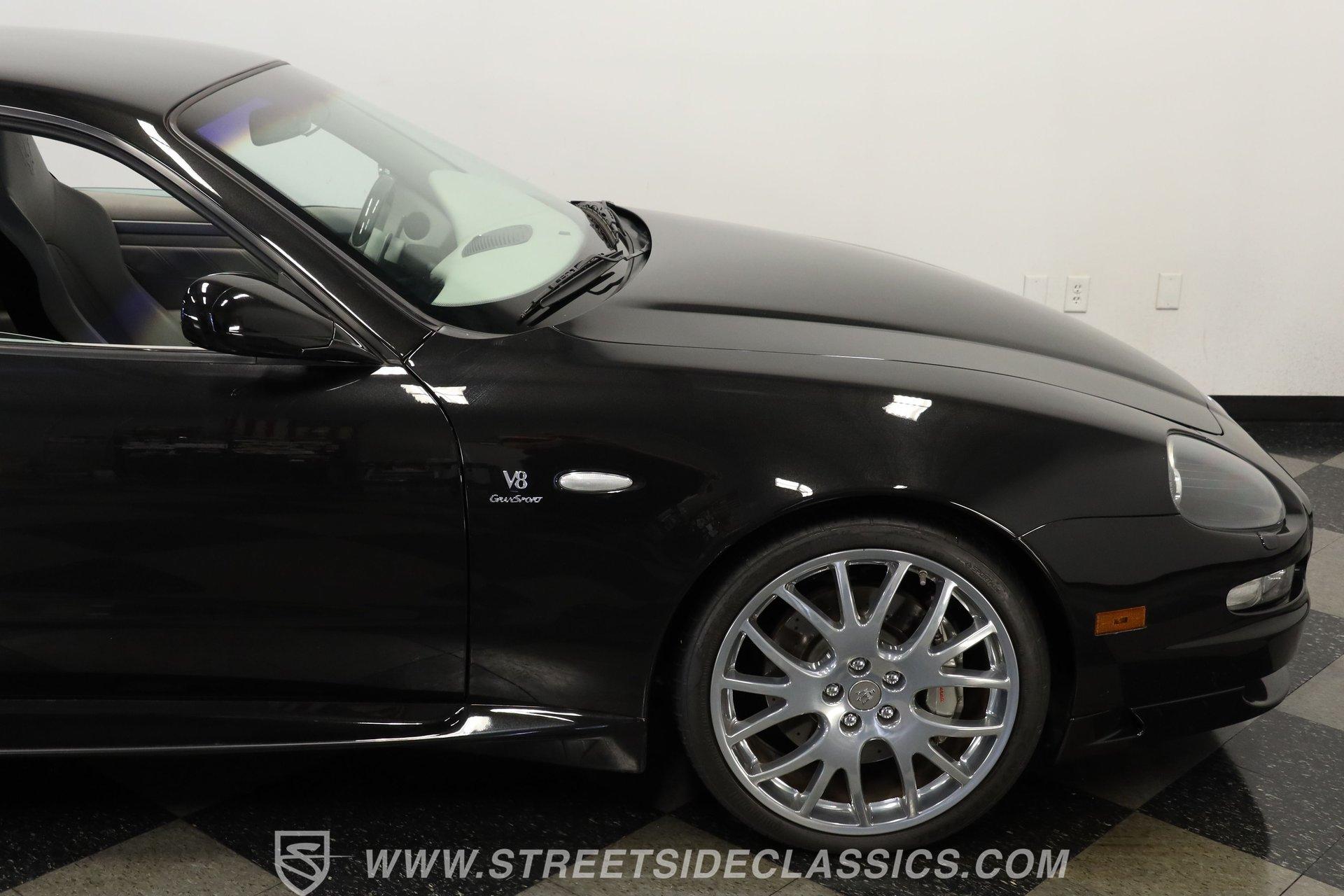 If you consider a Ferrari is just too flashy and a Mercedes SL is just plain boring, we present to you this 2005 Maserati GranSport. With a Ferrari-based V8, impeccable interior, and Italian flair that just cannot be replicated, this is the exotic that you can drive every day. Finished beautifully in Carbon Black Metallic (or Carbonio/Chiaro as Maserati calls it), and with an original sticker price just over $100k, you'd better believe this sportscar is beautifully finished. With only a mere 18,361 miles on the odometer, this Maserati is highly original and in exceptional condition. In the usual Italian fashion, the 2+2 cabin features heated power-adjustable front seats upholstered in Black leather with contrasting light grey insert upholstery that extends to the dashboard, headliner, handbrake lever boot, sun visors, and door panels. Plush carpets, elegant trim, and a sensible control layout are all plusses for the GranSport, which by virtue of its name, was designed to be a sporty yet comfortable at the same time. Big, simple gauges are easy to read ahead of the grippy steering wheel, while the center stack and console contain controls akin to the switches in a fighter jet center, and the paddle shifters behind the steering wheel make the automatic transmission that much livelier. There are plenty of buttons and tech to satisfy anyone who loves gadgets, including a newer Kenwood AM/FM/AUX/Bluetooth head unit was added in the factory slot. A few nods to the car's ancestry can be found in the Trident emblem on the center of the wheel, the classic-looking timepiece in the center of the dash, the aluminum foot pedals, and even the back seat area with twin buckets is just drop-dead gorgeous. It also includes a good-sized trunk that shows no signs of wear and tear, and there's plenty of room back there to account for most tours. There is some Ferrari DNA in the F136R 4.2-liter DOHC V8, which is rated at a lofty 400 horsepower. It loves to rev, but there's plenty of torque available at any speed, which helps with the GranSport's easy-going nature. The paddle-shifter Cambiocorsa 6-speed automated manual transmission is a bit more civilized than a regular manual, and it was re-calibrated in the GranSport, making it very easy to be smooth and fast in this car. The well-tuned suspension is an absolute joy to drive, handling the sports car in-and-out of the corners with ease. With a lower ride height and wonderful grumble from the dual exhaust, the car sounds positively heroic. Weight distribution is just about ideal, with almost equal mass between the front and rear wheels, so despite being a luxury coupe that is loaded down with options, this car doesn't mind hustling through the corners and the optional 19-inch Ballpolished alloy wheels with giant cross-drilled Brembos behind them are simply gorgeous! HIGHLIGHTS: Highly desirable GranSport model 4.2-liter DOHC V8 Cambiocorsa 6-speed Automated Transmission Stunningly finished in Carbon Black Metallic Upgraded Kenwood Stereo with Bluetooth Brembo Brakes Only 18,361 Miles from New 19-Inch Optional Ballpolished Factory Wheels Window Sticker Owner's Manual Leather Interior Beautifully maintained, exceptional to look at and a joy to drive, this low-mileage 2005 Maserati GranSport is a great opportunity to own an A-list supercar for a fraction of the price of a new one. Call today! Be sure to ask about our services offered; Financing, Vehicle Protection Plan, Insurance, and Transportation to your driveway!