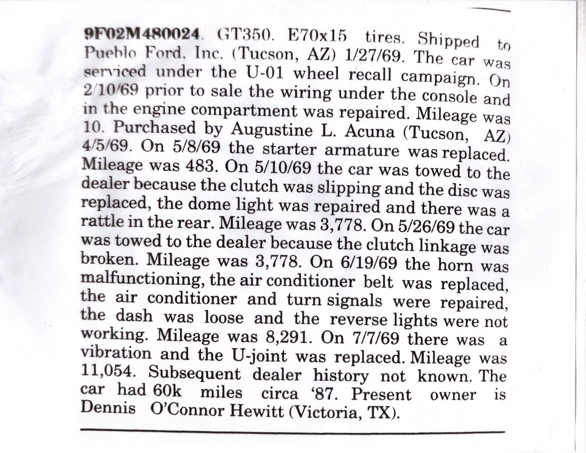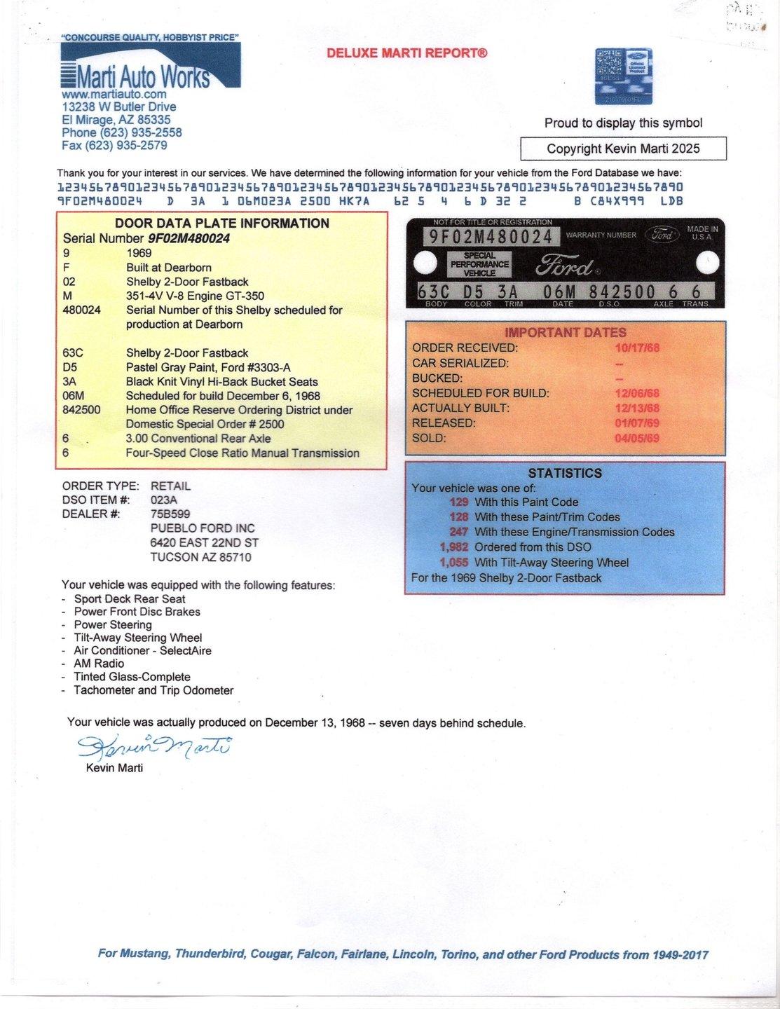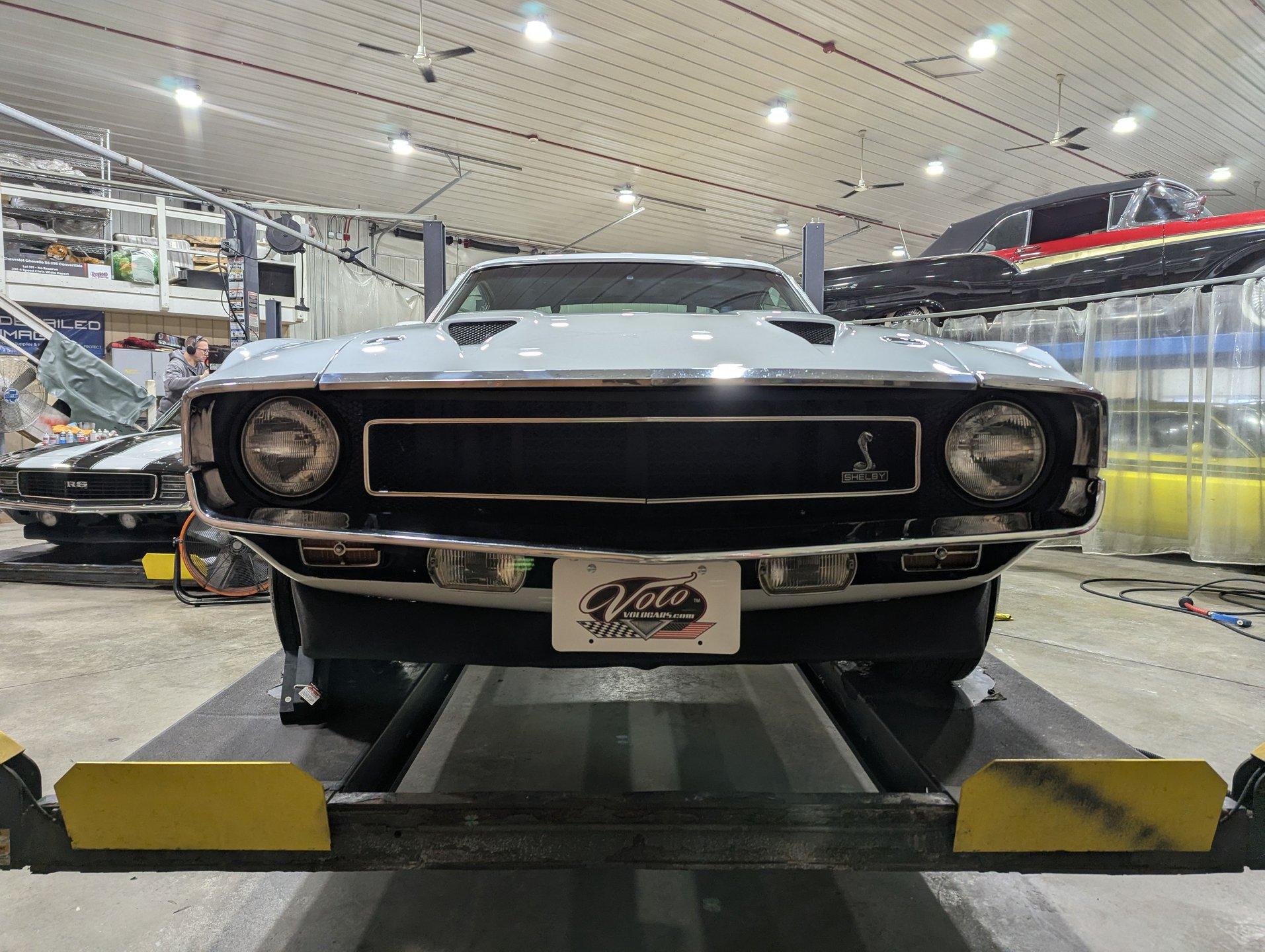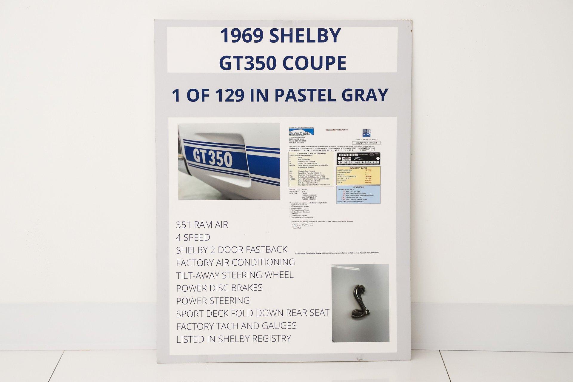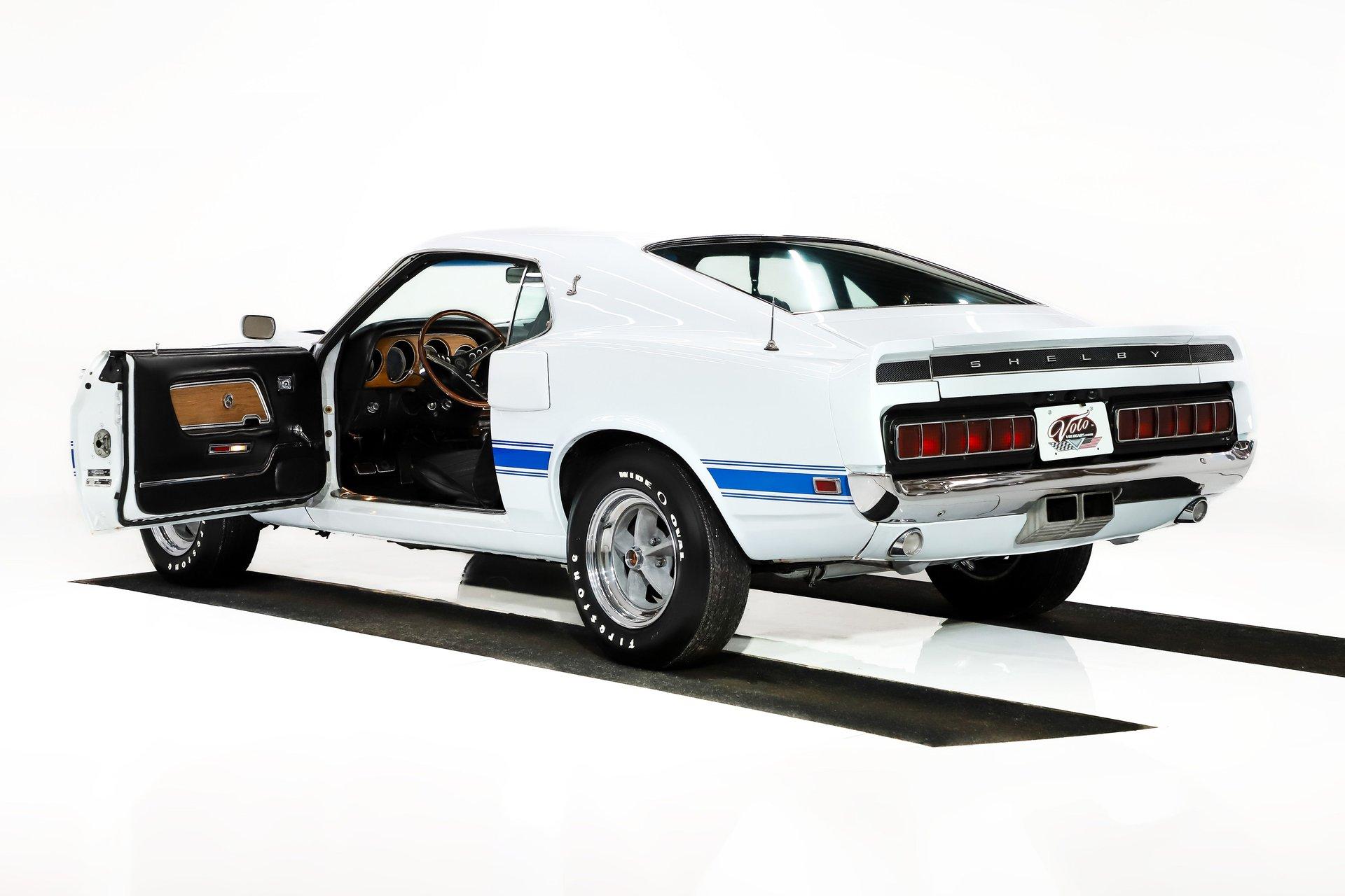 INTRODUCTION: The real deal! VIN # matching, documented by the Marti Report and Shelby registry. This is the 24th Shelby made in 1969! Only 129 in these colors, but what really makes it rare and desirable is the fact it's a 4-speed with air conditioning! Only 71,520 actual miles as indicated in the registry and on the previous title. Investment grade! EXTERIOR: The Shelby styling changes truly separated itself from the Mustangs. Distinctive fiberglass features were on everything except the roof and the doors! Upfront a wide open grill and a hood with 5 air ducts feed as much air as possible to the 351. The extended front fenders, dovetail trunk and quarter panel scoops are also fiberglass and add to the good looks of this car. Upfront features correct Lucas fog lamps and in back is a set of sequential taillights borrowed from the 65 Thunderbird. The body is believed to be original and is straight with no rust or damage. The car has a really nice repaint of its very desirable factory Pastel Gray color, (yes it looks white). The paint is smooth to the touch and has a really nice shine. The blue side stripes are reflective and really pop! The glass appears to be original and in great condition. The brightwork has a lustrous shine and I believe it's mostly original. The front grille and tail lights also look to be original and in great condition. The center mounted cast aluminum exhaust tips are one of my favorites of all time. It's sitting pretty on a gorgeous set of 15” cast aluminum Shelby rims with chrome lips. They are wrapped in a set of reproduction Firestone Wide Oval tires. INTERIOR: This is a very original and unabused interior that looks absolutely fantastic. The original black vinyl knit seats present wonderfully and I don't see a split or rip anywhere. It's equipped with the optional fold-down rear seat that doesn't look like it was ever sat in. It also has Shelby seat belts throughout and shoulder belts in the front that are attached to the Shelby roll bar. The Shelby center console is original and is complete with armrest, gauges, toggle switches and a 4-speed! The original climate controls and radio are still in place. I do not see any cracks on the dash pad and the bezels are in fantastic condition. Showing only 71,520 original documented miles on the odometer. It has a working clock on the passenger side and factory gauges including a tachometer. It also has a tilt steering column with the original steering wheel and rim blow horn. The deluxe door panels also appear to be original with a remote toggle for the driver side mirror and speakers in the lower section of each side. The rear view mirror and sun visors are definitely original. The headliner is original and a great shape but does have a couple of the stitched seams pulling apart, it's still very presentable. ENGINE COMPARTMENT: The original VIN # matching 351 cubic inch ram air V8 is still in place. It is equipped with the correct air cleaner, Shelby intake manifold, ribbed Cobra aluminum valve covers, and much more. The factory air conditioning pump and distributor are still in place. It is also outfitted with power steering and power brakes. All the components look clean and proper, the hoses and belts have been replaced. It has an Autolite radiator hose, heat riser tube and date coded spark plug wires too. The battery is properly secured plus the horns and squirters are hooked up. The underside of the fiberglass Ram Air Hood, fenderwells, and firewall are all neatly painted satin black. TRUNK COMPARTMENT: The underside of the trunk lid and inside the jamb are neatly painted Pastel Gray just like the exterior. The weatherstrip looks original but is still soft and pliable. It also has the original spare tire inflation instructions sticker which is too cool. Inside is the actual space saver spare tire, lug wrench, jack assembly, and vinyl mat. Under the mat is all solid rust-free steel with what appears to be an original textured finish paint. It also has a working trunk light. The interior can be accessed easily through a fold down hatch. UNDERSIDE: The underbody, floors, frame rails, and rockers appear to be as dry as a chalkboard. It's got original metal and lived in Texas most of its life. The steering and suspension have been rebuilt as needed and works great. Our shop just inspected and replaced the lower control arms. The rear shocks appear to be new and the car just had a front end alignment. Of course it has disc brakes in front and drums in back with a hooked up e-brake assembly. It also has a fresh exhaust system with the crossover pipe, resonators, transverse muffler, and exits in the center through cast aluminum exhaust tips. The fuel tank and sending unit appear to be new. When looking up at the engine it's fresh and has the correct components. It also has the correct four speed manual transmission and 9 inch posi rear end with 3.25 gears. SERVICE: We take pride in our cars and reputation. Therefore, we built a 2 million dollar, 10,000 square ft service center, and hired a team of technicians to service the essentials on every car we sell. CONCLUSION: I'm in love! This authentic and highly documented Shelby has the originality and the options to be considered investment grade. If you buy and you are guaranteed to look cool, have fun, and be financially smart all at the same time! Vehicles are displayed in a museum setting. Admission applies without an appointment and is refunded with purchase, including a one-year museum membership. 815 385 3644 9-5 central Sales@volocars.com Answered ASAP Air conditioning Power steering Power disc brakes Ram Air 3.25 posi rear end Factory gauges Tachometer Deluxe interior Bucket seats Center console Fold down rear seat Roll bar Shoulder belts Tilt column Remote mirror Sport mirrors Spoilers Scoops Hood pins Shelby wheels Fog lights Shelby registry Marti report