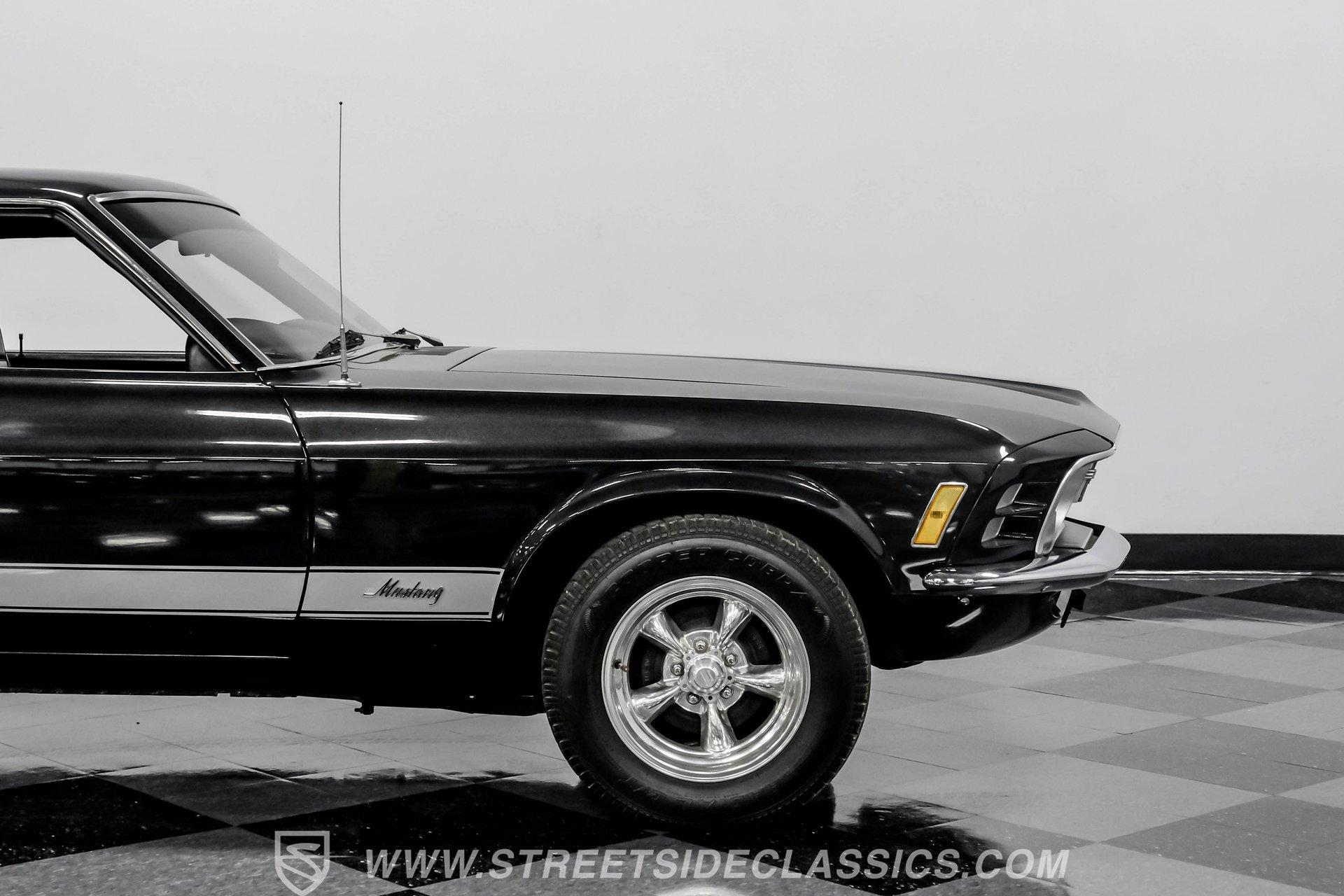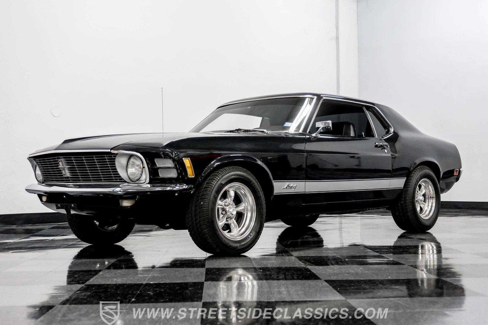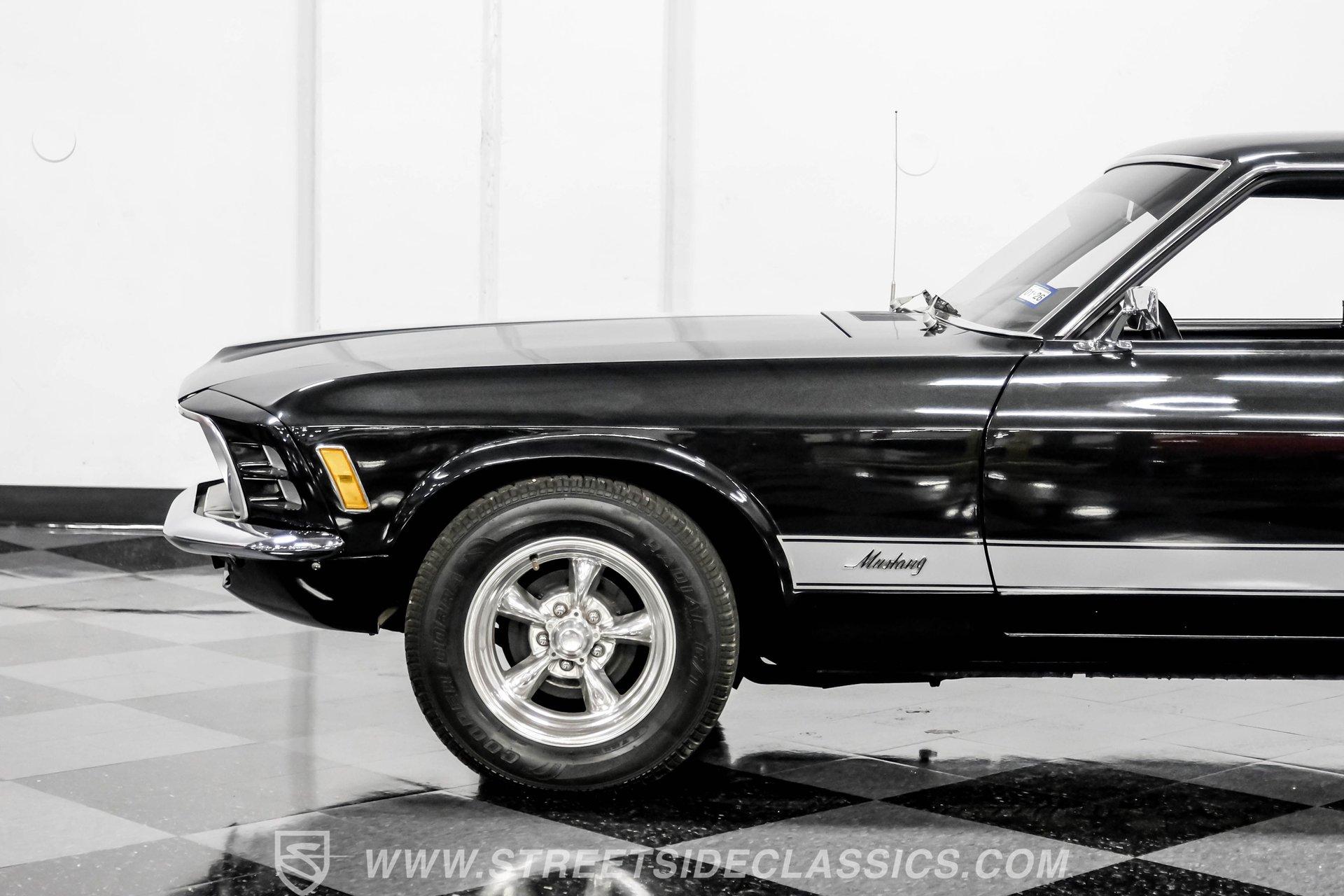 Some cars are more than transportation-they're icons. The 1970 Ford Mustang captures the spirit of classic American muscle, turning heads with its timeless style and delivering an unforgettable driving experience. If you're looking for a piece of automotive history that combines character, sound, and pure enjoyment, this Mustang is it. Finished in Black Metallic with silver painted stripes and accented by bright chrome bumpers, this Mustang is a true standout. Step inside and you will find a classic black interior that blends vintage charm with modern touches. The factory style black vinyl bucket seats offer comfort and style, while the floor shifter and aftermarket center console add a sporty edge. The Grant steering wheel invites you to take control, and the Planet Audio AM/FM/CD/BT radio ensures your favorite tunes are always at your fingertips. Black carpets and a fresh dash pad complete the inviting cockpit, making every drive a pleasure. Under the hood, this Mustang packs a punch with a 302 V8 engine topped by a Holley four-barrel carburetor and an Edelbrock intake. The engine bay is organized and features plenty of chrome accents for a show-ready look. Paired with a smooth-shifting three speed automatic transmission, aluminum radiator, and Hooker headers, this setup offers both reliability and performance. The power flows through to factory-style axles and American Racing wheels, delivering a classic muscle car feel that is sure to satisfy enthusiasts and casual drivers alike. HIGHLIGHTS 302 V8 Engine with Holley 4-Barrel Carburetor Edelbrock Intake and Aluminum Radiator Three Speed Automatic Transmission Full Black Metallic Paint with Silver Stripes Chrome Bumpers And Brightwork American Racing 15" Wheels Power Drum Brakes Front And Rear Factory Style Black Vinyl Bucket Seats Aftermarket Bluetooth Audio System Clean And Organized Engine Bay With Chrome Accents Financing Available Vehicle Protection Plans Available Worldwide Shipping This 1970 Ford Mustang is a standout blend of classic style, modern upgrades, and undeniable presence. Whether you are looking to relive the glory days or start new adventures, this Mustang offers a rare opportunity to own a true piece of American history. Call, email, or come visit our showroom today!