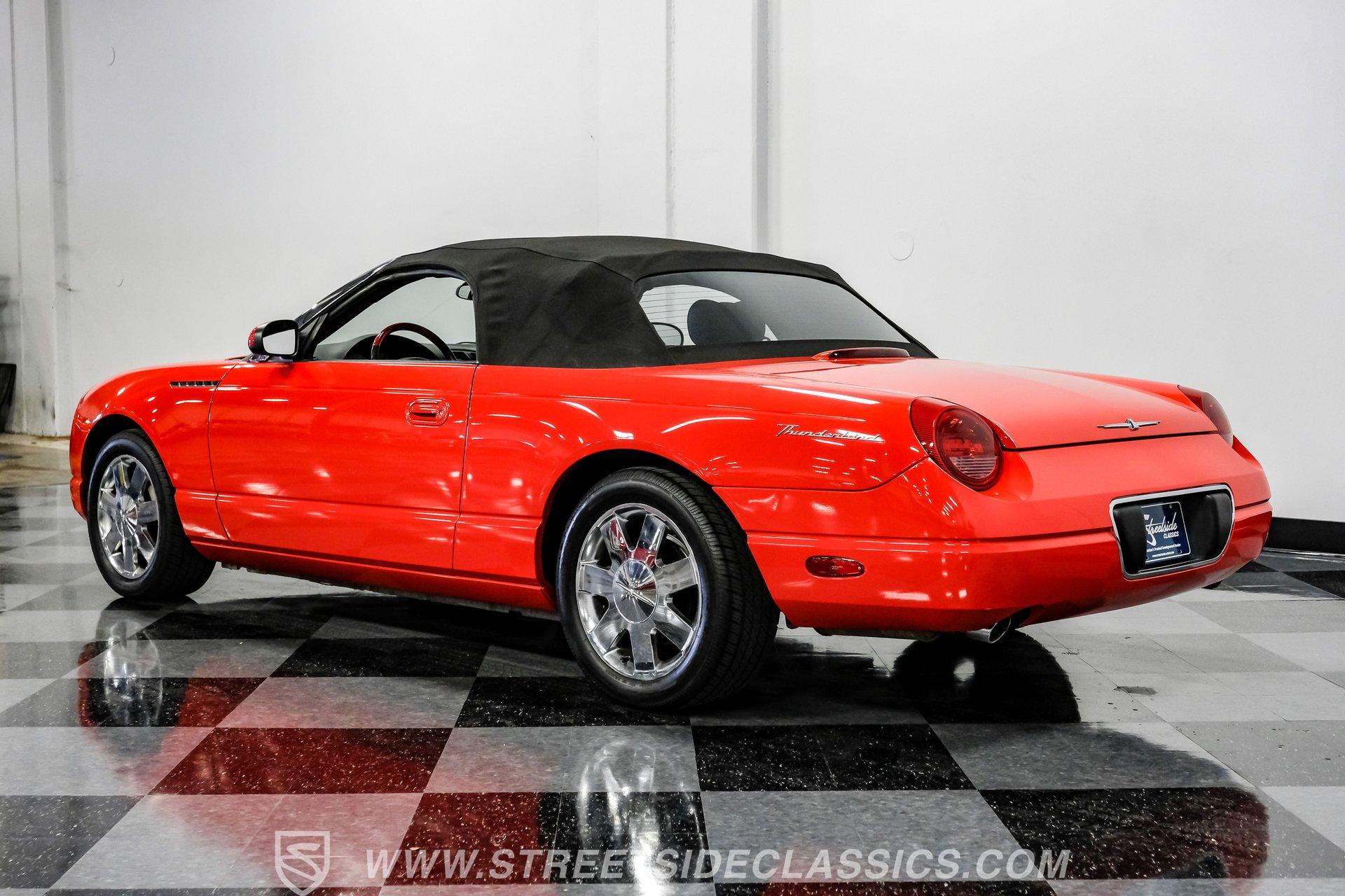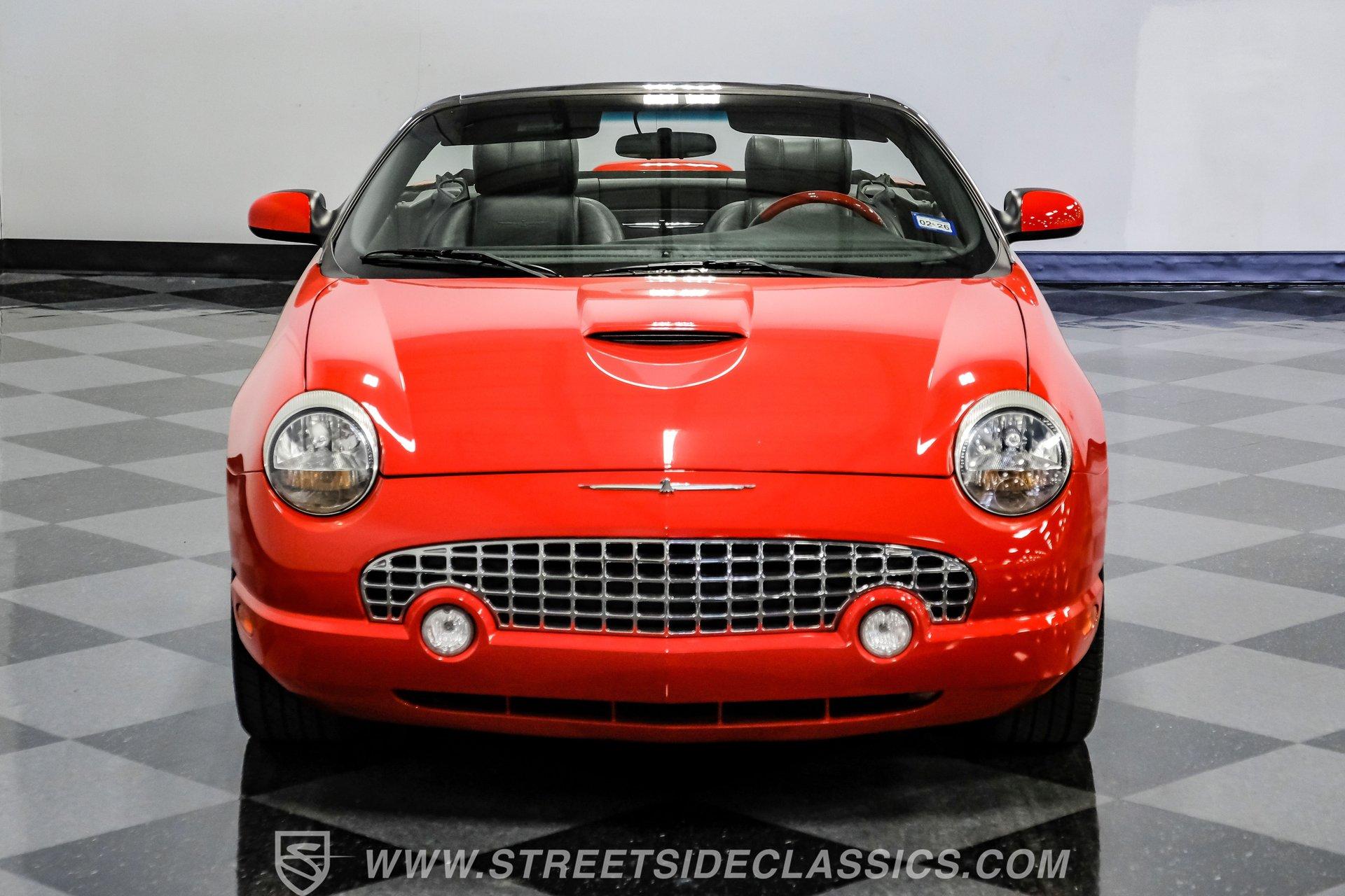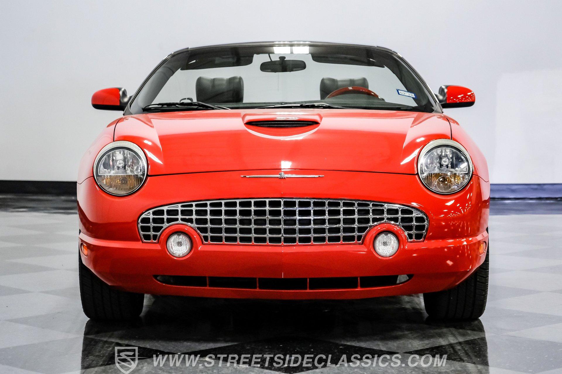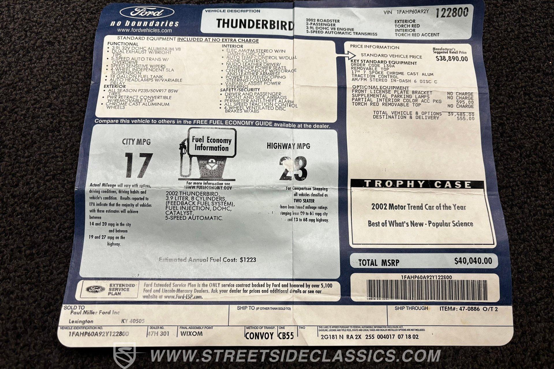 Cool style, luxurious features and proper V8 power are all what make this 2002 Ford Thunderbird awesome. The fact that this car has only been driven 46,496 miles from new is just the cherry on top of this beautiful T-Bird. The retro-cool look of this first model-year of the final generation Thunderbird has a timeless sense of style. Ford really took the time to integrate the best elements of the first-generation Thunderbird into this design. It can be seen in the long profile, hood scoop, subtle fender vents and afterburner-style tail lights. There are even great mirror-like brightwork elements, like the grille and the handsome chrome seven-spoke factory alloy wheels. This generation Thunderbird, finished in nostalgically in the highly desirable Torch Red with factory optional "full interior color accent package" two-tone Red and Black interior, features automatic A/C climate control allowing you to drive comfortably with the top down nearly all year round. This car was created to be a terrific cruiser loaded with power windows, power locks, keyless entry/alarm, dual front airbags, a premium AM/FM/6-CD changer stereo and cruise control. The leather seats feel comfy and have a well-respected style with the kind of use that goes with the low mileage. The power driver's seat gets you in the right position to really see nice details such as the steering wheel's classic turquoise streak in the Thunderbird logo that is coordinated with the needles on the gauges. While the looks of the car are meant to be retro-cool, the engine bay is a pure modern motor. It is a fuel-injected DOHC 3.9-liter V8 that fires up readily, idles smoothly and delivers plenty of power when you want it, making it the ideal smooth cruiser from day one. You will love using this Thunderbird to drive near or far with its smooth five-speed automatic transmission, power steering, four-wheel disc brakes and fully-independent suspension. HIGHLIGHTS: Only 46,946 miles from new Fuel-injected DOHC 3.9-liter V8 Automatic transmission Removable hardtop and folding soft top Hardtop Storge Cart Classic Torch Red Paint Desirable "Full Interior Color Accent Package" Red and Black Interior Air conditioning Heated/Power seats Power windows Disc brakes Window Sticker Factory AM/FM Stereo with Six CD Changer This may look like a vintage car, but this 2002 Ford Thunderbird with just 46,946 miles certainly has modern moves. Call today!