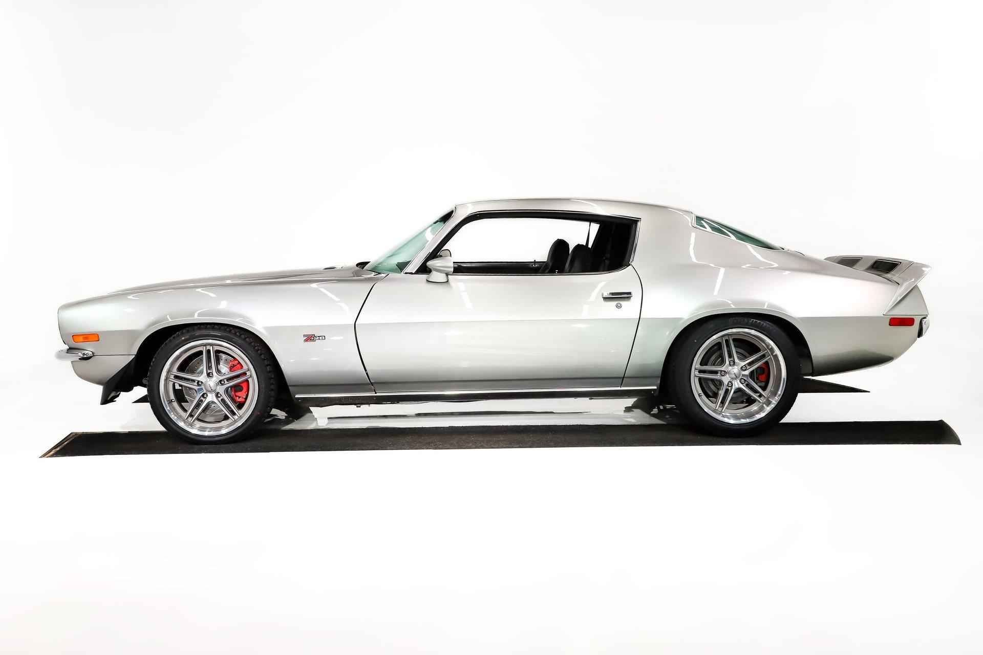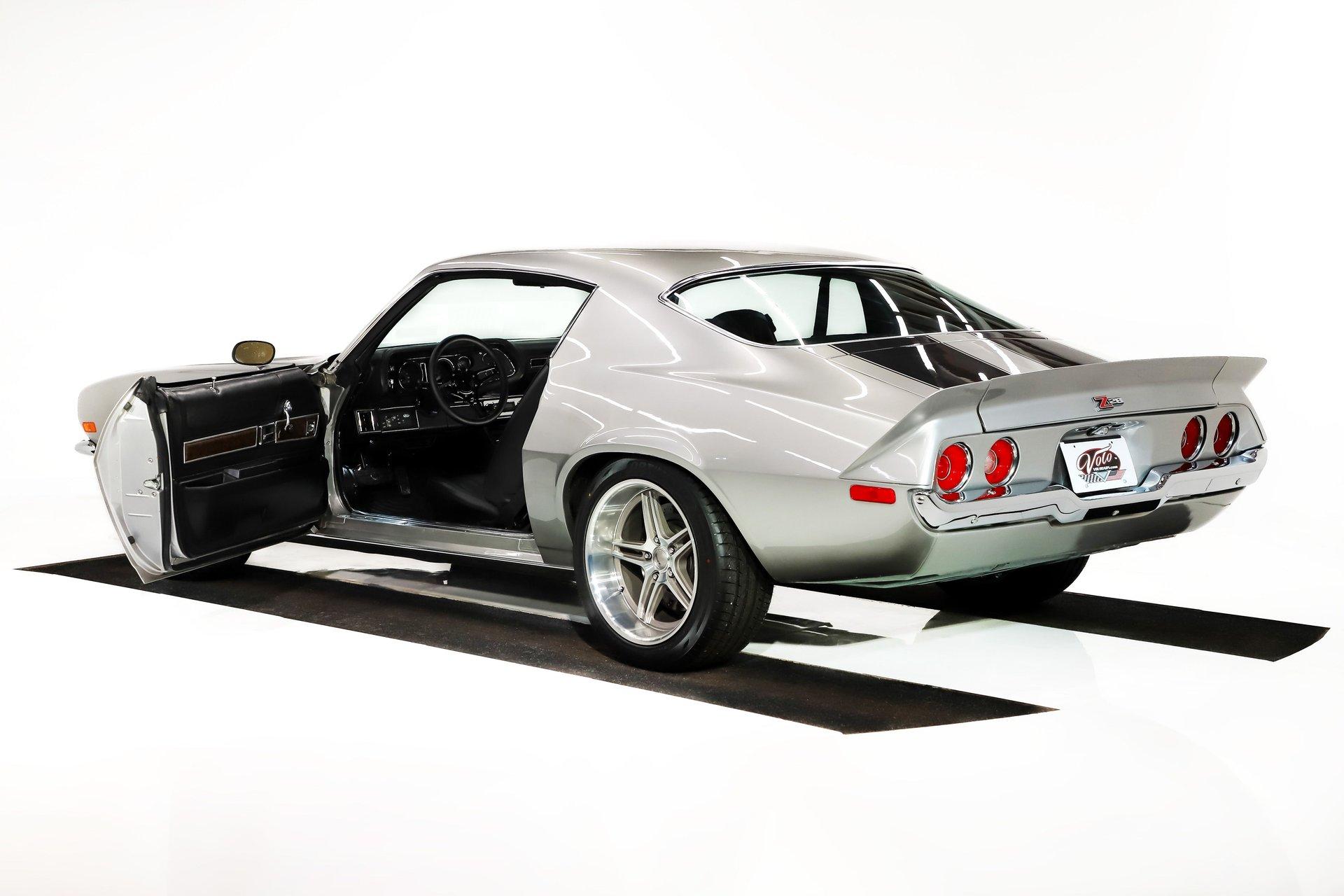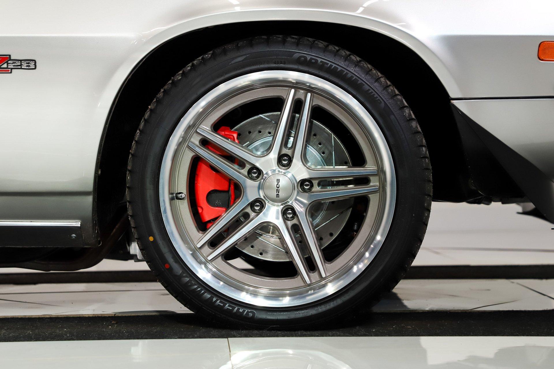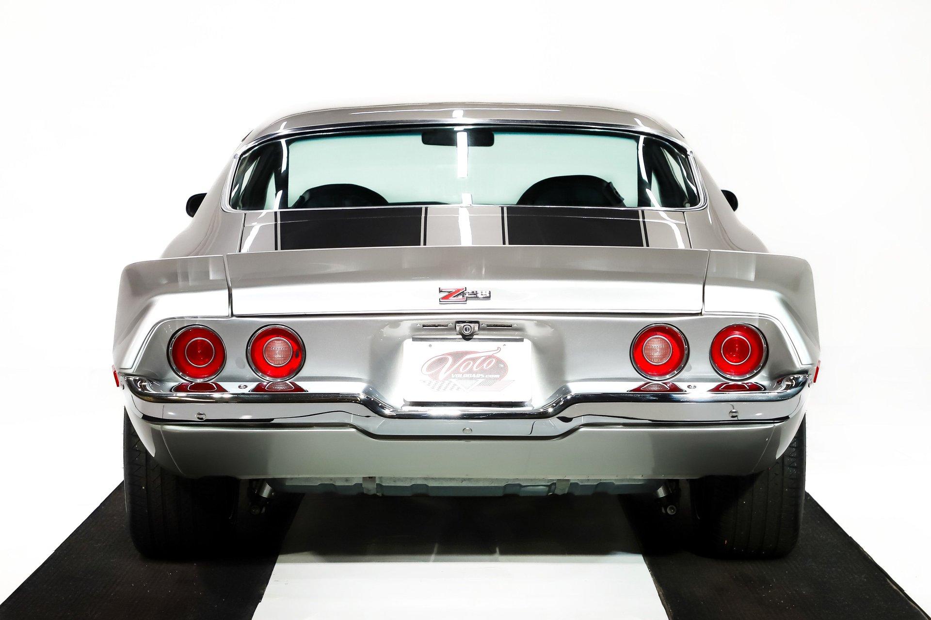INTRODUCTION: Only 300 miles on a pro touring build! This Camaro blends iconic styling with contemporary performance and drivability. EXTERIOR: Sleek looking second gen design and this one is clean. From the rockers to the roof it is smooth and fits right. Finished in a sleek pewter metallic with bold black Z-28 stripes, the clear is polished to a high gloss. Its muscle is indicated by the spoilers, sport mirrors and Z-28 emblems. It has split bumpers in front, the chrome, weatherstrips and glass were replaced. It sits perfectly on 18 inch Boze wheels wrapped in performance tires, wider in the back. INTERIOR: Restored from carpet to headliner! It's lit up bright with LED lights but even what you can't see was redone including new wiring harness and sound deadener. The seats are recushioned and upholstered, upfront was upgraded with 3 point retractable seatbelts. The center console has the vintage staple shifter along with an updated overdrive shift indicator. The door panels and dash area are in great shape. Upgraded with a great looking set of gauges, electric slide climate controls and a retro stereo powering kick panel speakers. The rear shelf, headliner and visors were replaced. ENGINE COMPARTMENT: This is where modern performance and technology is front and center! The 6.0 LS motor is making about 400hp with a hotter cam, Holley intake, Holley EFI and stainless long tube headers. I love the finned Holley coil covers looking like vintage valve covers! The front of the motor has a serpentine belt system with a polished A/C compressor, modern power steering and modern alternator. It also features a hydro boost power brake system. It runs cool with an aluminum radiator and dual electric fans. It's looking good with a smooth firewall, custom fender supports and matching front filler panel. The CVF billet hinges not only look good, but also work nice and smooth. It's a fresh and proper looking compartment. TRUNK COMPARTMENT: Clean, solid metal with a nice spatter finish. It opens with the help of a gas strut. UNDERSIDE: It was frame off restored, every component rebuilt or replaced and mostly upgraded! Completely rebuilt front suspension and upgraded with CPP tubular control arms, coil over adjustable gas shocks and drop spindles. In back it has a 4 link system with tubular control arms and QA1 coilover adjustable gas shocks. The custom exhaust has stainless mufflers and an X-Pipe. Upgraded with drilled disc brakes at all four wheels. All new fuel system including the tank and it is compatible with the fuel injection system. Looking up at the motor it has an aluminum Holley oil pan and a high torque starter. The trans is a 4L60E overdrive. An aluminum driveshaft connects to the rear end which has a finned aluminum cover. Everything looks very tidy and clean under this car. SERVICE: We take pride in our cars and reputation. Therefore, we built a 2 million dollar, 10,000 square ft service center, and hired a team of technicians to service the essentials on every car we sell. CONCLUSION: Why spend more money building one? This car is fresh with only 300 miles and it is ready to start putting big smiles on your face right away! Vehicles are displayed in a museum setting. Admission applies without an appointment and is refunded with purchase, including a one-year museum membership. 815 385 3644 9-5 central Sales@volocars.com Answered ASAP Air conditioning Fuel injection Power steering Power brakes 4 wheel disc Console Tilt wheel Custom gauges Retro stereo Spoilers Sport mirrors Stripes Boze wheels