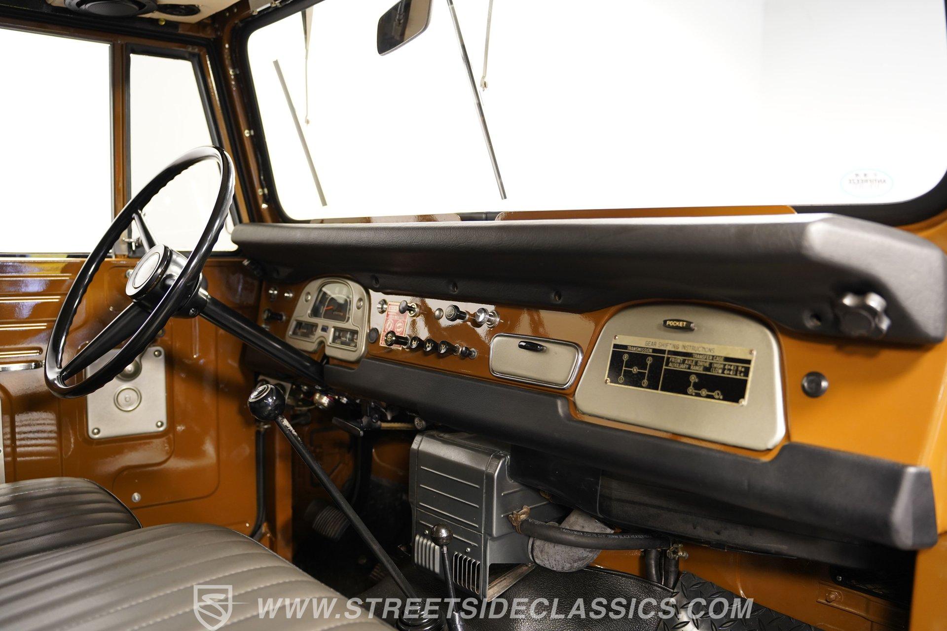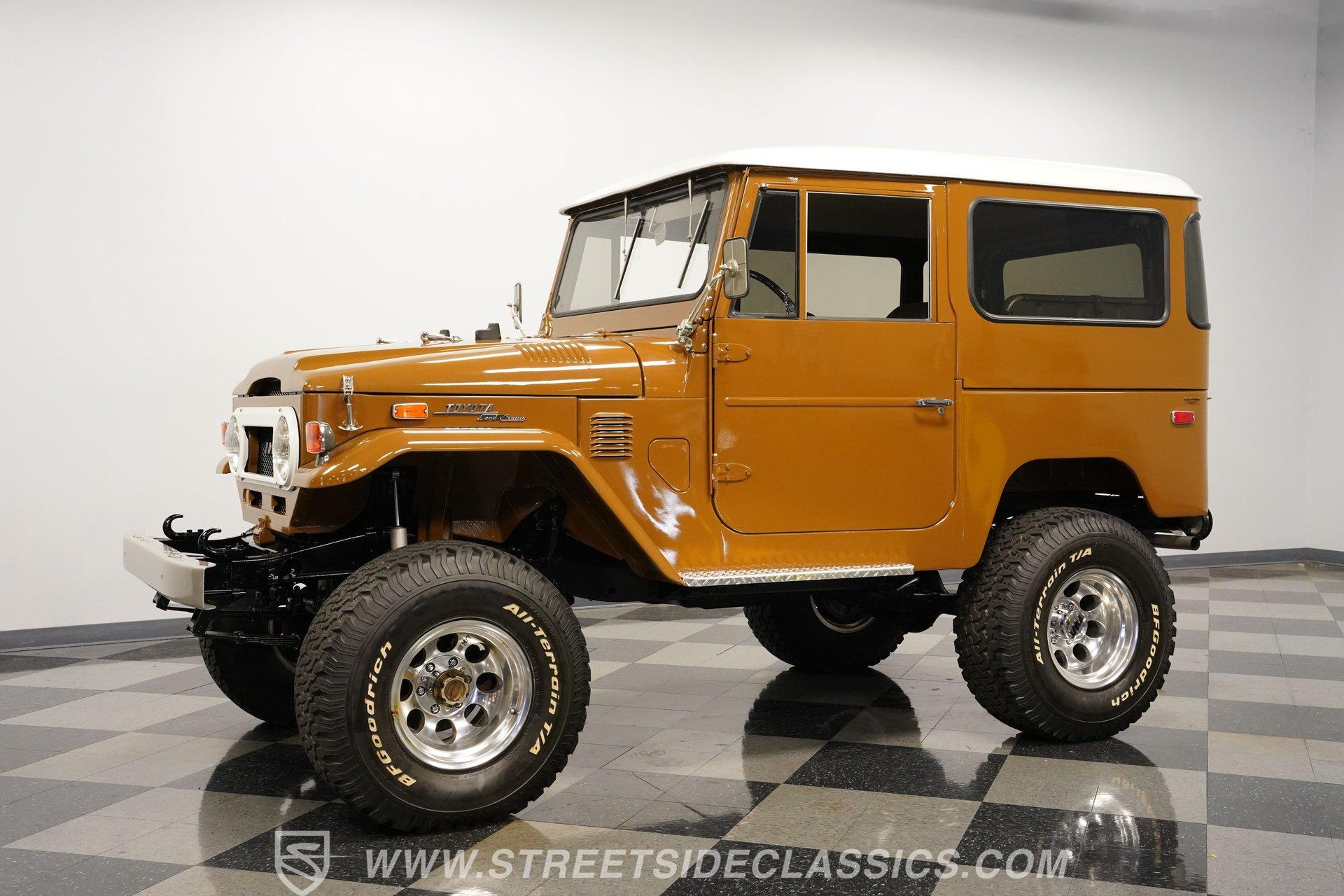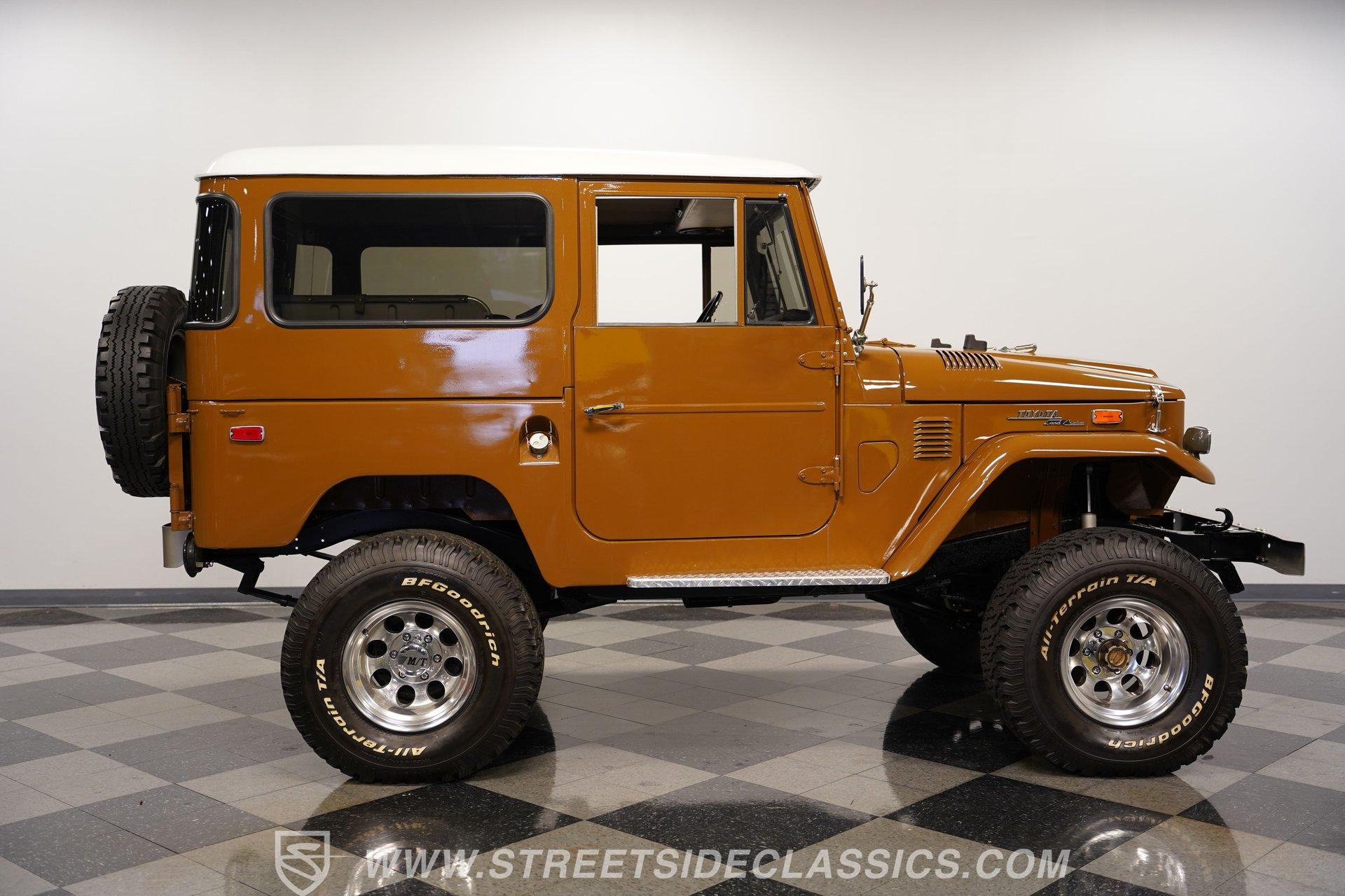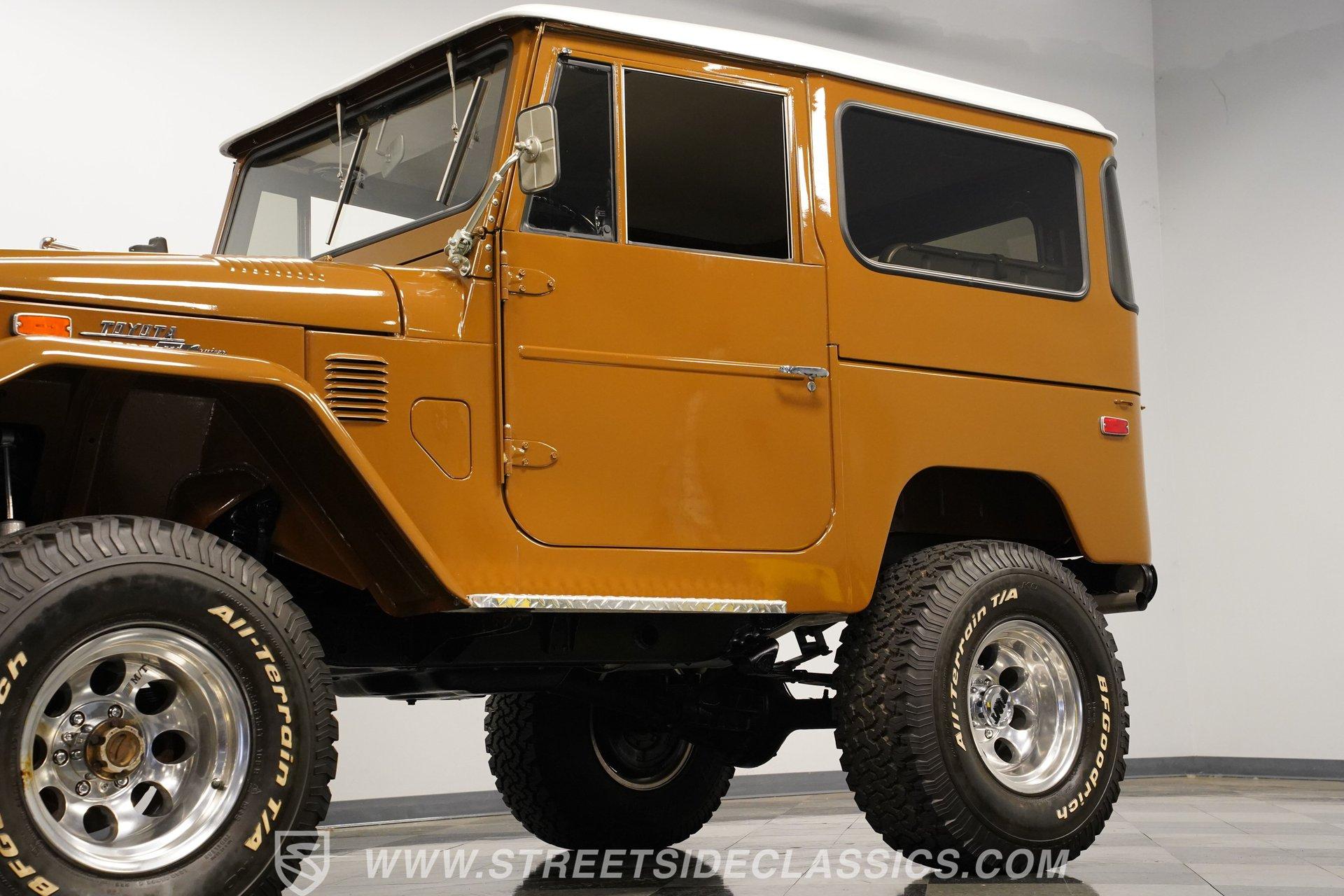 When it comes to rugged off-road machines, few trucks can compare to this 1971 Toyota Land Cruiser FJ40. Fully repainted in an eye-catching brown complemented by a removable hard top, this boxy beast sports one of the better restorations we've seen on a classic SUV. Along with a pair of rear steel bumperettes, front steel bumper, tow hooks, and big 33-inch BFGoodrich All Terrain tires, this truck proves it is ready to tackle any terrain you want to throw at it. Inside, this no-frills interior has everything you need and nothing you don't. A three-spoke steering wheel sits in front of a five-pod gauge panel featuring a 100-mph speedometer, while a plethora of push-pull HVAC knobs control temperature and auxiliary functions. Black vinyl seats up front work in conjunction with a set of passenger jump seats in the back, allowing the whole crew to come along for the ride. Or, fold down the front seats, and fold up the back seats, and you have a canyon-sized cargo area, offering as much as space as you need, this side of a dedicated box truck. An upgraded AM/FM/Aux head unit offers Bluetooth connectivity and far more entertainment options than anything available in the early 1970s. Prop open the steel hood, and you'll find a clean engine bay featuring a 4.2-liter inline-six-cylinder engine topped with a single two-barrel carburetor. This engine was likely rated at 135 horsepower and 210 pound-feet of torque for the U.S. market. That power is routed through a tried-and-true three-speed manual transmission before being sent out to either the rear wheels or to all four corners with the transfer case engaged. HIGHLIGHTS: Removable Hard Top Four Wheel Drive 4.2 Liter 2F Inline 6 Single 2 Barrel Carb 3 Speed Manual Lifted Suspension Mickey Thompson Wheels 33 Inch BFG Tires Power Front Disc Brakes Black Vinyl Interior Rear Jump Seats Tow Hooks AM/FM/AUX Head Unit Bluetooth This rugged 1971 Toyota Land Cruiser FJ40 rides on a lifted, old-school leaf-spring front and rear suspension, with axle carriers at both ends to facilitate its nearly unstoppable four-wheel drive. Power-assisted front disc and rear drum brakes hide behind those big 15-inch Mickey Thompson wheels. If you've always wanted a true no-frills, well-restored, off-roading head-turner, then your search is over. This is the truck you've been looking for. Call today!