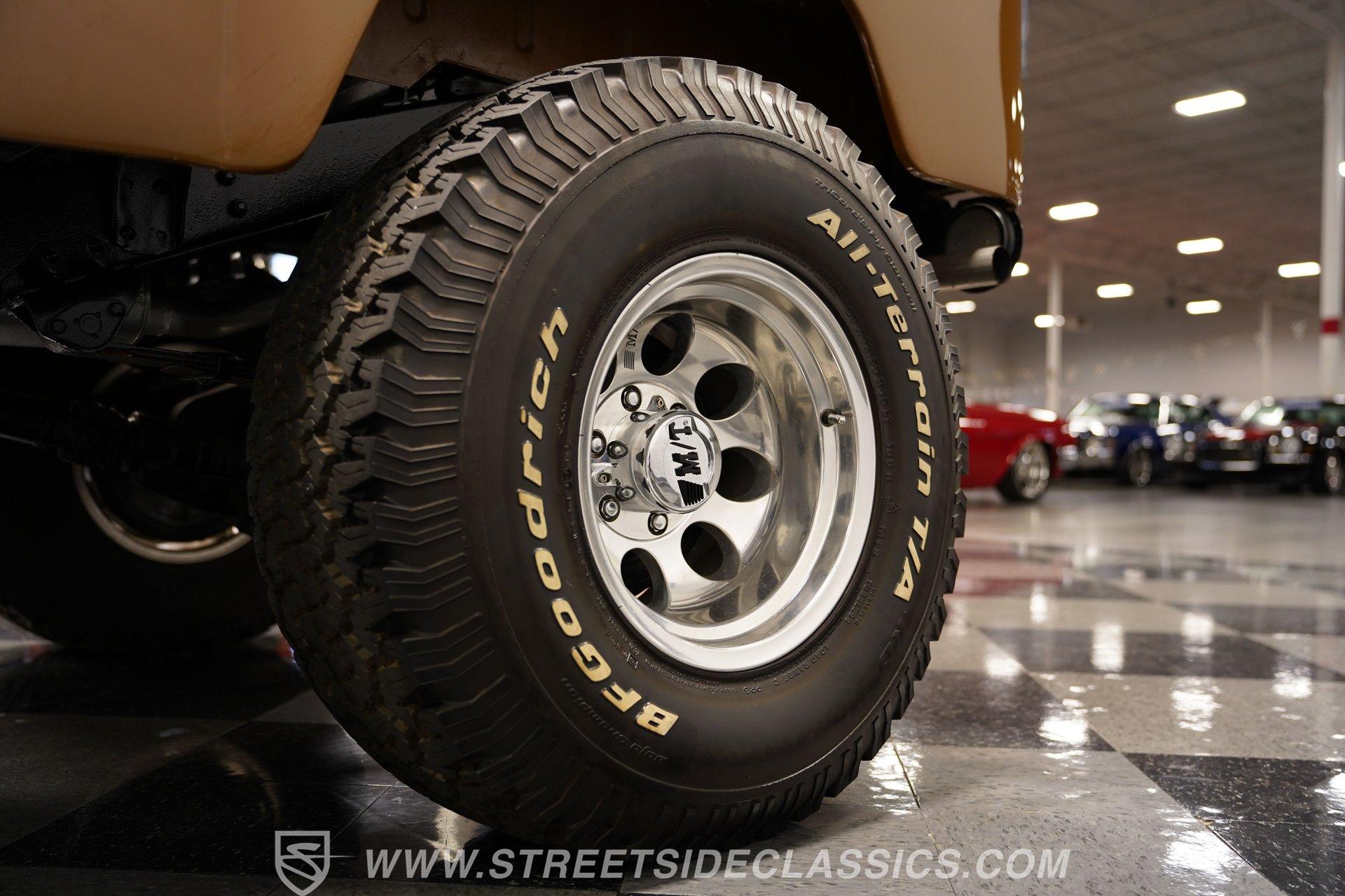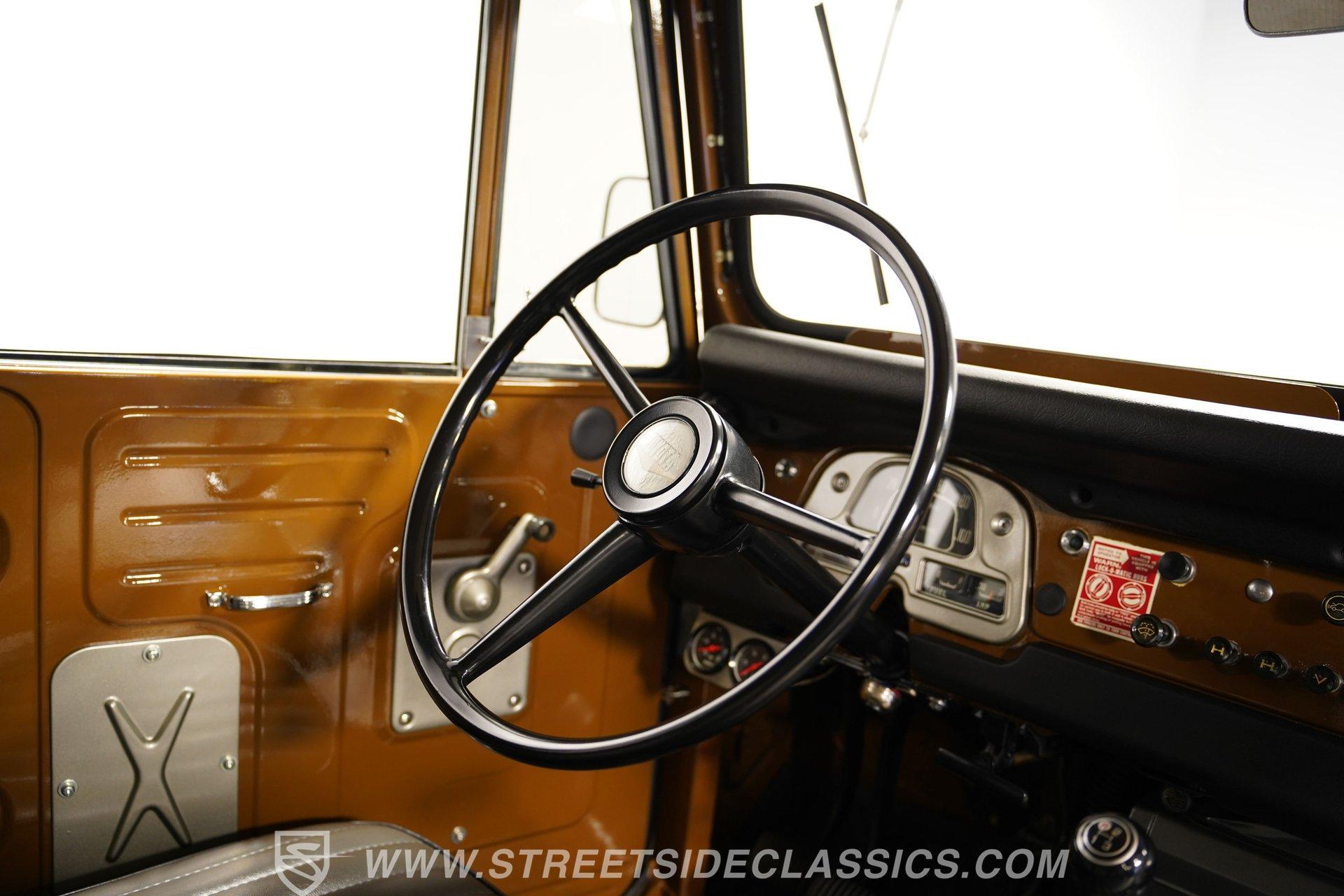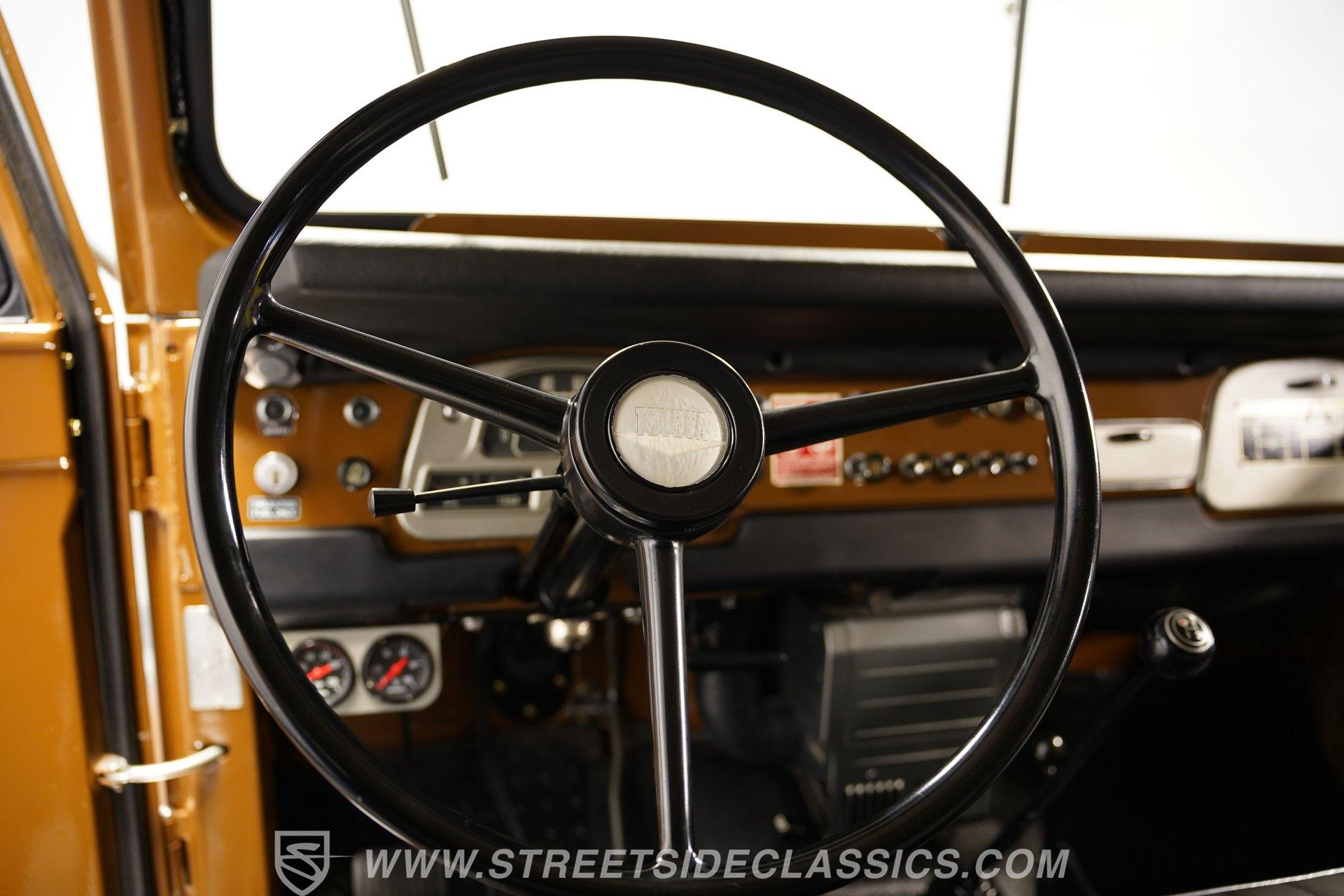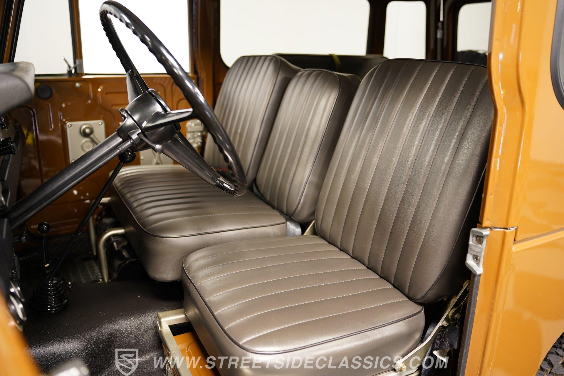 When it comes to rugged off-road machines, few trucks can compare to this 1971 Toyota Land Cruiser FJ40. Fully repainted in an eye-catching brown complemented by a removable hard top, this boxy beast sports one of the better restorations we've seen on a classic SUV. Along with a pair of rear steel bumperettes, front steel bumper, tow hooks, and big 33-inch BFGoodrich All Terrain tires, this truck proves it is ready to tackle any terrain you want to throw at it. Inside, this no-frills interior has everything you need and nothing you don't. A three-spoke steering wheel sits in front of a five-pod gauge panel featuring a 100-mph speedometer, while a plethora of push-pull HVAC knobs control temperature and auxiliary functions. Black vinyl seats up front work in conjunction with a set of passenger jump seats in the back, allowing the whole crew to come along for the ride. Or, fold down the front seats, and fold up the back seats, and you have a canyon-sized cargo area, offering as much as space as you need, this side of a dedicated box truck. An upgraded AM/FM/Aux head unit offers Bluetooth connectivity and far more entertainment options than anything available in the early 1970s. Prop open the steel hood, and you'll find a clean engine bay featuring a 4.2-liter inline-six-cylinder engine topped with a single two-barrel carburetor. This engine was likely rated at 135 horsepower and 210 pound-feet of torque for the U.S. market. That power is routed through a tried-and-true three-speed manual transmission before being sent out to either the rear wheels or to all four corners with the transfer case engaged. HIGHLIGHTS: Removable Hard Top Four Wheel Drive 4.2 Liter 2F Inline 6 Single 2 Barrel Carb 3 Speed Manual Lifted Suspension Mickey Thompson Wheels 33 Inch BFG Tires Power Front Disc Brakes Black Vinyl Interior Rear Jump Seats Tow Hooks AM/FM/AUX Head Unit Bluetooth This rugged 1971 Toyota Land Cruiser FJ40 rides on a lifted, old-school leaf-spring front and rear suspension, with axle carriers at both ends to facilitate its nearly unstoppable four-wheel drive. Power-assisted front disc and rear drum brakes hide behind those big 15-inch Mickey Thompson wheels. If you've always wanted a true no-frills, well-restored, off-roading head-turner, then your search is over. This is the truck you've been looking for. Call today!