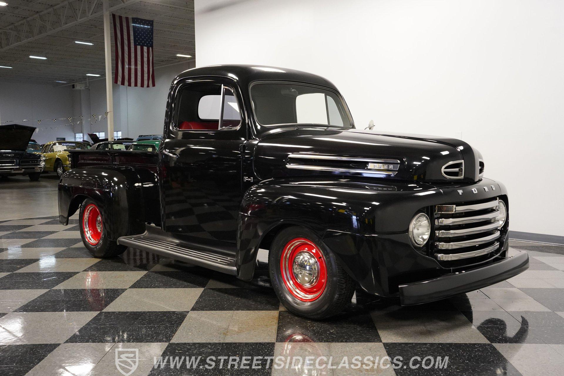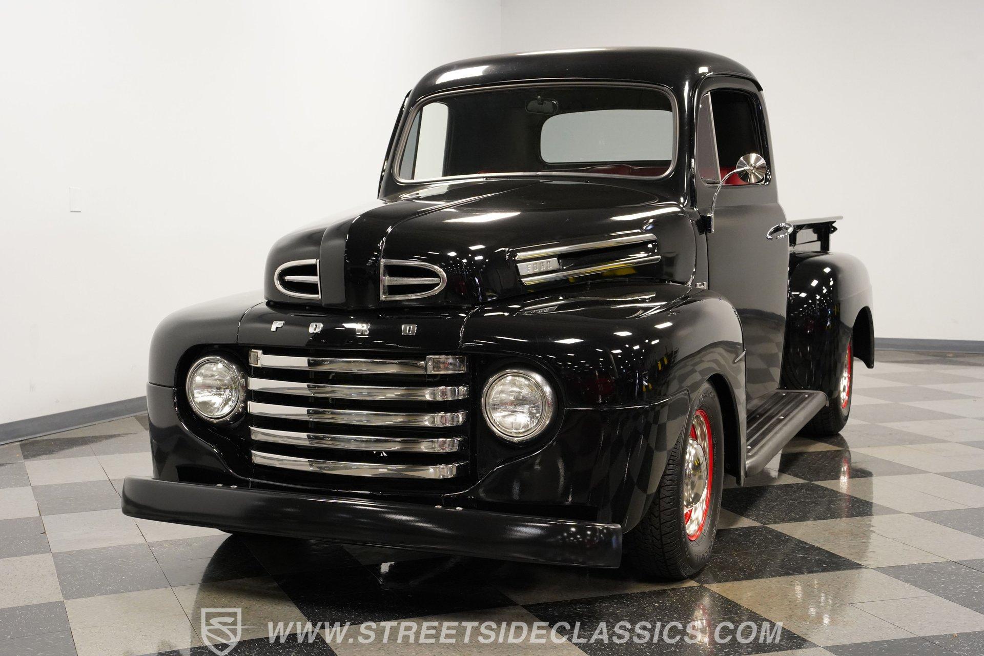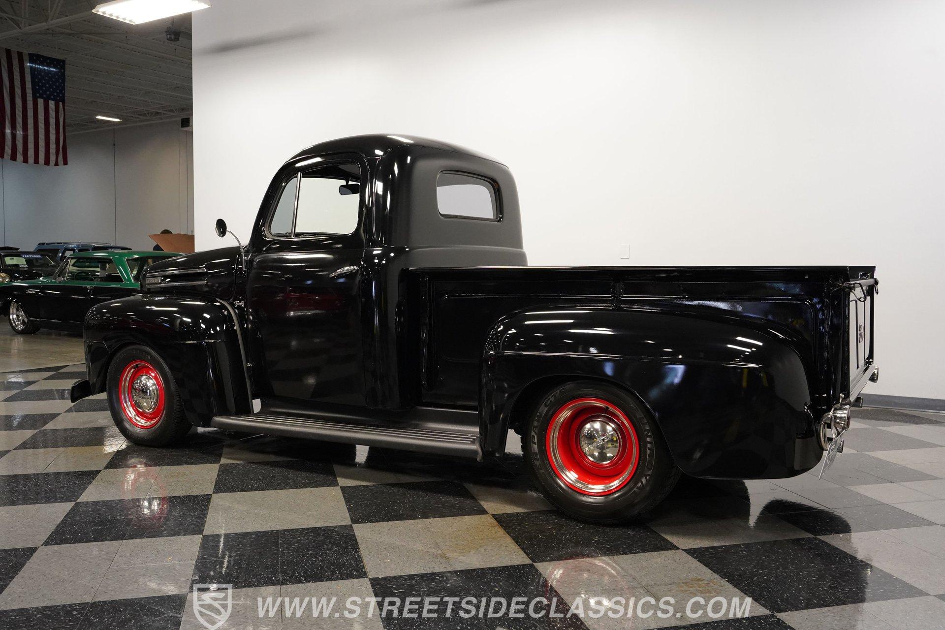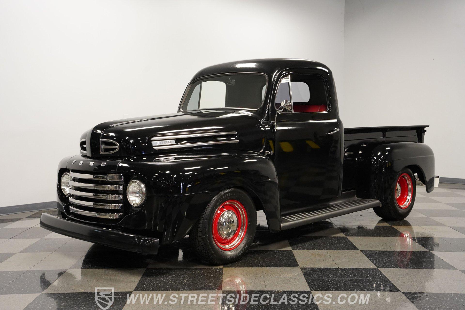 Dressed in attention-commanding black paint and wearing an assembly of bright work that's in consistently good shape, this 1950 Ford F-1 is an outstanding representative of the class of working trucks that rolled off the assembly line to recapture the enthusiasm of the public as WWII drew to a close. It's a sharp-looking pickup, with a subtly lowered stance and painted steel wheels that complement its shortbed configuration nicely. Even better, this classic has been upgraded with some key mechanical components that put its drivability on a par with its timeless good looks, so you'll enjoy taking this venerable truck on the road every bit as much as you will gazing at it as it holds court in your garage. You wouldn't necessarily expect comfort to be a defining feature in a truck that began its service more than 75 years ago, but a combination of planning and top-tier aftermarket components has yielded that very result for this F-1. The interior on this classic is in fine shape, featuring a comfortable bench seat that's draped in red vinyl. As you climb into the cockpit and glance forward, you'll find a collection of Dolphin gauges that look particularly sharp with their chrome bezels, surrounded by painted steel surfaces that still have their fresh, glossy appearance. In the back, the bed area has been refurbished with a combination of solid wood with aluminum trim, and its sides are covered with bedliner to protect them from shifting cargo. Unlike many of its counterparts, this vintage pickup is no "project car". It's ready to hit the asphalt just as soon as you bring it home, powered by a 302-cubic-inch V8 that's fed by a 4-barrel Edelbrock carburetor and running in good form. The engine sits in a well-organized compartment and is joined by a 3-speed automatic C4 with a strong reputation for durability. The surrounding hoses and wires are well-routed, and an aluminum radiator sits front and center to help keep operating temperatures under control. The added Mustang II front end brings a number of welcome benefits, including precise rack-and-pinion steering, a lowered stance, and better ride quality. Take a look below, and you'll likely be impressed by the clean underside on this classic. The work on the dual exhaust really looks solid, and the bushings and steering components are in good shape. HIGHLIGHTS 302-CUBIC-INCH H.O. V8 4-BARREL EDELBROCK CARBURETOR 3-SPEED AUTOMATIC C4 TRANSMISSION DUAL EXHAUST, WITH FLOWMASTER MUFFLERS MUSTANG II FRONT END KYB REAR SHOCKS POWER BRAKES, WITH DISCS UP FRONT AGGRESSIVE, LOWERED STANCE RED VINYL UPHOLSTERY DOLPHIN GAUGES STEEL WHEELS FLOOR SHIFTER AM/FM STEREO WITH BLUETOOTH CONNECTIVITY Whether your plans call for getting behind the wheel of a well-restored weekend cruiser or taking your place among the entrants at a local car show, this great-looking, strong-running 1950 Ford F-1 has you covered. Call today!
