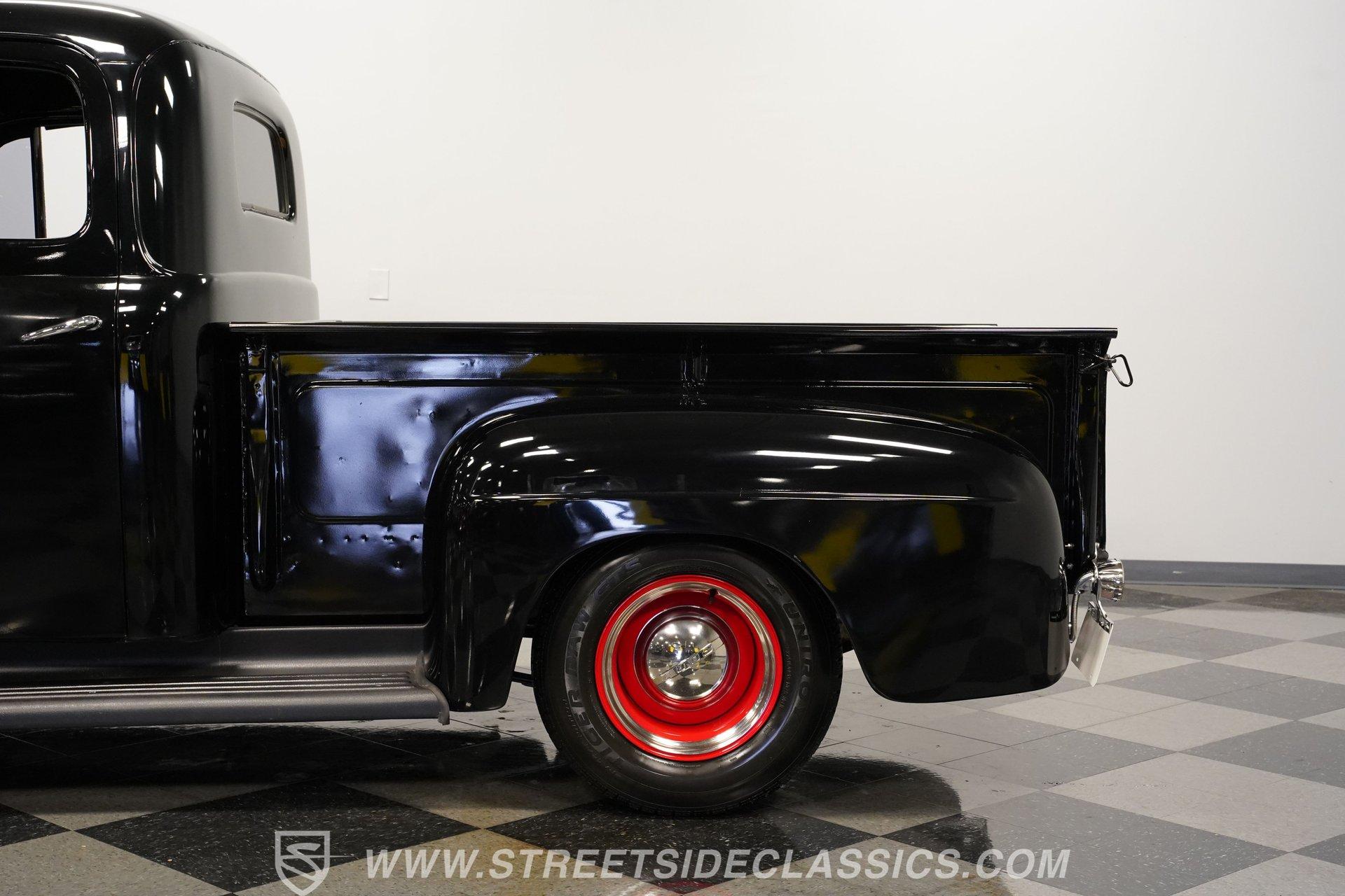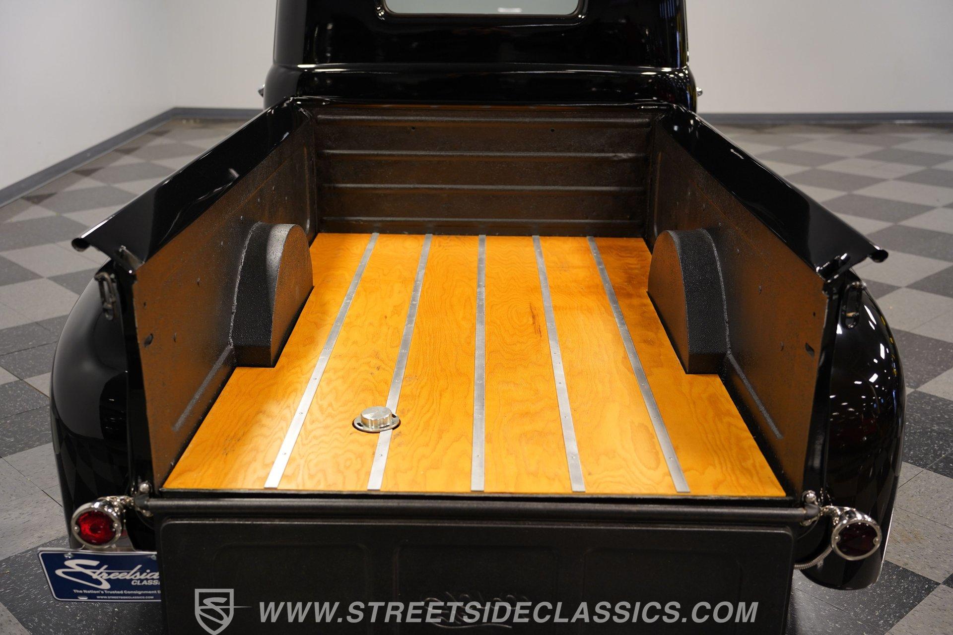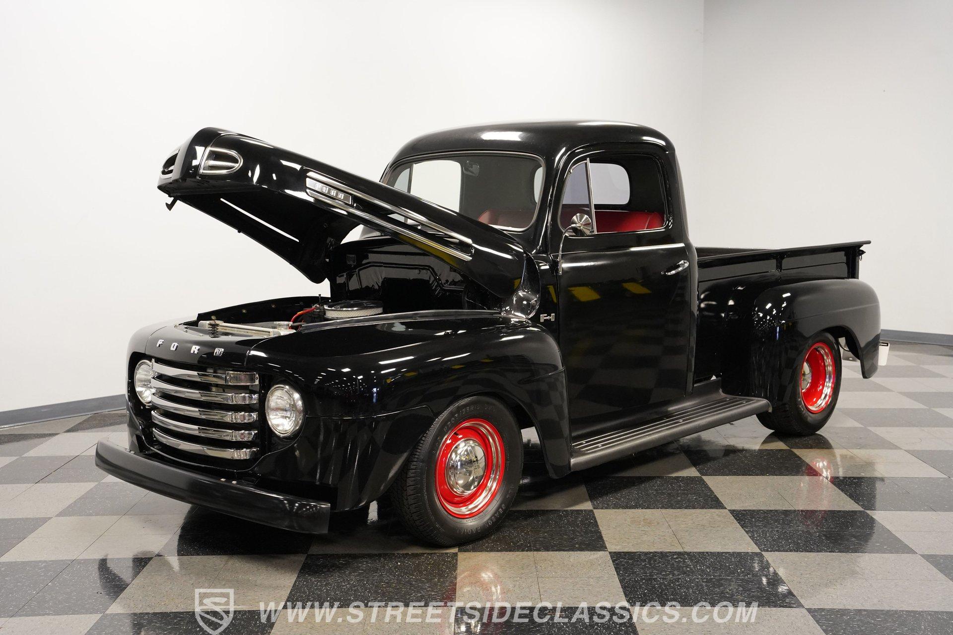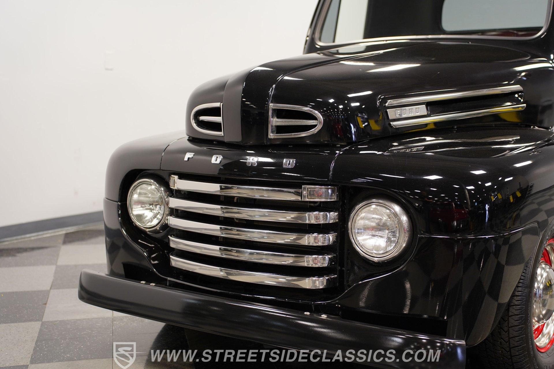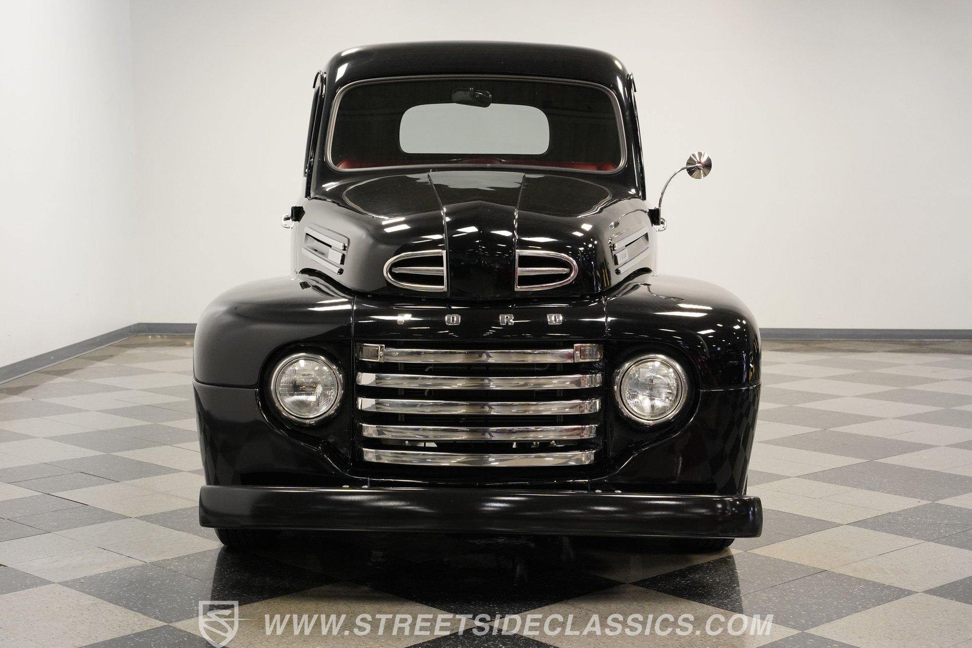 Dressed in attention-commanding black paint and wearing an assembly of bright work that's in consistently good shape, this 1950 Ford F-1 is an outstanding representative of the class of working trucks that rolled off the assembly line to recapture the enthusiasm of the public as WWII drew to a close. It's a sharp-looking pickup, with a subtly lowered stance and painted steel wheels that complement its shortbed configuration nicely. Even better, this classic has been upgraded with some key mechanical components that put its drivability on a par with its timeless good looks, so you'll enjoy taking this venerable truck on the road every bit as much as you will gazing at it as it holds court in your garage. You wouldn't necessarily expect comfort to be a defining feature in a truck that began its service more than 75 years ago, but a combination of planning and top-tier aftermarket components has yielded that very result for this F-1. The interior on this classic is in fine shape, featuring a comfortable bench seat that's draped in red vinyl. As you climb into the cockpit and glance forward, you'll find a collection of Dolphin gauges that look particularly sharp with their chrome bezels, surrounded by painted steel surfaces that still have their fresh, glossy appearance. In the back, the bed area has been refurbished with a combination of solid wood with aluminum trim, and its sides are covered with bedliner to protect them from shifting cargo. Unlike many of its counterparts, this vintage pickup is no "project car". It's ready to hit the asphalt just as soon as you bring it home, powered by a 302-cubic-inch V8 that's fed by a 4-barrel Edelbrock carburetor and running in good form. The engine sits in a well-organized compartment and is joined by a 3-speed automatic C4 with a strong reputation for durability. The surrounding hoses and wires are well-routed, and an aluminum radiator sits front and center to help keep operating temperatures under control. The added Mustang II front end brings a number of welcome benefits, including precise rack-and-pinion steering, a lowered stance, and better ride quality. Take a look below, and you'll likely be impressed by the clean underside on this classic. The work on the dual exhaust really looks solid, and the bushings and steering components are in good shape. HIGHLIGHTS 302-CUBIC-INCH H.O. V8 4-BARREL EDELBROCK CARBURETOR 3-SPEED AUTOMATIC C4 TRANSMISSION DUAL EXHAUST, WITH FLOWMASTER MUFFLERS MUSTANG II FRONT END KYB REAR SHOCKS POWER BRAKES, WITH DISCS UP FRONT AGGRESSIVE, LOWERED STANCE RED VINYL UPHOLSTERY DOLPHIN GAUGES STEEL WHEELS FLOOR SHIFTER AM/FM STEREO WITH BLUETOOTH CONNECTIVITY Whether your plans call for getting behind the wheel of a well-restored weekend cruiser or taking your place among the entrants at a local car show, this great-looking, strong-running 1950 Ford F-1 has you covered. Call today!