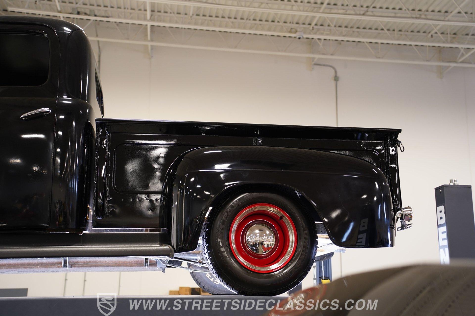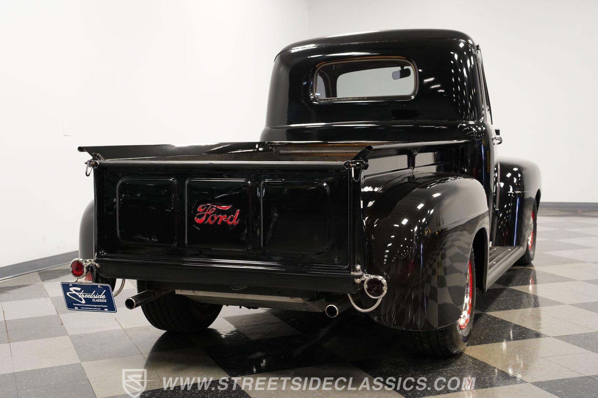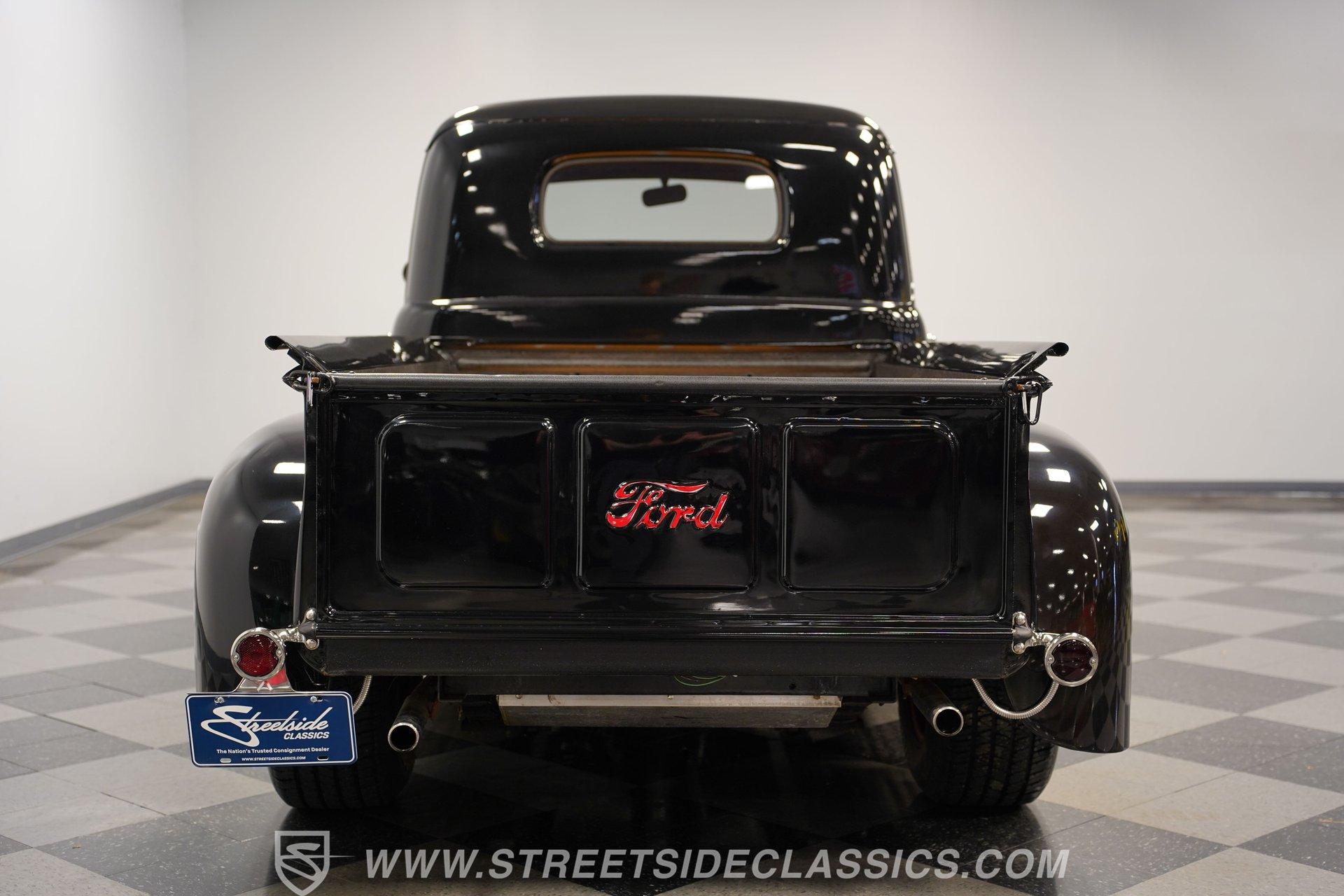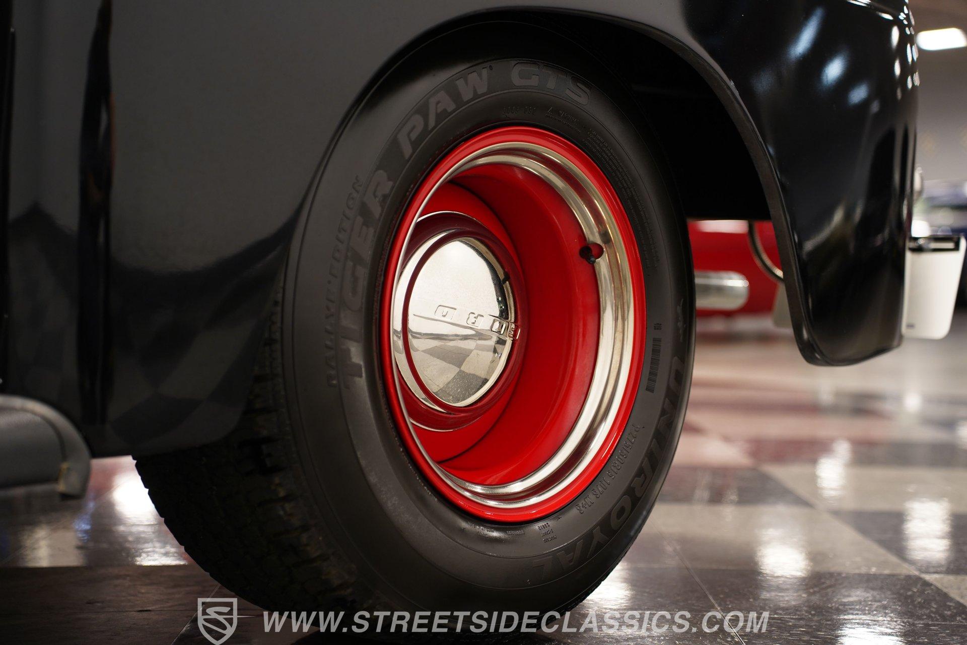 Dressed in attention-commanding black paint and wearing an assembly of bright work that's in consistently good shape, this 1950 Ford F-1 is an outstanding representative of the class of working trucks that rolled off the assembly line to recapture the enthusiasm of the public as WWII drew to a close. It's a sharp-looking pickup, with a subtly lowered stance and painted steel wheels that complement its shortbed configuration nicely. Even better, this classic has been upgraded with some key mechanical components that put its drivability on a par with its timeless good looks, so you'll enjoy taking this venerable truck on the road every bit as much as you will gazing at it as it holds court in your garage. You wouldn't necessarily expect comfort to be a defining feature in a truck that began its service more than 75 years ago, but a combination of planning and top-tier aftermarket components has yielded that very result for this F-1. The interior on this classic is in fine shape, featuring a comfortable bench seat that's draped in red vinyl. As you climb into the cockpit and glance forward, you'll find a collection of Dolphin gauges that look particularly sharp with their chrome bezels, surrounded by painted steel surfaces that still have their fresh, glossy appearance. In the back, the bed area has been refurbished with a combination of solid wood with aluminum trim, and its sides are covered with bedliner to protect them from shifting cargo. Unlike many of its counterparts, this vintage pickup is no "project car". It's ready to hit the asphalt just as soon as you bring it home, powered by a 302-cubic-inch V8 that's fed by a 4-barrel Edelbrock carburetor and running in good form. The engine sits in a well-organized compartment and is joined by a 3-speed automatic C4 with a strong reputation for durability. The surrounding hoses and wires are well-routed, and an aluminum radiator sits front and center to help keep operating temperatures under control. The added Mustang II front end brings a number of welcome benefits, including precise rack-and-pinion steering, a lowered stance, and better ride quality. Take a look below, and you'll likely be impressed by the clean underside on this classic. The work on the dual exhaust really looks solid, and the bushings and steering components are in good shape. HIGHLIGHTS 302-CUBIC-INCH H.O. V8 4-BARREL EDELBROCK CARBURETOR 3-SPEED AUTOMATIC C4 TRANSMISSION DUAL EXHAUST, WITH FLOWMASTER MUFFLERS MUSTANG II FRONT END KYB REAR SHOCKS POWER BRAKES, WITH DISCS UP FRONT AGGRESSIVE, LOWERED STANCE RED VINYL UPHOLSTERY DOLPHIN GAUGES STEEL WHEELS FLOOR SHIFTER AM/FM STEREO WITH BLUETOOTH CONNECTIVITY Whether your plans call for getting behind the wheel of a well-restored weekend cruiser or taking your place among the entrants at a local car show, this great-looking, strong-running 1950 Ford F-1 has you covered. Call today!