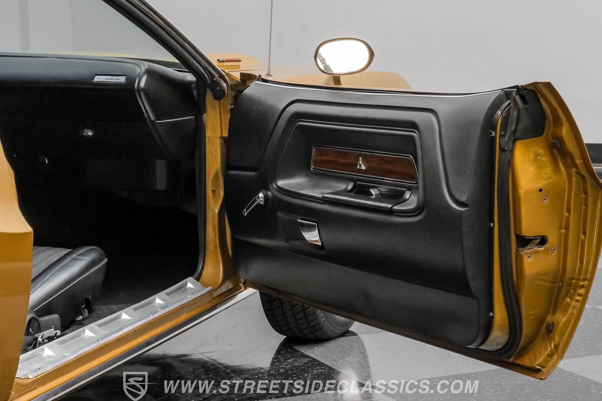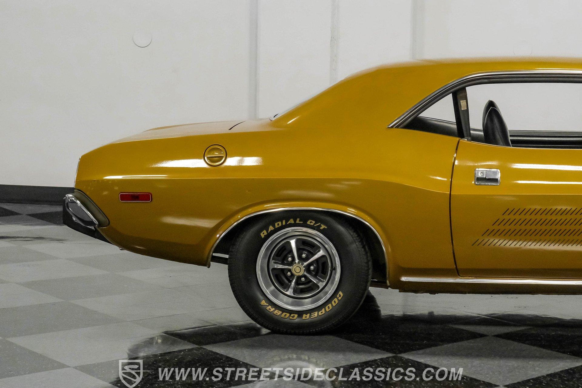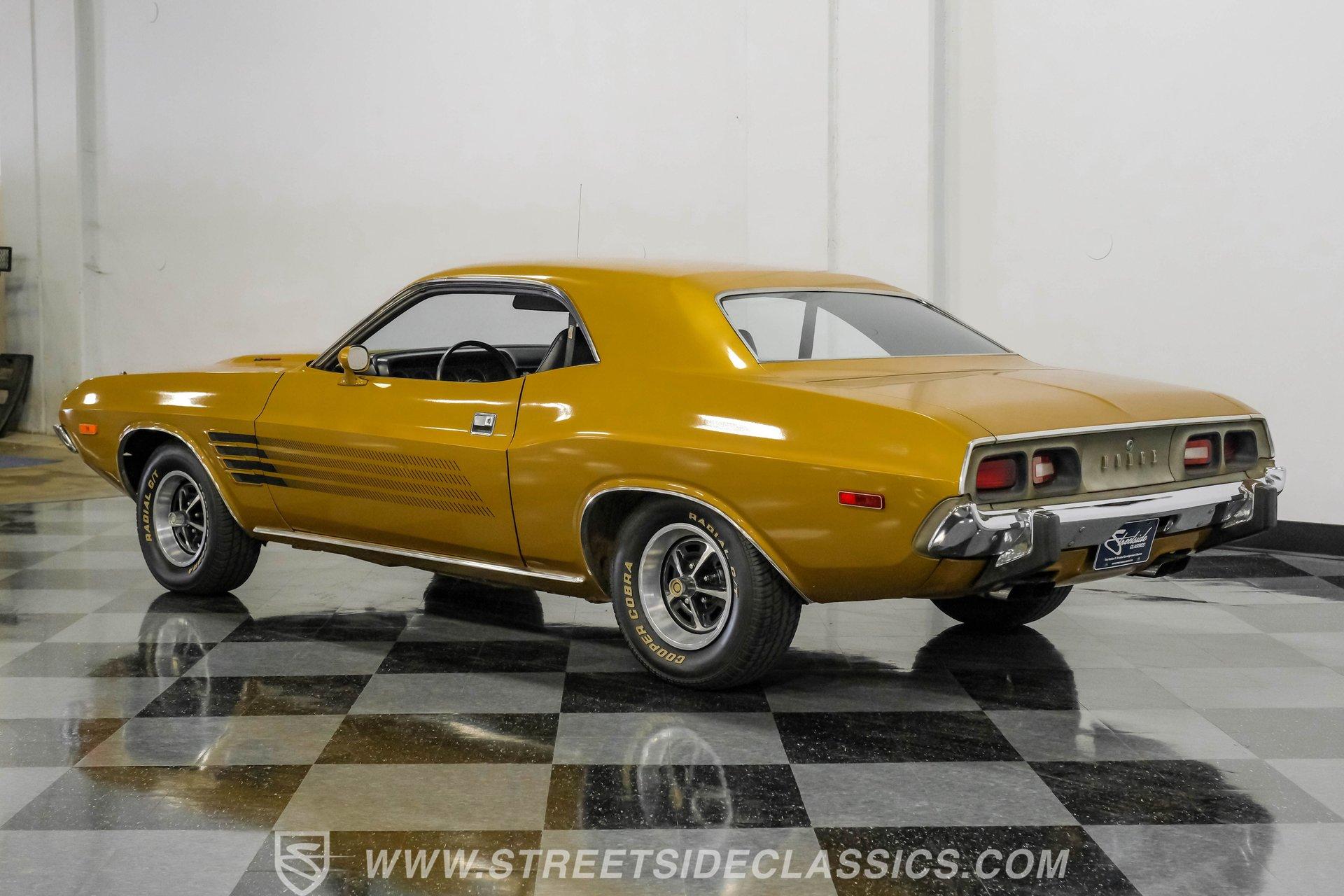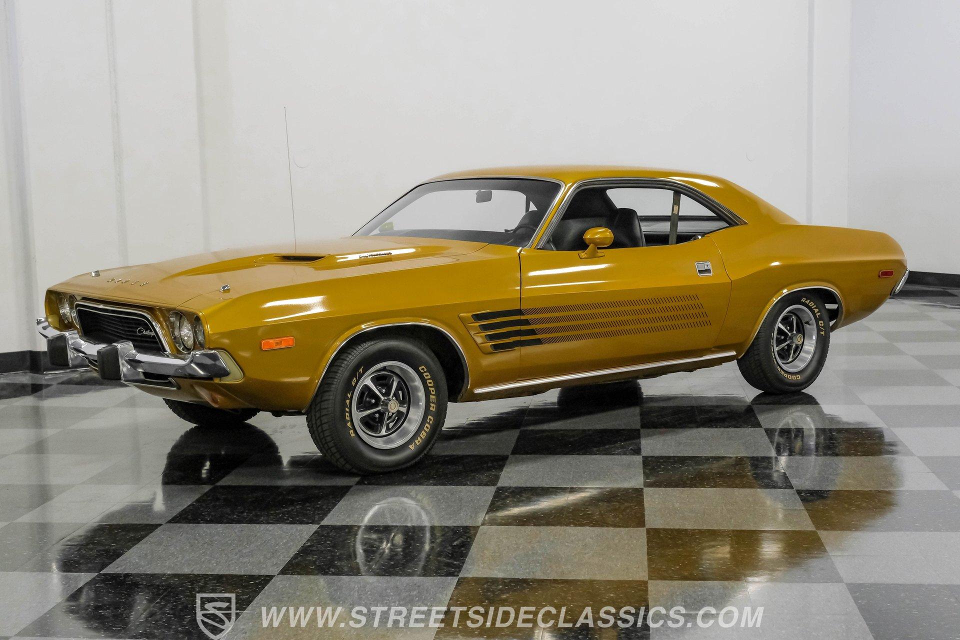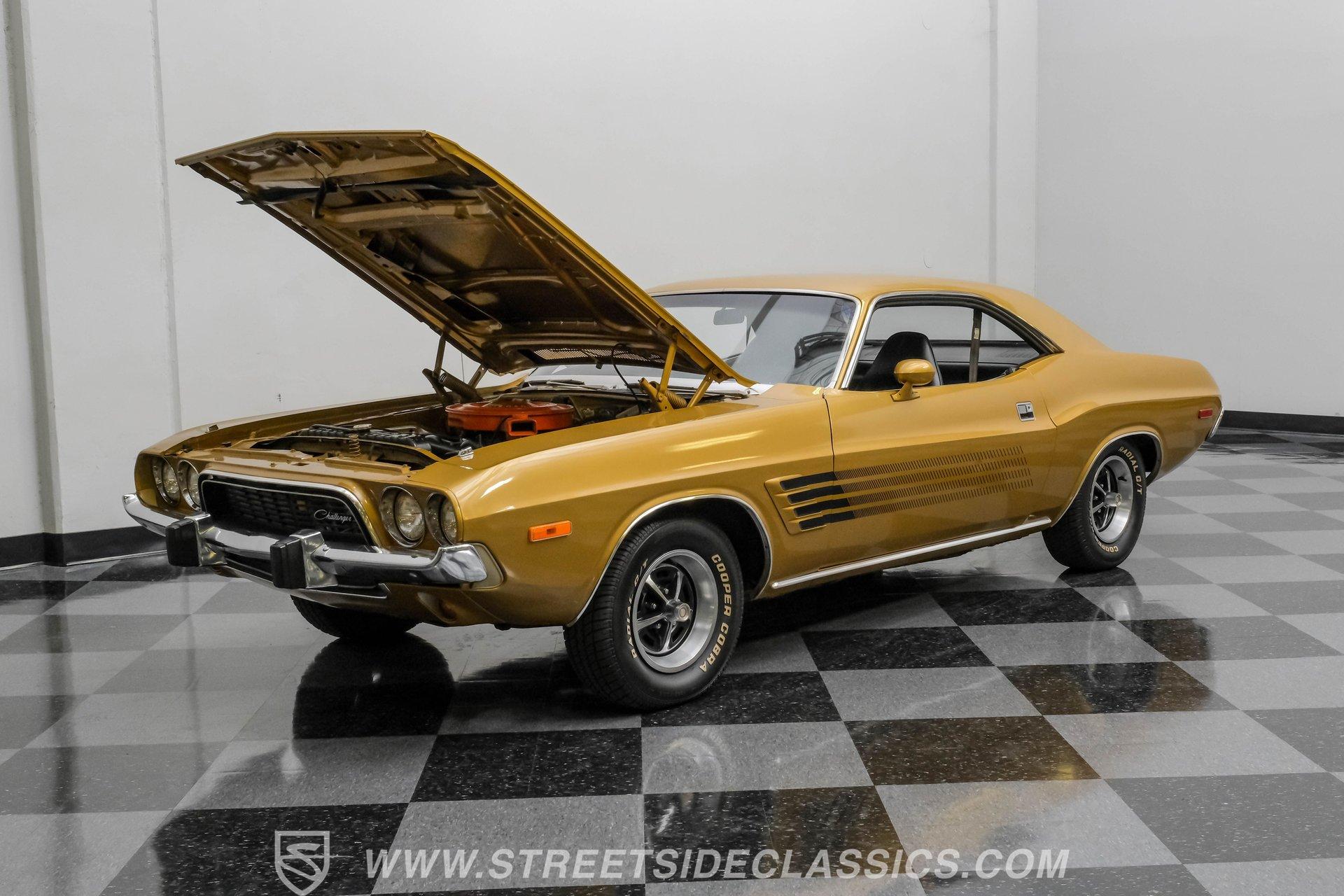 Some cars are more than transportation-they're memories, freedom, and a link to a golden era. This 1973 Dodge Challenger Rallye captures that spirit, transporting you back to the height of muscle car performance with its V8 sound and shimmering metallic finish. Repainted in factory correct Code JY6 Gold Metallic with black vinyl side graphics and chrome bumpers, it offers timeless style and standout presence. Step inside and discover a factory-correct black interior that exemplifies both comfort and style. Black bucket seats provide a supportive and commanding driving position, complemented by a classic floor shifter and a factory dash and gauges. The headliner and carpets continue the black theme, and the correct door panels, factory radio, and seatbelts ensure the cabin feels both authentic and inviting. Under the hood, you'll find a legendary 340 V8 engine topped with a four-barrel carburetor, delivering the kind of power and sound that defined an era. The engine bay maintains a clean, stock appearance, while the three-speed manual transmission puts you in total control of the driving experience. A robust 8 3/4 rear axle and factory-style suspension work together to provide solid handling, and power front disc brakes ensure confident stopping power. HIGHLIGHTS 340 V8 Engine with Four-Barrel Carburetor Three Speed Manual Transmission Factory Correct Code JY6 Gold Metallic Paint Black Vinyl Side Graphics Power Front Disc Brakes Power Steering Factory Style 14" Wheels With 225/70R14 Tires Factory Black Bucket Seat Interior Original Factory Radio Documentation Binder With Owner's Manual, Invoice, Window Sticker Financing Available Vehicle Protection Plans Available Worldwide Shipping This 1973 Dodge Challenger Rallye is a standout example of classic American muscle, combining timeless style, a potent V8, and authentic details. Whether you're looking to relive the glory days or start a new chapter in your automotive journey, this Challenger is ready for the road. Call, email, or come visit our showroom today!