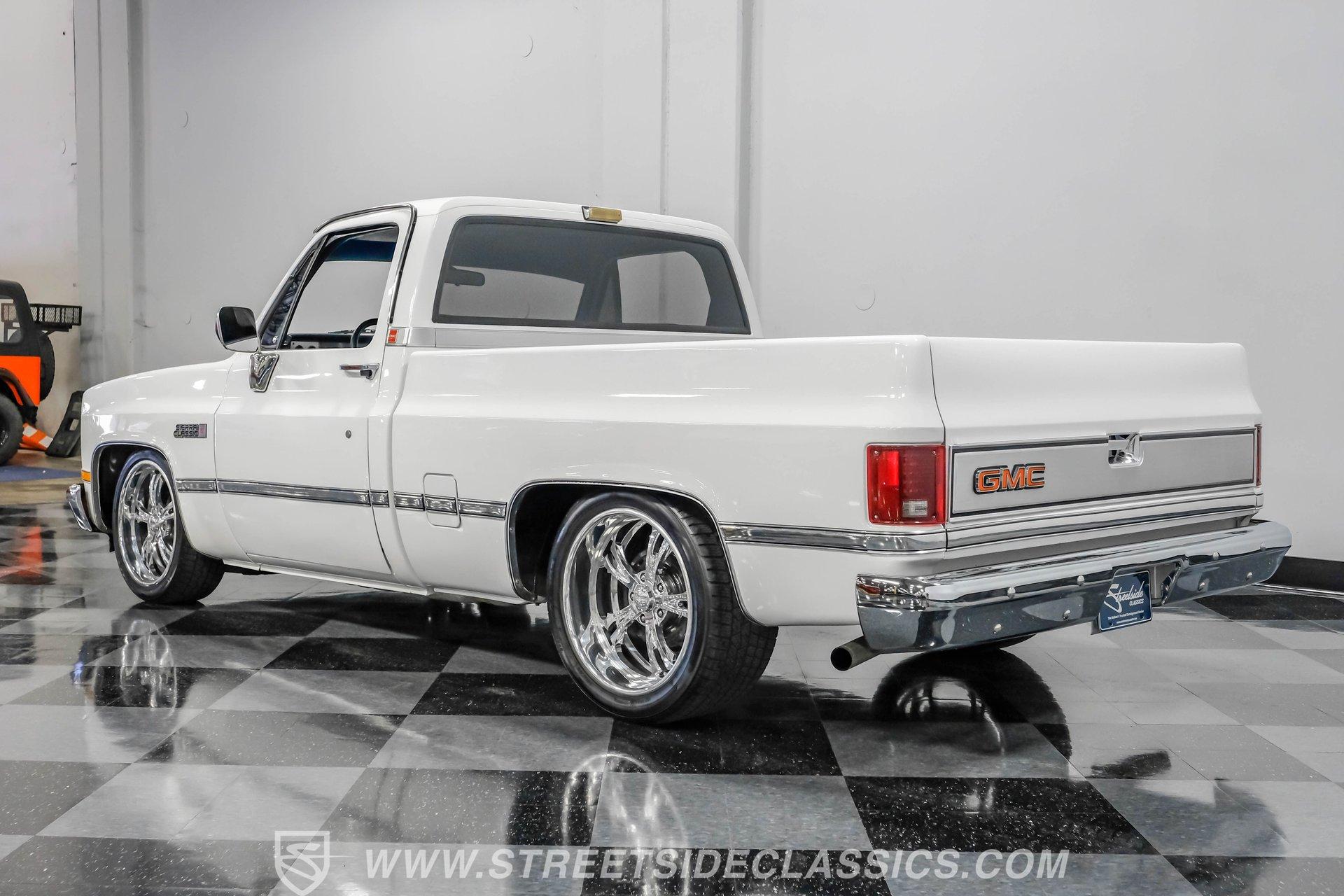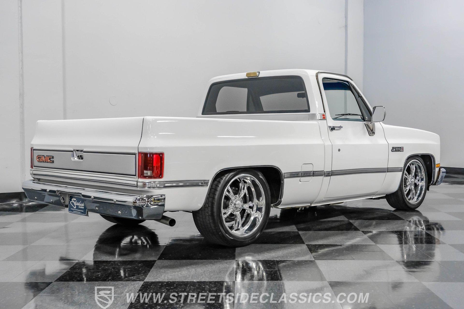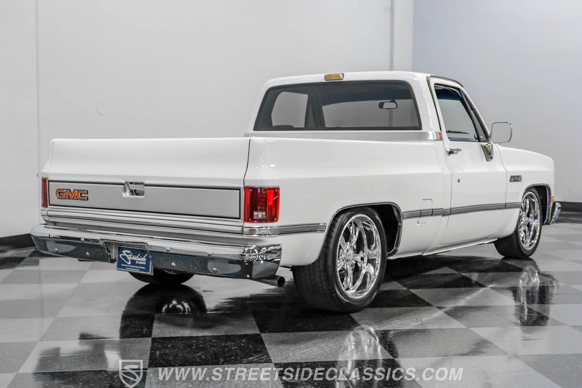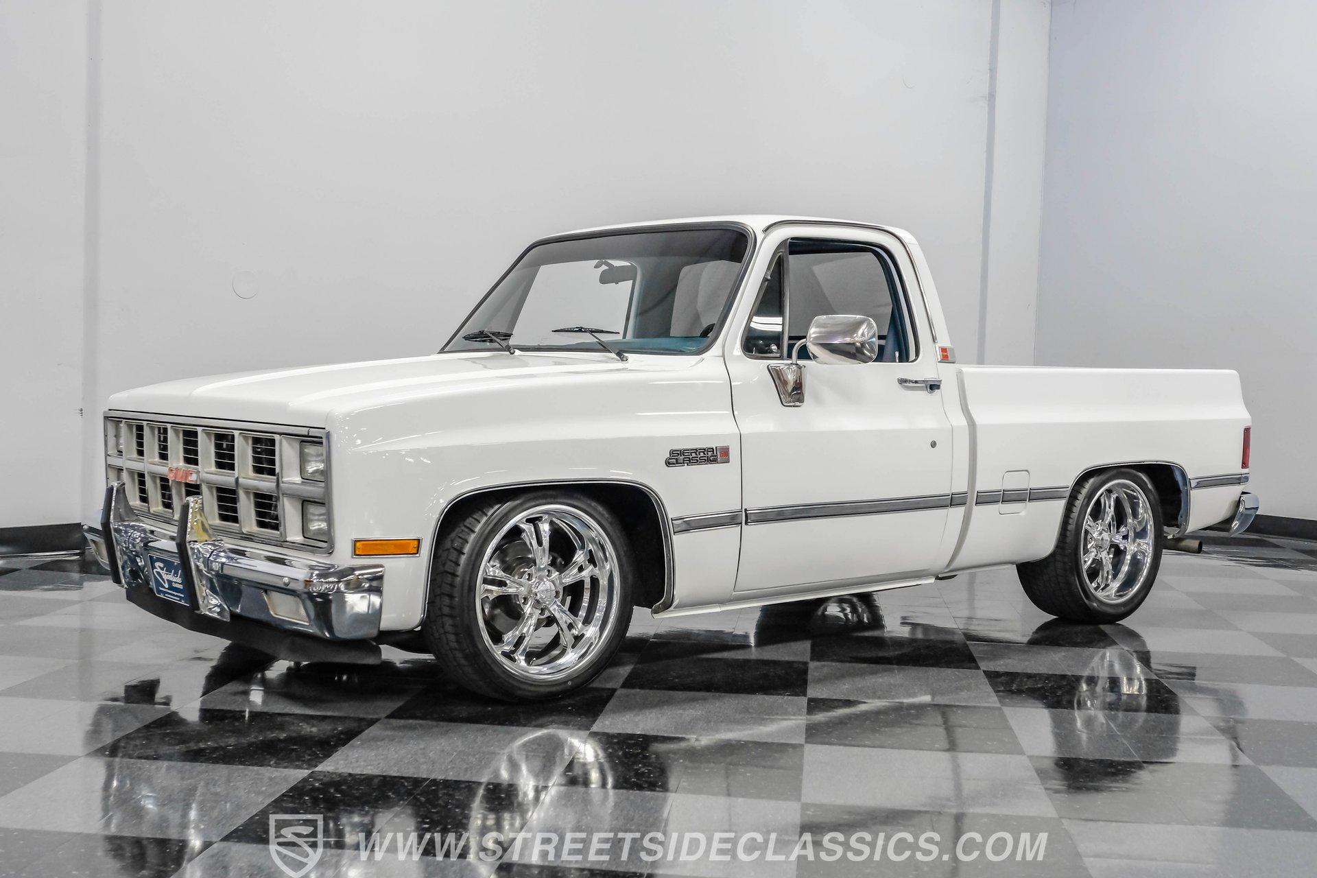 A classic pickup never goes out of style, and this 1982 GMC Sierra 1500 Restomod proves it. Blending vintage American craftsmanship with modern performance, this squarebody turns heads everywhere it goes. With fresh white paint, chrome brightwork, and a color matched bed lined in black Rhino coating on the floor, it delivers timeless appeal with contemporary refinement. Step inside to discover a cabin where vintage charm meets thoughtful upgrades. The blue vinyl contoured bench seat offers both support and style, complemented by correct blue door panels, blue carpets, and a padded headliner. Enjoy modern comfort with power locks, power windows, and a tilt steering column. Dakota Digital gauges keep you informed, while a Kenwood AM/FM/CD/Bluetooth/Aux sound system and subwoofer deliver rich audio for every drive. The cab is insulated with Kilmat for a quieter, more enjoyable ride. Under the hood, this Sierra packs a punch with a Gen III 6.0L Vortec V8, paired to a robust 4L80E 4-speed automatic transmission. The modern powertrain ensures strong acceleration and reliable cruising. Recent upgrades include a BP Automotive harness, modern radiator with dual electric fans, and all modern accessories, making this truck as capable as it is stylish. The Belltech lowering suspension, power steering, and power front disc brakes deliver confident handling and stopping power, while the 10-bolt rear axle and Nitto tires on 20" US Mags wheels complete the performance package. HIGHLIGHTS 6.0L Gen III Vortec V8 Engine 4L80E 4-Speed Automatic Transmission 9,057 Miles Since Built Belltech Lowering Suspension Power Steering Power Front Disc Brakes 20" U.S. Mags Wheels Nitto Tires (Installed 2024) Dakota Digital Gauges Kenwood AM/FM/CD/Bluetooth/Aux Stereo Blue Vinyl Contoured Bench Seat Modern Air Conditioning (R-134A) Color-Matched Bed with Black Rhino Liner Floor Recent White Repaint and Chrome Brightwork Financing Available Vehicle Protection Plans Available Worldwide Shipping This 1982 GMC Sierra 1500 Restomod offers the best of both worlds, merging classic looks with modern performance and convenience. Whether you're looking for a standout cruiser or a show-ready pickup, this Sierra is ready to impress. Call, email, or come visit our showroom today!