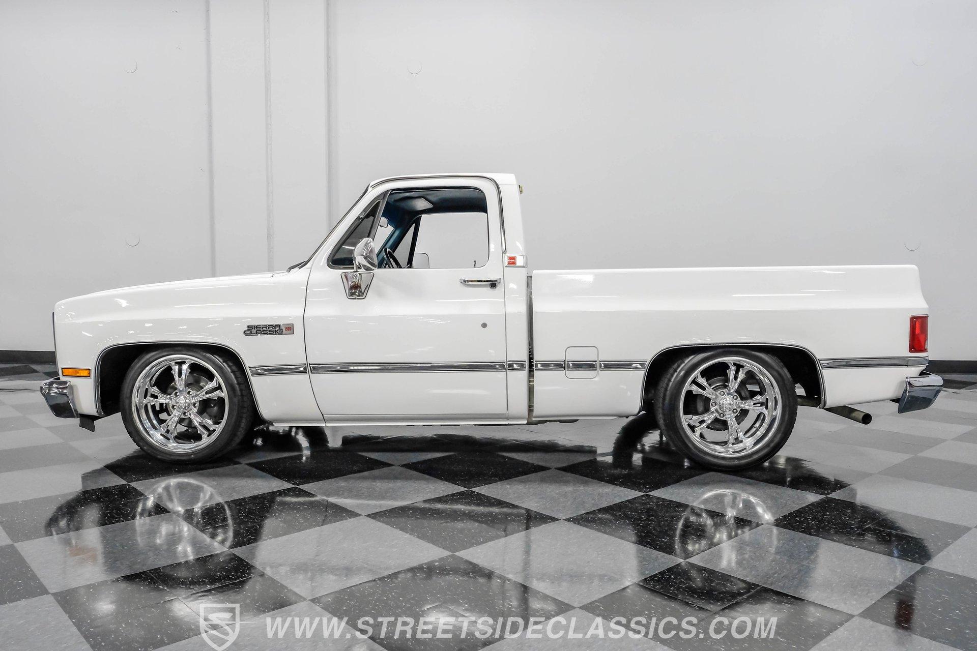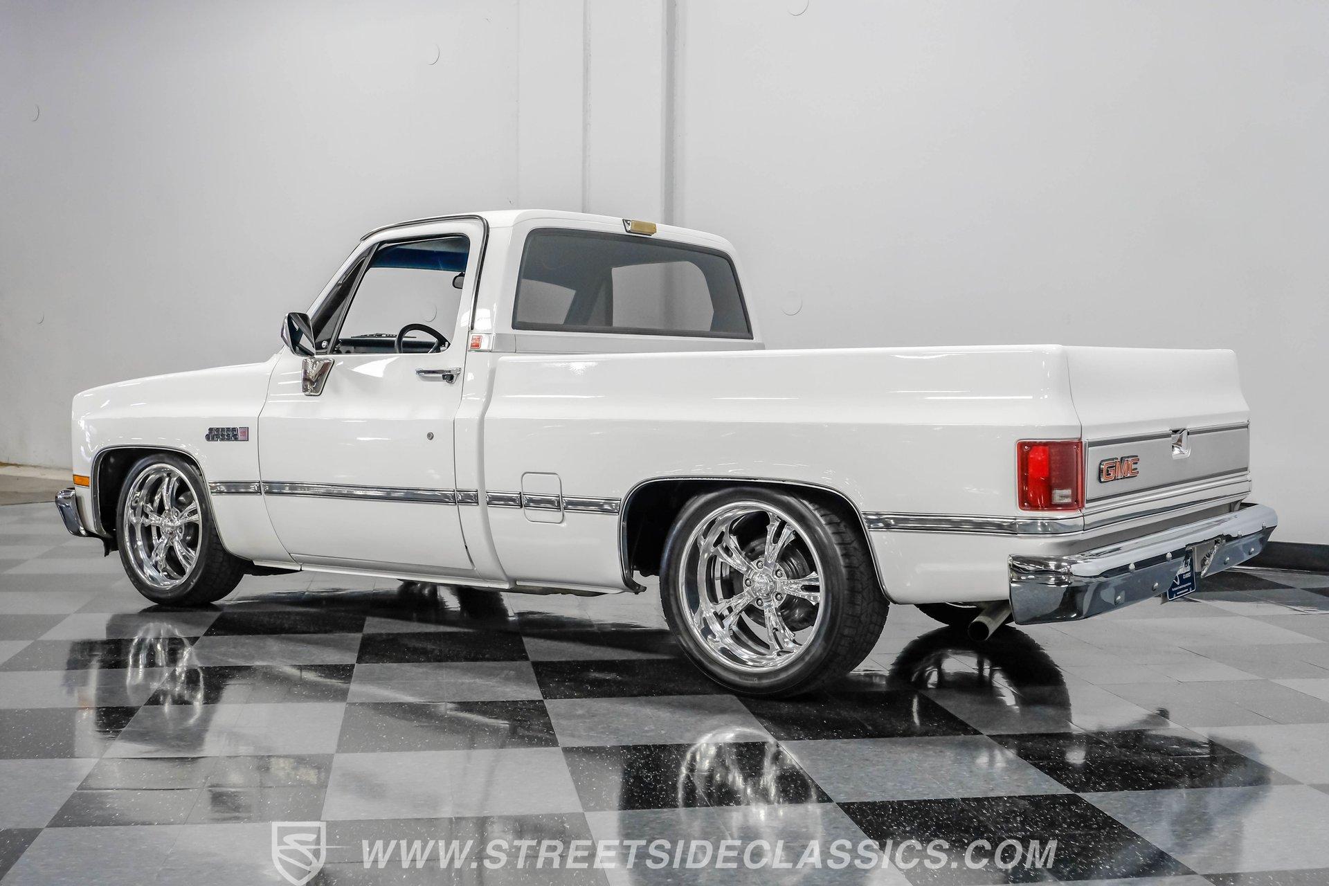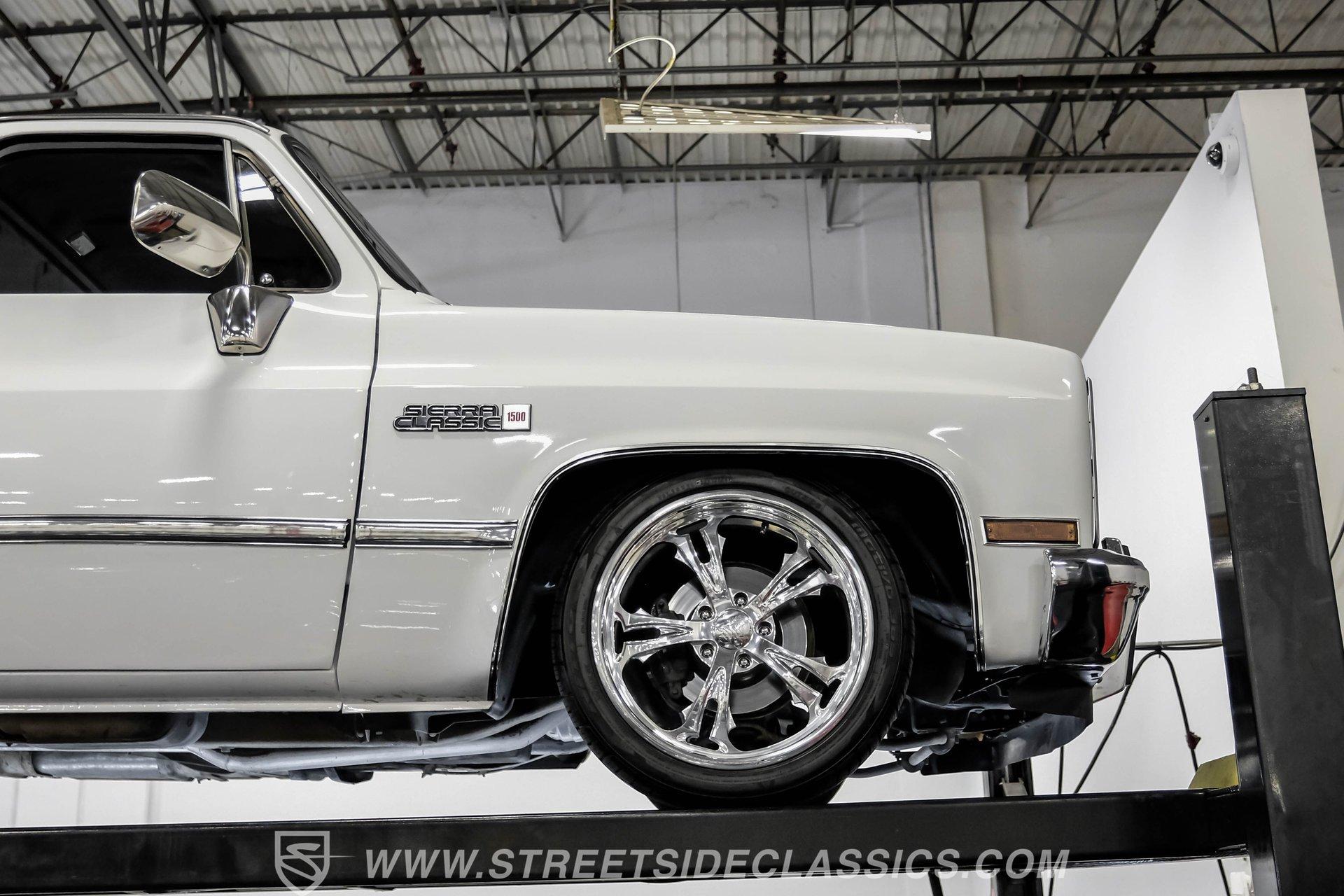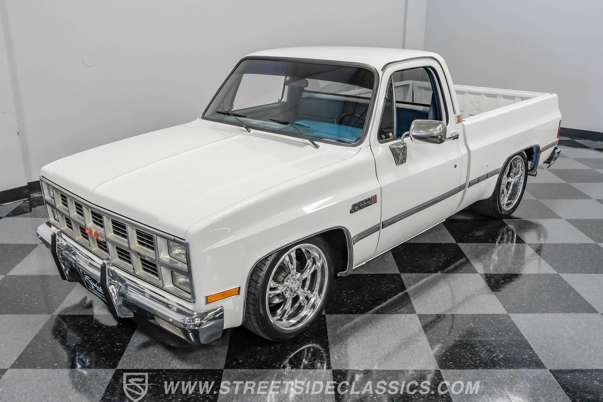 A classic pickup never goes out of style, and this 1982 GMC Sierra 1500 Restomod proves it. Blending vintage American craftsmanship with modern performance, this squarebody turns heads everywhere it goes. With fresh white paint, chrome brightwork, and a color matched bed lined in black Rhino coating on the floor, it delivers timeless appeal with contemporary refinement. Step inside to discover a cabin where vintage charm meets thoughtful upgrades. The blue vinyl contoured bench seat offers both support and style, complemented by correct blue door panels, blue carpets, and a padded headliner. Enjoy modern comfort with power locks, power windows, and a tilt steering column. Dakota Digital gauges keep you informed, while a Kenwood AM/FM/CD/Bluetooth/Aux sound system and subwoofer deliver rich audio for every drive. The cab is insulated with Kilmat for a quieter, more enjoyable ride. Under the hood, this Sierra packs a punch with a Gen III 6.0L Vortec V8, paired to a robust 4L80E 4-speed automatic transmission. The modern powertrain ensures strong acceleration and reliable cruising. Recent upgrades include a BP Automotive harness, modern radiator with dual electric fans, and all modern accessories, making this truck as capable as it is stylish. The Belltech lowering suspension, power steering, and power front disc brakes deliver confident handling and stopping power, while the 10-bolt rear axle and Nitto tires on 20" US Mags wheels complete the performance package. HIGHLIGHTS 6.0L Gen III Vortec V8 Engine 4L80E 4-Speed Automatic Transmission 9,057 Miles Since Built Belltech Lowering Suspension Power Steering Power Front Disc Brakes 20" U.S. Mags Wheels Nitto Tires (Installed 2024) Dakota Digital Gauges Kenwood AM/FM/CD/Bluetooth/Aux Stereo Blue Vinyl Contoured Bench Seat Modern Air Conditioning (R-134A) Color-Matched Bed with Black Rhino Liner Floor Recent White Repaint and Chrome Brightwork Financing Available Vehicle Protection Plans Available Worldwide Shipping This 1982 GMC Sierra 1500 Restomod offers the best of both worlds, merging classic looks with modern performance and convenience. Whether you're looking for a standout cruiser or a show-ready pickup, this Sierra is ready to impress. Call, email, or come visit our showroom today!