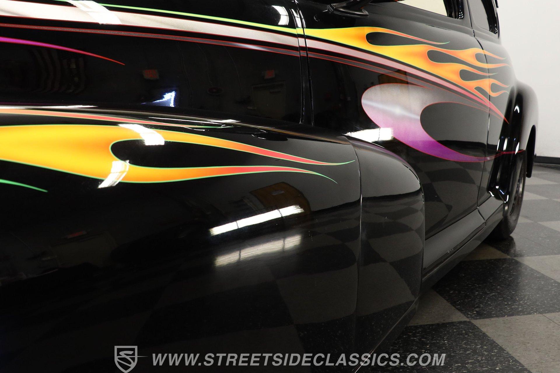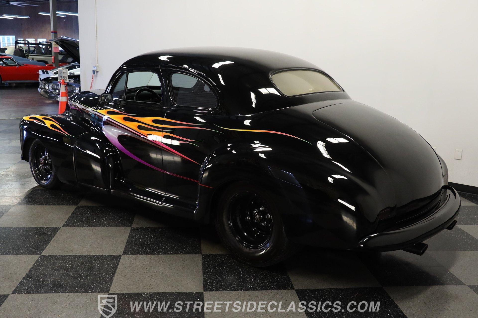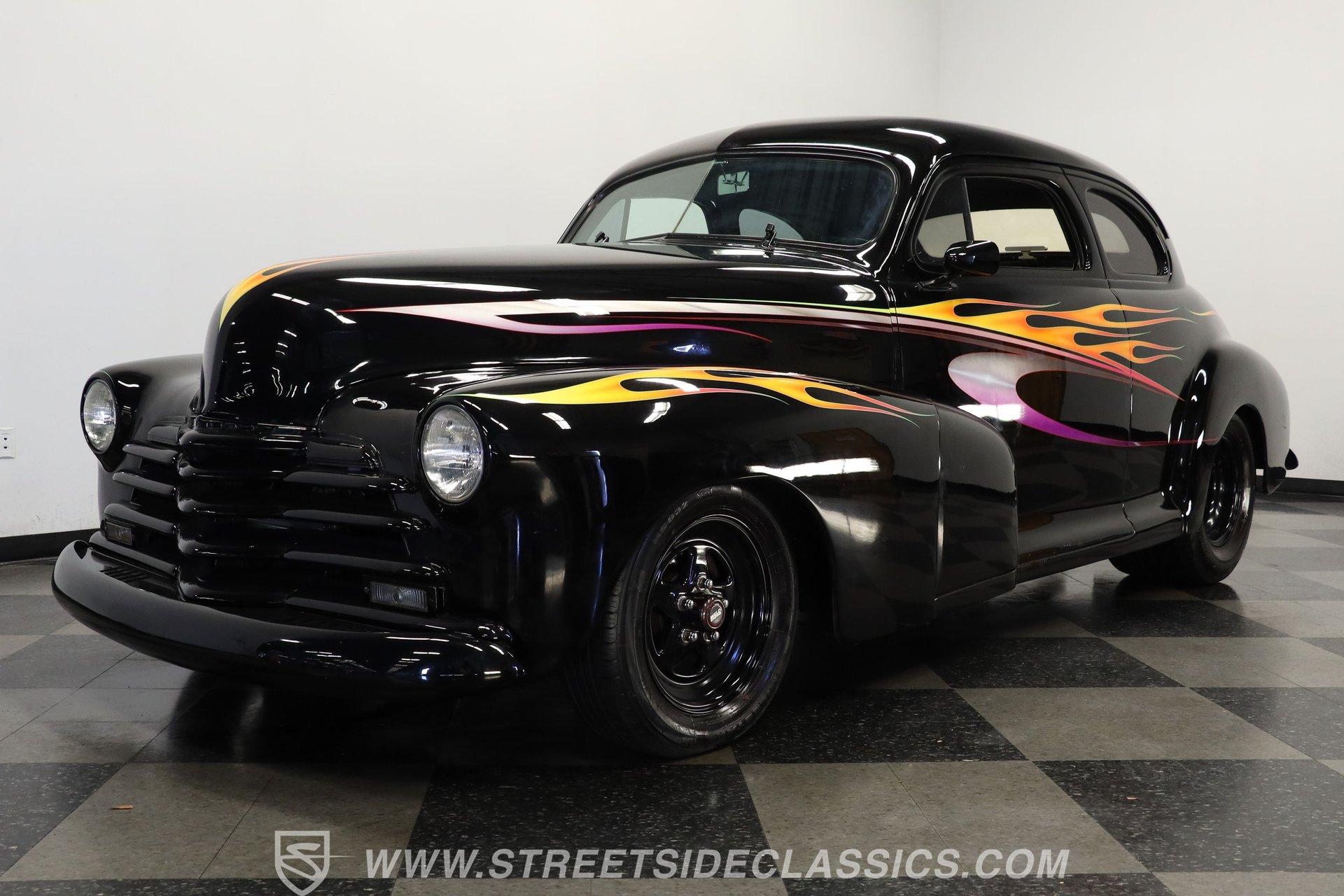For Sale: 1947 Chevrolet Stylemaster 2 Door Coupe Some cars are more than just machines-they are time capsules, capturing the spirit of an era and the thrill of the open road. Imagine pulling up to a weekend cruise-in, the sun glinting off a custom flame paint job, and feeling the pride that only a true American classic can inspire. This is the kind of car that sparks conversations, turns heads, and brings people together, whether you remember the golden age of hot rods or are discovering it for the first time. For those who crave distinction and a touch of nostalgia, the 1947 Chevrolet Stylemaster 2 Door Coupe is ready for its next chapter. Step inside and experience a blend of vintage charm and custom flair. The interior showcases comfortable tweed-style seats, each embroidered with the iconic Chevy logo, providing a unique touch that sets this coupe apart. The dash is painted black and adorned with custom pinstripes, complemented by aftermarket VDO gauges for a modern twist. A Lacara steering wheel on a tilt column and a matching floor shifter add both style and function, while manual window cranks keep the experience authentic. Under the hood, this Stylemaster boasts a 350 V8 engine paired with a TH350 3-speed automatic transmission, offering a satisfying balance of classic muscle and reliable performance. The upgraded Edelbrock 4-barrel carburetor, power steering, and power brakes ensure an enjoyable driving experience, while the R134A air conditioning system (currently non-functional) and upgraded aluminum radiator with a belt-driven cooling fan keep things cool. The Ford 9-inch rear end and lightly tubbed rear add to the car's street-ready stance, making it as fun to drive as it is to show. Highlights 350 V8 Engine With Edelbrock 4-Barrel Carb TH350 3-Speed Automatic Transmission Ford 9-Inch Rear End Power Steering And Power Brakes Upgraded Aluminum Radiator R134A Air Conditioning System Custom Black Paint With Painted Flames Paint By Florida Artist "Chris Cross" Aftermarket Weld Racing Rims Lightly Tubbed Rear, Shaved Door Handles Frenched Headlights And V-Butt Windshield Tweed Seats With Chevy Logo Stitching Aftermarket VDO Gauges And Lacara Steering Wheel Front Power Disc And Rear Drum Brakes Receipts Included Financing Available Vehicle Protection Plans Available Worldwide Shipping A true blend of artistry and engineering, this 1947 Chevrolet Stylemaster 2 Door Coupe stands as a testament to hot rod tradition and custom craftsmanship. Whether you want to relive the glory days or start new memories, this classic is ready to impress on every drive. Call, email, or come visit our showroom today! Be sure to ask about our services offered; Financing, Vehicle Protection Plan, Insurance, and Transportation to your driveway!