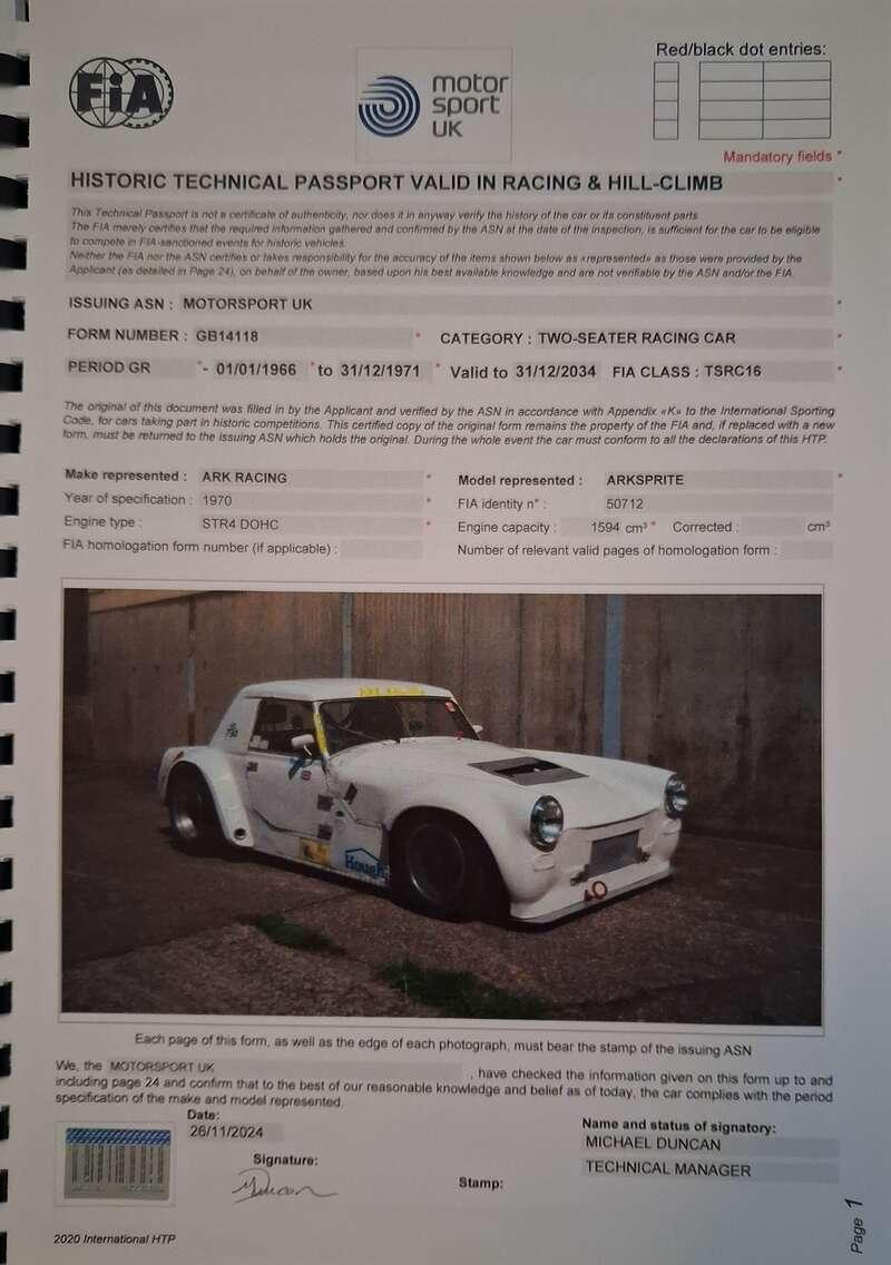 Recently issued with FIA Historic Technical Passport (HTP) papers (Class TSRC16) valid until 31/12/2034, this evocative and highly significant British GT car presents a rare opportunity for a new custodian. Eligible for a wide range of prestigious historic race meetings, Modsports, Hill-Climbs and Sprints, the Ark Sprite offers the chance to return a true piece of UK motorsport history to the circuits where it earned its reputation more than half a century ago.