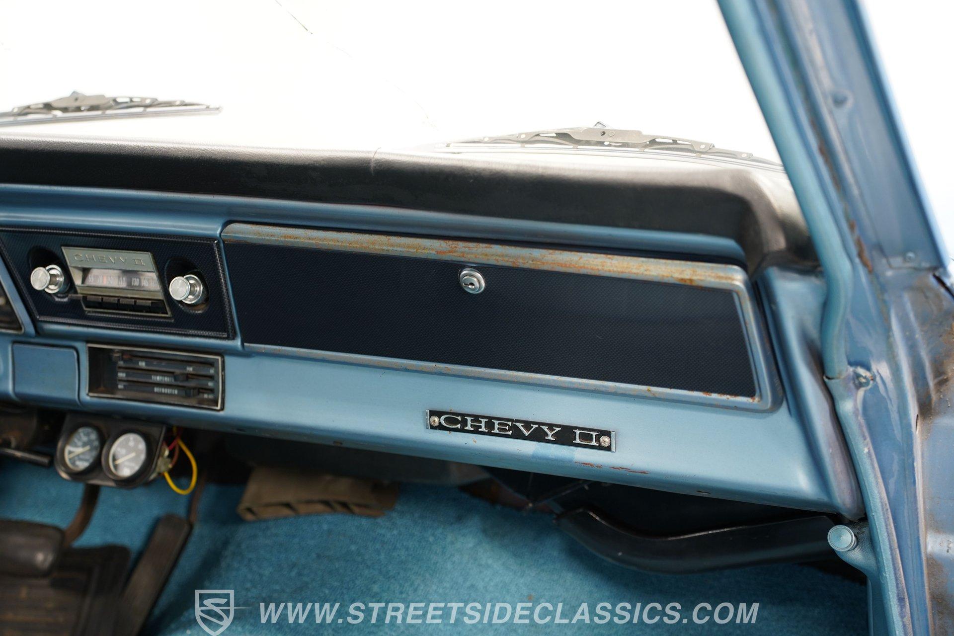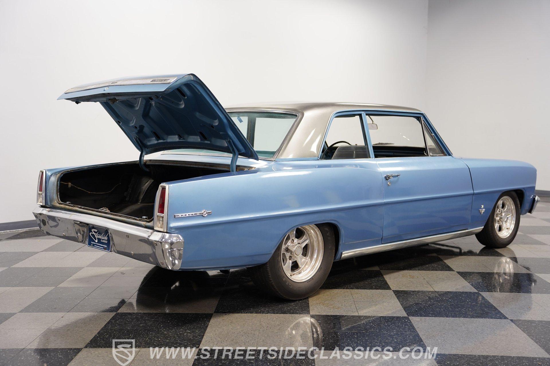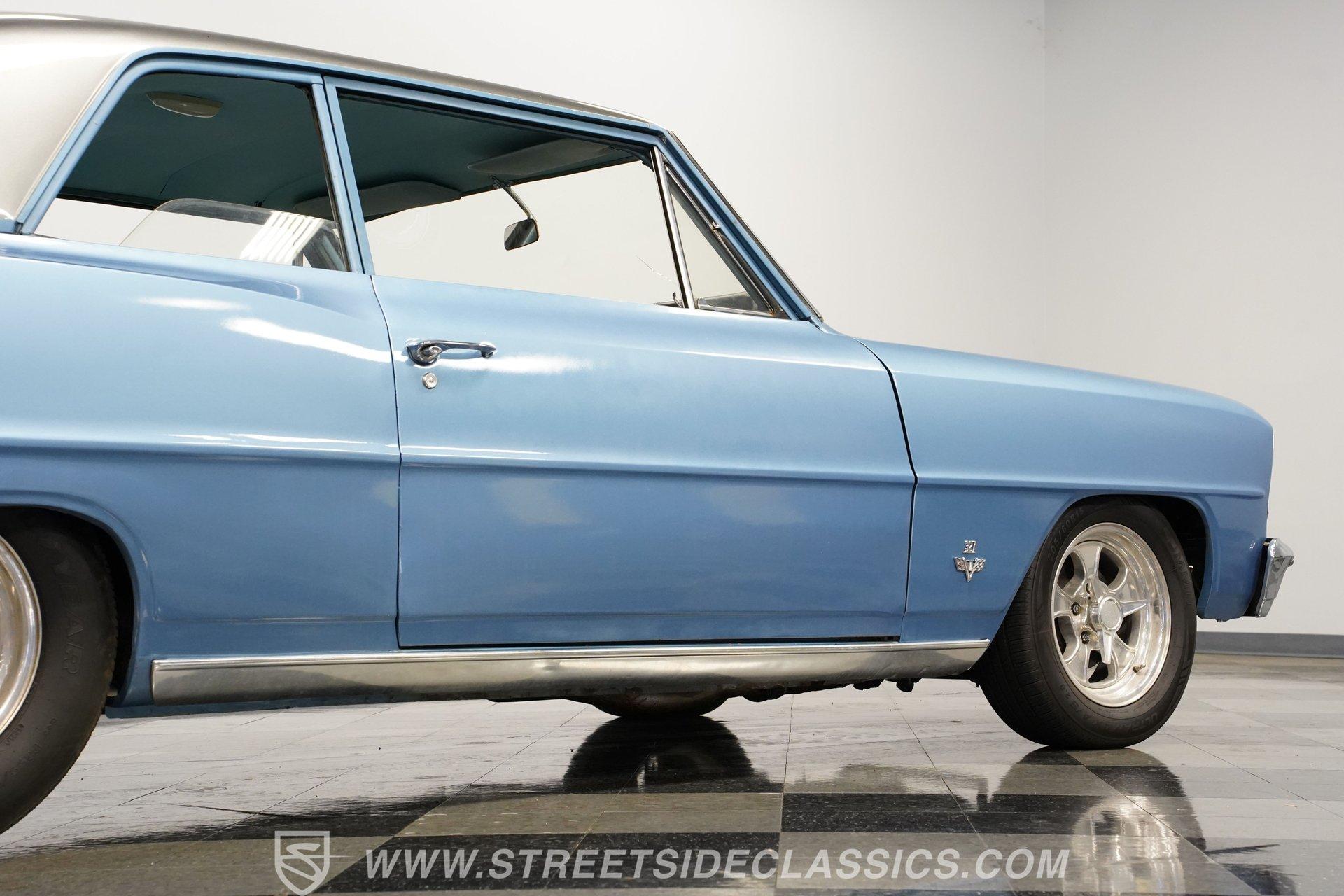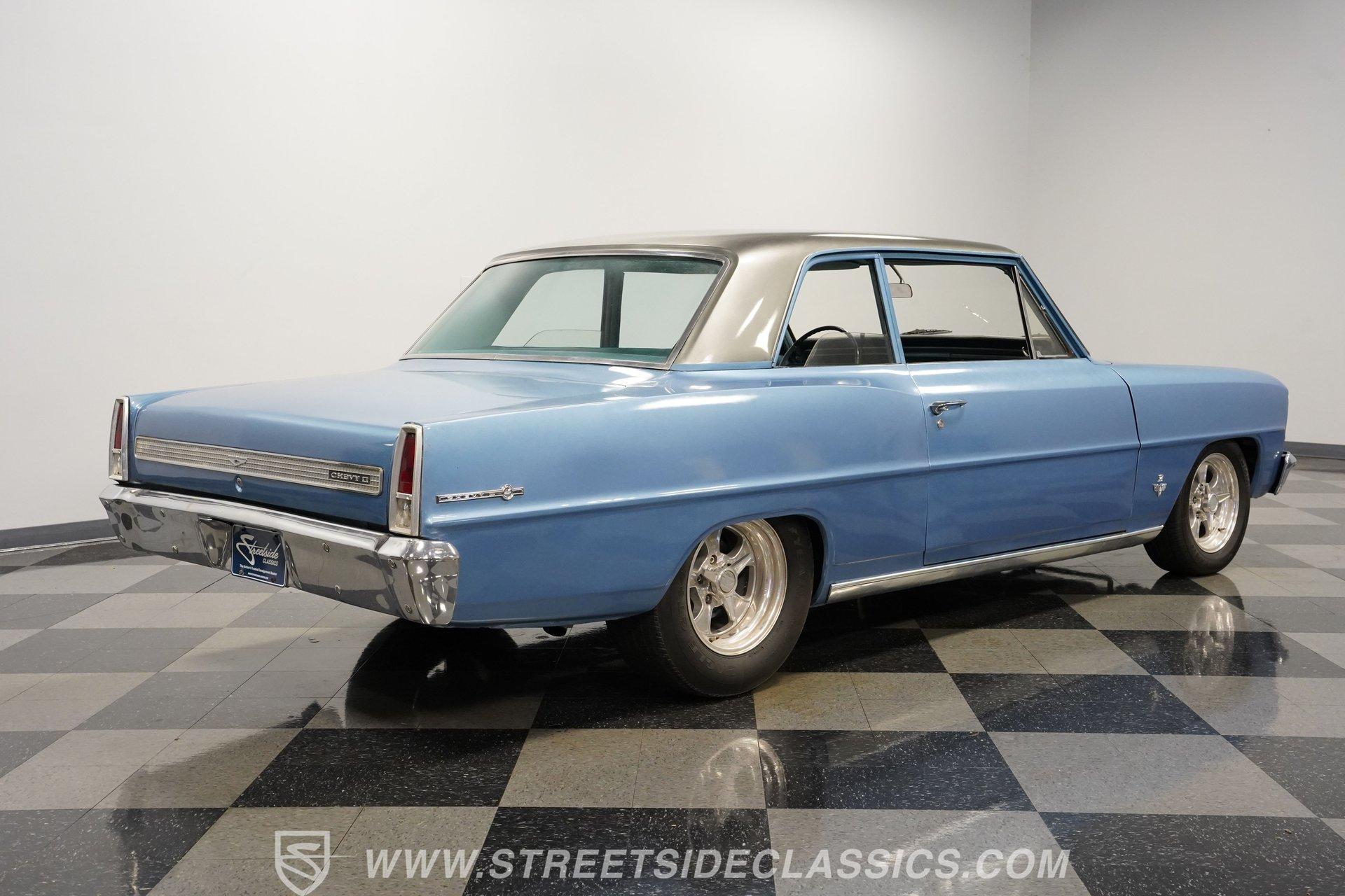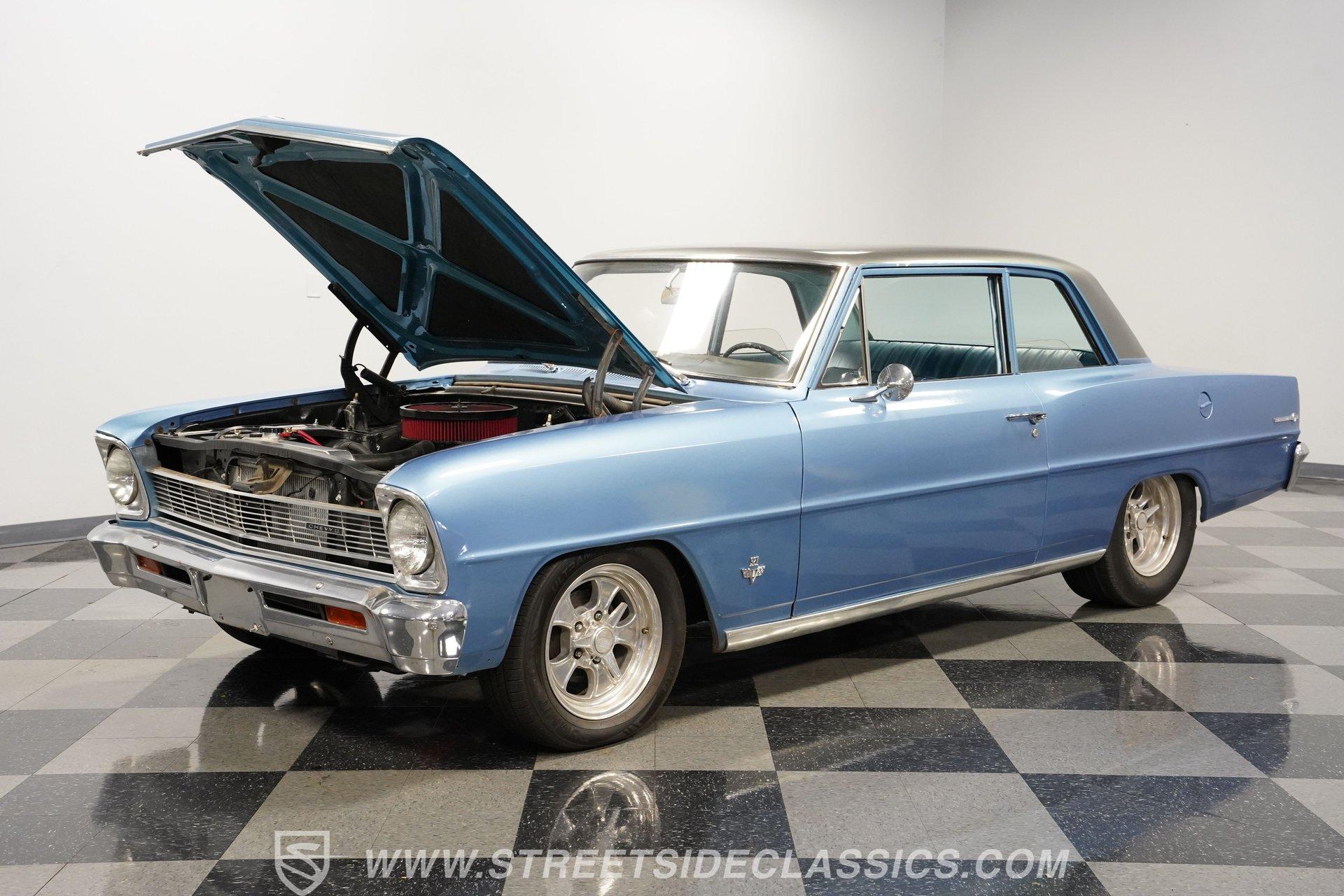 Under the hood sits a 350-cubic-inch V8. An aluminum radiator, Quick Fuel 4-barrel carburetor, and Edelbrock intake are just a few of the performance upgrades this engine benefits from. Power is sent through a 3-speed TH350 automatic transmission to a GM 10-bolt rear axle. The suspension setup includes: new front springs and shocks paired with lowering springs, while the rear uses leaf springs with lowering blocks to complete the aggressive stance. The car rides on 15-inch American Racing wheels wrapped in 205/60R15 tires, front and rear. Long-tube headers and Flowmaster mufflers give this Nova the unmistakable sound a muscle car should have. Highlights: 350 Cubic Inch V8 Quick Fuel 4-Barrel Carburetor Edelbrock Intake Aluminum Radiator 3-Speed TH350 Automatic Transmission 10-Bolt Rear Axle Lowered Front Springs And Shocks Rear Leaf Springs With Lower Blocks 15-Inch American Racing Wheels Long Tube Headers Flowmaster Mufflers The name alone should sell itself... 1966 Chevrolet Nova Chevy II models are highly desirable among car enthusiasts. This example offers a great color combination, runs and sounds strong, and features a lowered stance that gives it an aggressive, eye-catching appearance. With its old-school character and undeniable charm, this Nova is ready to be enjoyed. Call Today!