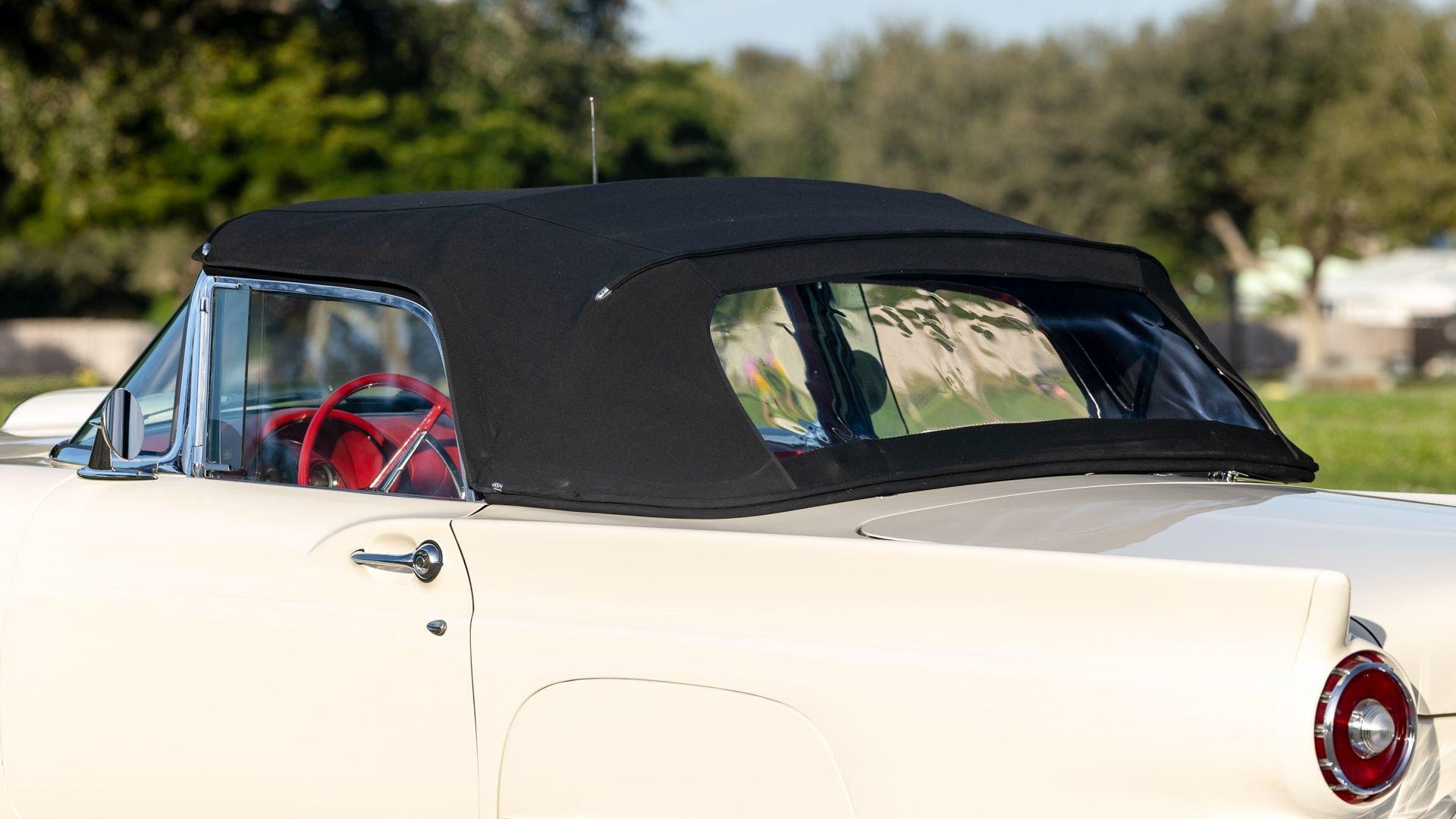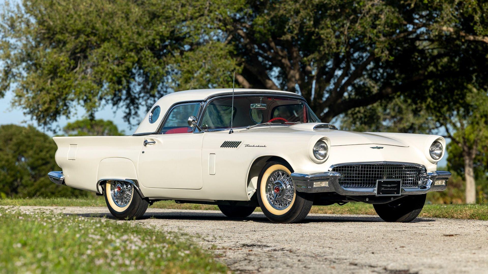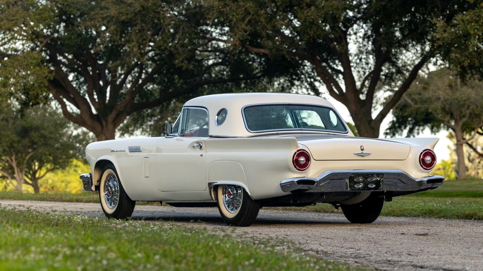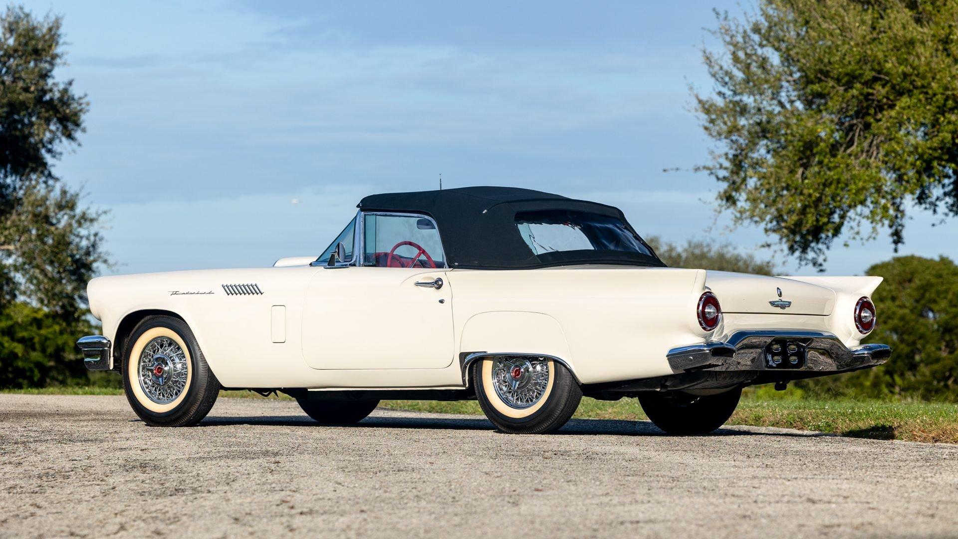 Chassis No. D7FH229336 For 1956, changes to the popular Thunderbird were subtle but significant—distinctive porthole windows were added to the removable hardtop, and the electrics moved from a 6-volt to a 12-volt system. After just three years of the original two-seat design, Ford would reshape the Thunderbird into a larger four-seater for 1958. Despite its brief production run, the early "Baby Bird" vastly outsold the Corvette, and the Thunderbird model would continue to be a popular collectible in the decades since. This 1957 Baby Bird was completed on the 25th of February 1957 at the Dearborn, Michigan plant and dispatched to the New York area for sale. Extensively equipped from the factory, it features the “D-Code” 312 cu-in V8 producing 245 horsepower, a Fordomatic automatic transmission, Master-Glide power steering, Swift Sure power brakes, Power-Lift Windows, a four-way power front bench seat, back-up lights, and engine dress-up kit, along with both the hard and soft convertible tops. The car was the subject of a nut-and-bolt, rotisserie restoration in its original factory livery of Corinthian White over Pleated Flame (red) vinyl upholstery, paired with a matching body-color hard top and a black canvas soft top. The restoration also included the tasteful addition of VintageAir air conditioning and an upgraded AM/FM vintage radio for modern touring comfort. Throughout, the car presents beautifully with no detail overlooked, displaying tidy brightwork and chrome Kesley Hayes-style wire wheels with spinner hubcaps, a vibrant interior, and a spotless engine compartment complete with the chrome engine dress-up kit. With the odometer showing a scant 92 miles traveled since its restoration, this Thunderbird is poised to be a standout on the concours field, a favorite at local cruises, or a cherished centerpiece in a collection focused on the most iconic designs to emerge from the American Jet Age.