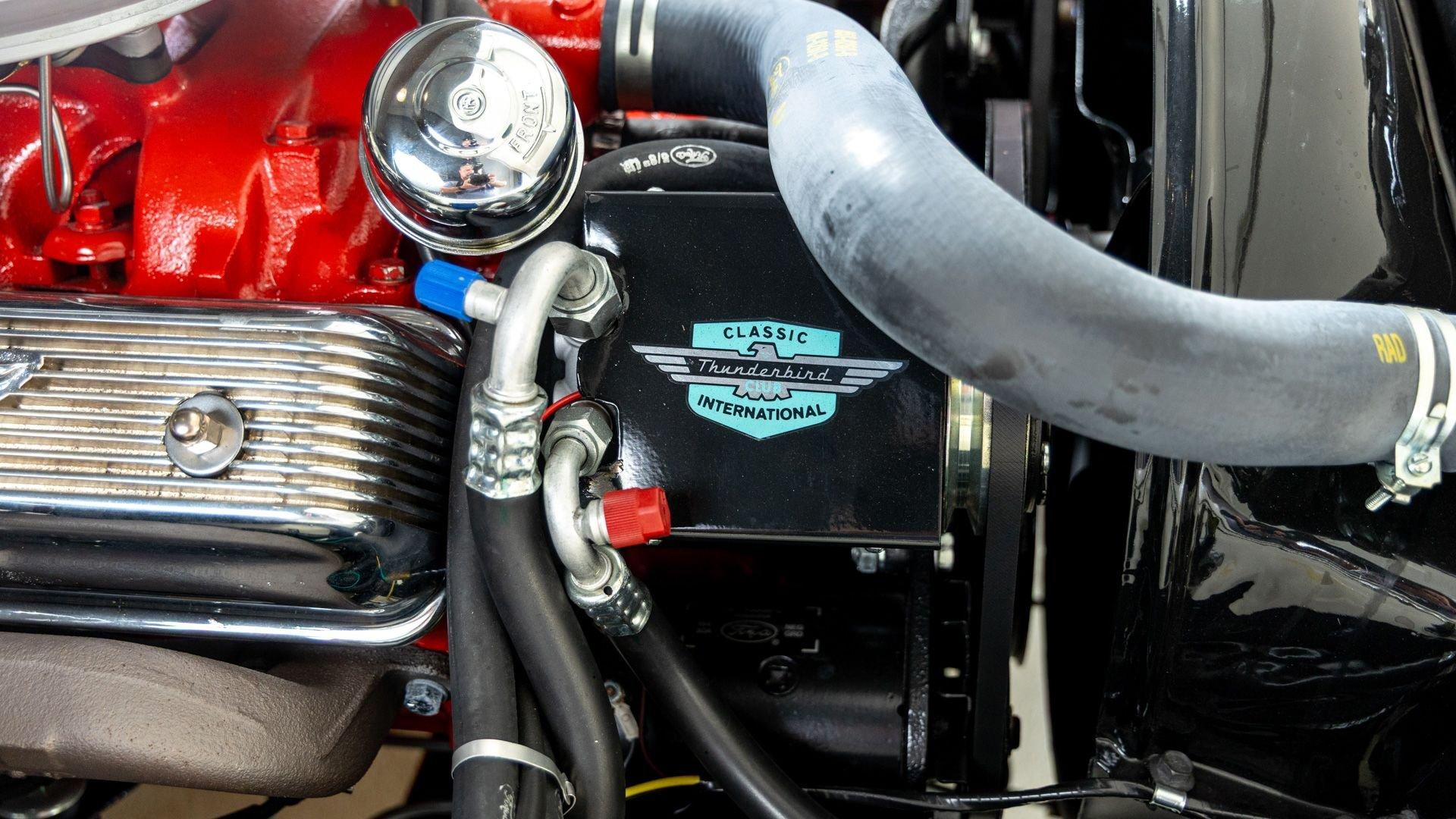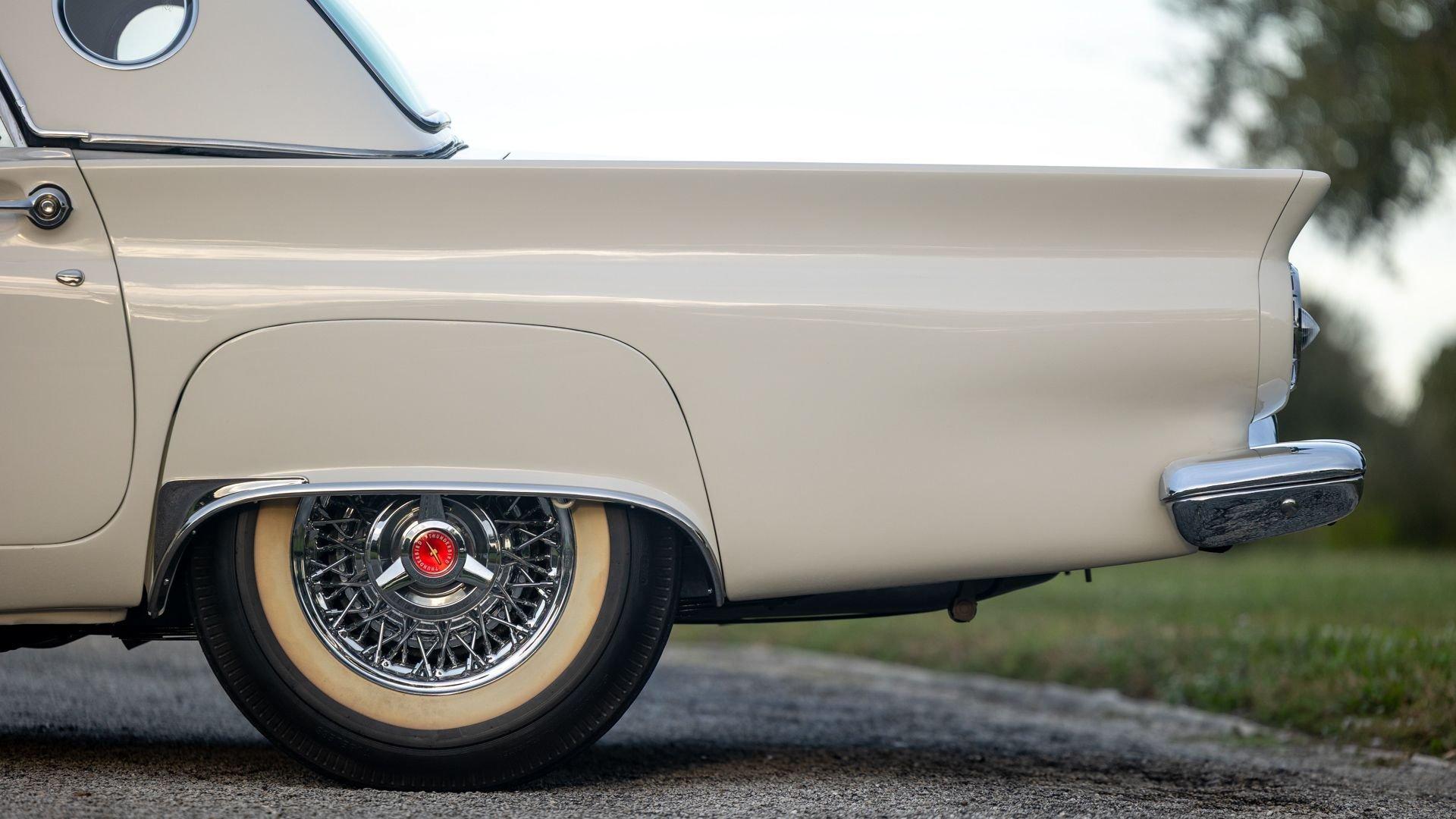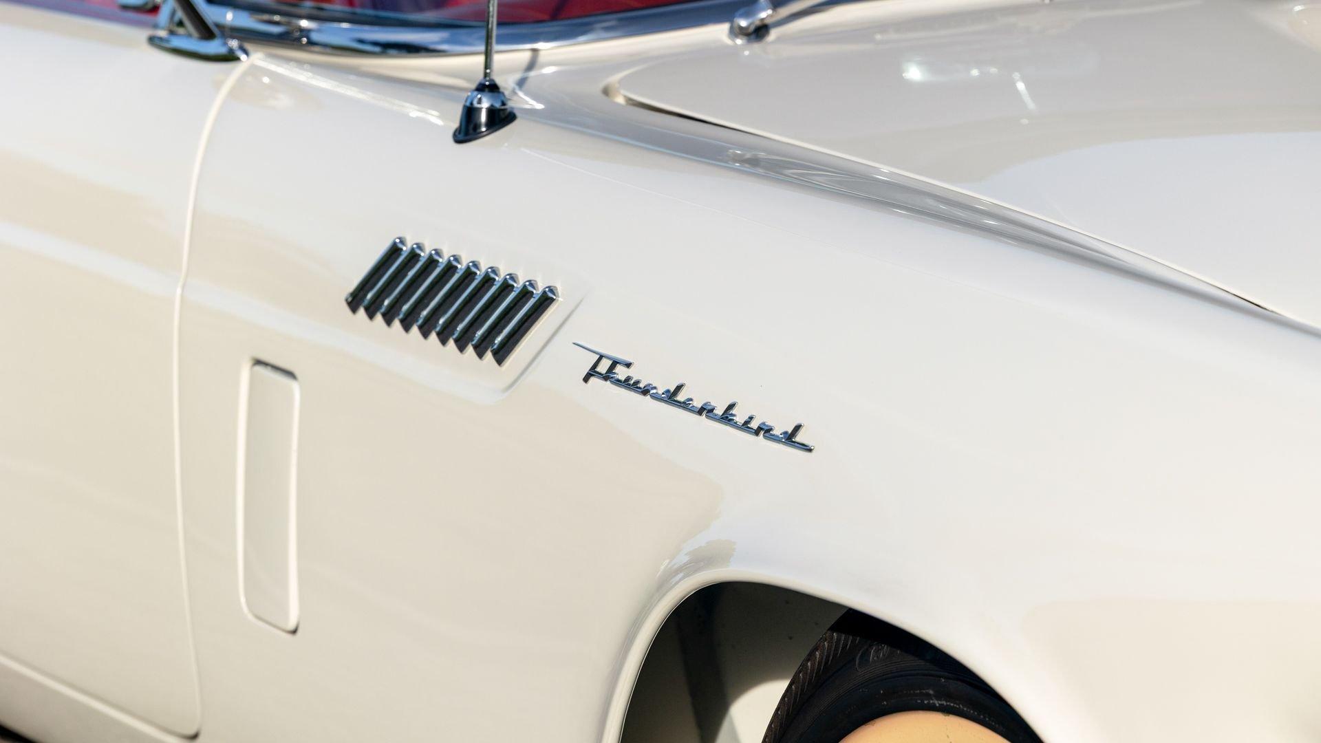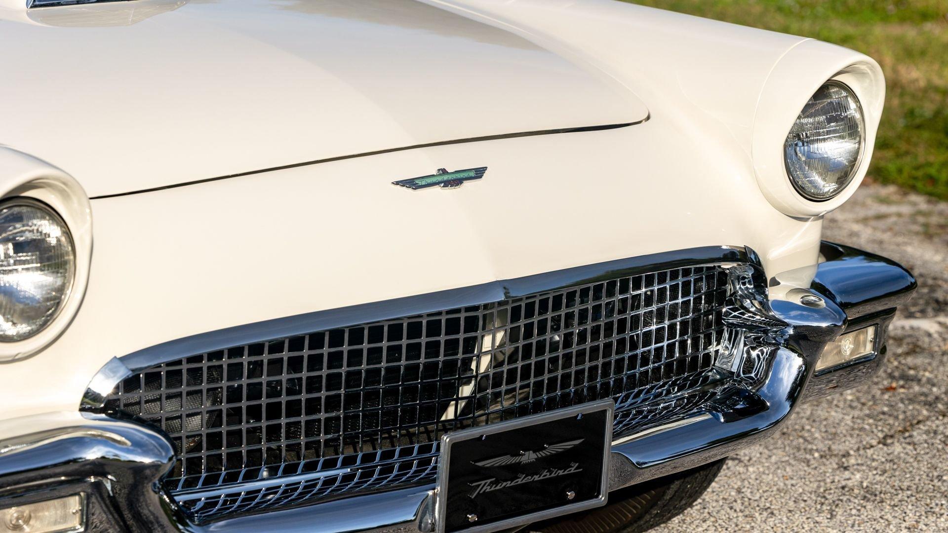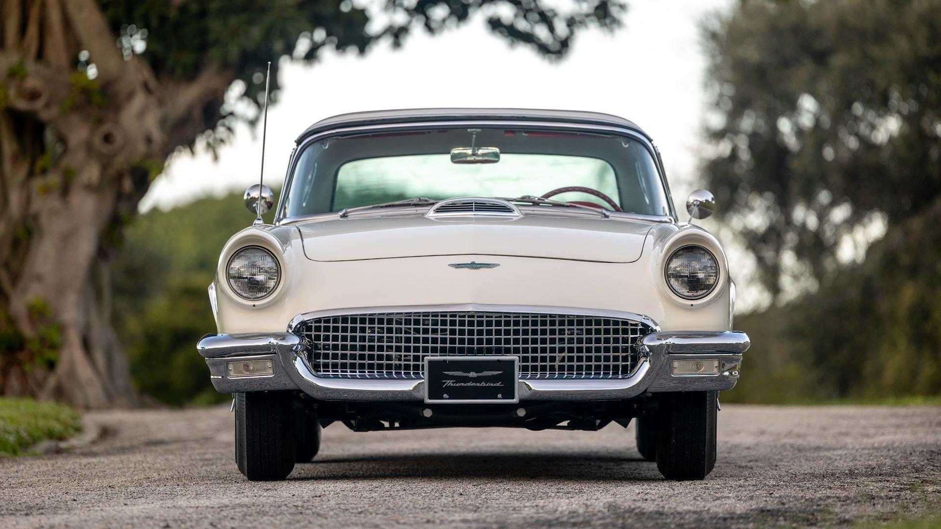 Chassis No. D7FH229336 For 1956, changes to the popular Thunderbird were subtle but significant—distinctive porthole windows were added to the removable hardtop, and the electrics moved from a 6-volt to a 12-volt system. After just three years of the original two-seat design, Ford would reshape the Thunderbird into a larger four-seater for 1958. Despite its brief production run, the early "Baby Bird" vastly outsold the Corvette, and the Thunderbird model would continue to be a popular collectible in the decades since. This 1957 Baby Bird was completed on the 25th of February 1957 at the Dearborn, Michigan plant and dispatched to the New York area for sale. Extensively equipped from the factory, it features the “D-Code” 312 cu-in V8 producing 245 horsepower, a Fordomatic automatic transmission, Master-Glide power steering, Swift Sure power brakes, Power-Lift Windows, a four-way power front bench seat, back-up lights, and engine dress-up kit, along with both the hard and soft convertible tops. The car was the subject of a nut-and-bolt, rotisserie restoration in its original factory livery of Corinthian White over Pleated Flame (red) vinyl upholstery, paired with a matching body-color hard top and a black canvas soft top. The restoration also included the tasteful addition of VintageAir air conditioning and an upgraded AM/FM vintage radio for modern touring comfort. Throughout, the car presents beautifully with no detail overlooked, displaying tidy brightwork and chrome Kesley Hayes-style wire wheels with spinner hubcaps, a vibrant interior, and a spotless engine compartment complete with the chrome engine dress-up kit. With the odometer showing a scant 92 miles traveled since its restoration, this Thunderbird is poised to be a standout on the concours field, a favorite at local cruises, or a cherished centerpiece in a collection focused on the most iconic designs to emerge from the American Jet Age.