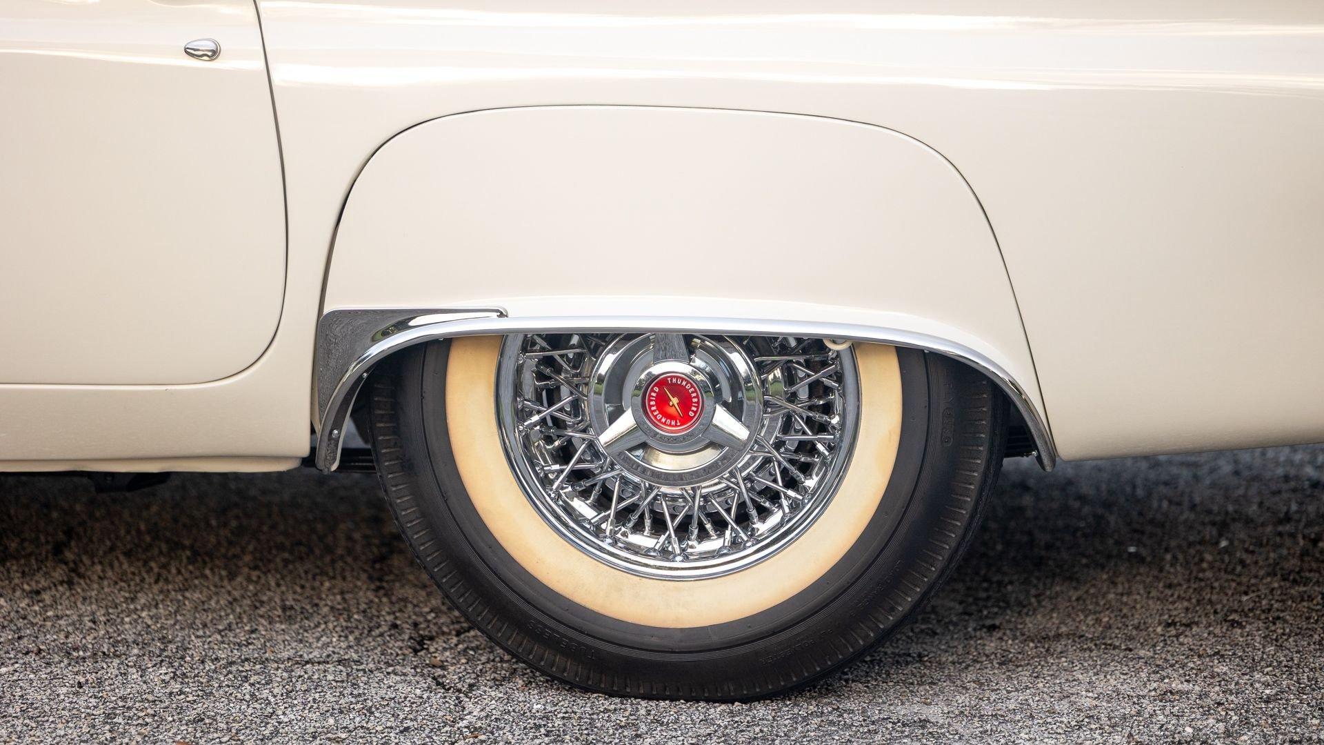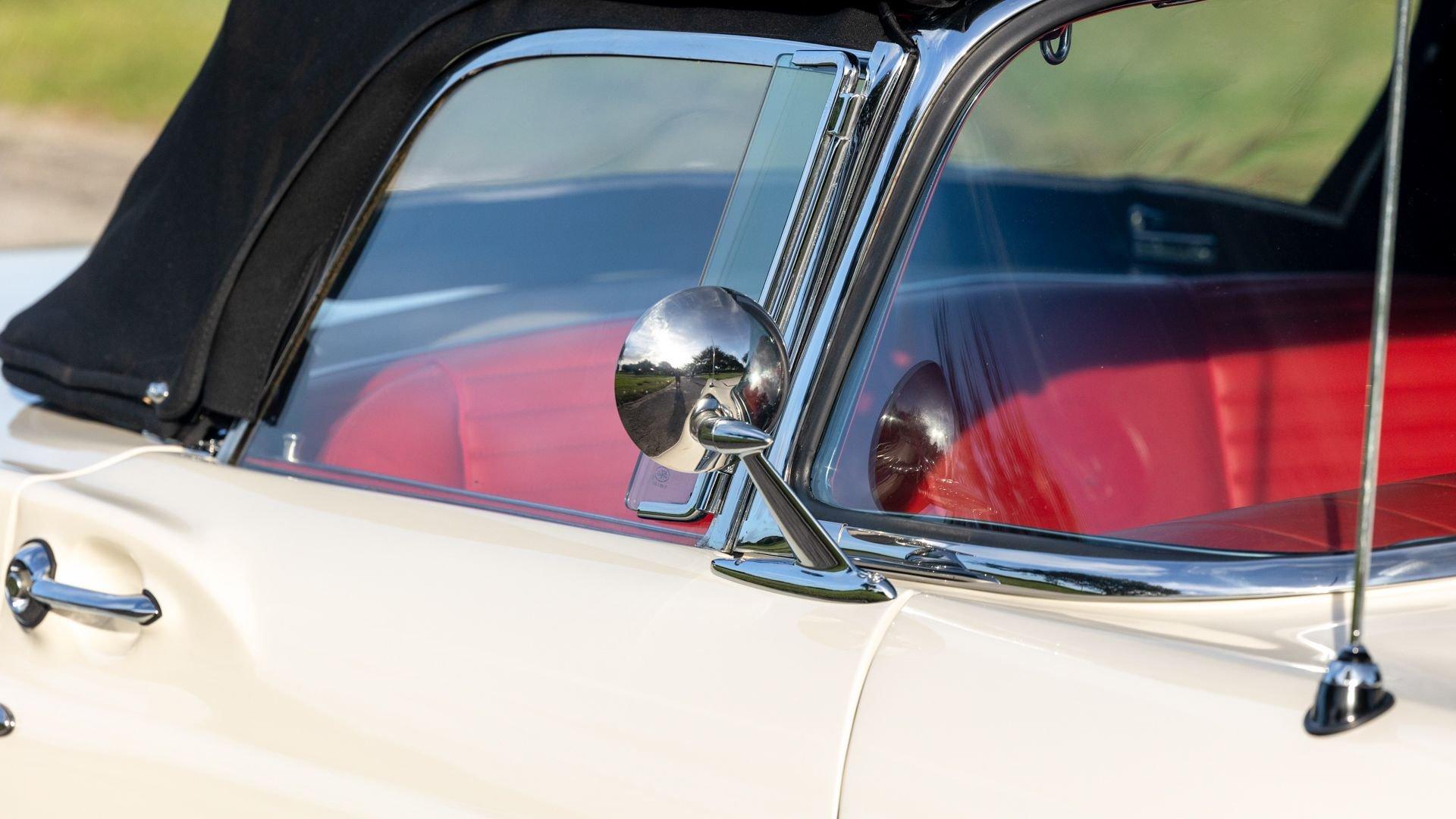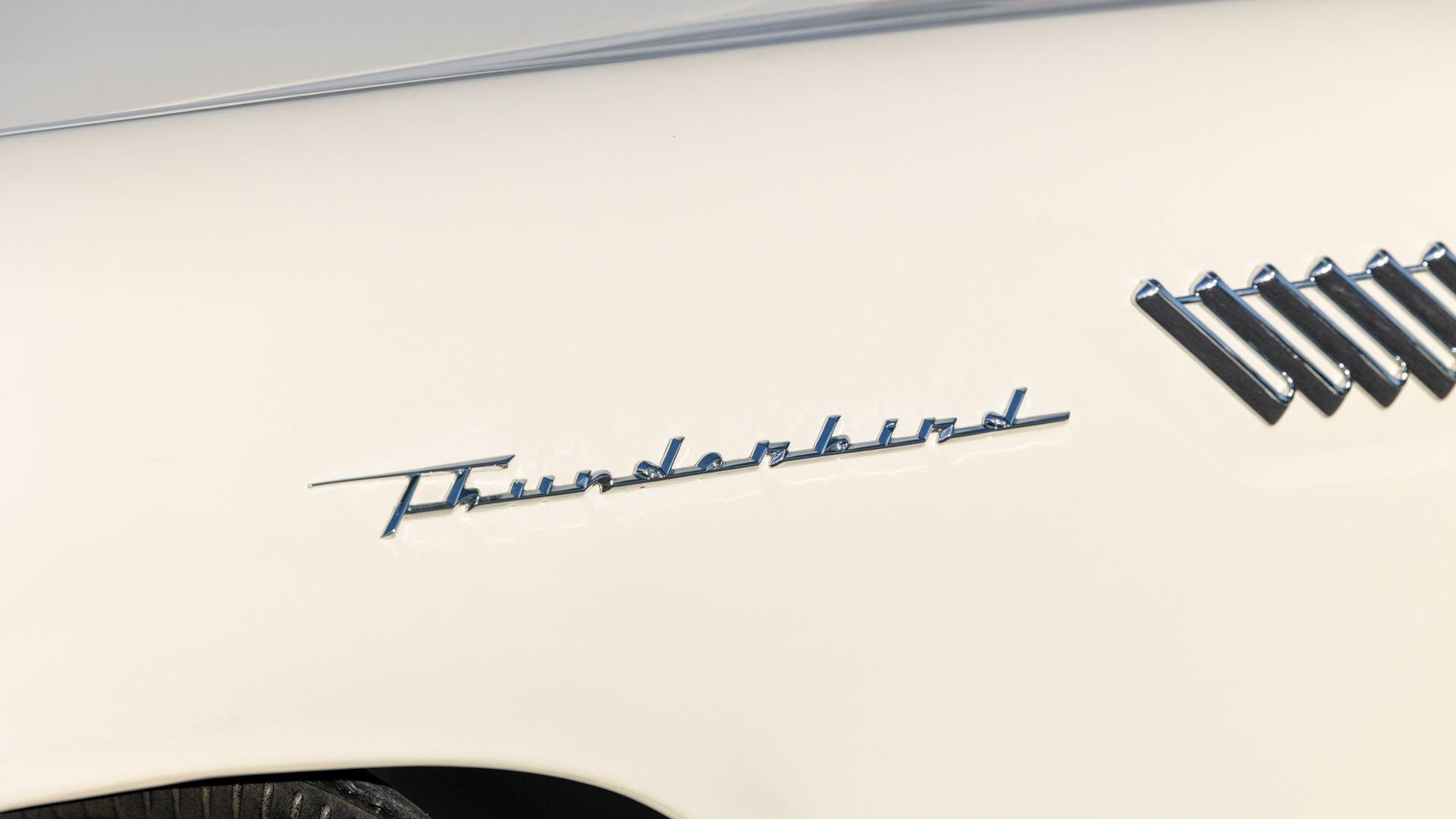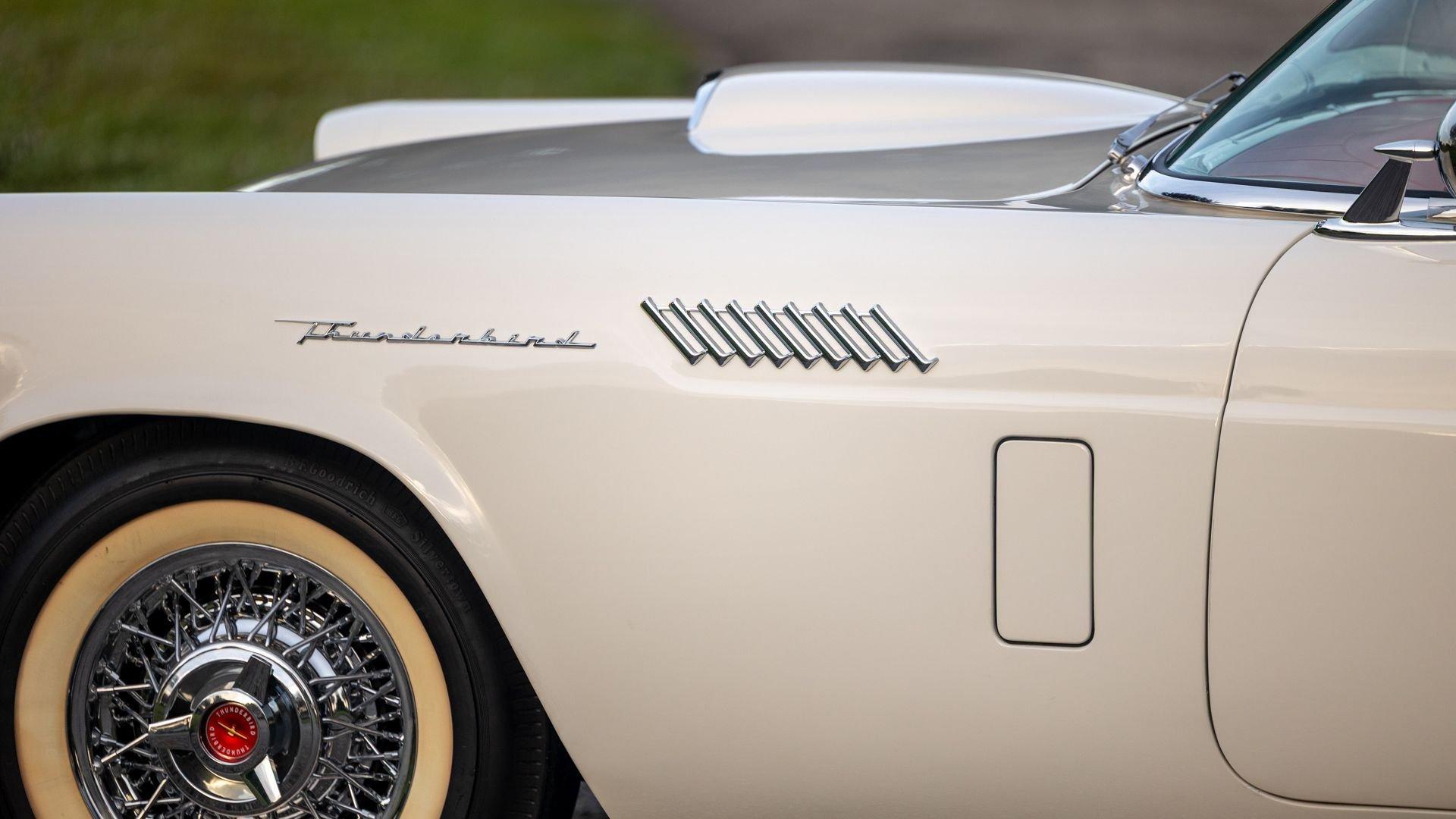 Chassis No. D7FH229336 For 1956, changes to the popular Thunderbird were subtle but significant—distinctive porthole windows were added to the removable hardtop, and the electrics moved from a 6-volt to a 12-volt system. After just three years of the original two-seat design, Ford would reshape the Thunderbird into a larger four-seater for 1958. Despite its brief production run, the early "Baby Bird" vastly outsold the Corvette, and the Thunderbird model would continue to be a popular collectible in the decades since. This 1957 Baby Bird was completed on the 25th of February 1957 at the Dearborn, Michigan plant and dispatched to the New York area for sale. Extensively equipped from the factory, it features the “D-Code” 312 cu-in V8 producing 245 horsepower, a Fordomatic automatic transmission, Master-Glide power steering, Swift Sure power brakes, Power-Lift Windows, a four-way power front bench seat, back-up lights, and engine dress-up kit, along with both the hard and soft convertible tops. The car was the subject of a nut-and-bolt, rotisserie restoration in its original factory livery of Corinthian White over Pleated Flame (red) vinyl upholstery, paired with a matching body-color hard top and a black canvas soft top. The restoration also included the tasteful addition of VintageAir air conditioning and an upgraded AM/FM vintage radio for modern touring comfort. Throughout, the car presents beautifully with no detail overlooked, displaying tidy brightwork and chrome Kesley Hayes-style wire wheels with spinner hubcaps, a vibrant interior, and a spotless engine compartment complete with the chrome engine dress-up kit. With the odometer showing a scant 92 miles traveled since its restoration, this Thunderbird is poised to be a standout on the concours field, a favorite at local cruises, or a cherished centerpiece in a collection focused on the most iconic designs to emerge from the American Jet Age.