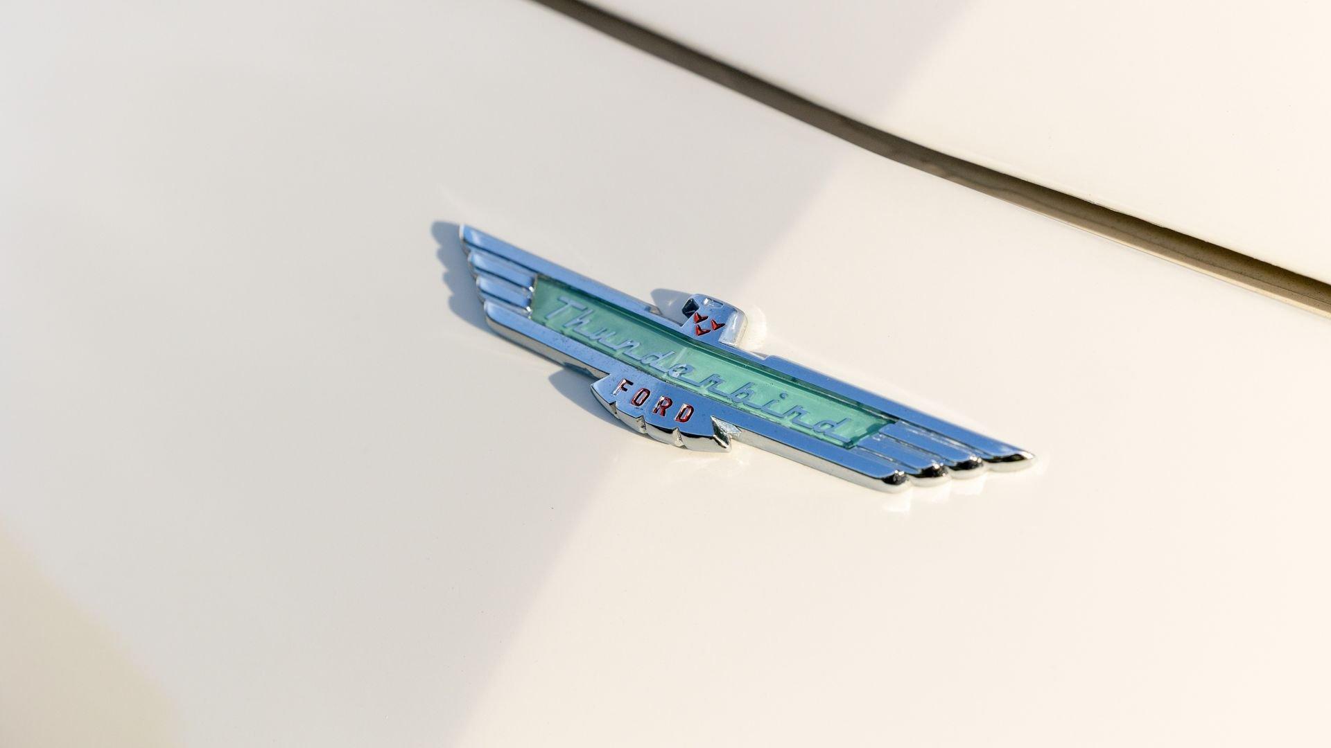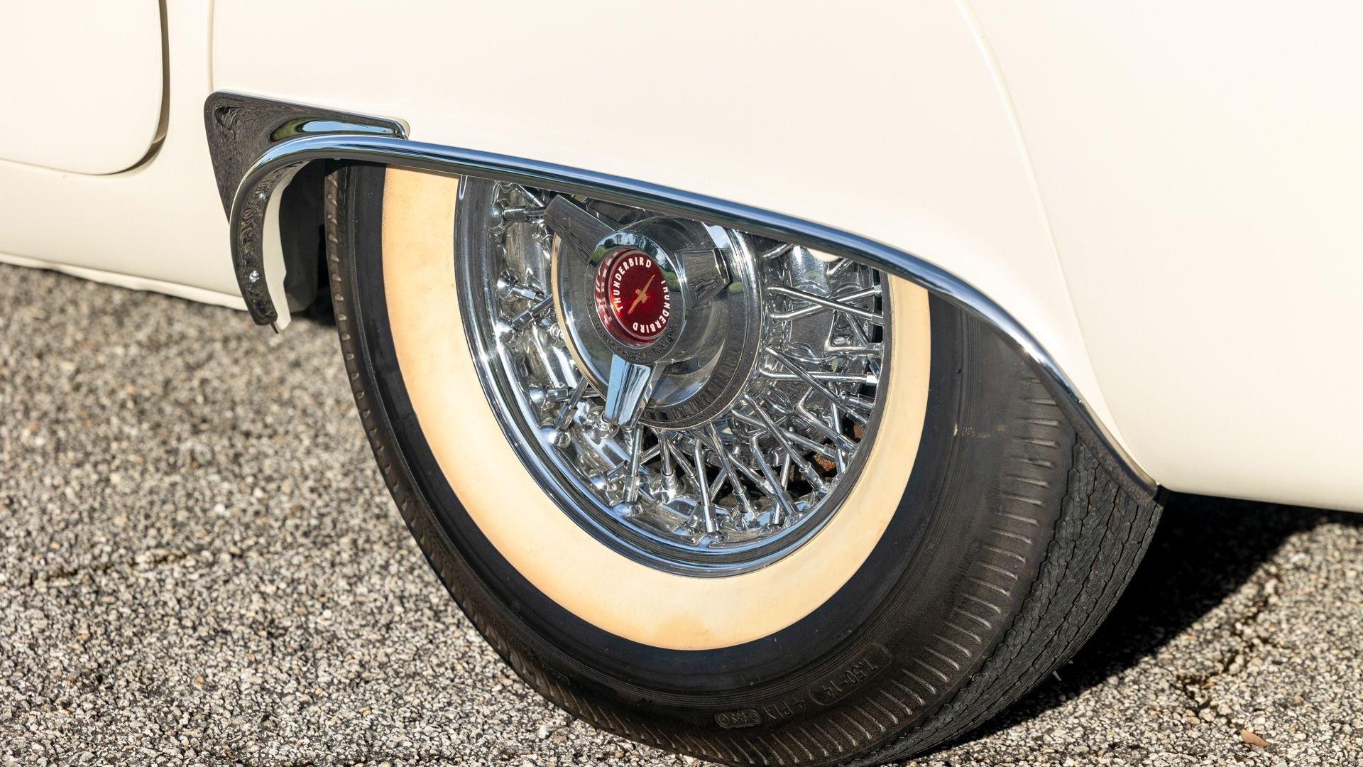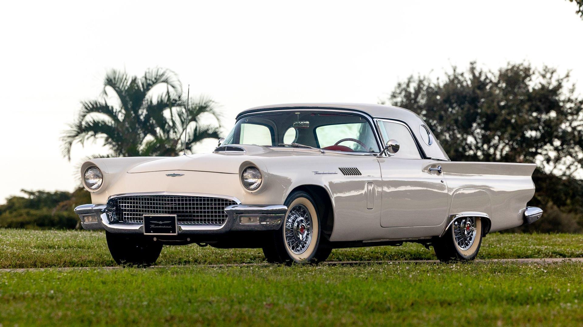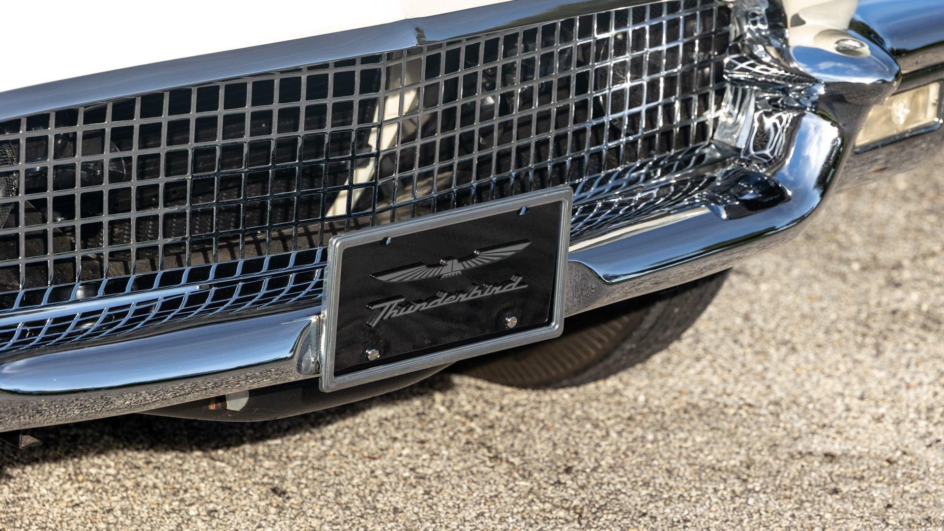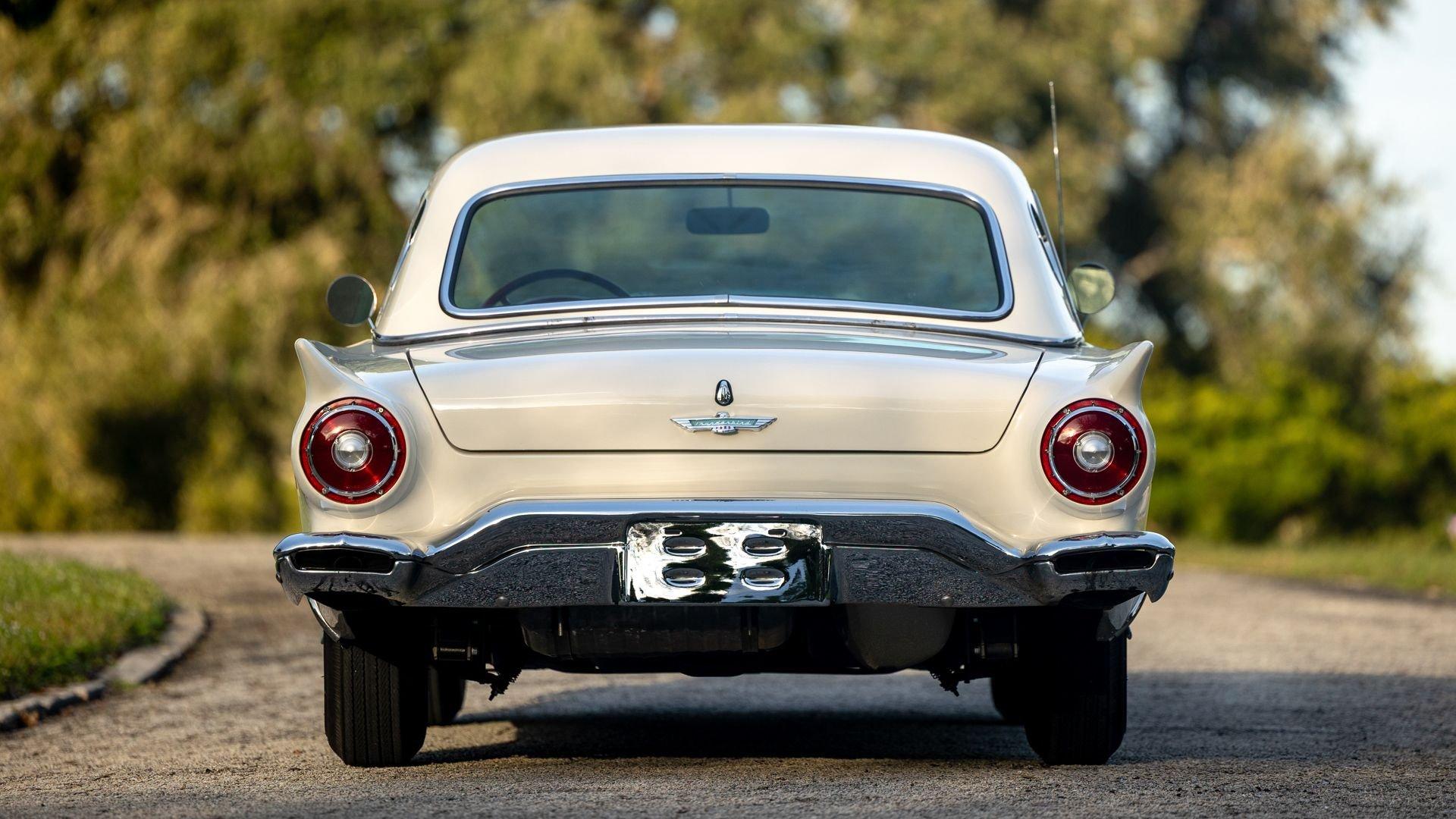 Chassis No. D7FH229336 For 1956, changes to the popular Thunderbird were subtle but significant—distinctive porthole windows were added to the removable hardtop, and the electrics moved from a 6-volt to a 12-volt system. After just three years of the original two-seat design, Ford would reshape the Thunderbird into a larger four-seater for 1958. Despite its brief production run, the early "Baby Bird" vastly outsold the Corvette, and the Thunderbird model would continue to be a popular collectible in the decades since. This 1957 Baby Bird was completed on the 25th of February 1957 at the Dearborn, Michigan plant and dispatched to the New York area for sale. Extensively equipped from the factory, it features the “D-Code” 312 cu-in V8 producing 245 horsepower, a Fordomatic automatic transmission, Master-Glide power steering, Swift Sure power brakes, Power-Lift Windows, a four-way power front bench seat, back-up lights, and engine dress-up kit, along with both the hard and soft convertible tops. The car was the subject of a nut-and-bolt, rotisserie restoration in its original factory livery of Corinthian White over Pleated Flame (red) vinyl upholstery, paired with a matching body-color hard top and a black canvas soft top. The restoration also included the tasteful addition of VintageAir air conditioning and an upgraded AM/FM vintage radio for modern touring comfort. Throughout, the car presents beautifully with no detail overlooked, displaying tidy brightwork and chrome Kesley Hayes-style wire wheels with spinner hubcaps, a vibrant interior, and a spotless engine compartment complete with the chrome engine dress-up kit. With the odometer showing a scant 92 miles traveled since its restoration, this Thunderbird is poised to be a standout on the concours field, a favorite at local cruises, or a cherished centerpiece in a collection focused on the most iconic designs to emerge from the American Jet Age.