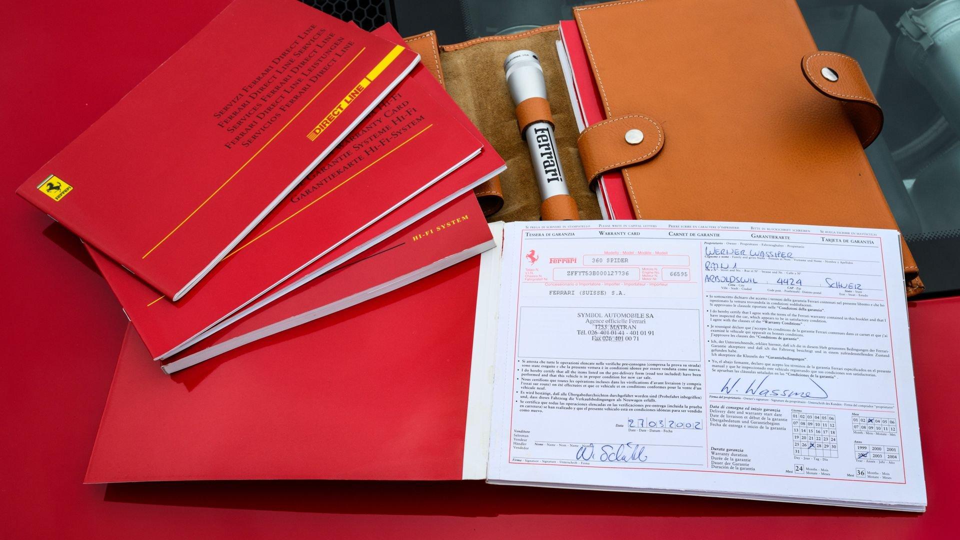Chassis No. ZFFYT53B000127736 Unveiled a year after the 360 Modena in 2000, the Ferrari 360 Spider earned immediate acclaim from the motoring press for its remarkably minimal compromises compared to its Modena berlinetta sibling. Adding just 120 pounds while sacrificing a mere 5 km/h of top speed, the Spider retained the full 400-CV output of the 3.6-liter V8, with the considerable benefit of experiencing the shrieking exhaust note from an open cockpit. Completed in March 2002 as a left-hand drive, European-market example, this 360 Spider is finished in timeless Rosso Corsa over Charcoal leather with a Nero soft top, and it is crucially equipped with the desirable six-speed gated manual transmission. The original service and warranty booklet documents delivery through Symbol Automobile SA of Matran, Switzerland, on 27 March 2002 to its first owner, Walter Wassmer of Arboldswil. Service stamps show the car returning to the selling dealer for scheduled maintenance, including its 10,000-km service at 11,144 kilometers in 2005 and its 30,000-km service at 28,727 kilometers in 2011. Later stamps and invoices reflect continued Swiss care, including servicing at Sportgarage Leirer in 2015 and significant work in 2019, highlighted by a major timing-belt service and a new alternator at approximately 62,000 kilometers. Remarkably, the 360 remained with its original owner until 2019, passing next to another Swiss Ferrari collector before joining the current, third caretaker in 2023. Under current ownership, Garage 1947 Classics has overseen regular annual servicing and ongoing sorting. In 2023 at 69,280 kilometers, work included timing-belts replacement, new front brake discs and pads, and new tires, followed by an annual service in 2024 at 74,355 kilometers. A more extensive visit in 2025 addressed key items including replacement of the oil cooler, repair and recharge of an air-conditioning system, rectification of the common “sticky buttons” issue, replacement of a gearbox mount, among other smaller items. The current owner reports the Spider has been enjoyed on weekends in France, Italy, and Monaco, never raced, and never driven in winter—performing flawlessly on tour and delivering the kind of rewarding, open-gated Ferrari experience that defines the model. Showing 83,905 km at the time of cataloging, this well-maintained example with its desirable gated six-speed manual is now ready to deliver the same rewarding, open-air Ferrari experience to its next caretaker. PREVIEW DETAILS: Please contact a Broad Arrow specialist to arrange a viewing in person prior to the auction. SALE LOCATION: Switzerland BUYER’S PREMIUM: 10% + VAT on the Hammer Price TITLE/REGISTRATION DOCUMENTS: Swiss Carte Grise ADDITIONAL NOTES: N/A POST-AUCTION REMOVAL AND STORAGE: Following receipt of payment, collection can be arranged by appointment only from Thörishaus, Switzerland with 24 hours' notice. Storage charges of CHF 30.00 + VAT per lot per day will apply from Saturday, 31st January 2026.