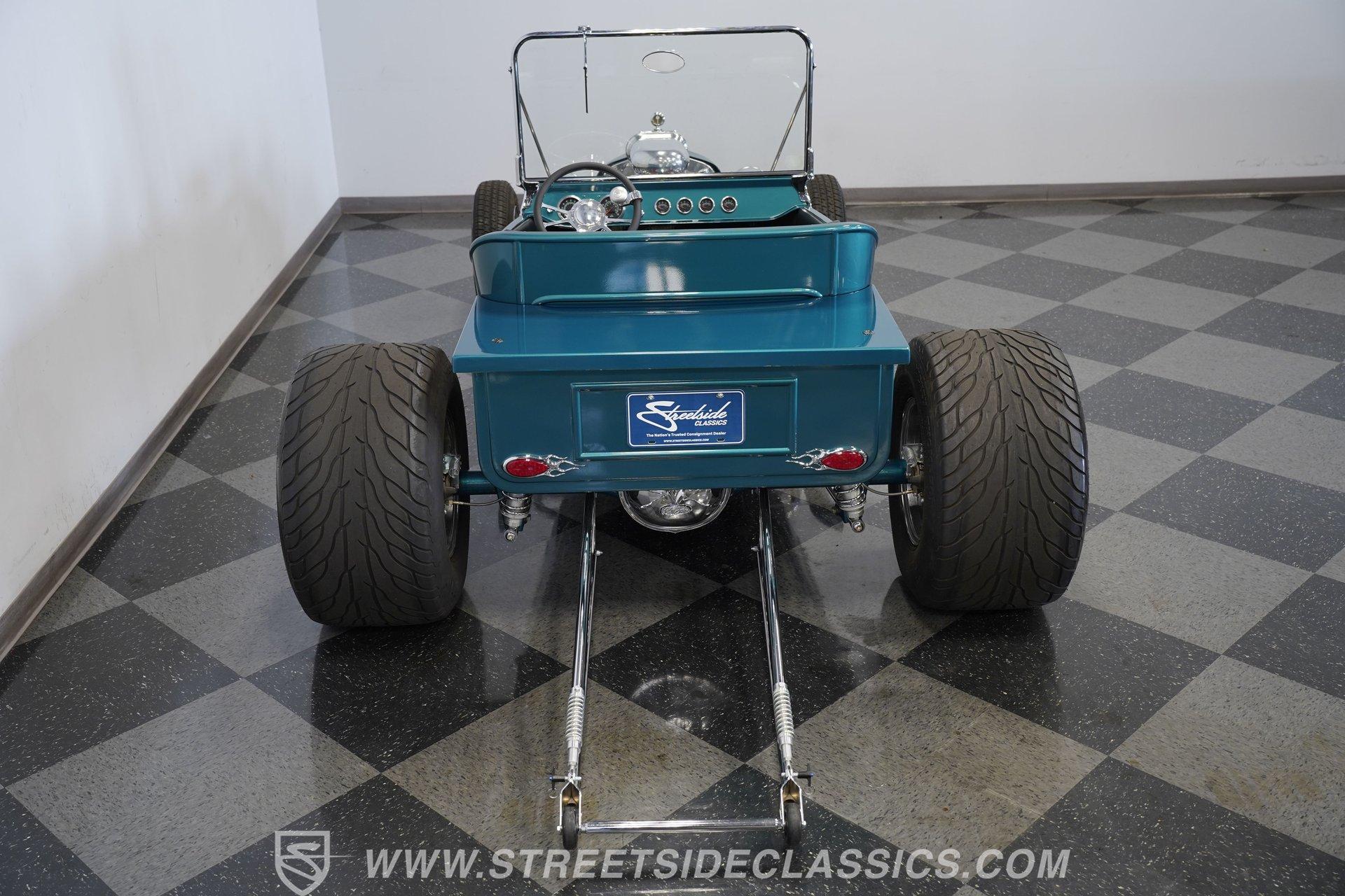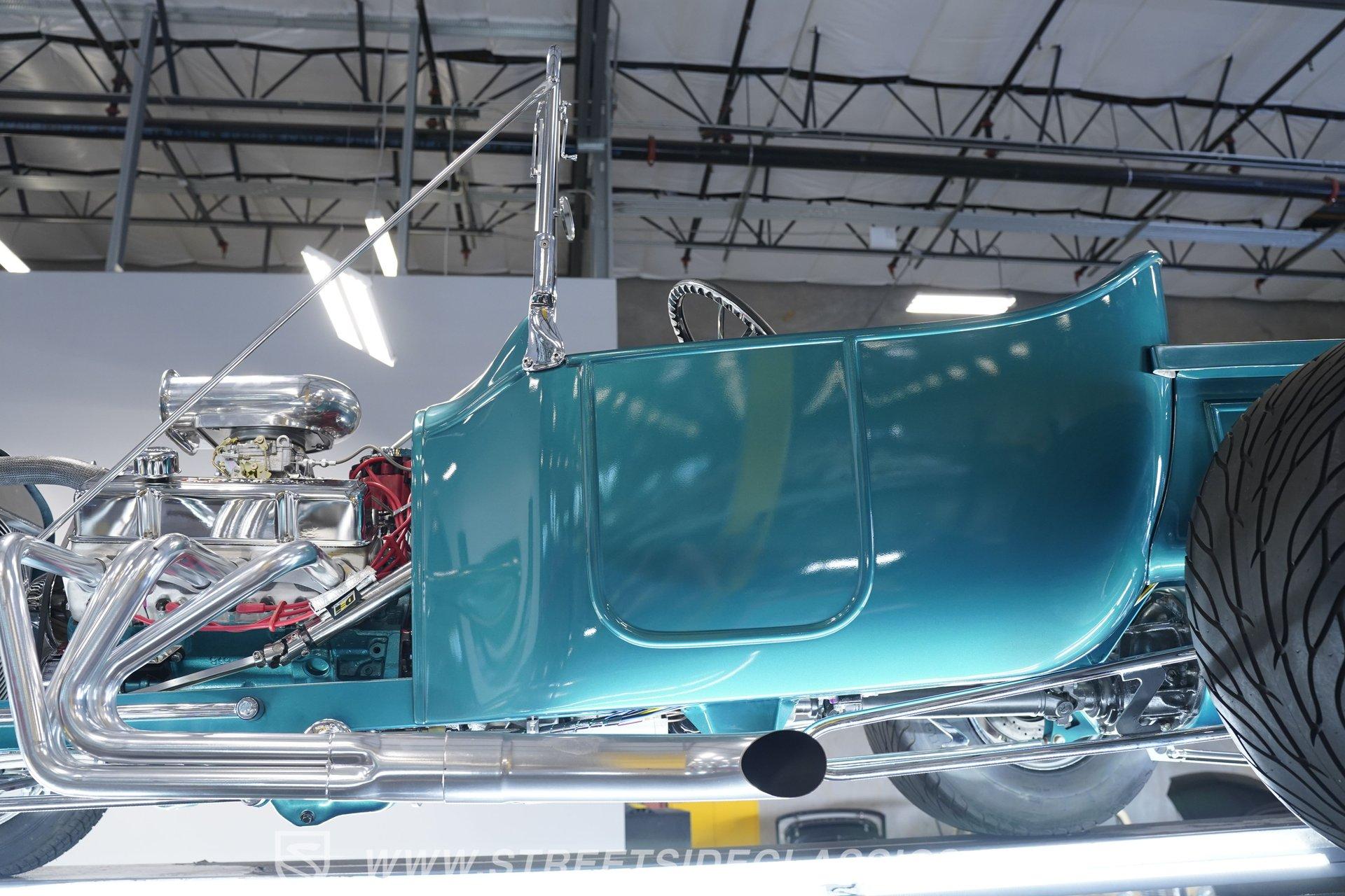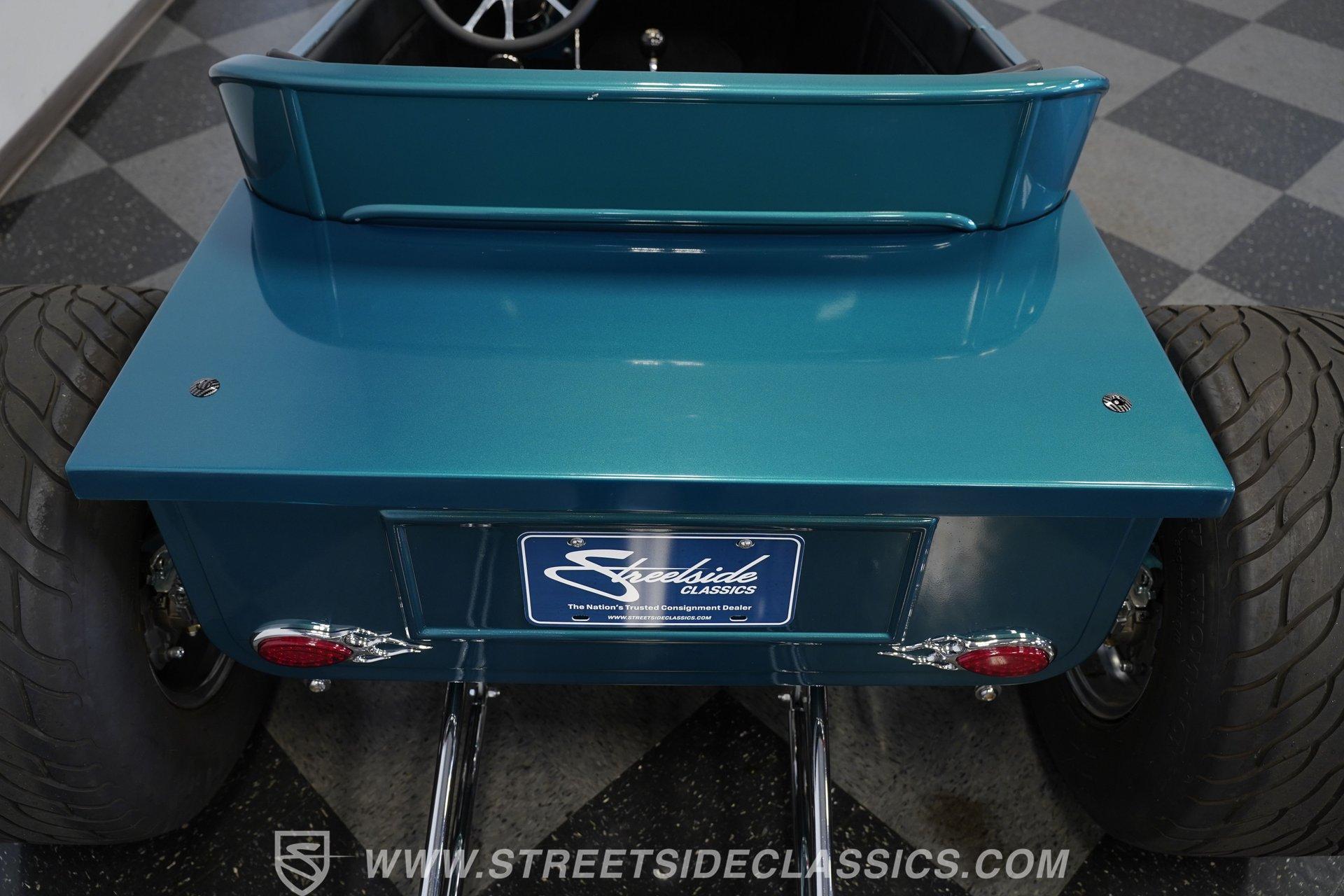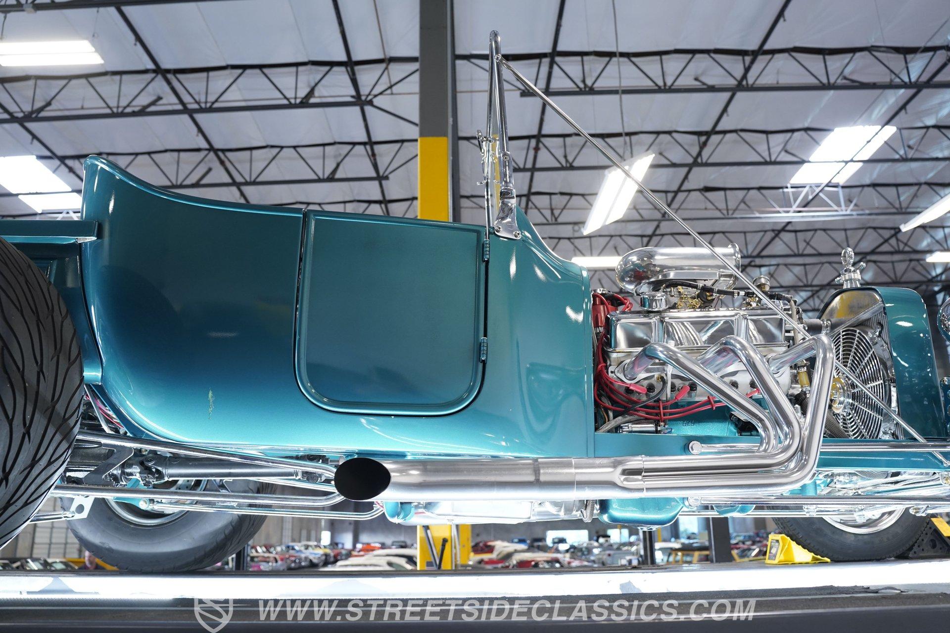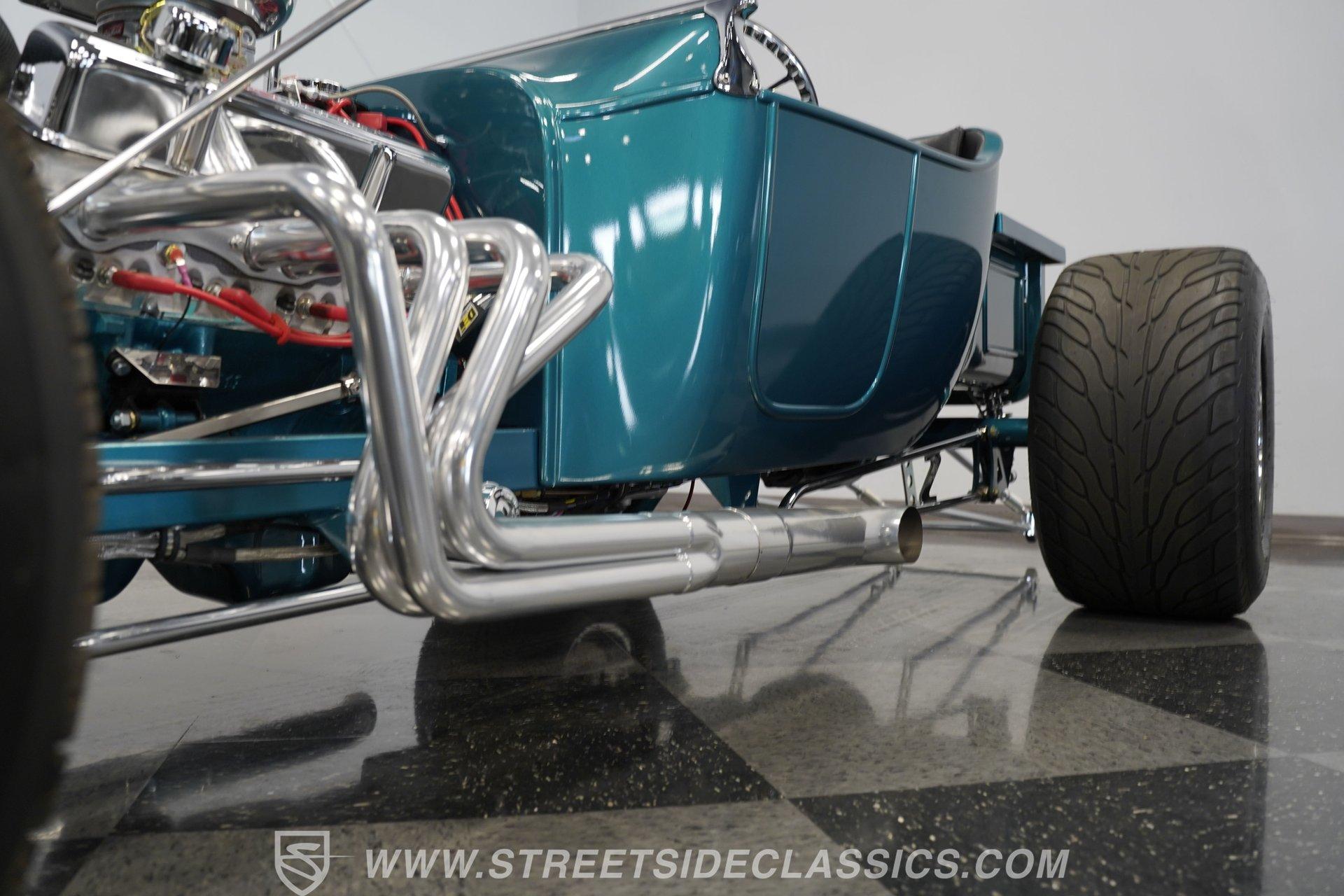 One look at this classic 1923 Ford T-Bucket and it's easy to see why these cars have been beloved and lusted after by millions of enthusiasts over the last century. This fully repainted Teal Blue roadster sports a unique one-piece windshield and single passenger-side door. And with just 32 miles on its odometer since it was built, there is plenty of life left in this throwback hot rod for its next very lucky owner to enjoy. Hop inside this hot rod (literally), and you're treated to a simple black vinyl interior featuring a large single bench seat to hold both driver and passenger in place. A small, padded, tilt steering wheel sits ahead of a big 10,000-rpm tachometer and matching 160 mph speedometer, while a quartet of auxiliary gauges takes up the rest of the body-colored dashboard. There is no radio of any kind, but fire this baby up, and we can all but promise you won't miss any other kind of music except that coming from the baffled straight pipes. Typically, we'd say "under the hood", but in this case, no hood exists and is not needed. So, up front, we find a 350 cubic-inch V-8 engine. Outfitted with an Edelbrock four barrel carburetor feeding into a high-rise Edelbrock intake manifold, this small block sports a sweet-sounding cam and lightweight Promax aluminum heads. Spent gases are sent a very short distance through a pair of long tube headers, and out of those glorious sidepipes. Power is routed through a TH350 three-speed automatic transmission before being sent to the nine-inch rear end. HIGHLIGHTS: 32 Miles Since Built One Piece Windshield Passenger Side Door Full Teal Repaint 350ci V8 Promax Aluminum Heads Performance Cam Edelbrock Four Barrel Edelbrock Hi Rise Intake Long Tubes Sidepipes Electric Cooling Fan Nine Inch Rear Solid Axle Front Ladder Bar Rear Coilovers Speedway Chassis Four Wheel Disc Brakes Black Vinyl Interior Seatbelts This 1923 Ford T-Bucket rides on a Speedway chassis featuring solid-axle front-end suspension, while the rear consists of a ladder-bar setup with coilovers. Front and rear disc brakes are in place to rein in speed when needed, so you can simply enjoy the ride. A classic hot rod like this T-Bucket needs to be experienced to truly appreciate its old-school soul, and hopefully, with a few words and some incredible photos, you may realize this is the car you've been searching for. But don't wait, this one won't be around long. Call today!