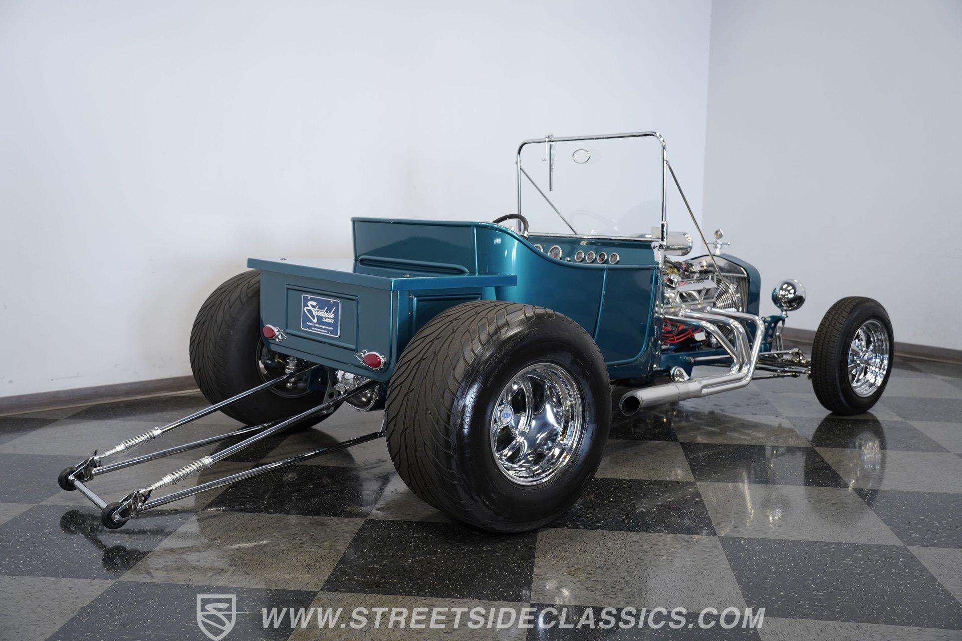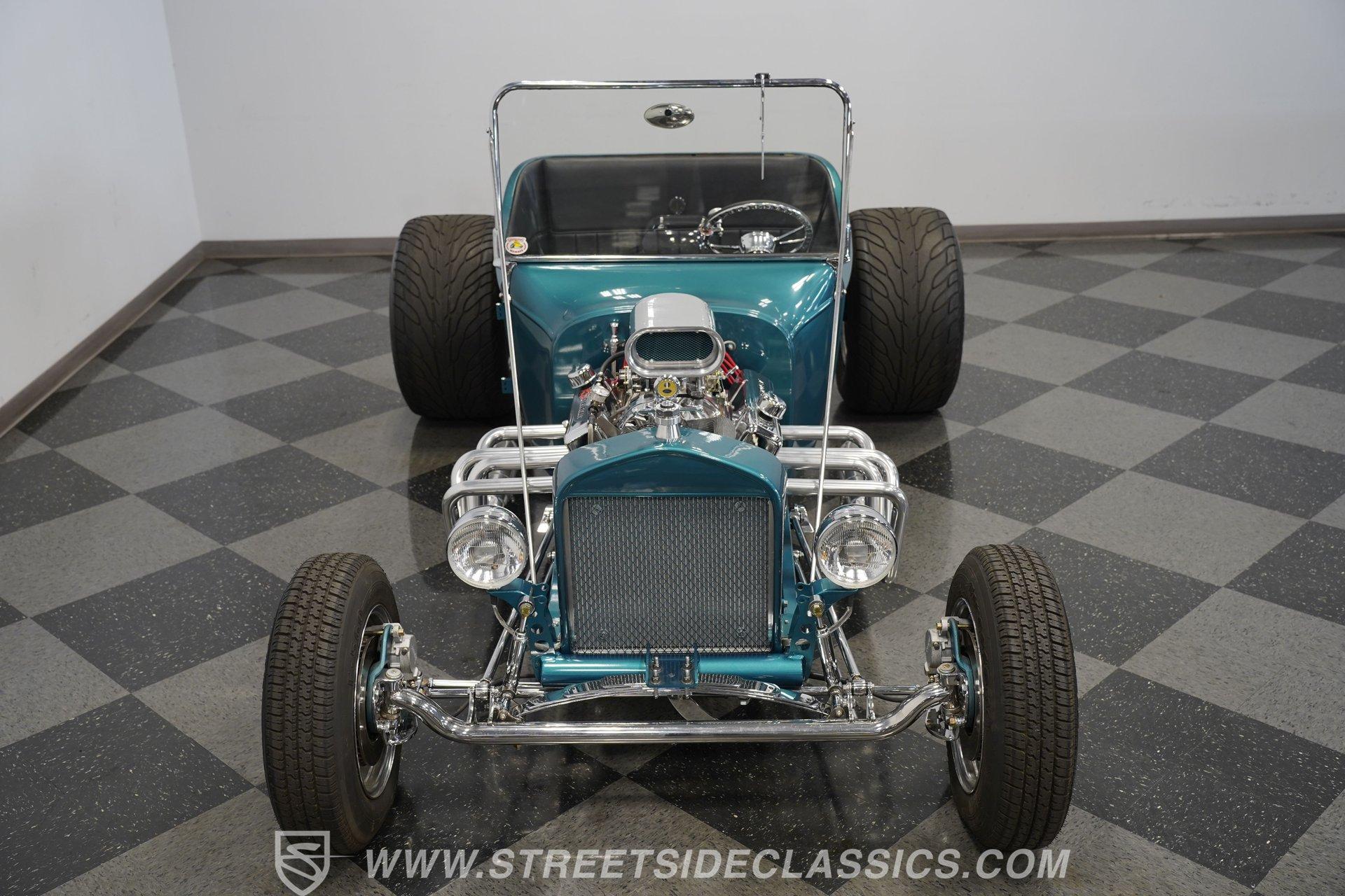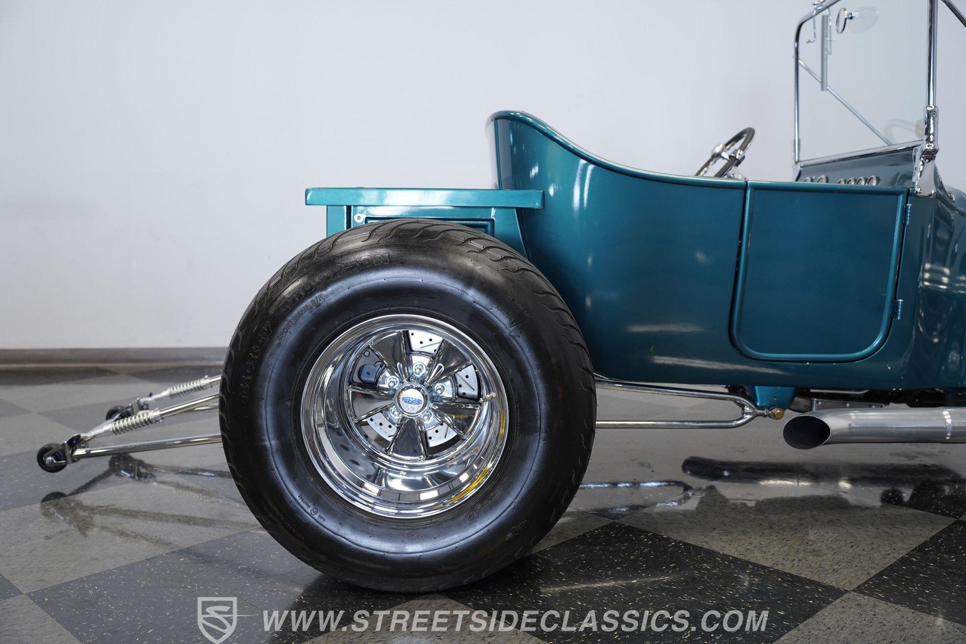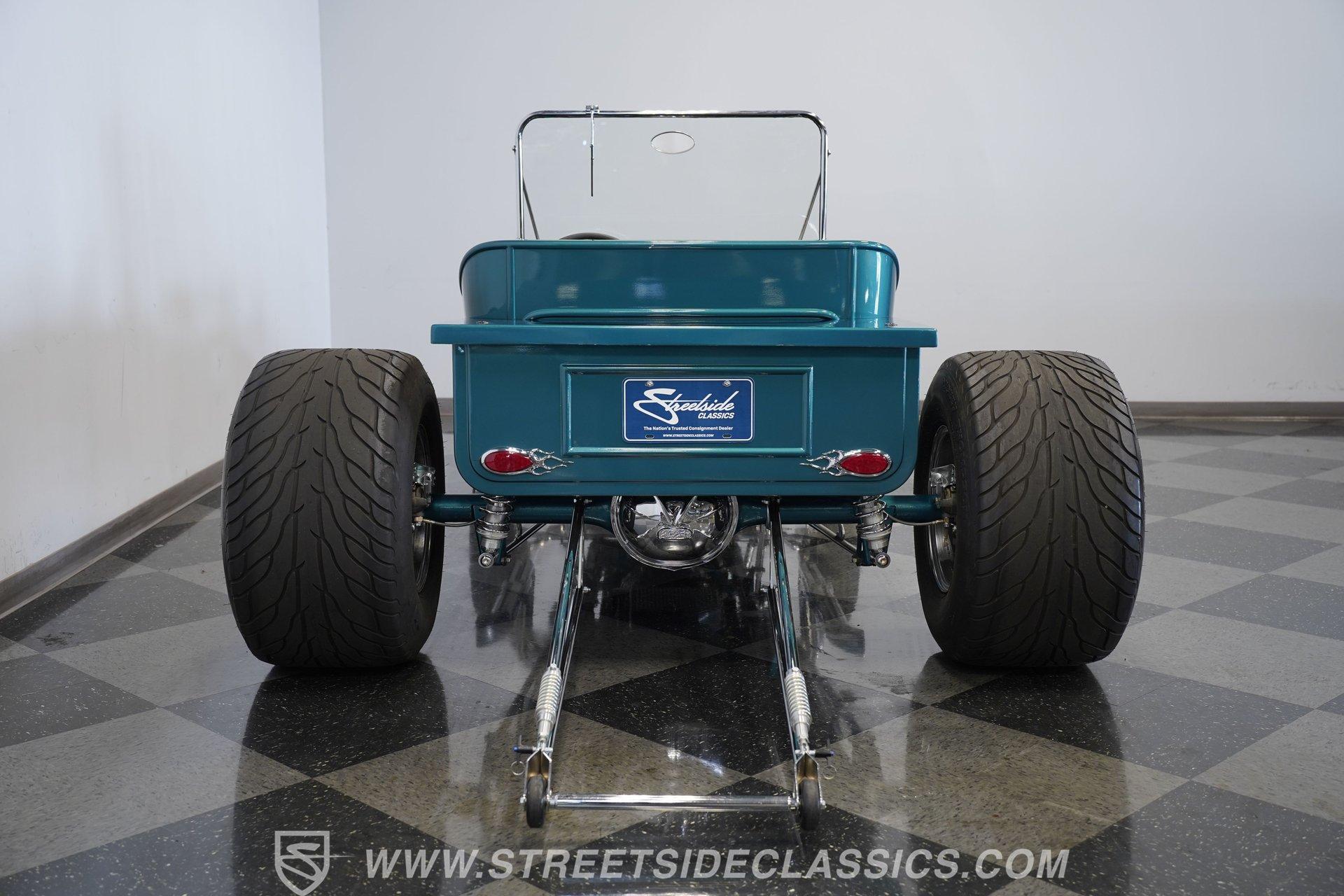 One look at this classic 1923 Ford T-Bucket and it's easy to see why these cars have been beloved and lusted after by millions of enthusiasts over the last century. This fully repainted Teal Blue roadster sports a unique one-piece windshield and single passenger-side door. And with just 32 miles on its odometer since it was built, there is plenty of life left in this throwback hot rod for its next very lucky owner to enjoy. Hop inside this hot rod (literally), and you're treated to a simple black vinyl interior featuring a large single bench seat to hold both driver and passenger in place. A small, padded, tilt steering wheel sits ahead of a big 10,000-rpm tachometer and matching 160 mph speedometer, while a quartet of auxiliary gauges takes up the rest of the body-colored dashboard. There is no radio of any kind, but fire this baby up, and we can all but promise you won't miss any other kind of music except that coming from the baffled straight pipes. Typically, we'd say "under the hood", but in this case, no hood exists and is not needed. So, up front, we find a 350 cubic-inch V-8 engine. Outfitted with an Edelbrock four barrel carburetor feeding into a high-rise Edelbrock intake manifold, this small block sports a sweet-sounding cam and lightweight Promax aluminum heads. Spent gases are sent a very short distance through a pair of long tube headers, and out of those glorious sidepipes. Power is routed through a TH350 three-speed automatic transmission before being sent to the nine-inch rear end. HIGHLIGHTS: 32 Miles Since Built One Piece Windshield Passenger Side Door Full Teal Repaint 350ci V8 Promax Aluminum Heads Performance Cam Edelbrock Four Barrel Edelbrock Hi Rise Intake Long Tubes Sidepipes Electric Cooling Fan Nine Inch Rear Solid Axle Front Ladder Bar Rear Coilovers Speedway Chassis Four Wheel Disc Brakes Black Vinyl Interior Seatbelts This 1923 Ford T-Bucket rides on a Speedway chassis featuring solid-axle front-end suspension, while the rear consists of a ladder-bar setup with coilovers. Front and rear disc brakes are in place to rein in speed when needed, so you can simply enjoy the ride. A classic hot rod like this T-Bucket needs to be experienced to truly appreciate its old-school soul, and hopefully, with a few words and some incredible photos, you may realize this is the car you've been searching for. But don't wait, this one won't be around long. Call today!