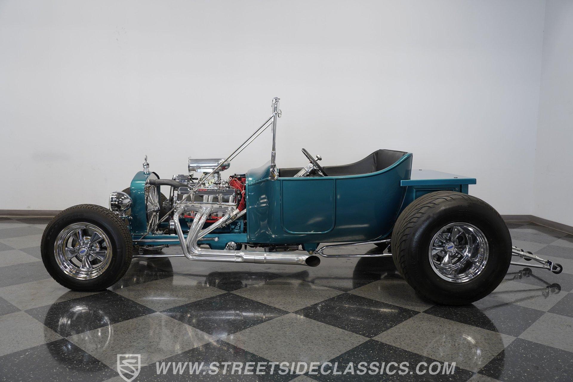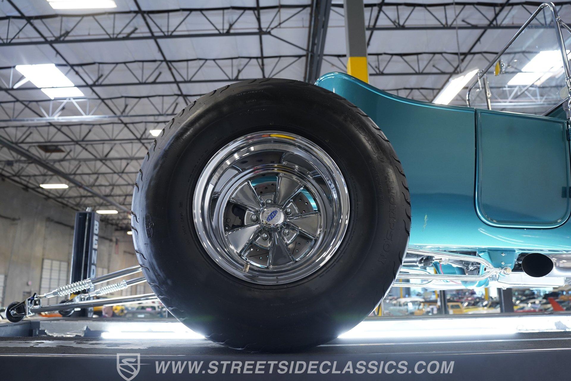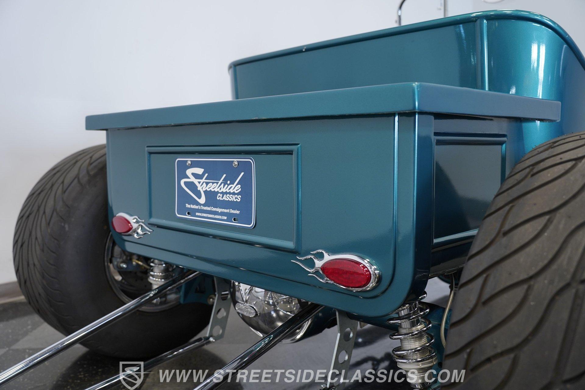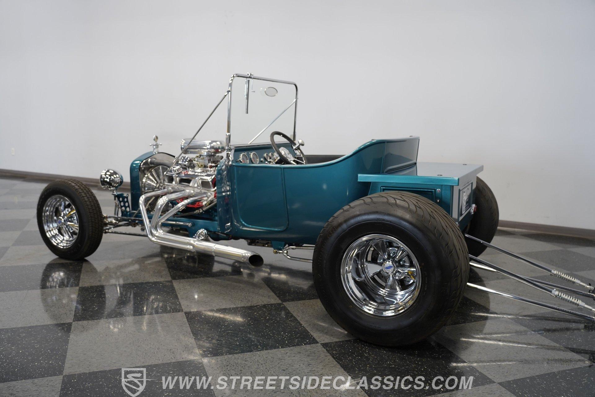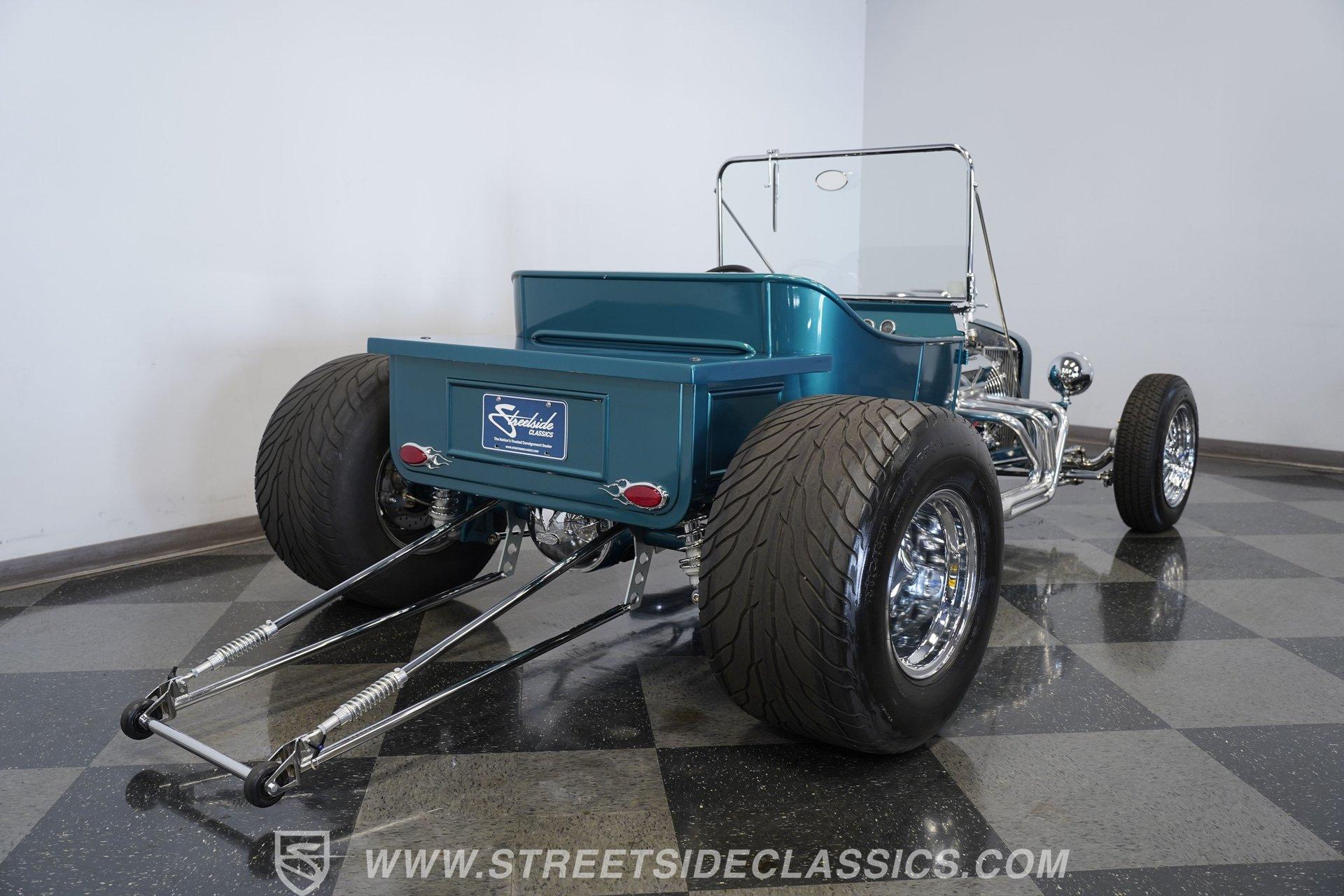 One look at this classic 1923 Ford T-Bucket and it's easy to see why these cars have been beloved and lusted after by millions of enthusiasts over the last century. This fully repainted Teal Blue roadster sports a unique one-piece windshield and single passenger-side door. And with just 32 miles on its odometer since it was built, there is plenty of life left in this throwback hot rod for its next very lucky owner to enjoy. Hop inside this hot rod (literally), and you're treated to a simple black vinyl interior featuring a large single bench seat to hold both driver and passenger in place. A small, padded, tilt steering wheel sits ahead of a big 10,000-rpm tachometer and matching 160 mph speedometer, while a quartet of auxiliary gauges takes up the rest of the body-colored dashboard. There is no radio of any kind, but fire this baby up, and we can all but promise you won't miss any other kind of music except that coming from the baffled straight pipes. Typically, we'd say "under the hood", but in this case, no hood exists and is not needed. So, up front, we find a 350 cubic-inch V-8 engine. Outfitted with an Edelbrock four barrel carburetor feeding into a high-rise Edelbrock intake manifold, this small block sports a sweet-sounding cam and lightweight Promax aluminum heads. Spent gases are sent a very short distance through a pair of long tube headers, and out of those glorious sidepipes. Power is routed through a TH350 three-speed automatic transmission before being sent to the nine-inch rear end. HIGHLIGHTS: 32 Miles Since Built One Piece Windshield Passenger Side Door Full Teal Repaint 350ci V8 Promax Aluminum Heads Performance Cam Edelbrock Four Barrel Edelbrock Hi Rise Intake Long Tubes Sidepipes Electric Cooling Fan Nine Inch Rear Solid Axle Front Ladder Bar Rear Coilovers Speedway Chassis Four Wheel Disc Brakes Black Vinyl Interior Seatbelts This 1923 Ford T-Bucket rides on a Speedway chassis featuring solid-axle front-end suspension, while the rear consists of a ladder-bar setup with coilovers. Front and rear disc brakes are in place to rein in speed when needed, so you can simply enjoy the ride. A classic hot rod like this T-Bucket needs to be experienced to truly appreciate its old-school soul, and hopefully, with a few words and some incredible photos, you may realize this is the car you've been searching for. But don't wait, this one won't be around long. Call today!