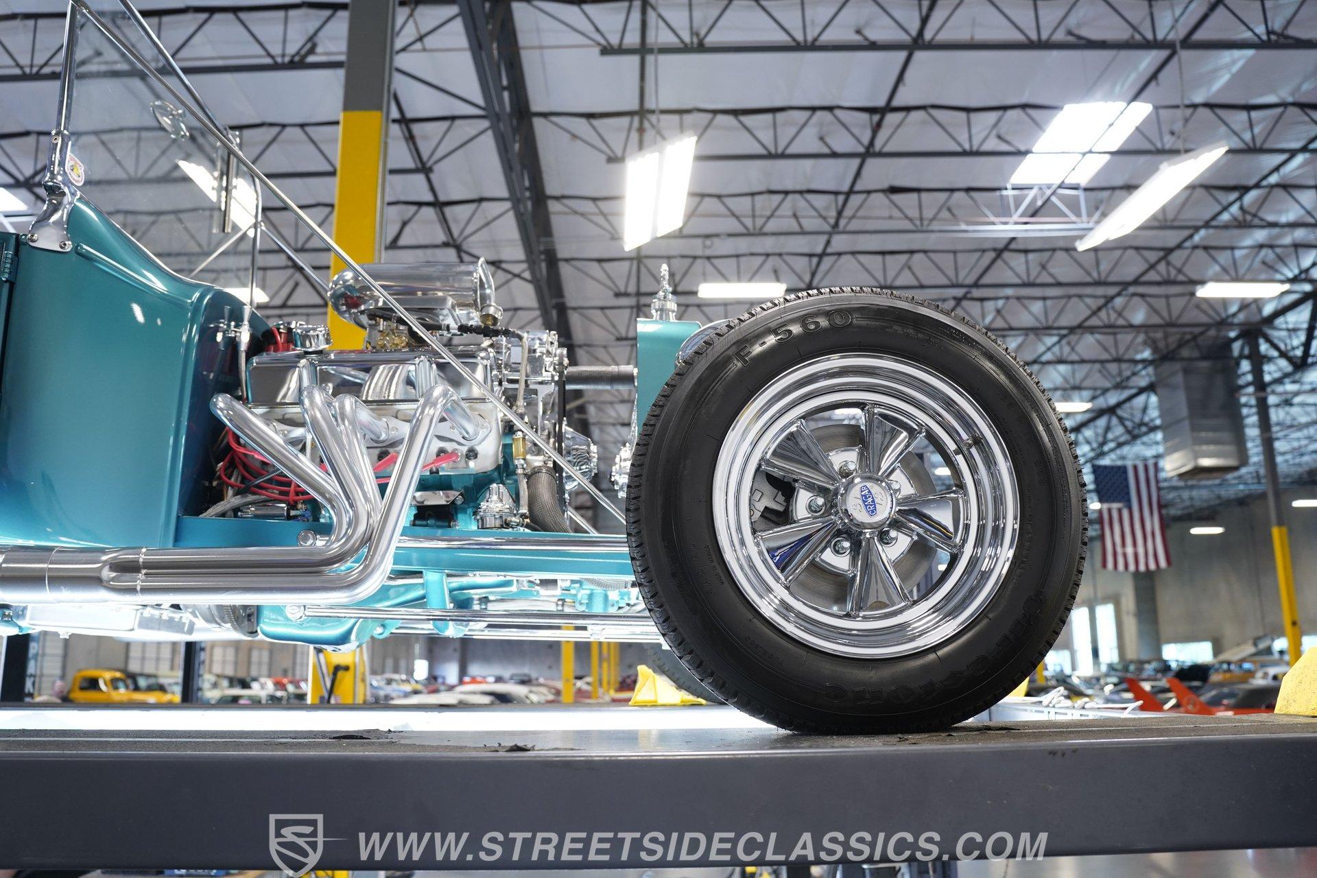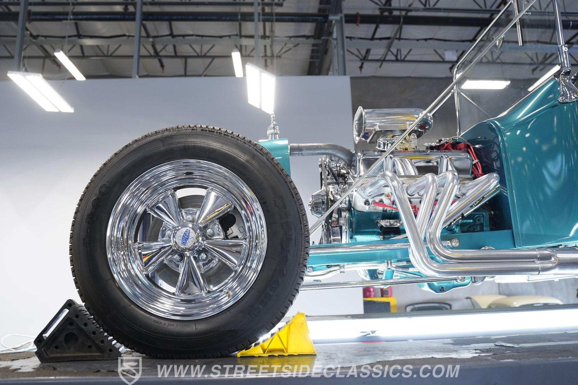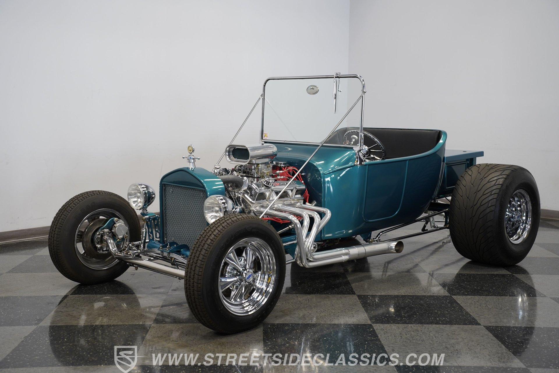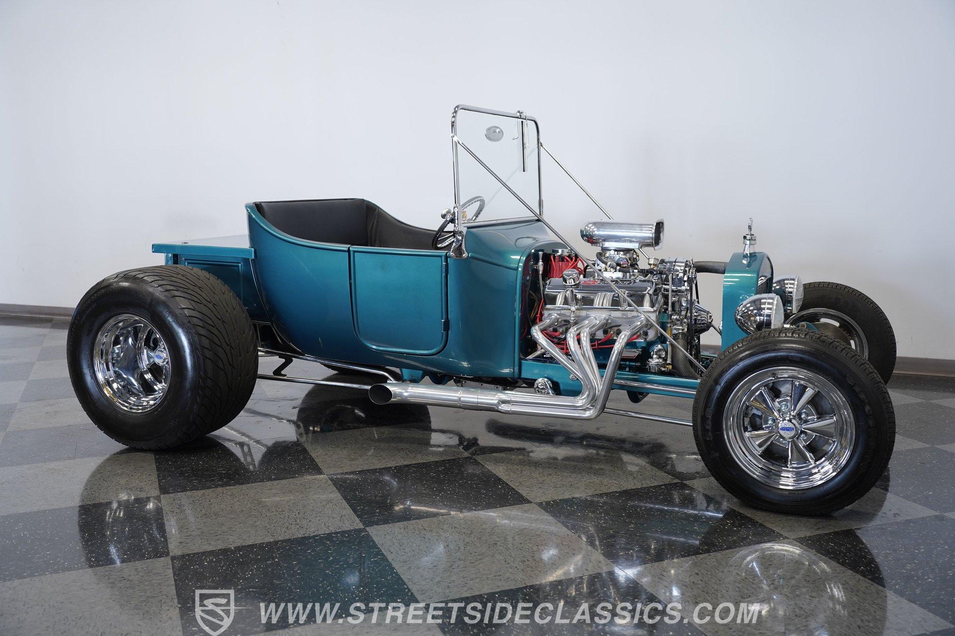One look at this classic 1923 Ford T-Bucket and it's easy to see why these cars have been beloved and lusted after by millions of enthusiasts over the last century. This fully repainted Teal Blue roadster sports a unique one-piece windshield and single passenger-side door. And with just 32 miles on its odometer since it was built, there is plenty of life left in this throwback hot rod for its next very lucky owner to enjoy. Hop inside this hot rod (literally), and you're treated to a simple black vinyl interior featuring a large single bench seat to hold both driver and passenger in place. A small, padded, tilt steering wheel sits ahead of a big 10,000-rpm tachometer and matching 160 mph speedometer, while a quartet of auxiliary gauges takes up the rest of the body-colored dashboard. There is no radio of any kind, but fire this baby up, and we can all but promise you won't miss any other kind of music except that coming from the baffled straight pipes. Typically, we'd say "under the hood", but in this case, no hood exists and is not needed. So, up front, we find a 350 cubic-inch V-8 engine. Outfitted with an Edelbrock four barrel carburetor feeding into a high-rise Edelbrock intake manifold, this small block sports a sweet-sounding cam and lightweight Promax aluminum heads. Spent gases are sent a very short distance through a pair of long tube headers, and out of those glorious sidepipes. Power is routed through a TH350 three-speed automatic transmission before being sent to the nine-inch rear end. HIGHLIGHTS: 32 Miles Since Built One Piece Windshield Passenger Side Door Full Teal Repaint 350ci V8 Promax Aluminum Heads Performance Cam Edelbrock Four Barrel Edelbrock Hi Rise Intake Long Tubes Sidepipes Electric Cooling Fan Nine Inch Rear Solid Axle Front Ladder Bar Rear Coilovers Speedway Chassis Four Wheel Disc Brakes Black Vinyl Interior Seatbelts This 1923 Ford T-Bucket rides on a Speedway chassis featuring solid-axle front-end suspension, while the rear consists of a ladder-bar setup with coilovers. Front and rear disc brakes are in place to rein in speed when needed, so you can simply enjoy the ride. A classic hot rod like this T-Bucket needs to be experienced to truly appreciate its old-school soul, and hopefully, with a few words and some incredible photos, you may realize this is the car you've been searching for. But don't wait, this one won't be around long. Call today!