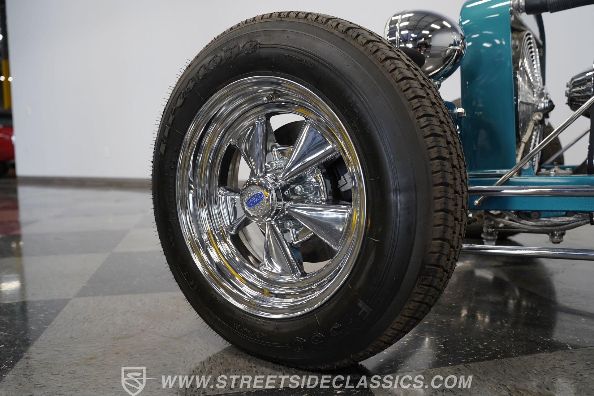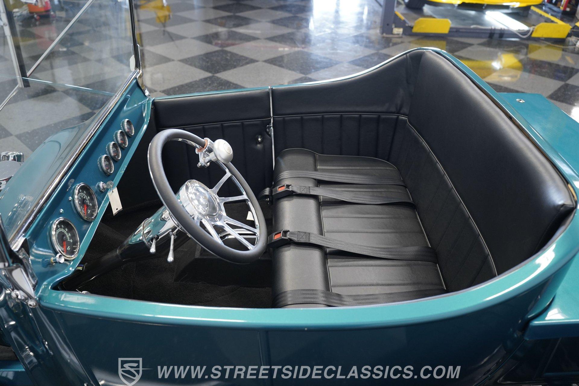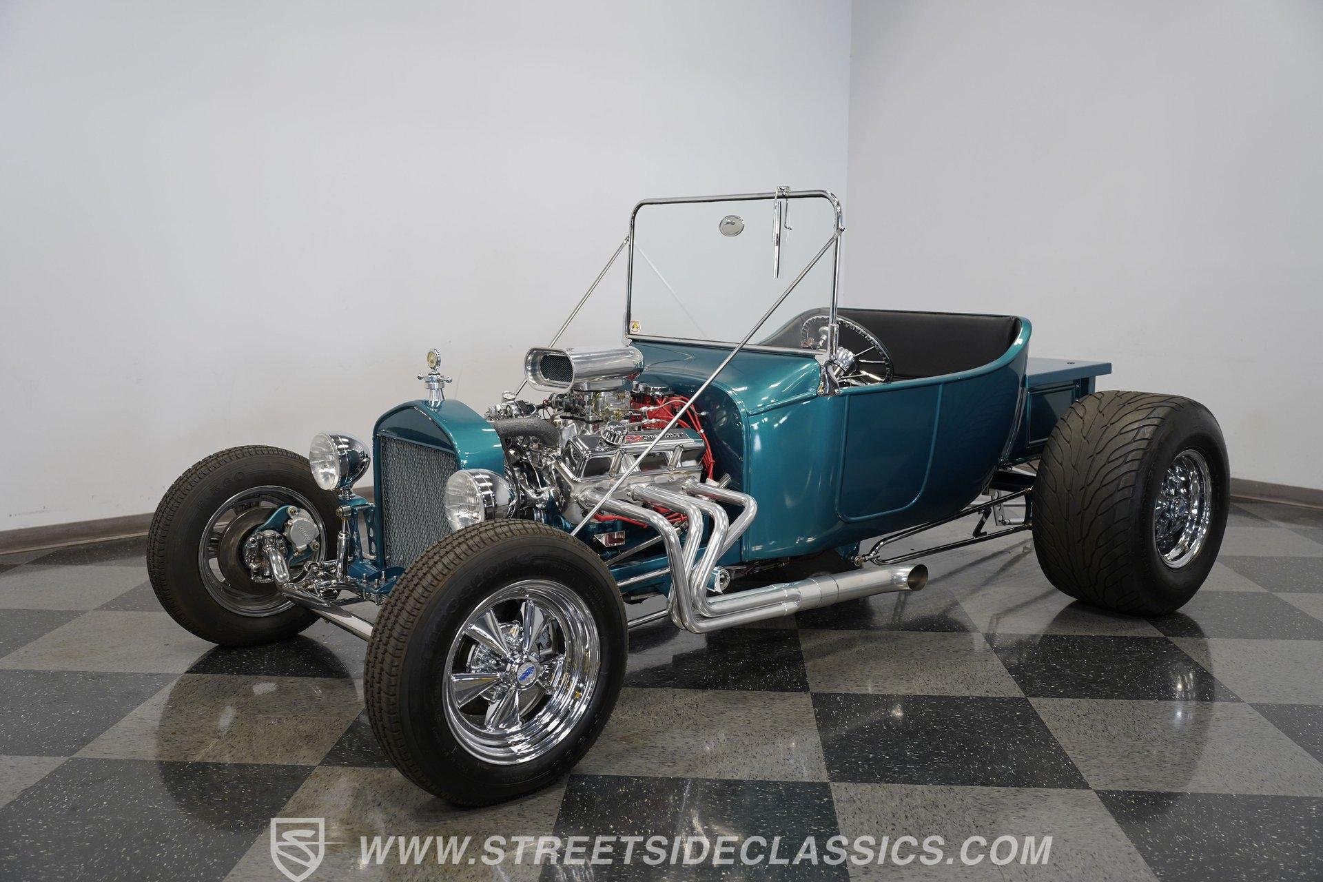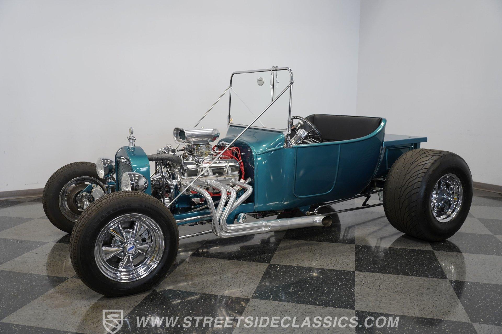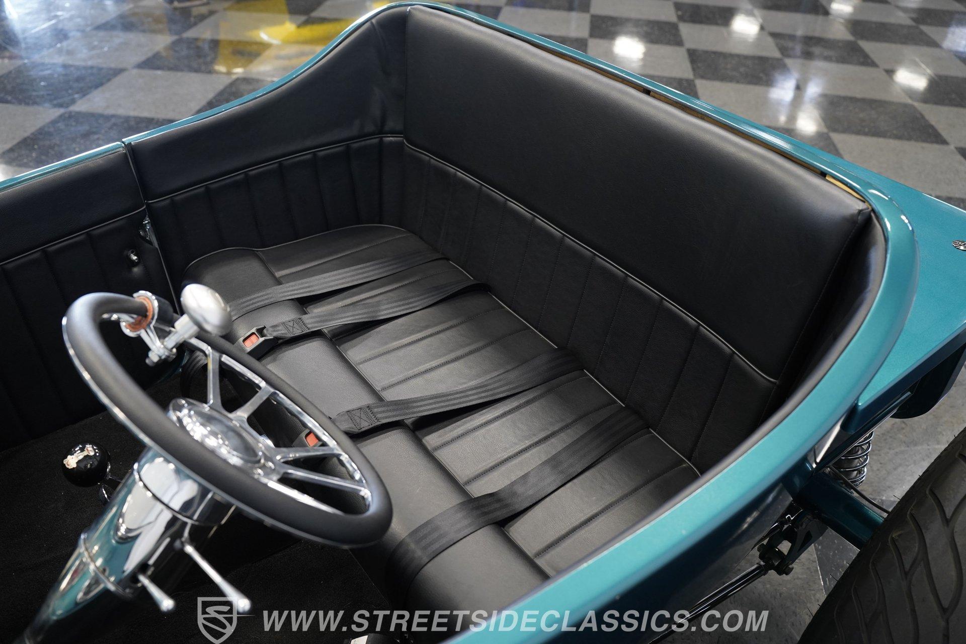 One look at this classic 1923 Ford T-Bucket and it's easy to see why these cars have been beloved and lusted after by millions of enthusiasts over the last century. This fully repainted Teal Blue roadster sports a unique one-piece windshield and single passenger-side door. And with just 32 miles on its odometer since it was built, there is plenty of life left in this throwback hot rod for its next very lucky owner to enjoy. Hop inside this hot rod (literally), and you're treated to a simple black vinyl interior featuring a large single bench seat to hold both driver and passenger in place. A small, padded, tilt steering wheel sits ahead of a big 10,000-rpm tachometer and matching 160 mph speedometer, while a quartet of auxiliary gauges takes up the rest of the body-colored dashboard. There is no radio of any kind, but fire this baby up, and we can all but promise you won't miss any other kind of music except that coming from the baffled straight pipes. Typically, we'd say "under the hood", but in this case, no hood exists and is not needed. So, up front, we find a 350 cubic-inch V-8 engine. Outfitted with an Edelbrock four barrel carburetor feeding into a high-rise Edelbrock intake manifold, this small block sports a sweet-sounding cam and lightweight Promax aluminum heads. Spent gases are sent a very short distance through a pair of long tube headers, and out of those glorious sidepipes. Power is routed through a TH350 three-speed automatic transmission before being sent to the nine-inch rear end. HIGHLIGHTS: 32 Miles Since Built One Piece Windshield Passenger Side Door Full Teal Repaint 350ci V8 Promax Aluminum Heads Performance Cam Edelbrock Four Barrel Edelbrock Hi Rise Intake Long Tubes Sidepipes Electric Cooling Fan Nine Inch Rear Solid Axle Front Ladder Bar Rear Coilovers Speedway Chassis Four Wheel Disc Brakes Black Vinyl Interior Seatbelts This 1923 Ford T-Bucket rides on a Speedway chassis featuring solid-axle front-end suspension, while the rear consists of a ladder-bar setup with coilovers. Front and rear disc brakes are in place to rein in speed when needed, so you can simply enjoy the ride. A classic hot rod like this T-Bucket needs to be experienced to truly appreciate its old-school soul, and hopefully, with a few words and some incredible photos, you may realize this is the car you've been searching for. But don't wait, this one won't be around long. Call today!