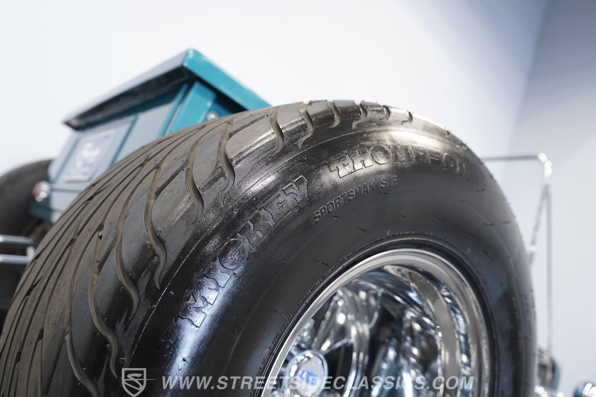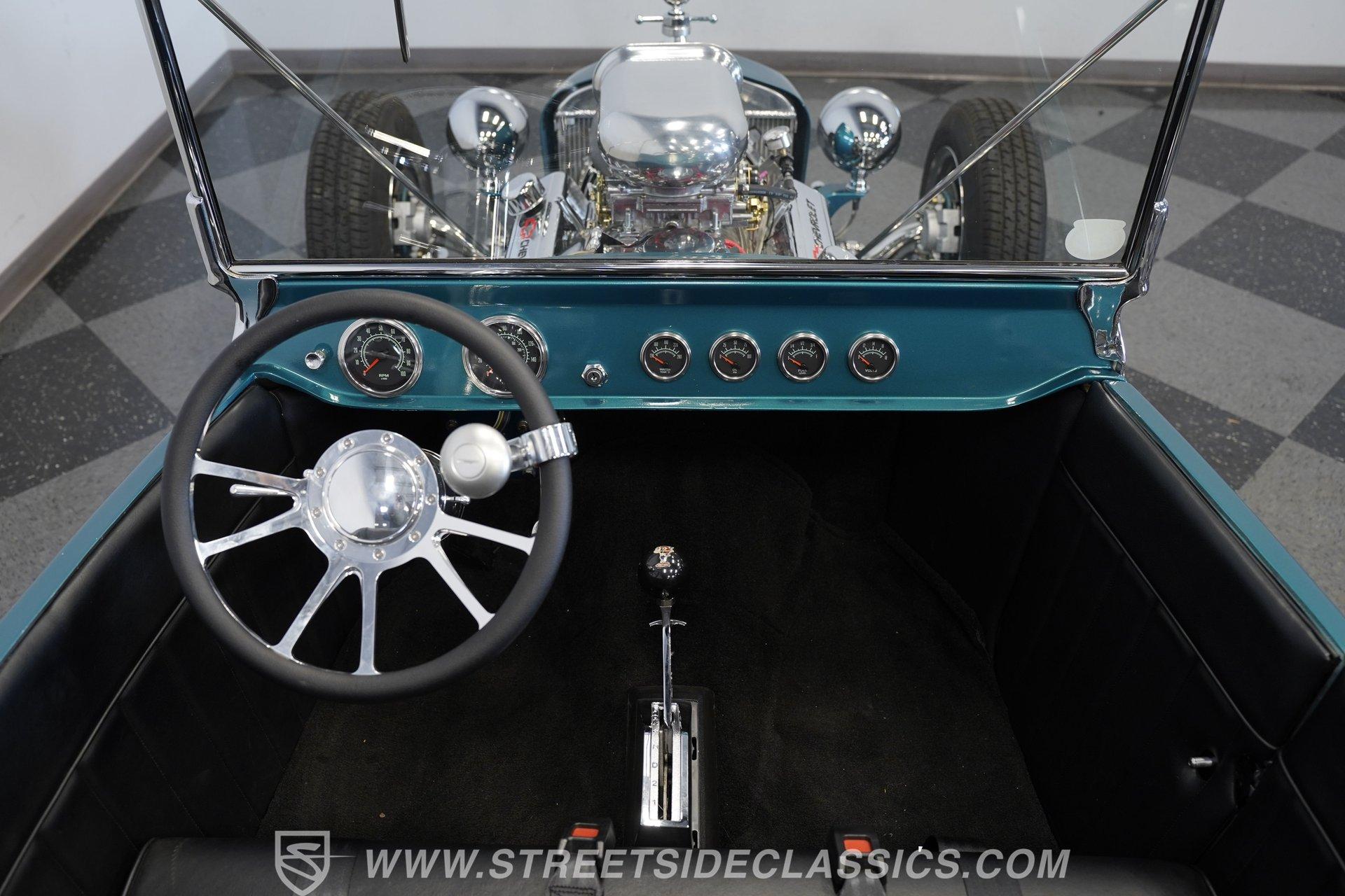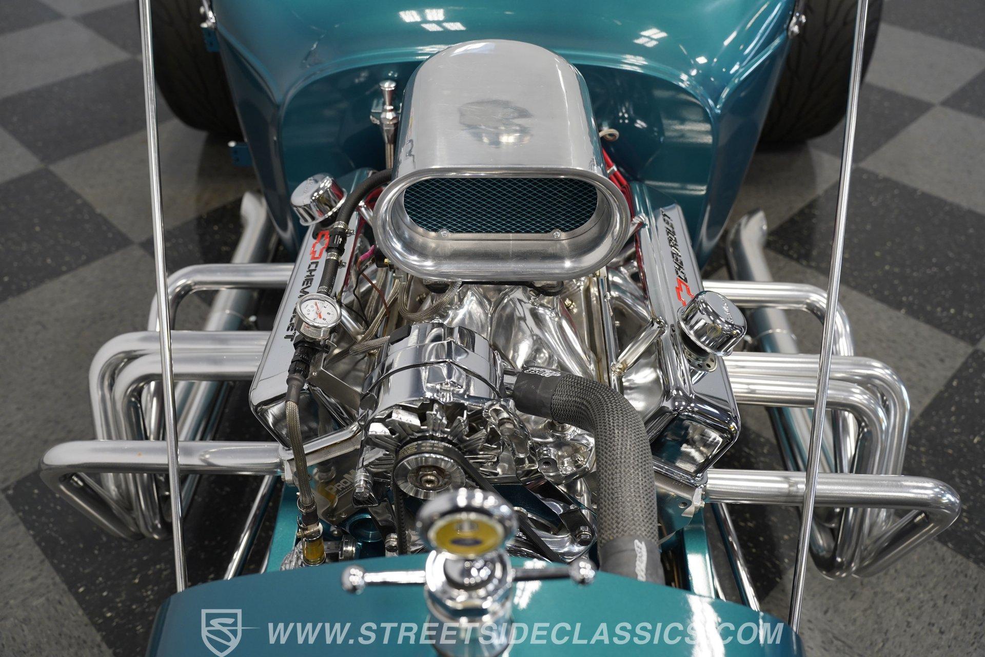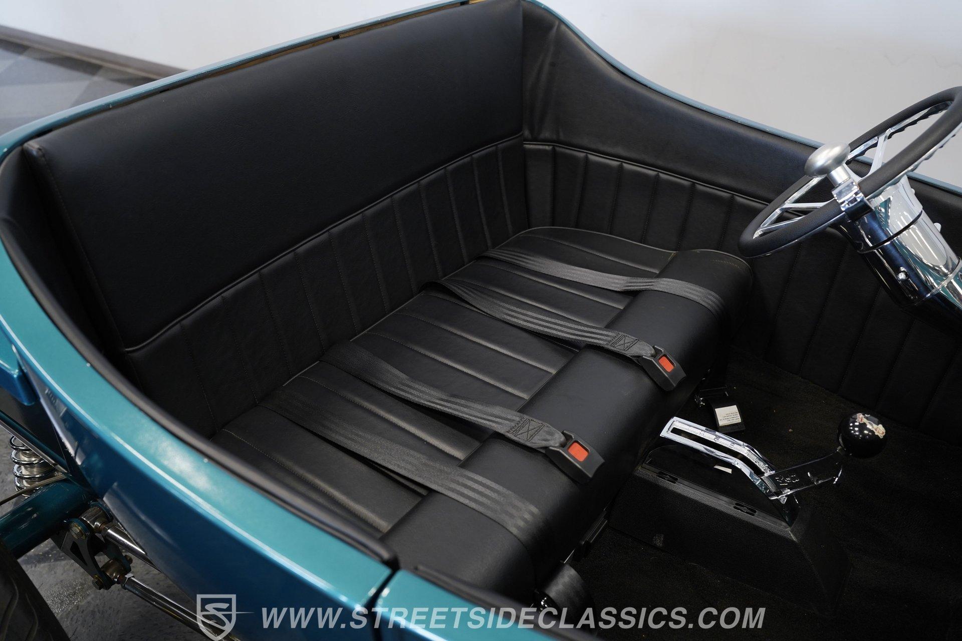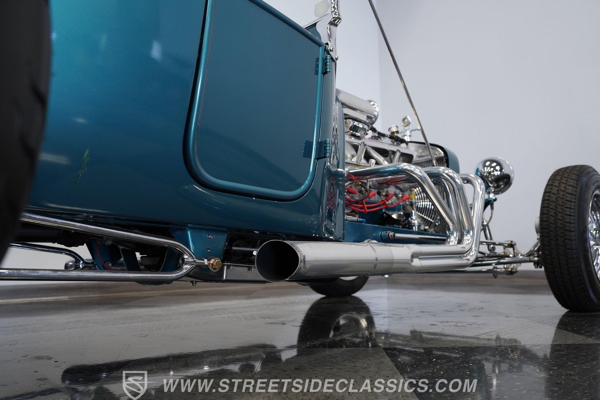 One look at this classic 1923 Ford T-Bucket and it's easy to see why these cars have been beloved and lusted after by millions of enthusiasts over the last century. This fully repainted Teal Blue roadster sports a unique one-piece windshield and single passenger-side door. And with just 32 miles on its odometer since it was built, there is plenty of life left in this throwback hot rod for its next very lucky owner to enjoy. Hop inside this hot rod (literally), and you're treated to a simple black vinyl interior featuring a large single bench seat to hold both driver and passenger in place. A small, padded, tilt steering wheel sits ahead of a big 10,000-rpm tachometer and matching 160 mph speedometer, while a quartet of auxiliary gauges takes up the rest of the body-colored dashboard. There is no radio of any kind, but fire this baby up, and we can all but promise you won't miss any other kind of music except that coming from the baffled straight pipes. Typically, we'd say "under the hood", but in this case, no hood exists and is not needed. So, up front, we find a 350 cubic-inch V-8 engine. Outfitted with an Edelbrock four barrel carburetor feeding into a high-rise Edelbrock intake manifold, this small block sports a sweet-sounding cam and lightweight Promax aluminum heads. Spent gases are sent a very short distance through a pair of long tube headers, and out of those glorious sidepipes. Power is routed through a TH350 three-speed automatic transmission before being sent to the nine-inch rear end. HIGHLIGHTS: 32 Miles Since Built One Piece Windshield Passenger Side Door Full Teal Repaint 350ci V8 Promax Aluminum Heads Performance Cam Edelbrock Four Barrel Edelbrock Hi Rise Intake Long Tubes Sidepipes Electric Cooling Fan Nine Inch Rear Solid Axle Front Ladder Bar Rear Coilovers Speedway Chassis Four Wheel Disc Brakes Black Vinyl Interior Seatbelts This 1923 Ford T-Bucket rides on a Speedway chassis featuring solid-axle front-end suspension, while the rear consists of a ladder-bar setup with coilovers. Front and rear disc brakes are in place to rein in speed when needed, so you can simply enjoy the ride. A classic hot rod like this T-Bucket needs to be experienced to truly appreciate its old-school soul, and hopefully, with a few words and some incredible photos, you may realize this is the car you've been searching for. But don't wait, this one won't be around long. Call today!