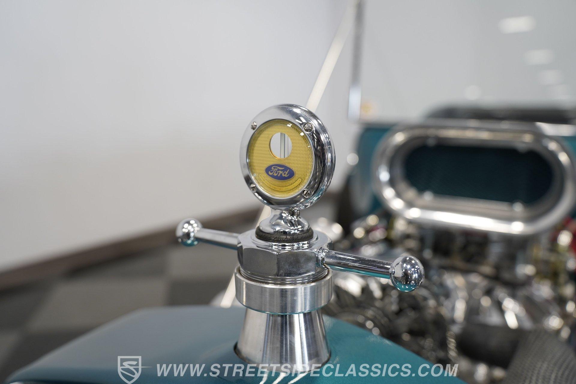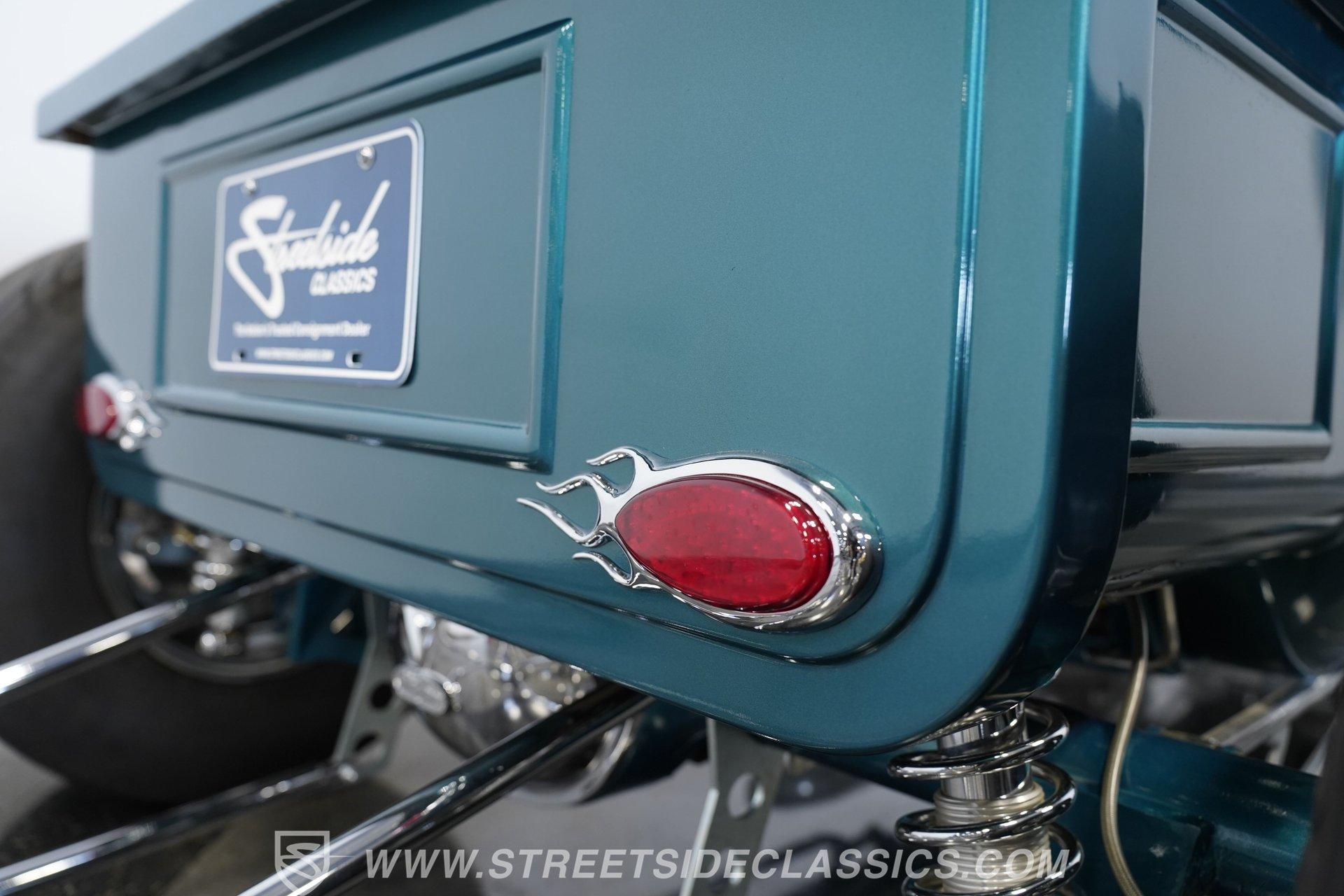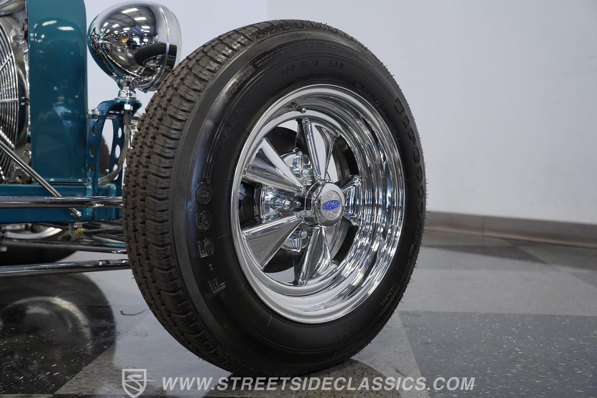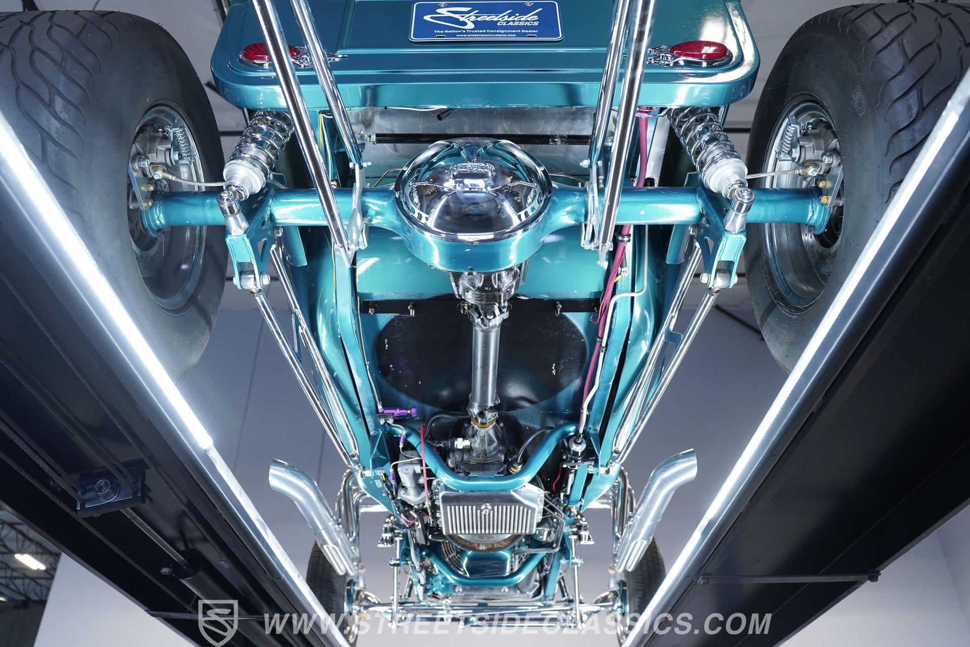 One look at this classic 1923 Ford T-Bucket and it's easy to see why these cars have been beloved and lusted after by millions of enthusiasts over the last century. This fully repainted Teal Blue roadster sports a unique one-piece windshield and single passenger-side door. And with just 32 miles on its odometer since it was built, there is plenty of life left in this throwback hot rod for its next very lucky owner to enjoy. Hop inside this hot rod (literally), and you're treated to a simple black vinyl interior featuring a large single bench seat to hold both driver and passenger in place. A small, padded, tilt steering wheel sits ahead of a big 10,000-rpm tachometer and matching 160 mph speedometer, while a quartet of auxiliary gauges takes up the rest of the body-colored dashboard. There is no radio of any kind, but fire this baby up, and we can all but promise you won't miss any other kind of music except that coming from the baffled straight pipes. Typically, we'd say "under the hood", but in this case, no hood exists and is not needed. So, up front, we find a 350 cubic-inch V-8 engine. Outfitted with an Edelbrock four barrel carburetor feeding into a high-rise Edelbrock intake manifold, this small block sports a sweet-sounding cam and lightweight Promax aluminum heads. Spent gases are sent a very short distance through a pair of long tube headers, and out of those glorious sidepipes. Power is routed through a TH350 three-speed automatic transmission before being sent to the nine-inch rear end. HIGHLIGHTS: 32 Miles Since Built One Piece Windshield Passenger Side Door Full Teal Repaint 350ci V8 Promax Aluminum Heads Performance Cam Edelbrock Four Barrel Edelbrock Hi Rise Intake Long Tubes Sidepipes Electric Cooling Fan Nine Inch Rear Solid Axle Front Ladder Bar Rear Coilovers Speedway Chassis Four Wheel Disc Brakes Black Vinyl Interior Seatbelts This 1923 Ford T-Bucket rides on a Speedway chassis featuring solid-axle front-end suspension, while the rear consists of a ladder-bar setup with coilovers. Front and rear disc brakes are in place to rein in speed when needed, so you can simply enjoy the ride. A classic hot rod like this T-Bucket needs to be experienced to truly appreciate its old-school soul, and hopefully, with a few words and some incredible photos, you may realize this is the car you've been searching for. But don't wait, this one won't be around long. Call today!