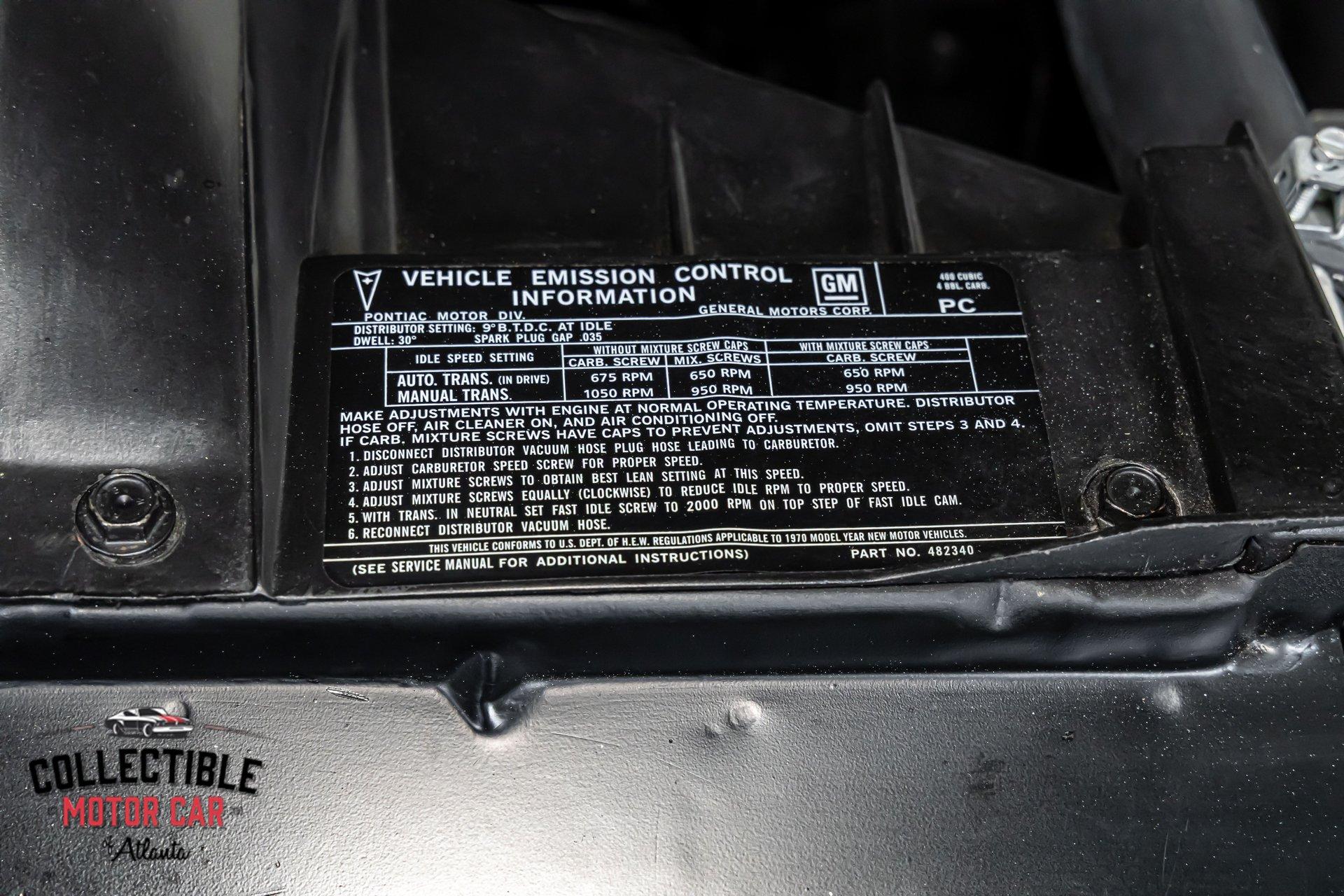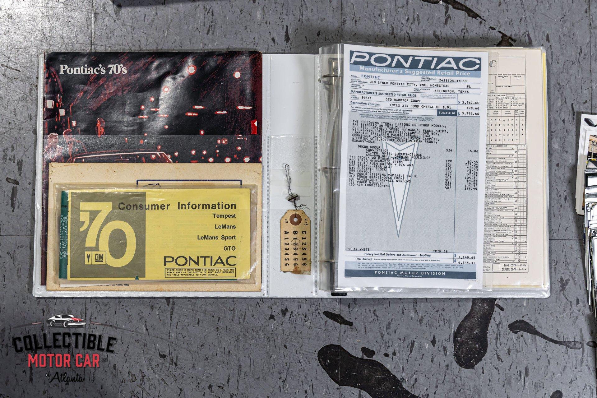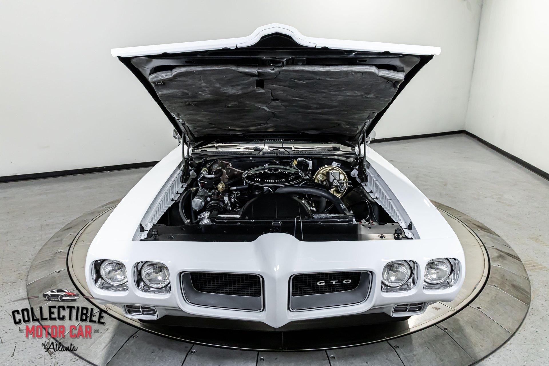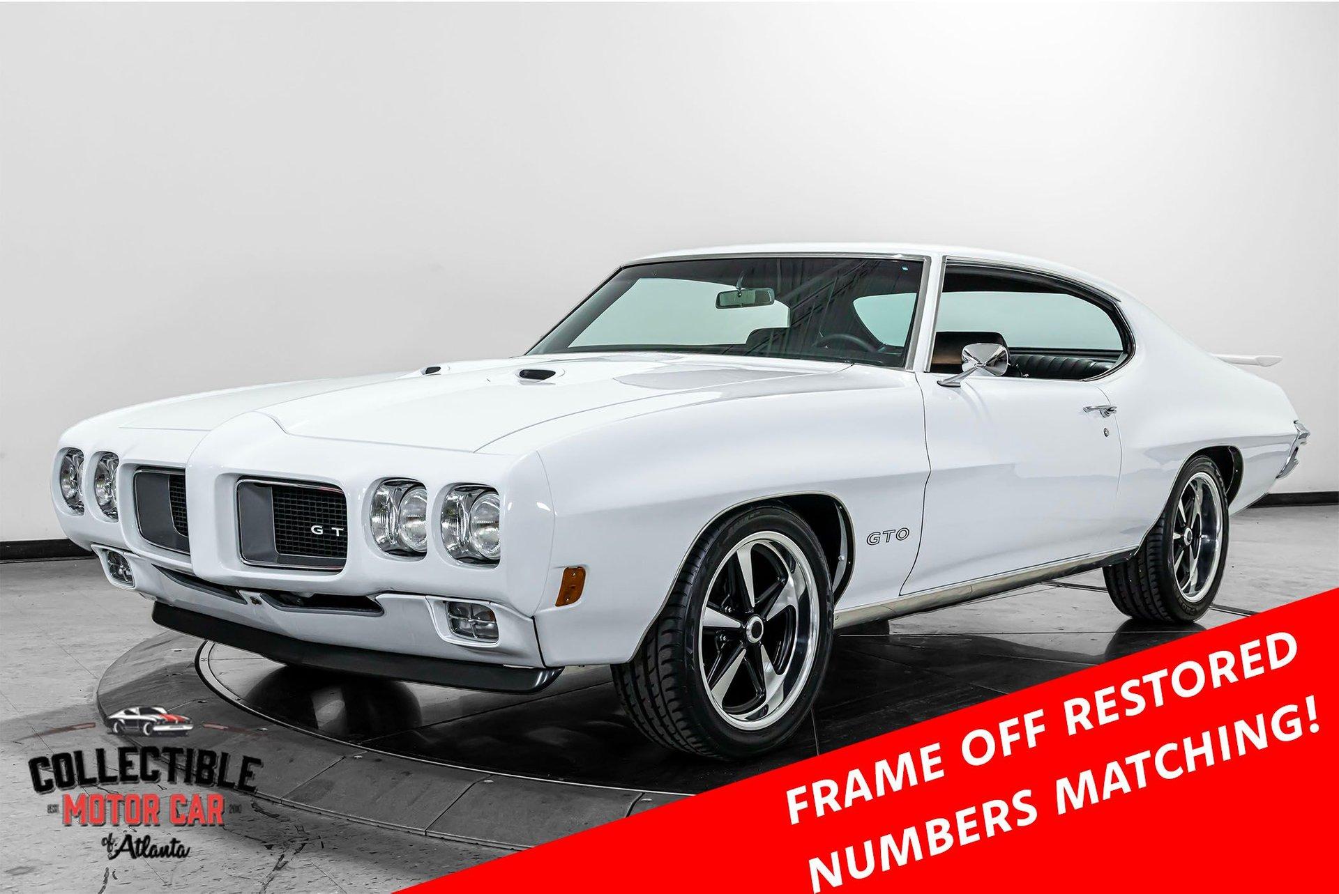 1970 Pontiac GTO — Frame-Off Restored, Numbers-Matching YS-Code 400, White/Black, A/C, PW, Docs A proper muscle icon, freshly presented. This 1970 Pontiac GTO wears a crisp White finish over Black interior and has been treated to a frame-off restoration with thoughtful upgrades for reliability and drivability. Under the hood lives its numbers-matching 400ci V8 (YS code)—rebuilt and detailed—backed by the correct automatic drivetrain and supported by modern conveniences: cold A/C, power steering, power brakes, and power windows. A tasteful stance on 18" Pontiac Rally II Bandit Wheels , Dakota Digital gauges, and LED headlights completes the look without straying from the car’s Pontiac soul. It’s a 3-owner car with excellent documentation (build photos, PHS packet, window sticker, Protect-O-Plate, owner’s manual, and build receipts). This is a very nice GTO—the kind you keep. Quick Highlights Frame-off restoration with clean, detailed undercarriage Numbers-matching 400ci V8 (YS code) — factory 350 hp spec with automatic in 1970 White exterior over Black interior Cold A/C, power steering, power brakes, power windows Dakota Digital instrumentation (OEM-style look, modern accuracy) LED headlights (improved visibility) 18" Pontiac Rally II Bandit Wheels 3 owners from new Big documentation file: build photos, PHS docs, window sticker, Protect-O-Plate, owner’s manual, receipts Turn-key: reliable, sorted, and a pleasure to drive Body & Restoration Frame-off restoration with attention to factory panel gaps and finishes Smooth White paint with deep gloss; black GTO callouts and trim present cleanly Bumpers, bezels, lenses, and stainless show excellent fit and finish Clean, painted/detailed frame and floors—great presentation for shows or lifts LED headlights integrated for safety while honoring the period look Interior Black interior presents fresh and cohesive: seat upholstery, door panels, dash, and headliner are tidy Dakota Digital gauges provide period-correct styling with modern precision Factory console and shifter, correct trim accents, tight carpet set and sill plates Power windows operate properly; all interior lighting and accessories in working order Aftermarket audio (if installed) is neatly integrated; otherwise retains clean OEM appearance Drivetrain & Chassis Numbers-matching 400ci V8 (engine code YS)—rebuilt, properly dressed with correct Pontiac engine finishes Factory-style induction and exhaust routing; healthy idle and strong mid-range pull Automatic transmission shifts cleanly; proper kickdown and highway manners Power steering tracks straight; no slop or wander Power brakes (front discs) provide confident, even stops Suspension restored with fresh bushings, springs, and shocks—tight, rattle-free feel 18" Pontiac Rally II Bandit Wheels with performance radials; excellent stance and grip Driving Impressions Starts easily, idles smooth, and settles into a confident Pontiac thrum. The rebuilt 400 pulls cleanly with the broad torque these cars are known for. Steering is light but accurate, braking is composed and linear, and the chassis feels buttoned-up—precisely what you expect from a frame-off build. A/C blows cold, making this GTO equally suited to boulevard cruising or weekend shows. Documentation & Provenance PHS documentation verifying build and equipment Window sticker and Protect-O-Plate Owner’s manual Build receipts and parts invoices Restoration photo set from disassembly through reassembly Three-owner history providing confidence in care and stewardship Why This GTO ’70 is a headline year for the GTO—iconic styling, stout Pontiac torque, and a proper muscle-era driving experience. Add a numbers-matching YS-code 400, a frame-off restoration, modern comforts (A/C, PW/PS/PB), discrete upgrades (Dakota Digital, LEDs), and a top-shelf documentation file, and you have a GTO that checks all the boxes for collectors and drivers alike. ? Phone: 770-738-7111 ? Address: 1750 Enterprise Way, Suite 109, Marietta, GA 30067 ? Hours of Operation: Monday–Friday: 9 AM – 5 PM Saturday: 9 AM – 3 PM (Appointment Only) Sunday: Closed