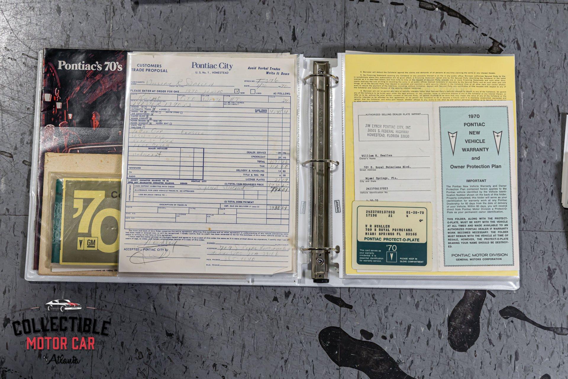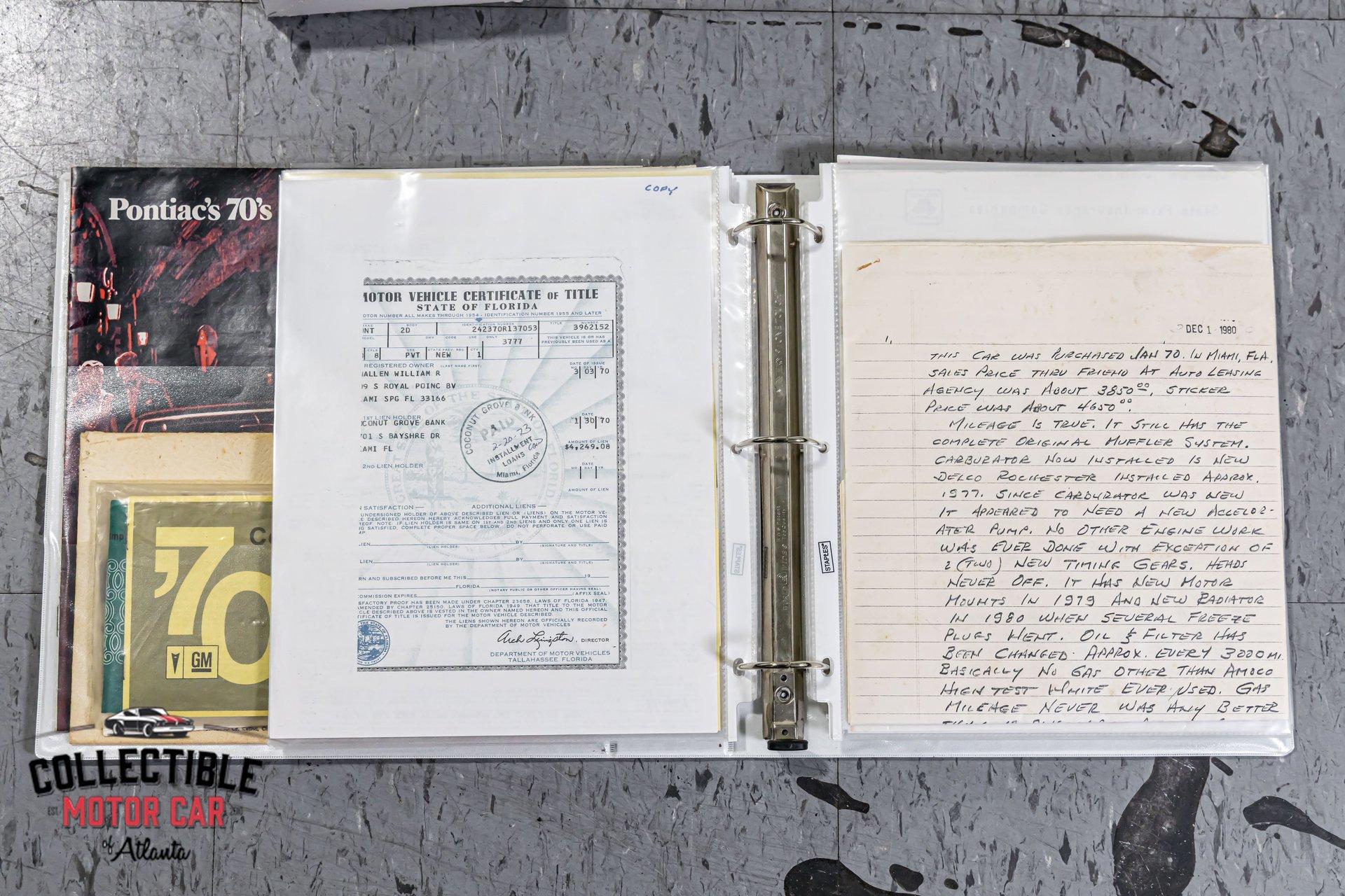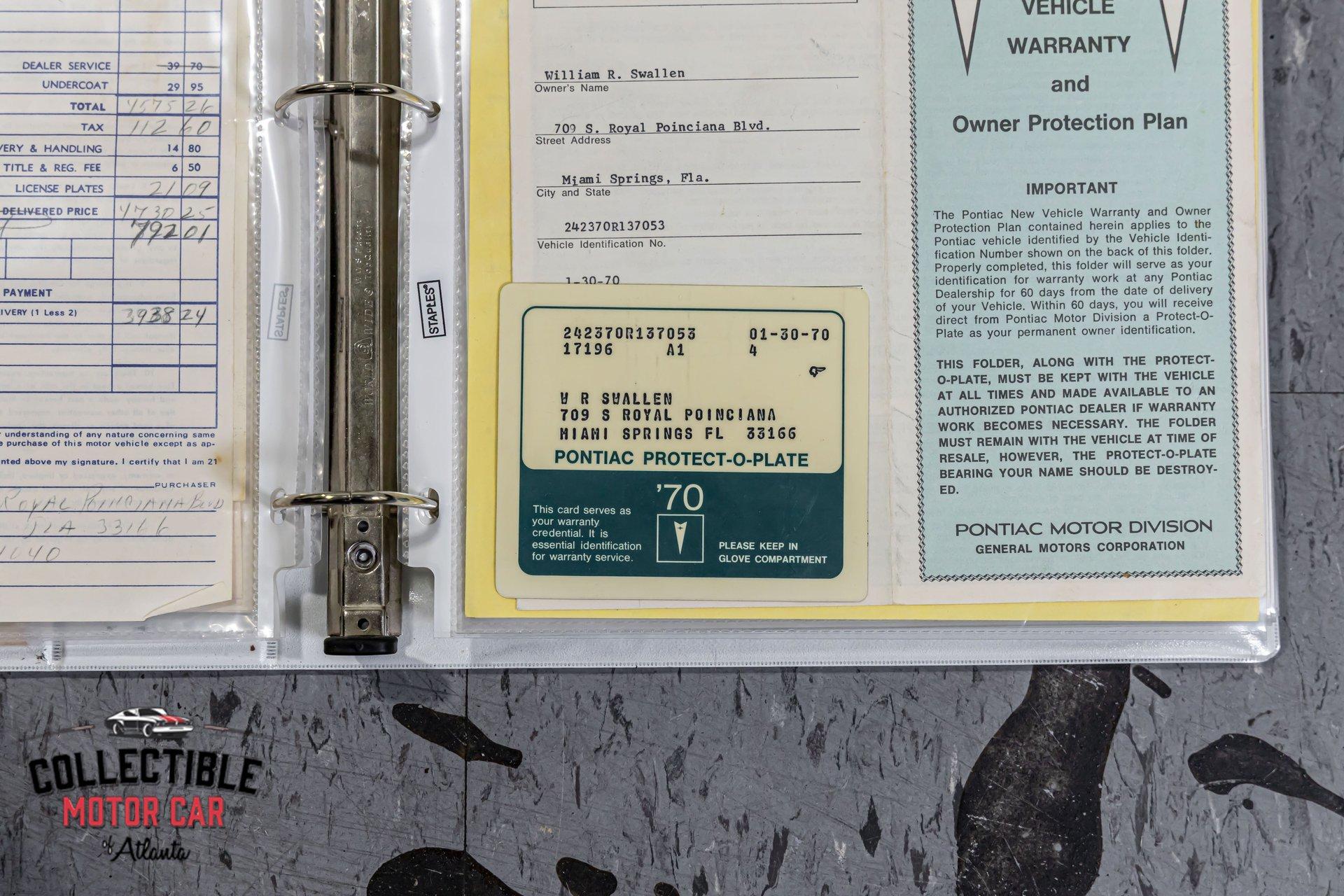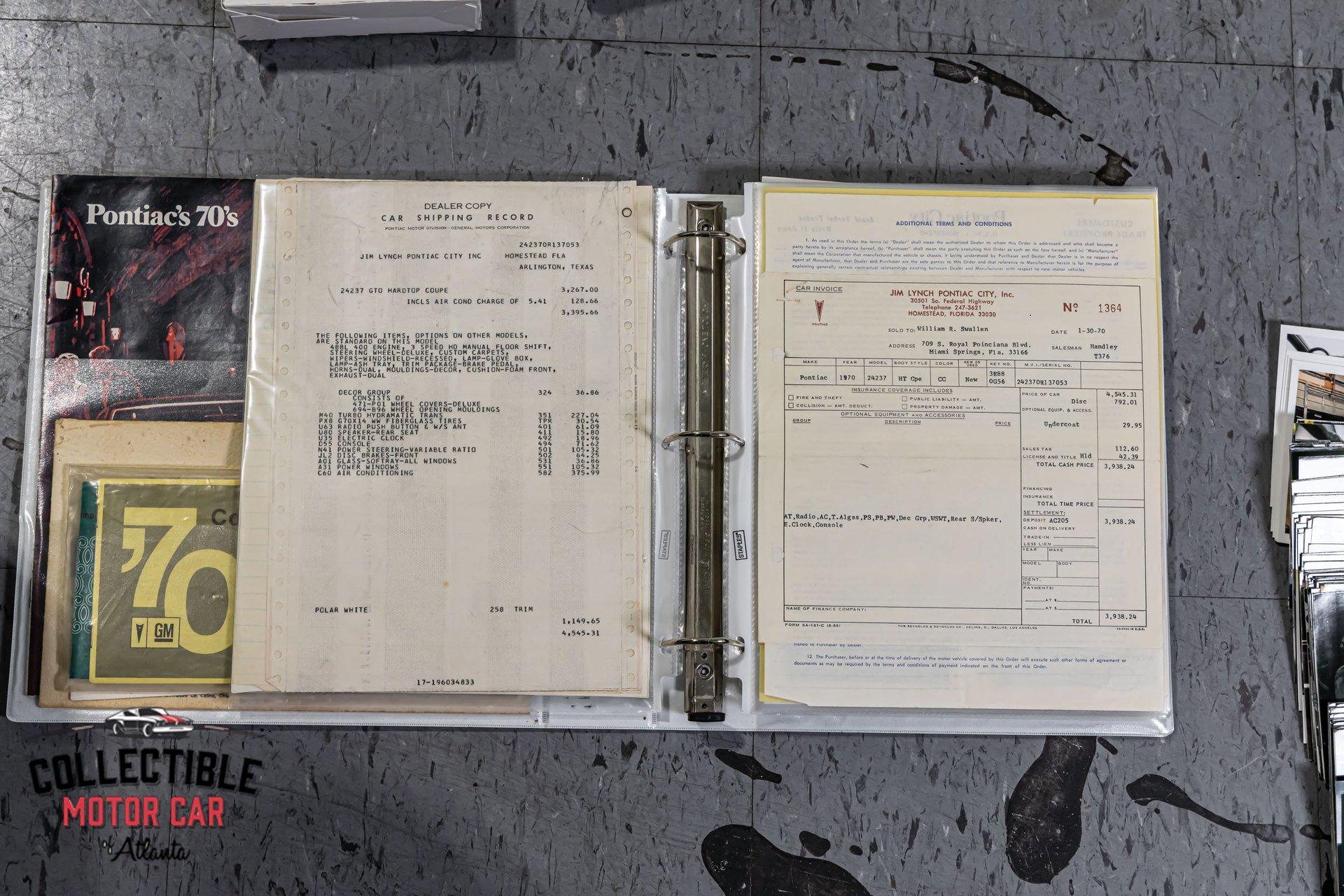 1970 Pontiac GTO — Frame-Off Restored, Numbers-Matching YS-Code 400, White/Black, A/C, PW, Docs A proper muscle icon, freshly presented. This 1970 Pontiac GTO wears a crisp White finish over Black interior and has been treated to a frame-off restoration with thoughtful upgrades for reliability and drivability. Under the hood lives its numbers-matching 400ci V8 (YS code)—rebuilt and detailed—backed by the correct automatic drivetrain and supported by modern conveniences: cold A/C, power steering, power brakes, and power windows. A tasteful stance on 18" Pontiac Rally II Bandit Wheels , Dakota Digital gauges, and LED headlights completes the look without straying from the car’s Pontiac soul. It’s a 3-owner car with excellent documentation (build photos, PHS packet, window sticker, Protect-O-Plate, owner’s manual, and build receipts). This is a very nice GTO—the kind you keep. Quick Highlights Frame-off restoration with clean, detailed undercarriage Numbers-matching 400ci V8 (YS code) — factory 350 hp spec with automatic in 1970 White exterior over Black interior Cold A/C, power steering, power brakes, power windows Dakota Digital instrumentation (OEM-style look, modern accuracy) LED headlights (improved visibility) 18" Pontiac Rally II Bandit Wheels 3 owners from new Big documentation file: build photos, PHS docs, window sticker, Protect-O-Plate, owner’s manual, receipts Turn-key: reliable, sorted, and a pleasure to drive Body & Restoration Frame-off restoration with attention to factory panel gaps and finishes Smooth White paint with deep gloss; black GTO callouts and trim present cleanly Bumpers, bezels, lenses, and stainless show excellent fit and finish Clean, painted/detailed frame and floors—great presentation for shows or lifts LED headlights integrated for safety while honoring the period look Interior Black interior presents fresh and cohesive: seat upholstery, door panels, dash, and headliner are tidy Dakota Digital gauges provide period-correct styling with modern precision Factory console and shifter, correct trim accents, tight carpet set and sill plates Power windows operate properly; all interior lighting and accessories in working order Aftermarket audio (if installed) is neatly integrated; otherwise retains clean OEM appearance Drivetrain & Chassis Numbers-matching 400ci V8 (engine code YS)—rebuilt, properly dressed with correct Pontiac engine finishes Factory-style induction and exhaust routing; healthy idle and strong mid-range pull Automatic transmission shifts cleanly; proper kickdown and highway manners Power steering tracks straight; no slop or wander Power brakes (front discs) provide confident, even stops Suspension restored with fresh bushings, springs, and shocks—tight, rattle-free feel 18" Pontiac Rally II Bandit Wheels with performance radials; excellent stance and grip Driving Impressions Starts easily, idles smooth, and settles into a confident Pontiac thrum. The rebuilt 400 pulls cleanly with the broad torque these cars are known for. Steering is light but accurate, braking is composed and linear, and the chassis feels buttoned-up—precisely what you expect from a frame-off build. A/C blows cold, making this GTO equally suited to boulevard cruising or weekend shows. Documentation & Provenance PHS documentation verifying build and equipment Window sticker and Protect-O-Plate Owner’s manual Build receipts and parts invoices Restoration photo set from disassembly through reassembly Three-owner history providing confidence in care and stewardship Why This GTO ’70 is a headline year for the GTO—iconic styling, stout Pontiac torque, and a proper muscle-era driving experience. Add a numbers-matching YS-code 400, a frame-off restoration, modern comforts (A/C, PW/PS/PB), discrete upgrades (Dakota Digital, LEDs), and a top-shelf documentation file, and you have a GTO that checks all the boxes for collectors and drivers alike. ? Phone: 770-738-7111 ? Address: 1750 Enterprise Way, Suite 109, Marietta, GA 30067 ? Hours of Operation: Monday–Friday: 9 AM – 5 PM Saturday: 9 AM – 3 PM (Appointment Only) Sunday: Closed