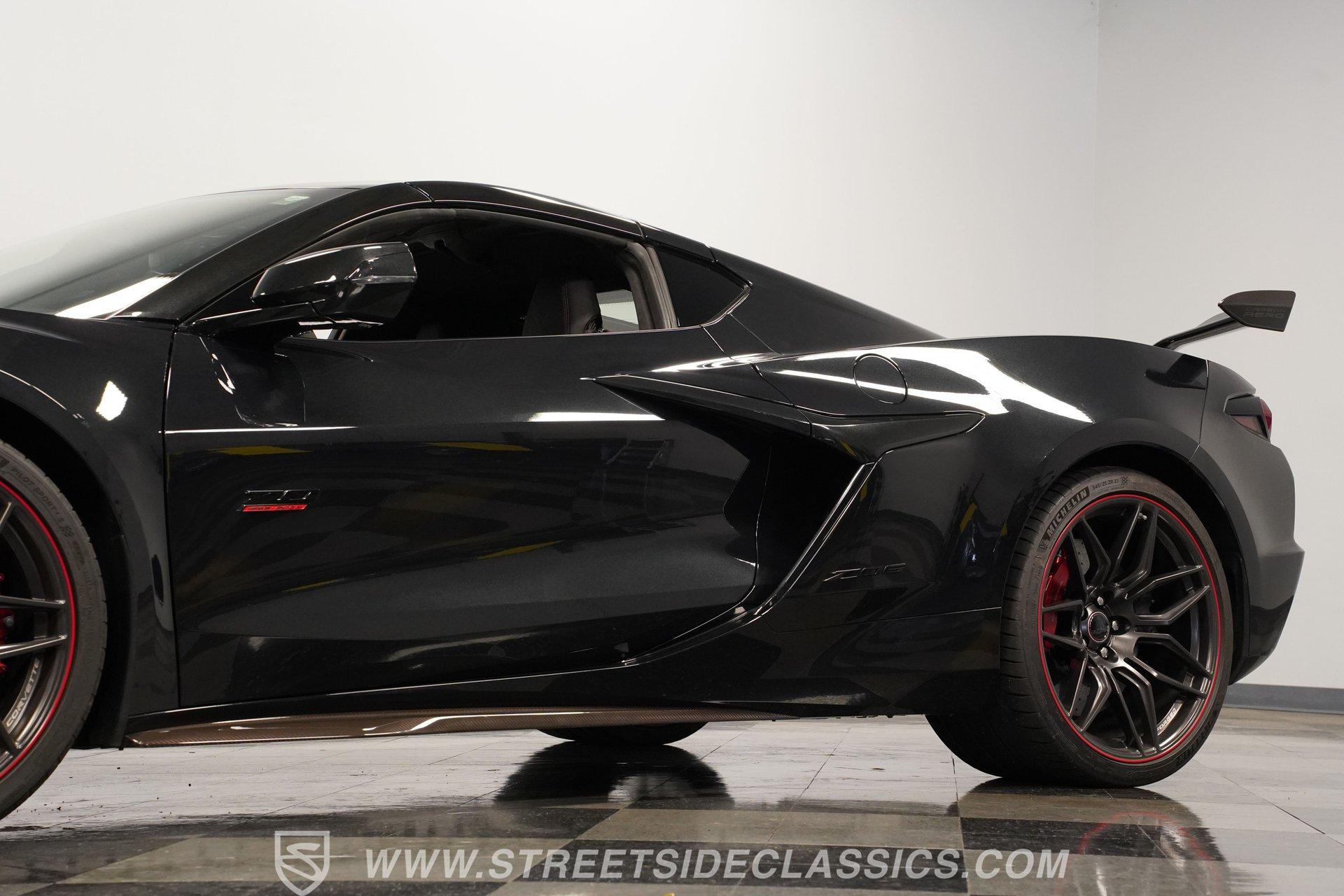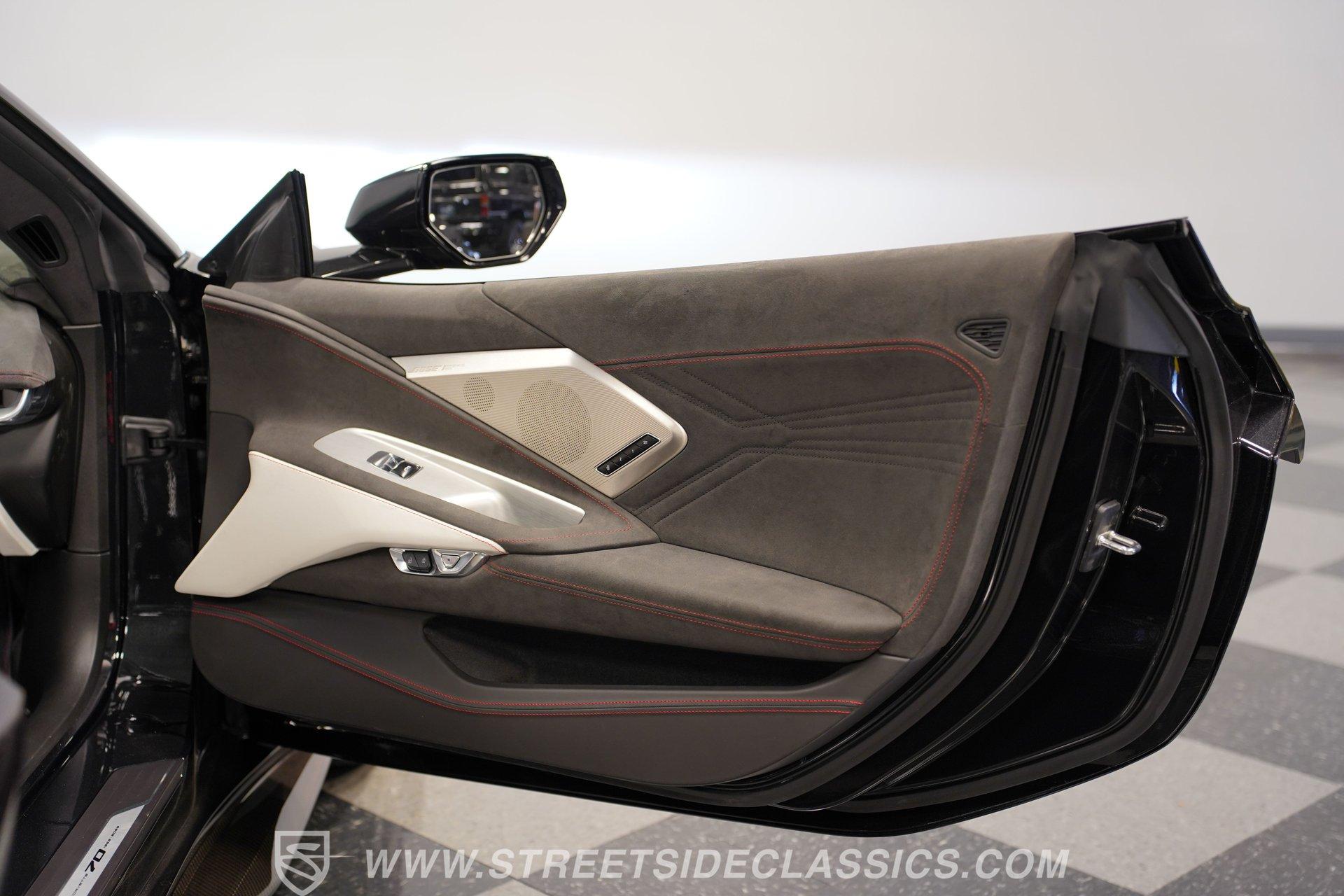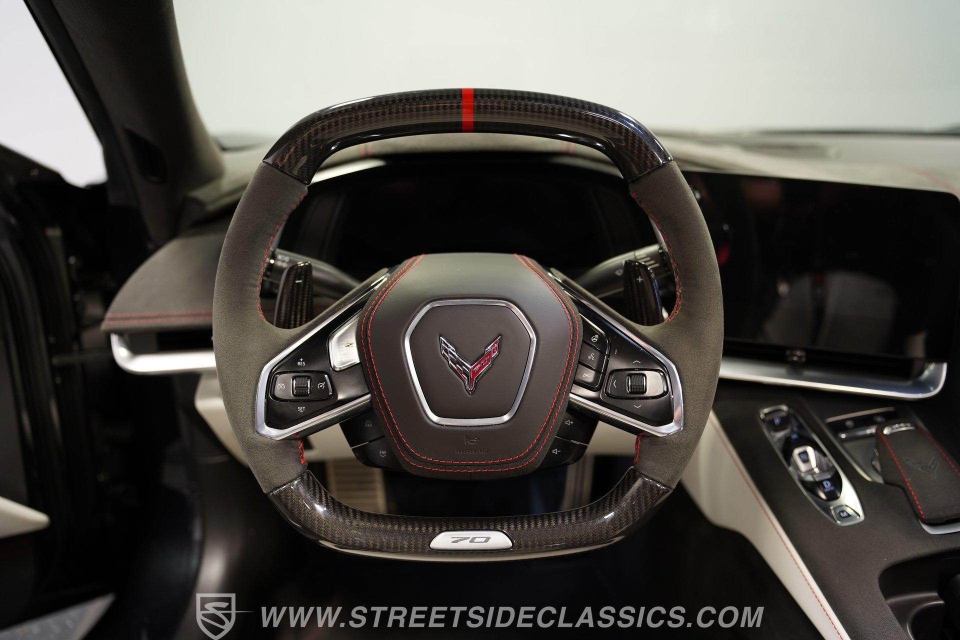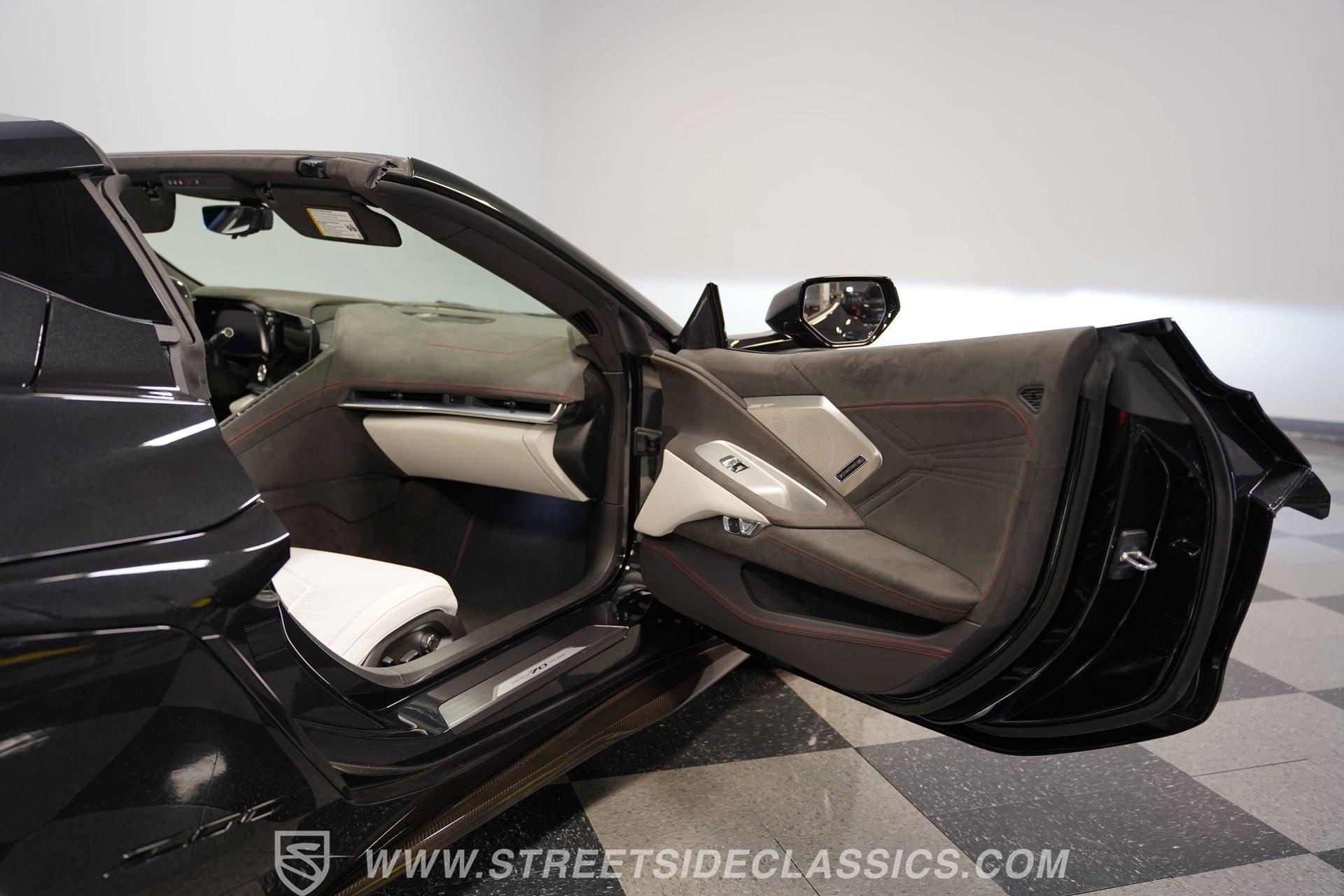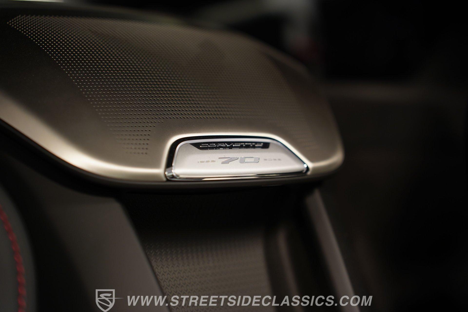 In the world of Corvettes, firsts will always command significant attention and adulation from enthusiasts and collectors. This spectacular 2023 Chevrolet Corvette Z06 70th Anniversary Z07 is not only the first track-focused C8 in the long and storied lineage of Chevy's flagship model, but also comes with the extreme Z07 performance package to make an already-capable Z06 even more race-ready. Add to that the fact that this car is also a commemorative edition celebrating 7 decades of the Corvette, and you have a world-beating supercar that is also super collectible. With only 3,212 actual miles, this ride is decked out in its original Carbon Flash Metallic paint, one of only 172 Anniversary cars finished in this color. With its removable targa top, this domestic exotic is guaranteed to turn heads wherever it goes. Inside, we find a stellar Ceramic White leather cockpit-style interior. Beginning with just the seats, the top-tier 3LZ GT2 heated and ventilated buckets with lumbar and bolster adjustments. In addition, this Z06 comes with keyless open/start, dual-zone climate control, memory packages for both driver and passenger, a heads-up display, a rear camera mirror, and HD front and rear cameras. A 12-inch color Driver Infotainment Center includes a Bose 14-speaker stereo, Apple CarPlay/Android Auto, and wireless charging. A full suite of safety features includes Rear Cross-Traffic Alert, Blind-Side Zone Alert, Forward Collision Alert, Pedestrian/Bicyclist Braking, and Automatic Emergency Braking. As you might imagine, power for this supercar is nothing short of outrageous. Out back, we find an incredible naturally aspirated 5.5-liter DOHC V-8 engine. Thanks to a first-ever flat-plane-crank, along with a six-stage dry-sump lubrication system, titanium intake valves, and sodium-filled exhaust valves, cast aluminum block and heads, direct-injection, and a 12.5:1 compression ratio, this hand-built V-8 pumps out an impressive 670-horsepower at 8,600 rpm and 460 pound-feet of torque at 6,300 rpm. It is also noteworthy to mention that the spine-tingling 8,600 rpm redline is the highest in the Corvette's 70-year history. That power for the V-8 is routed through a trick 8-speed dual-clutch automatic transaxle before being funneled to the rear wheels. HIGHLIGHTS: First Year Z06 C8 70th Anniversary Package High Performance Z07 Package Carbon Flash Metallic 3LZ Package 3212 Actual Miles Targa Top Front Lift Adjustable Height Memory 5.5 Liter DOHC V8 Flat Plane Crank 8600 RPM Redline 8 Speed Paddle Shift Auto Brembo Brakes Carbon Ceramic Rotors Ceramic White Leather Red Stitching Power Everything Touchscreen Infotainment Apple CarPlay/Android Auto Wireless Charging Heated and Vented Seats Performance Data Recorder Owner's Manual This 2023 Chevrolet Corvette Z06 70th Anniversary Z07 rides on a factory-style suspension that ratchets up the base Z06's setup to an even more race-tuned version. With a double-wishbone suspension that features Magnetic Selective Ride Control 4.0, which delivers adjustable damping to provide the perfect mix of comfort and sport. Four-wheel power disc brakes featuring big Brembo carbon-ceramic rotors and 6-piston front and 4-piston rear calipers stand ready to rein in speed with unbelievable stopping power. Along with all of its sporty features, this highly collectible Z06/Z07 comes with its factory build sheet and owner's manual. If you have been looking for a car that is as collectible as it is powerful, then this racecar for the street is the one. But don't wait, because this one won't last long so call today!