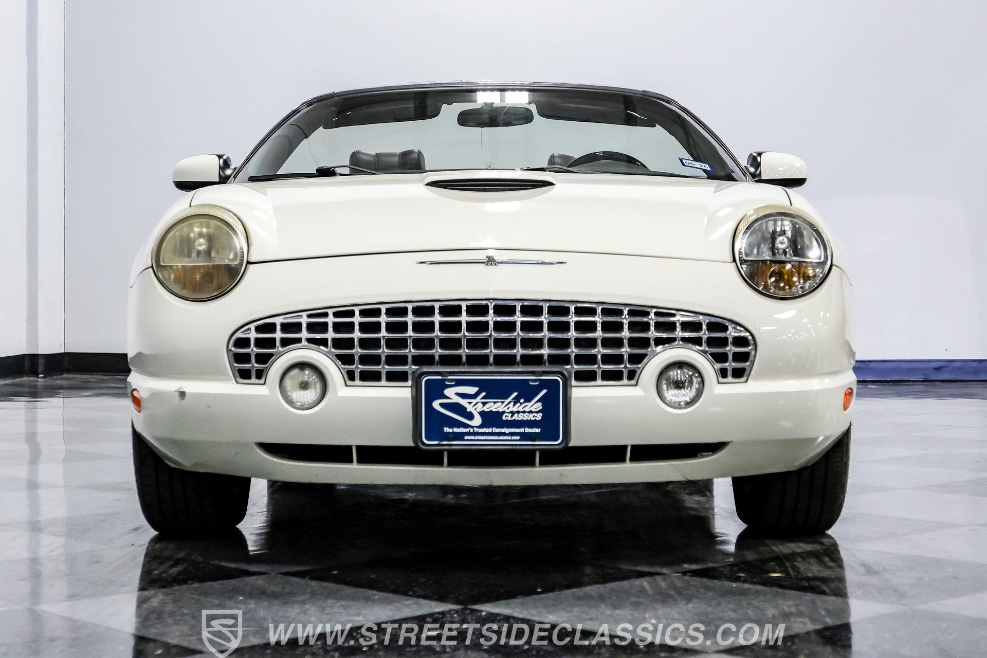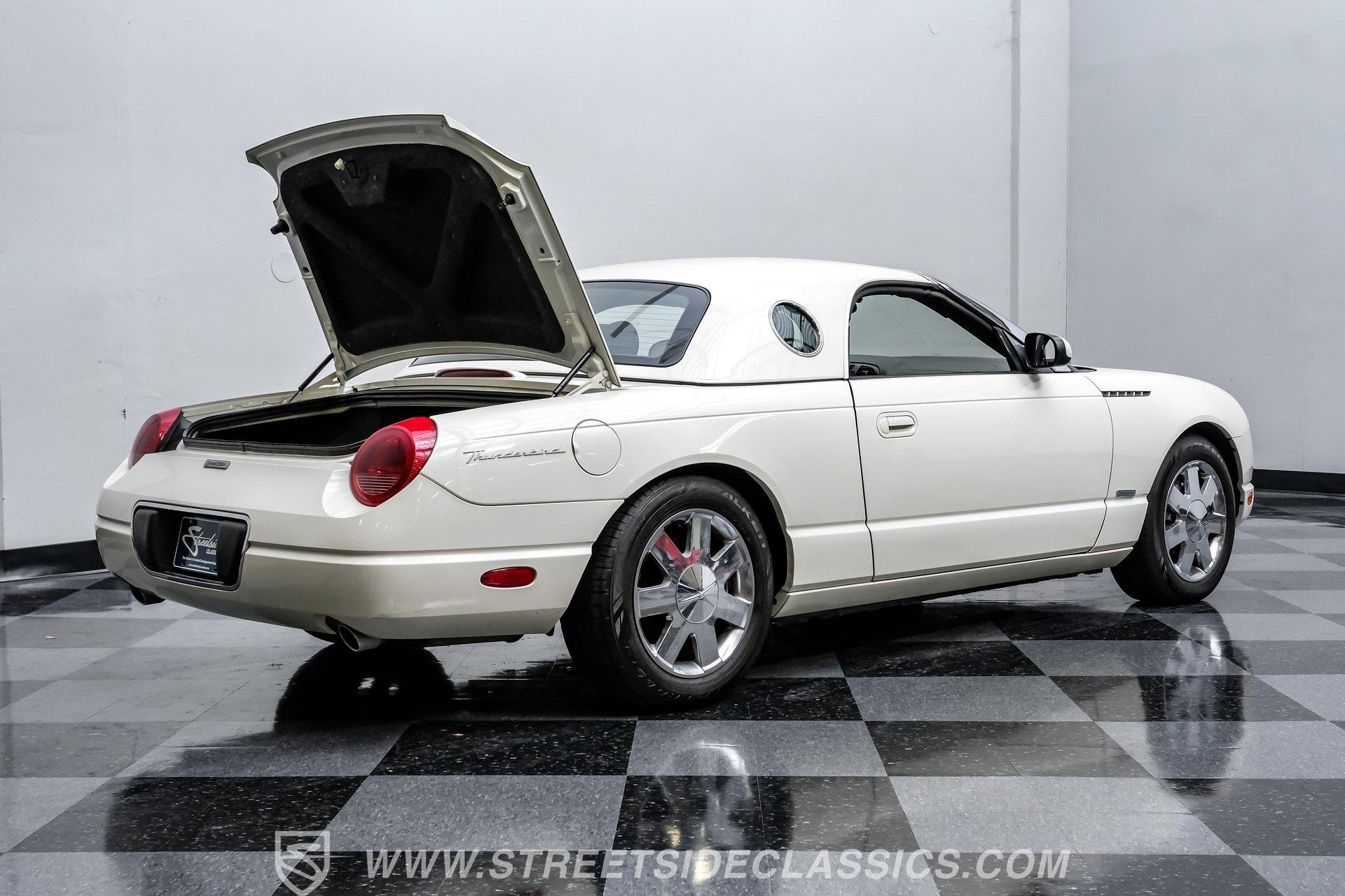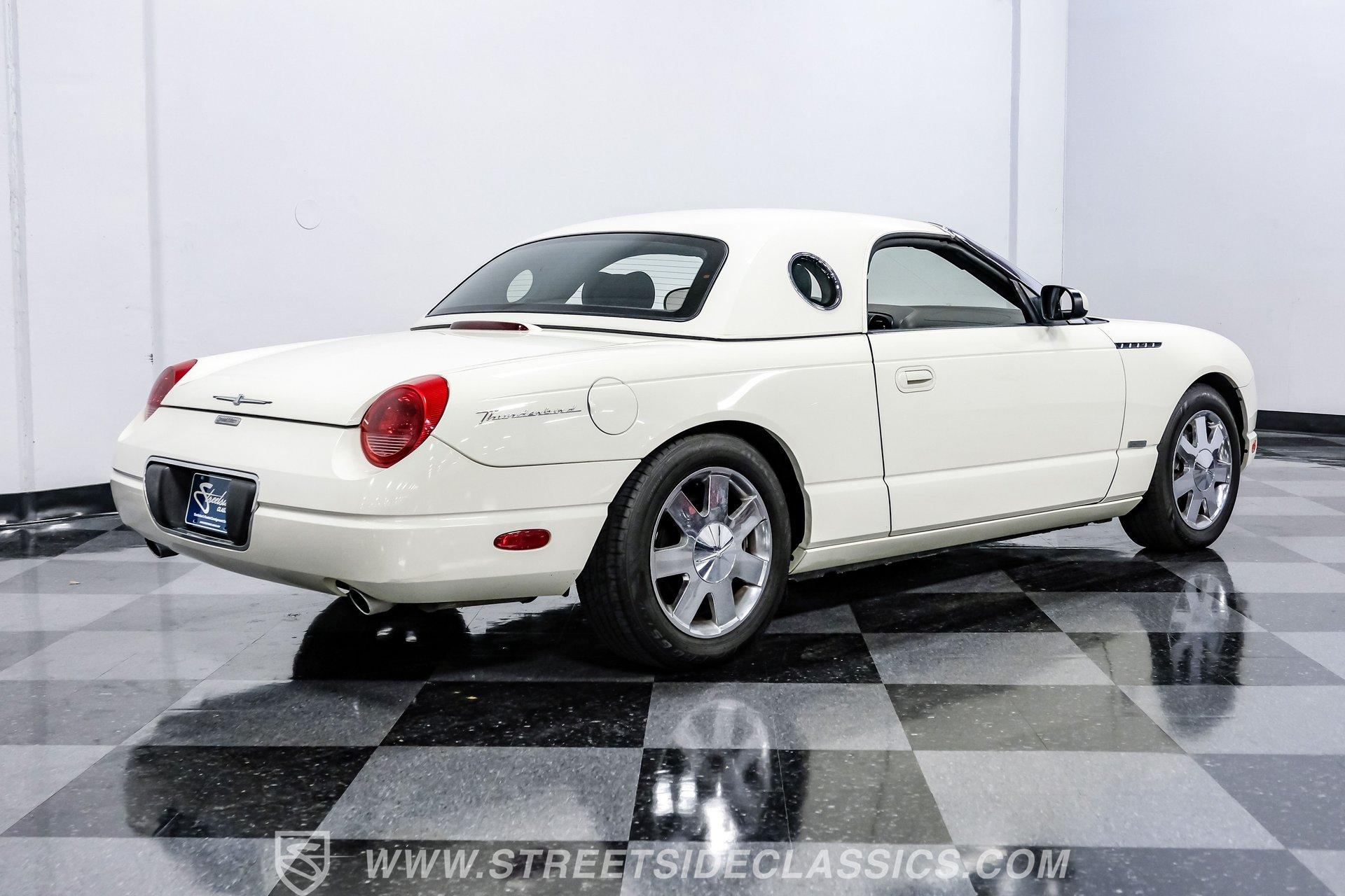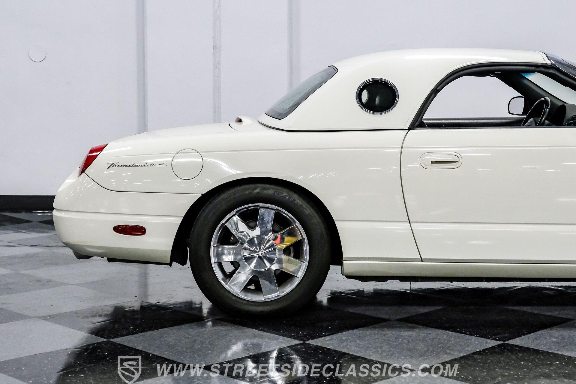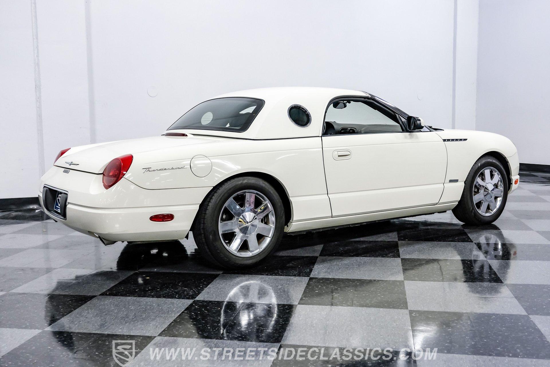 Cool style, luxurious features and proper V8 power are all what make this 2002 Ford Thunderbird awesome. The retro-cool look of this final generation Thunderbird has a timeless sense of style. Ford really took the time to integrate the best elements of the first-generation Thunderbird into this design. It can be seen in the long profile, hood scoop, subtle fender vents and afterburner-style tail lights. There are even great mirror-like brightwork elements, like the grille and the optional chrome seven-spoke factory alloy wheels. This generation Thunderbird, finished in Whisper White with a Midnight Black interior, features automatic A/C climate control and heated seats, allowing you to drive comfortably with the top down nearly all year round. This car was created to be a terrific cruiser loaded with power windows, power locks, keyless entry/alarm, dual front airbags, a premium AM/FM/6-CD changer stereo and cruise control. The leather seats feel comfy and have a well-respected style with the kind of use that goes with pride of ownership. The power driver's seat gets you in the right position to really see nice details such as the steering wheel's classic turquoise streak in the Thunderbird logo that is coordinated with the needles on the gauges. While the looks of the car are meant to be retro-cool, the engine bay is a pure modern motor. It is a fuel-injected DOHC 3.9-liter V8 that fires up readily, idles smoothly and delivers plenty of power when you want it, making it the ideal smooth cruiser from day one. You will love using this Thunderbird to drive near or far with its smooth five-speed automatic transmission, power steering, four-wheel disc brakes and fully-independent suspension. HIGHLIGHTS: First Year of the Last Generation of Thunderbirds Fuel-Injected DOHC 3.9-Liter V8 Automatic Transmission Factory Stereo with 6-CD Changer Air Conditioning Heated Seats Removable Hardtop Black Folding Soft Top Owner' Manual Power Windows Power Driver Seat Power Locks Factory Chrome 7-Spoke Wheels This may look like a vintage car, but this 2002 Ford Thunderbird certainly has modern moves. Call today!