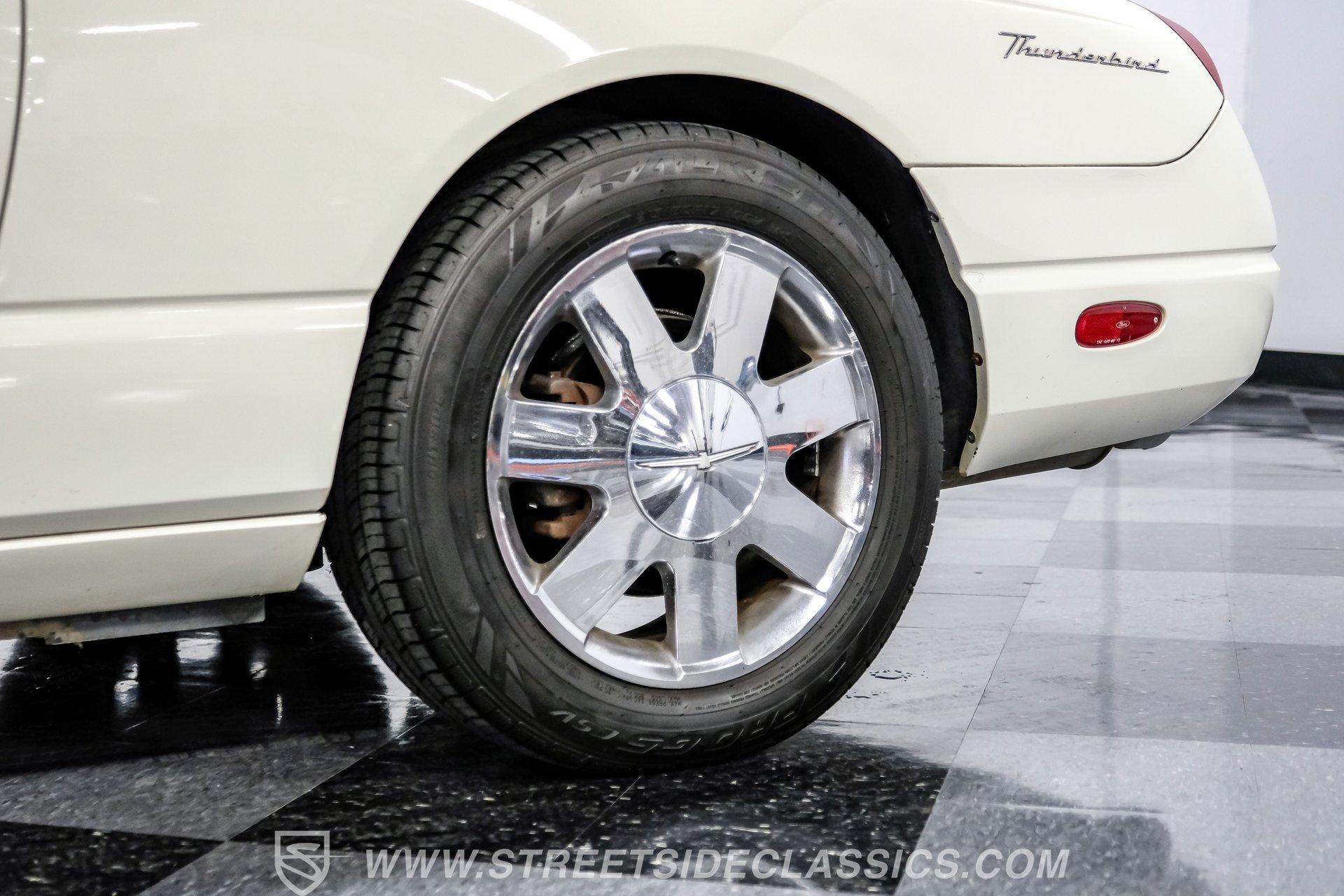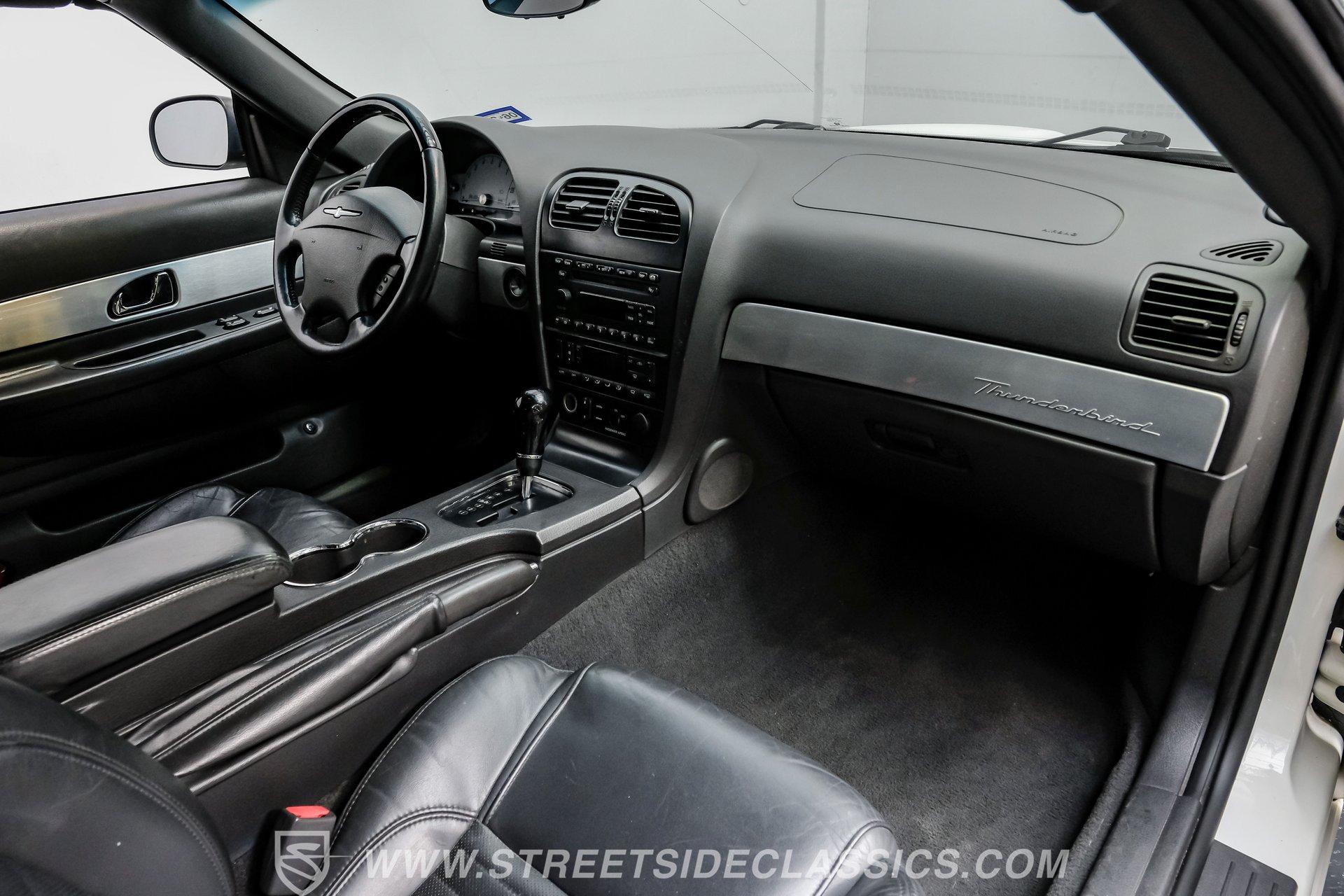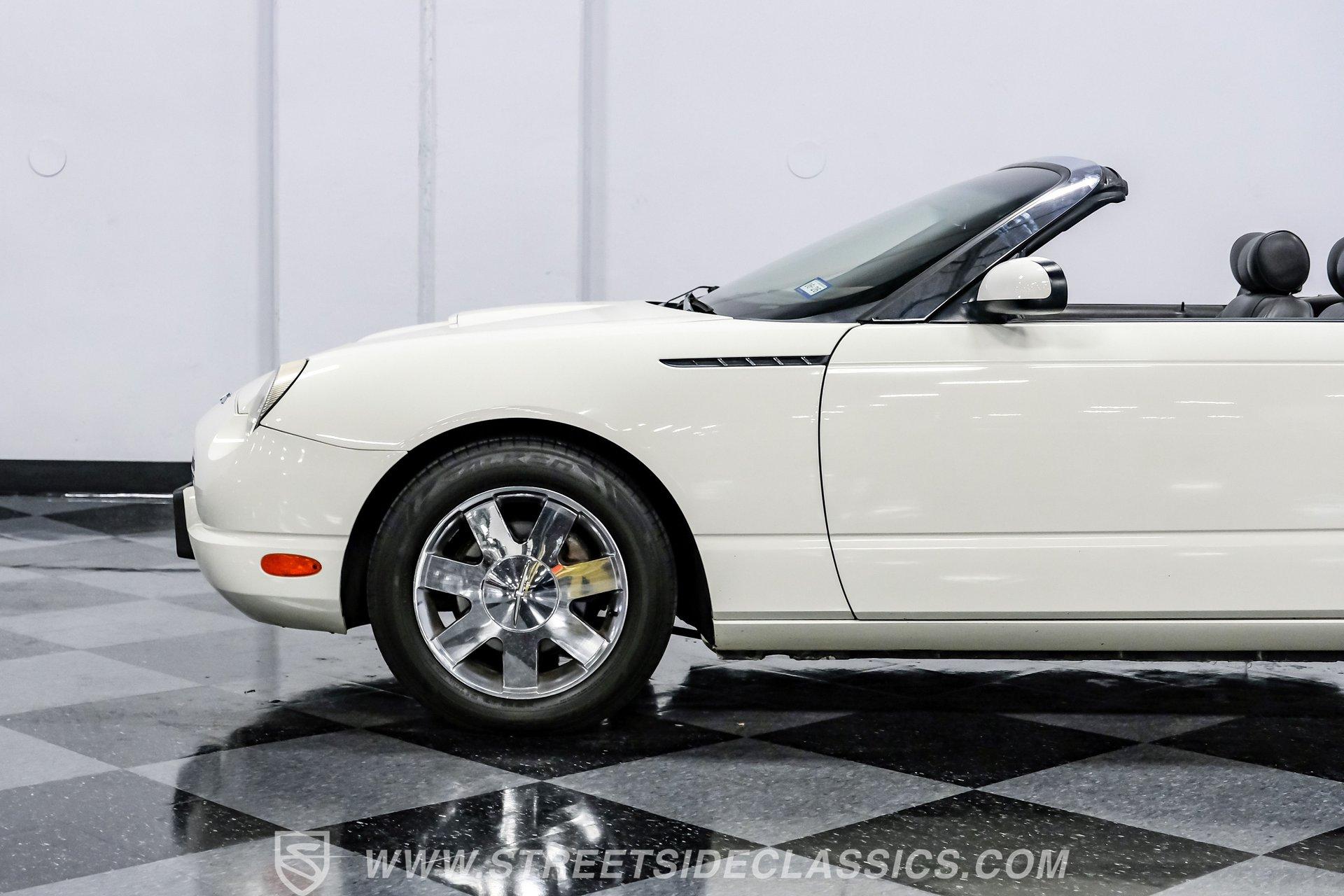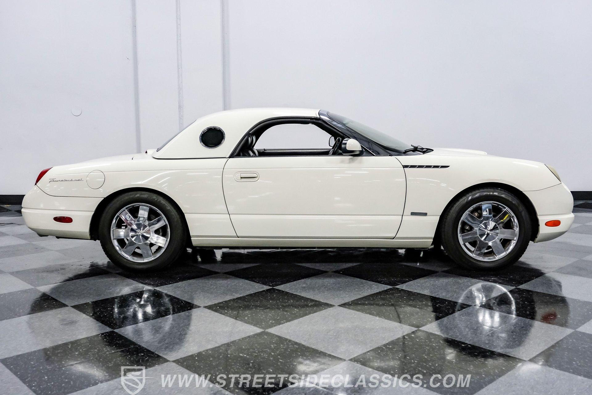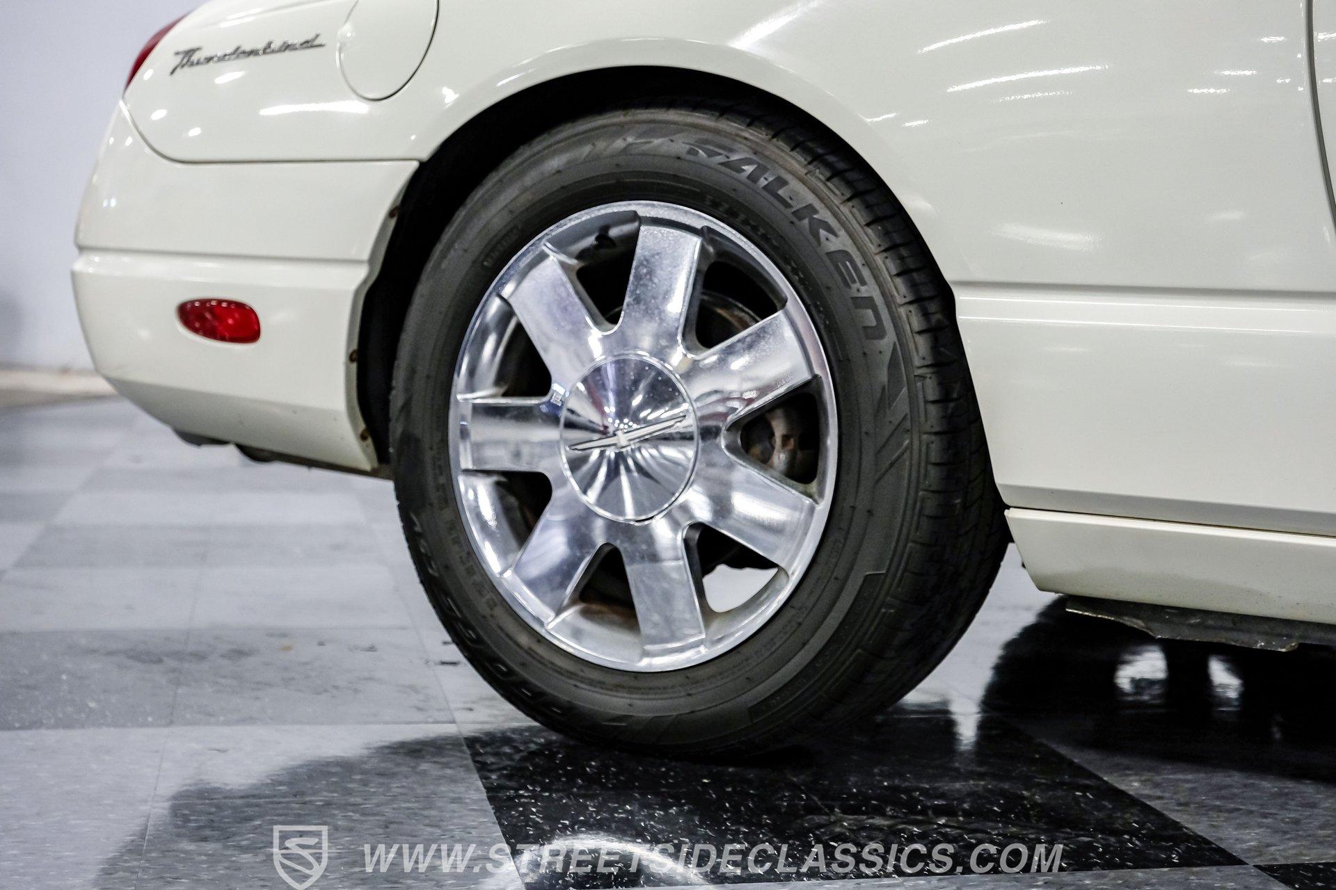 Cool style, luxurious features and proper V8 power are all what make this 2002 Ford Thunderbird awesome. The retro-cool look of this final generation Thunderbird has a timeless sense of style. Ford really took the time to integrate the best elements of the first-generation Thunderbird into this design. It can be seen in the long profile, hood scoop, subtle fender vents and afterburner-style tail lights. There are even great mirror-like brightwork elements, like the grille and the optional chrome seven-spoke factory alloy wheels. This generation Thunderbird, finished in Whisper White with a Midnight Black interior, features automatic A/C climate control and heated seats, allowing you to drive comfortably with the top down nearly all year round. This car was created to be a terrific cruiser loaded with power windows, power locks, keyless entry/alarm, dual front airbags, a premium AM/FM/6-CD changer stereo and cruise control. The leather seats feel comfy and have a well-respected style with the kind of use that goes with pride of ownership. The power driver's seat gets you in the right position to really see nice details such as the steering wheel's classic turquoise streak in the Thunderbird logo that is coordinated with the needles on the gauges. While the looks of the car are meant to be retro-cool, the engine bay is a pure modern motor. It is a fuel-injected DOHC 3.9-liter V8 that fires up readily, idles smoothly and delivers plenty of power when you want it, making it the ideal smooth cruiser from day one. You will love using this Thunderbird to drive near or far with its smooth five-speed automatic transmission, power steering, four-wheel disc brakes and fully-independent suspension. HIGHLIGHTS: First Year of the Last Generation of Thunderbirds Fuel-Injected DOHC 3.9-Liter V8 Automatic Transmission Factory Stereo with 6-CD Changer Air Conditioning Heated Seats Removable Hardtop Black Folding Soft Top Owner' Manual Power Windows Power Driver Seat Power Locks Factory Chrome 7-Spoke Wheels This may look like a vintage car, but this 2002 Ford Thunderbird certainly has modern moves. Call today!